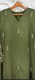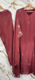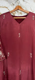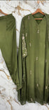 Premium Chinnon A line kurta set with heavy handwork on the sleeve & daman of the top with a long side scalping chinnon dupatta paired with mul chinnon bottom