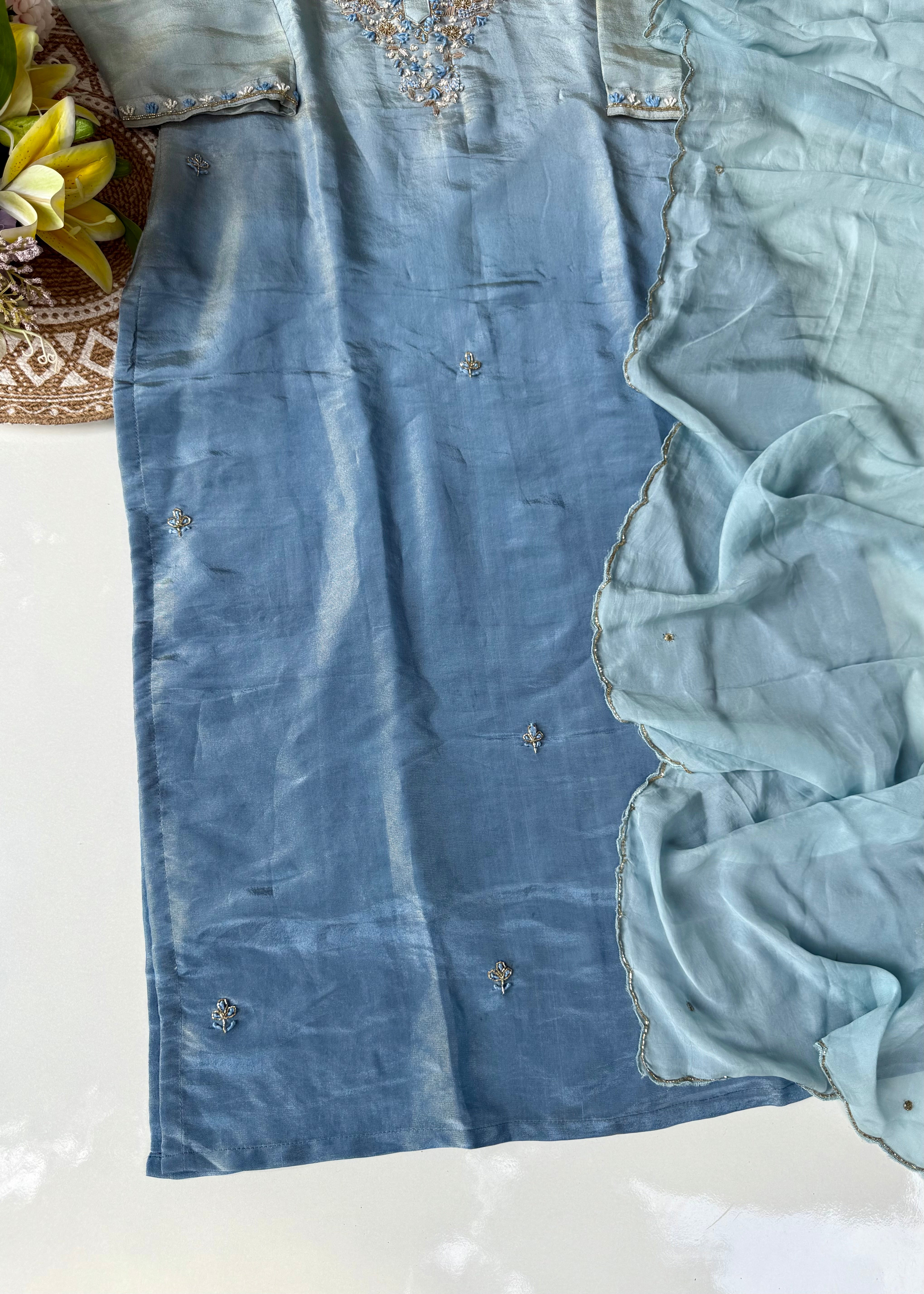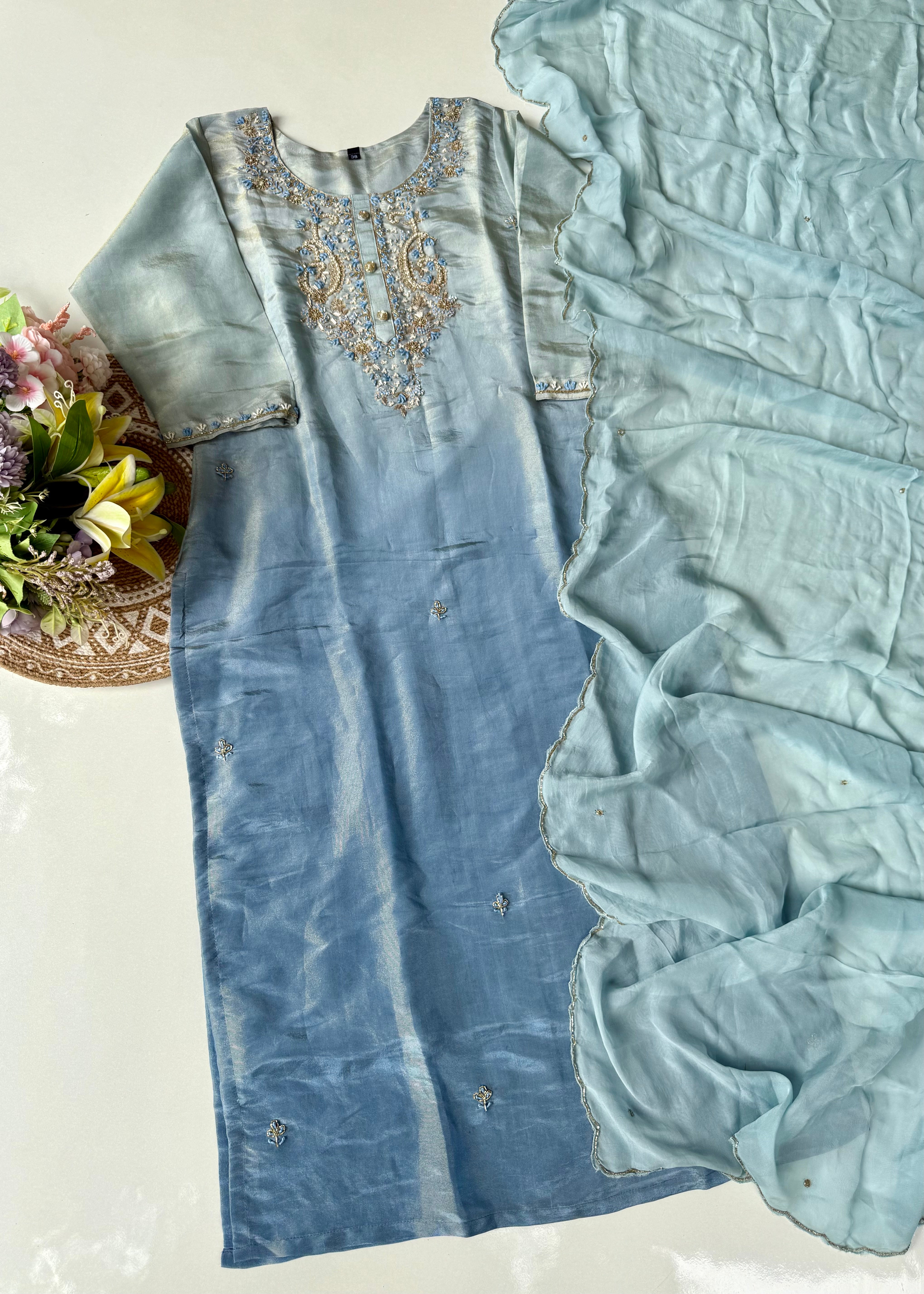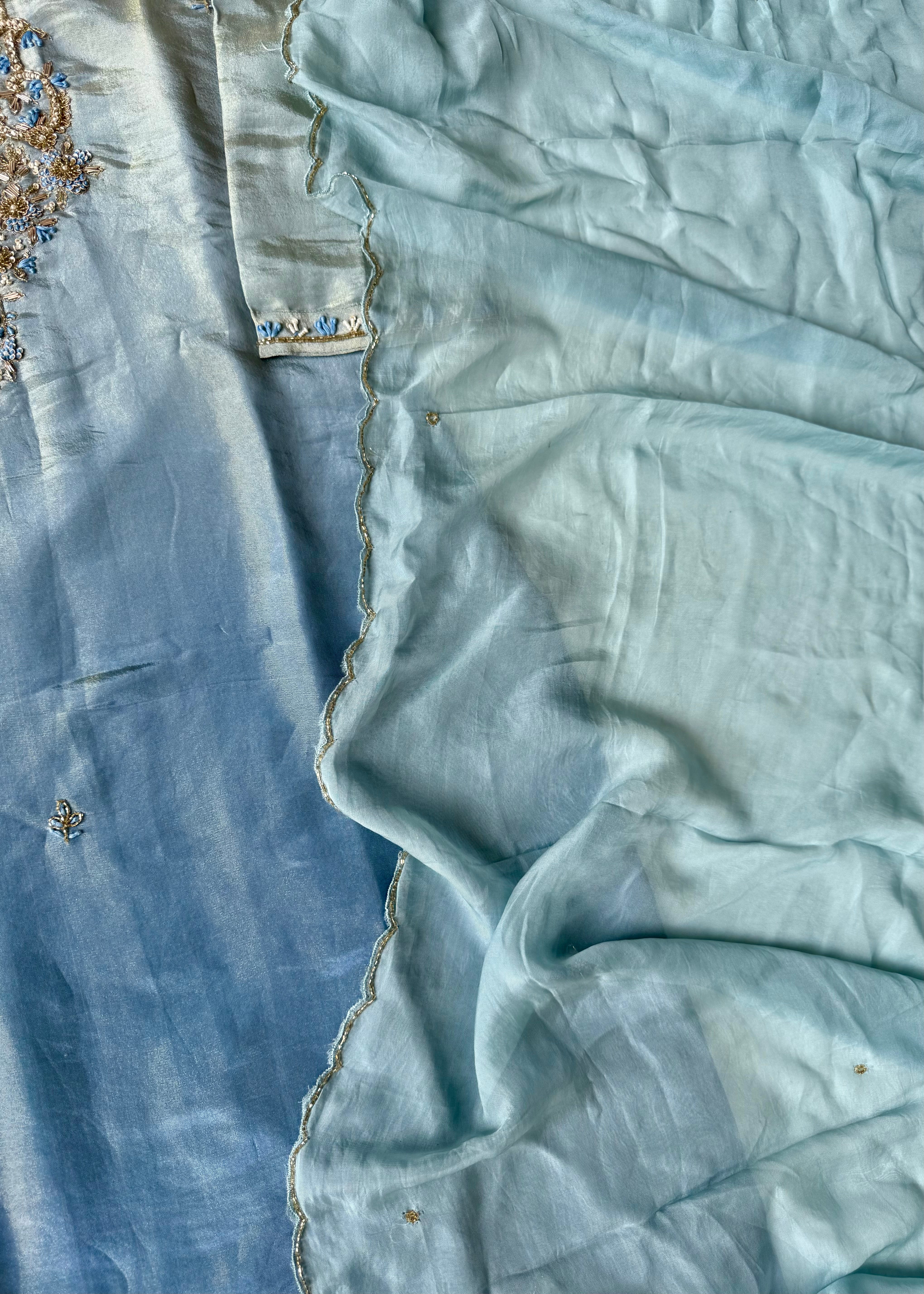 “Aashvi” Ombre Tissue Silk Handwork Suit Set