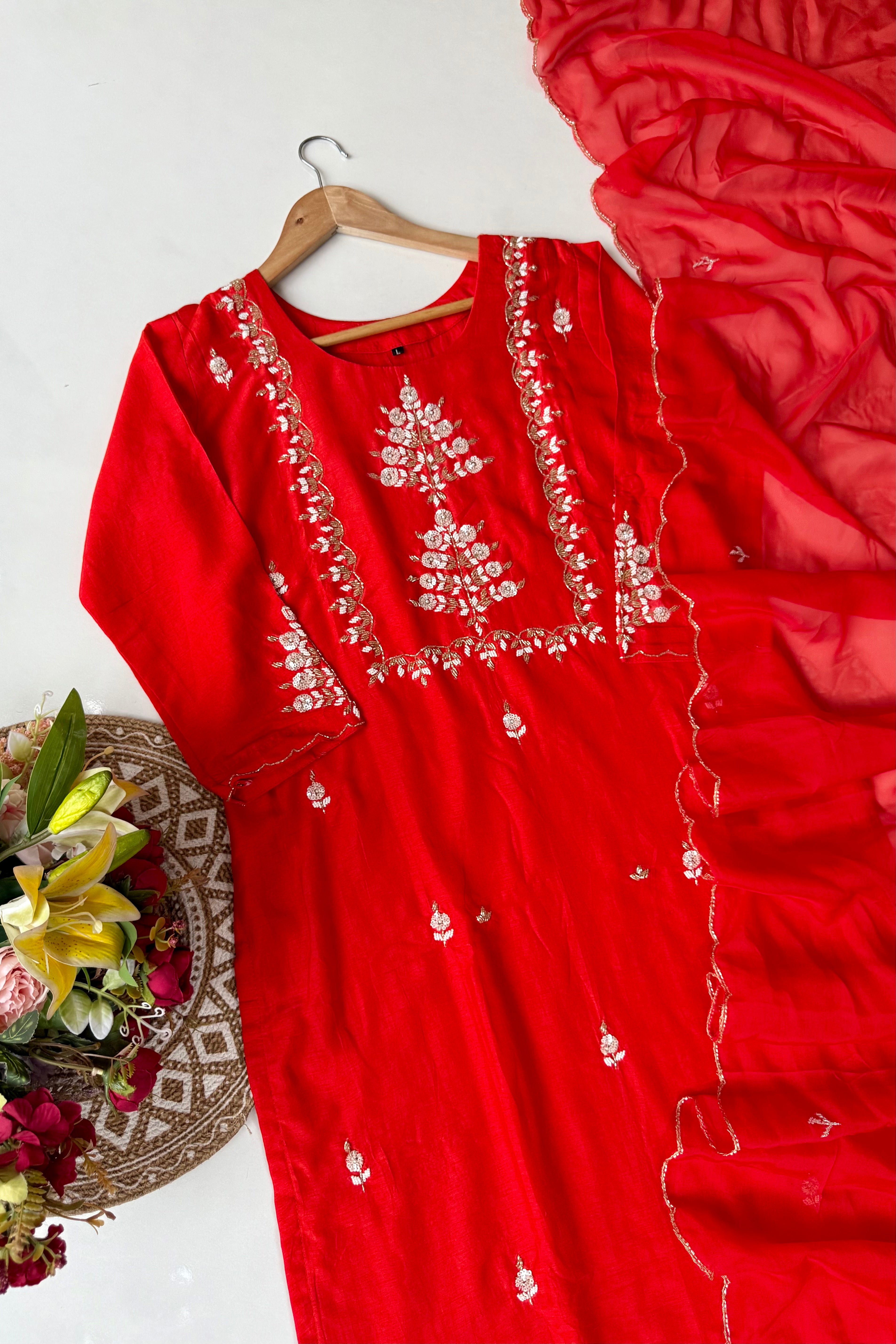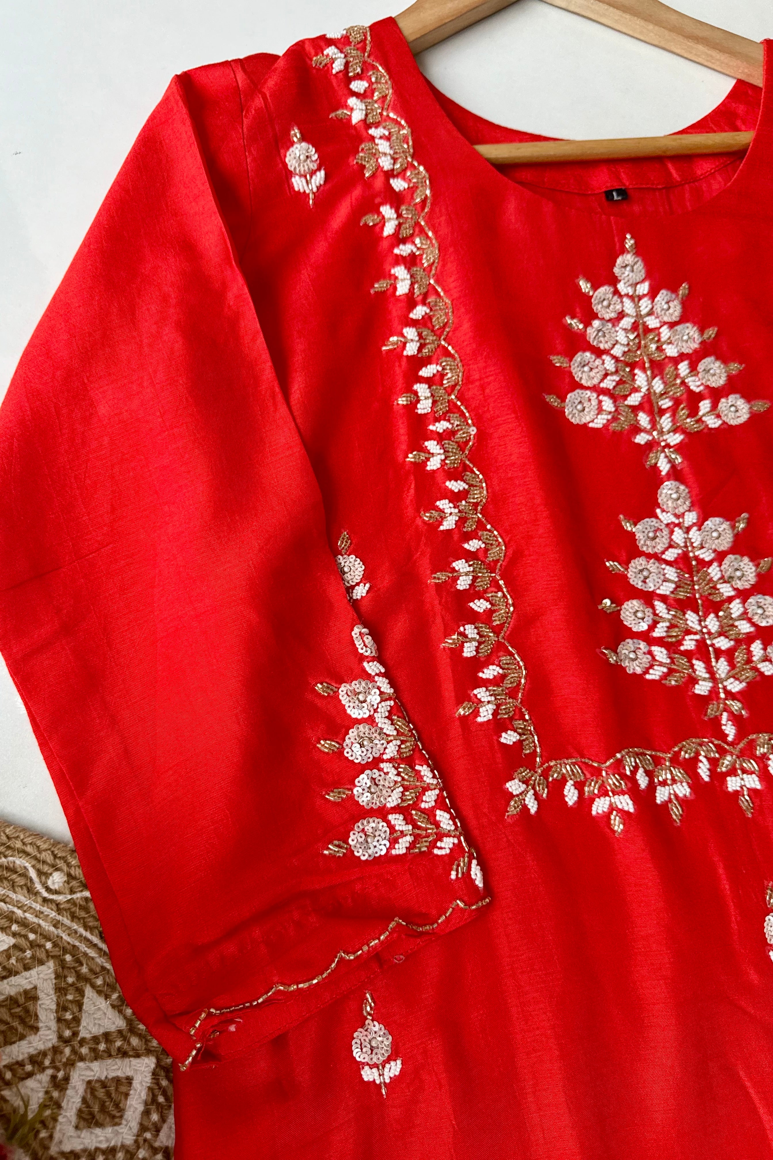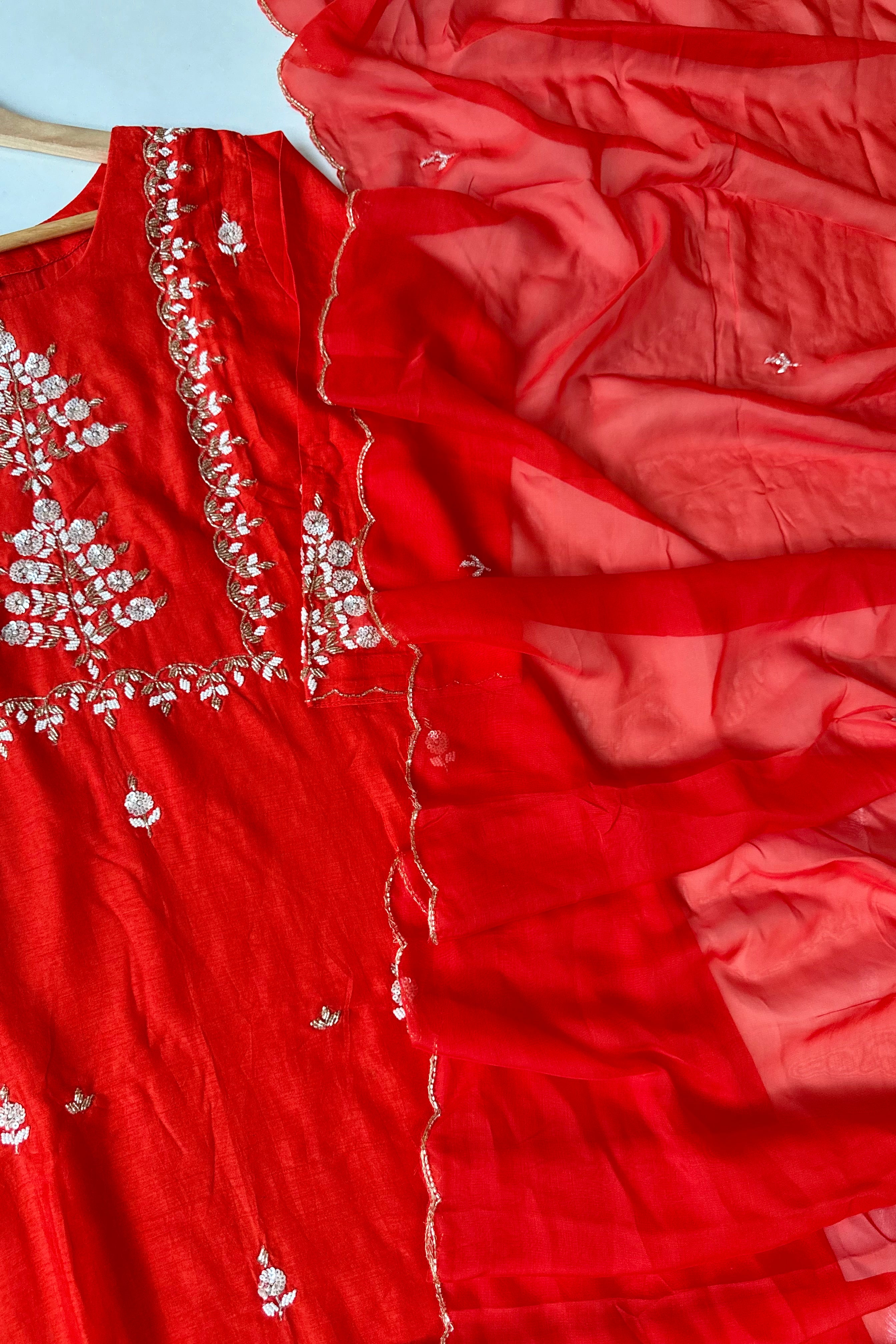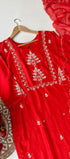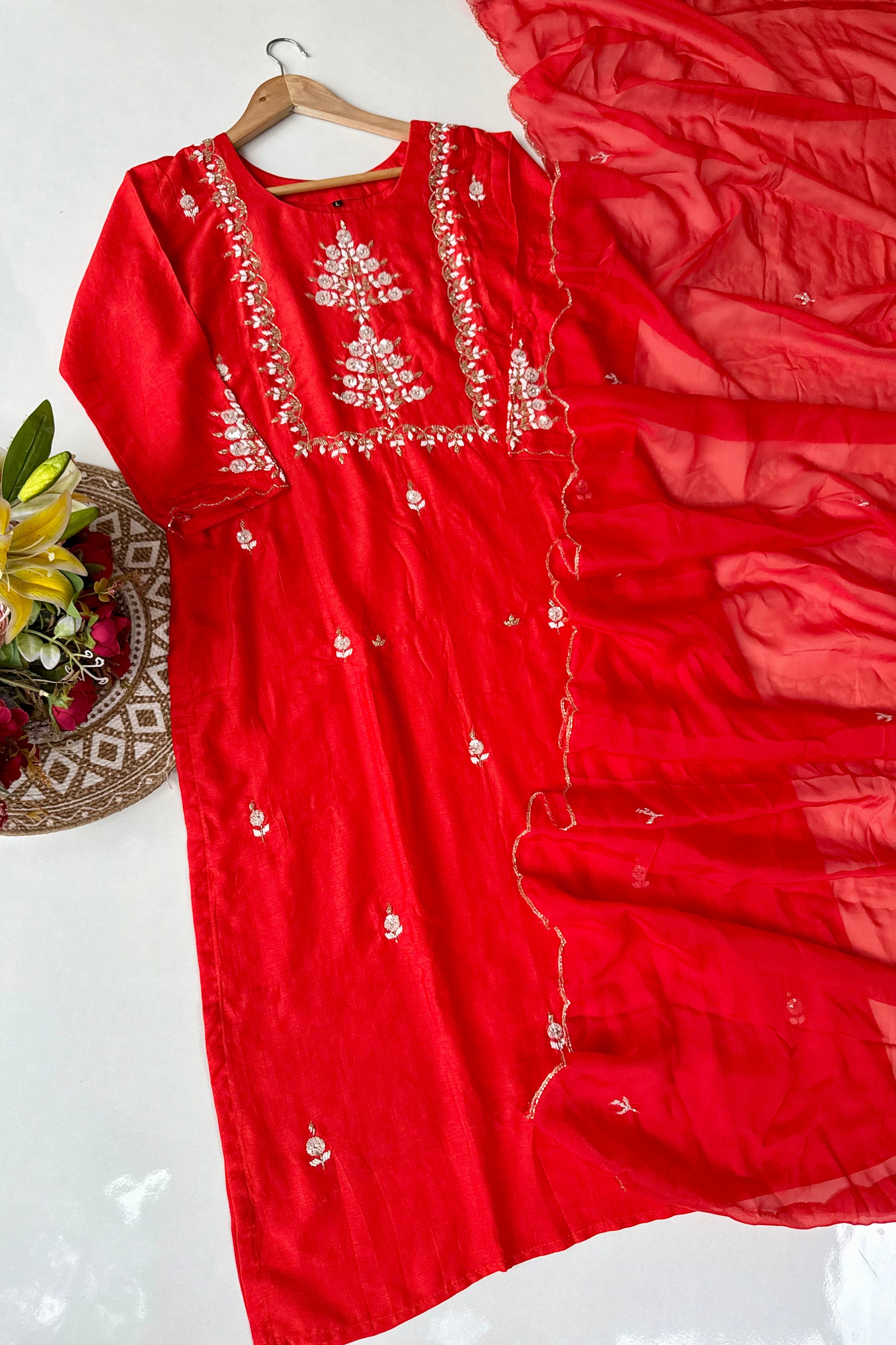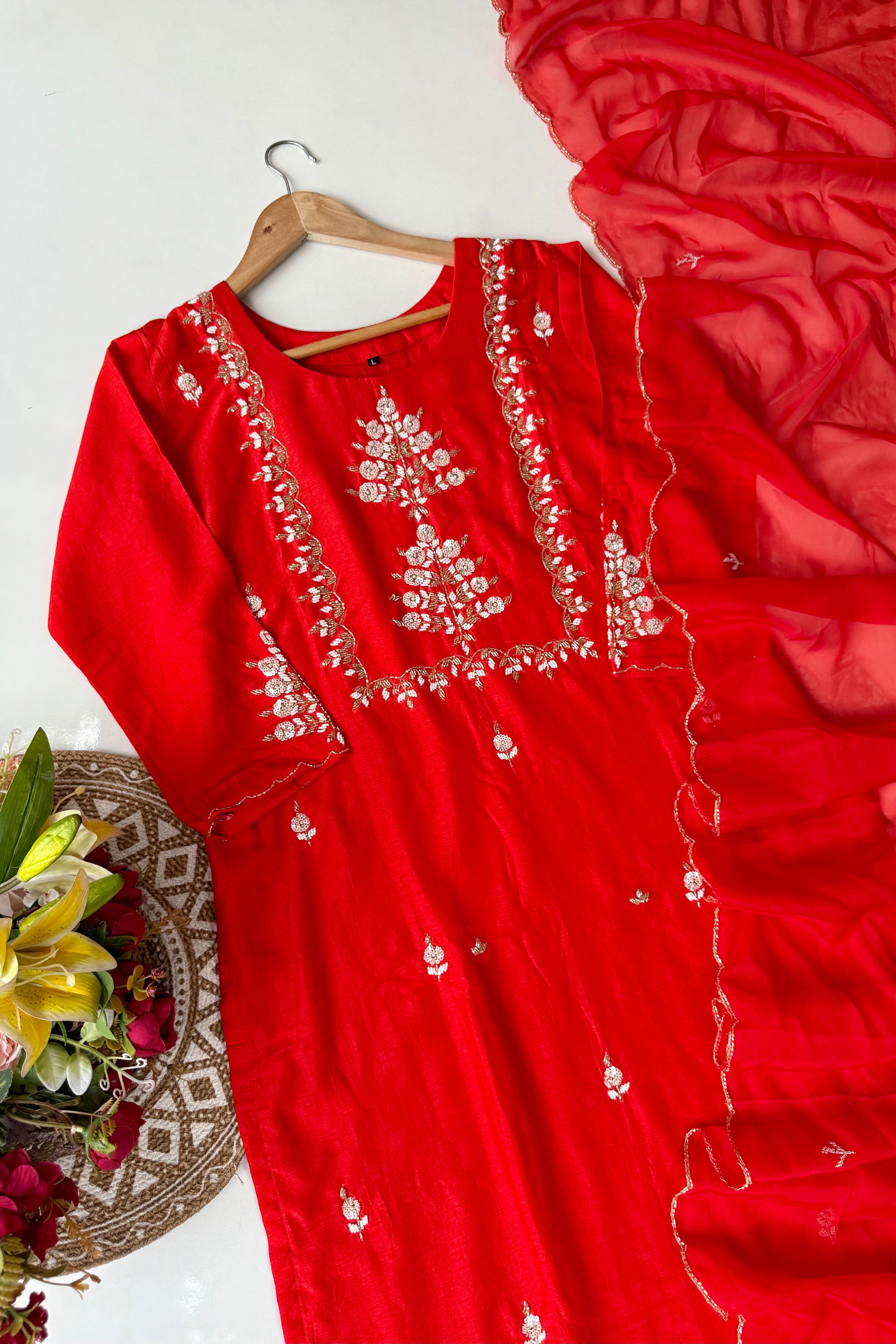 Aylize - Add a regal touch to your festive and wedding wardrobe with this stunning Dola Silk Kurta Set. The bright red base is adorned with intricate hand handwork in golden threadwork, making it a timeless piece of elegance.