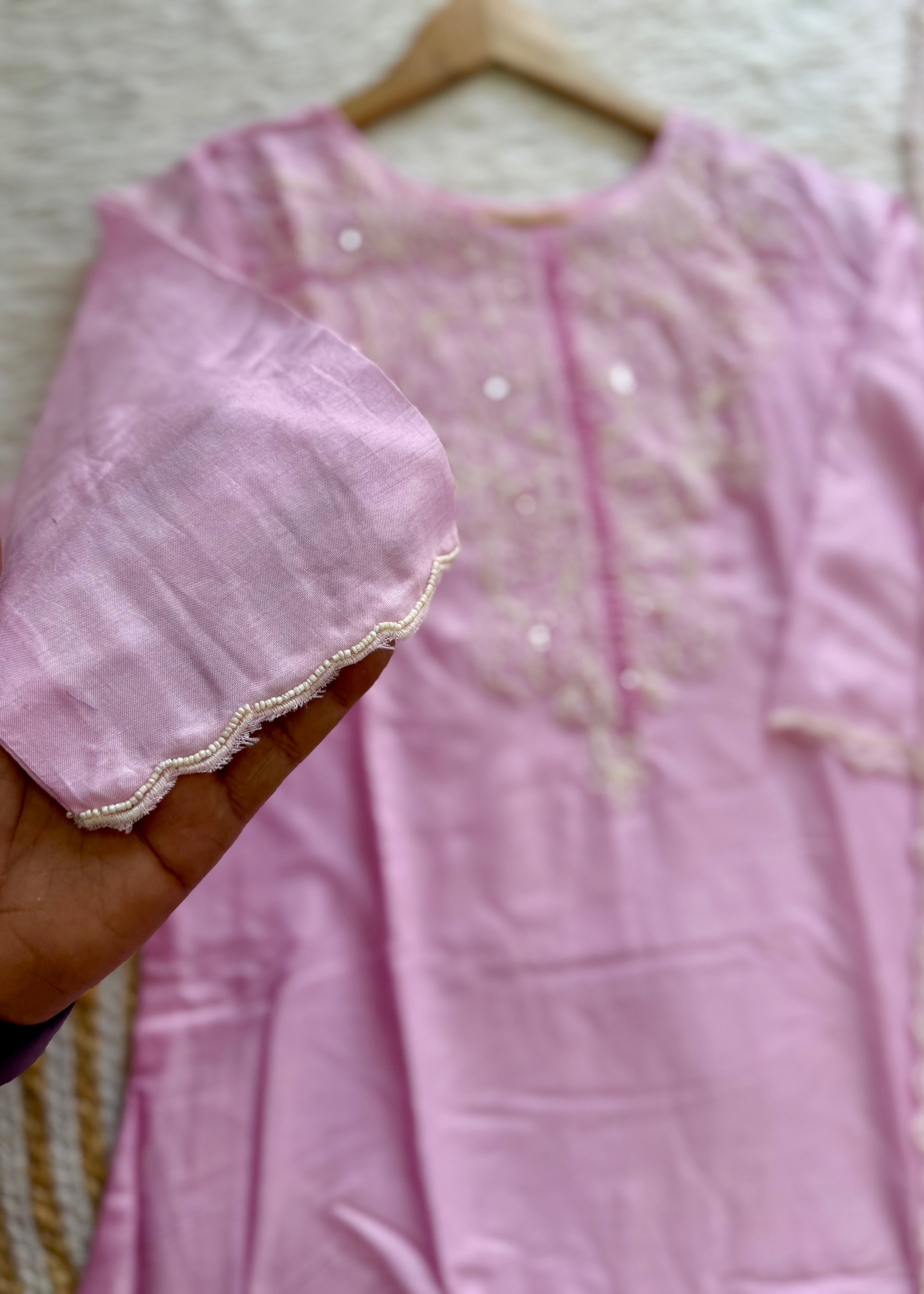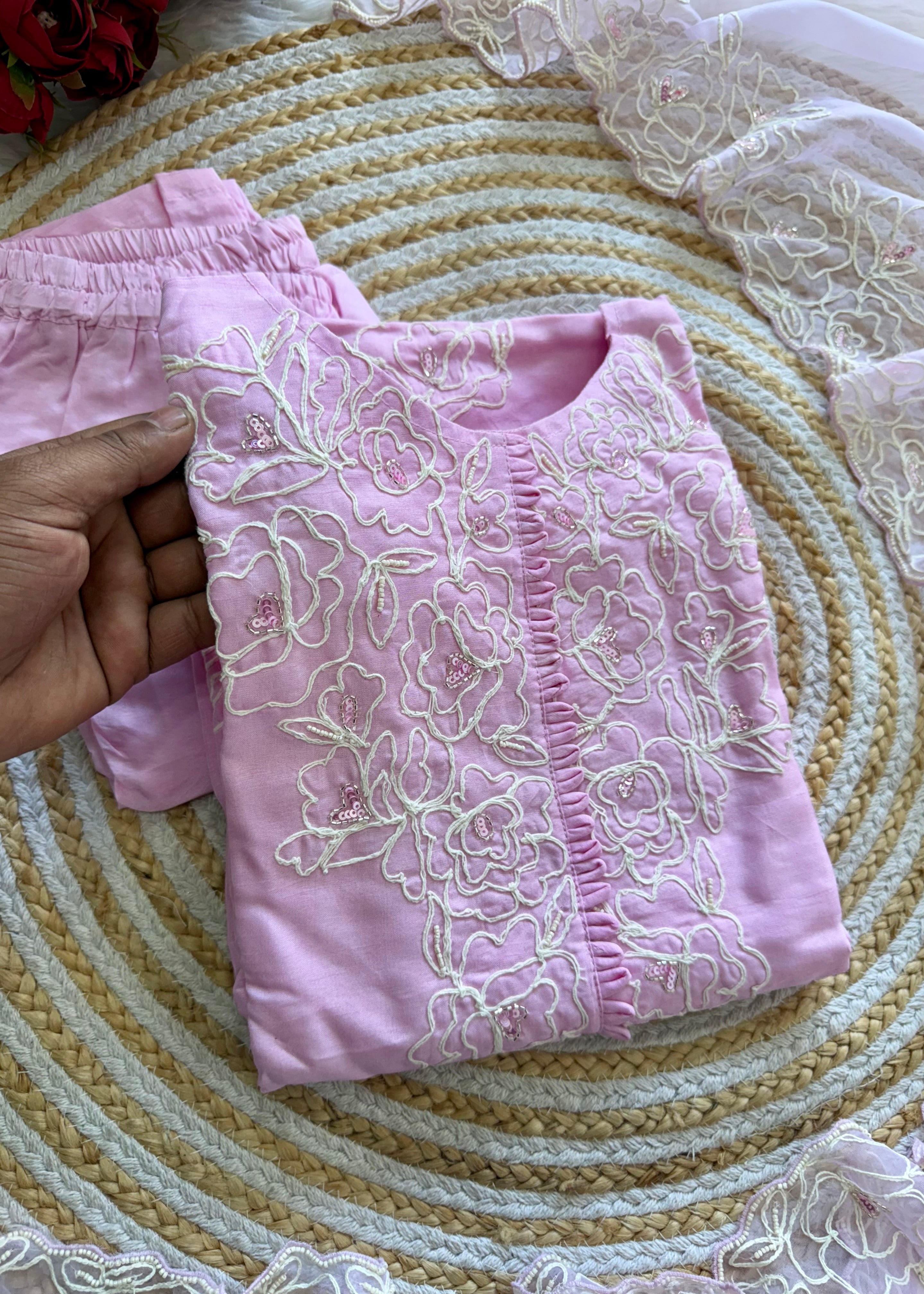 A very beautiful piece with heavy handwork on all over the kurta with a beautiful handwork detailing organza dupatta and a dola silk bottom
