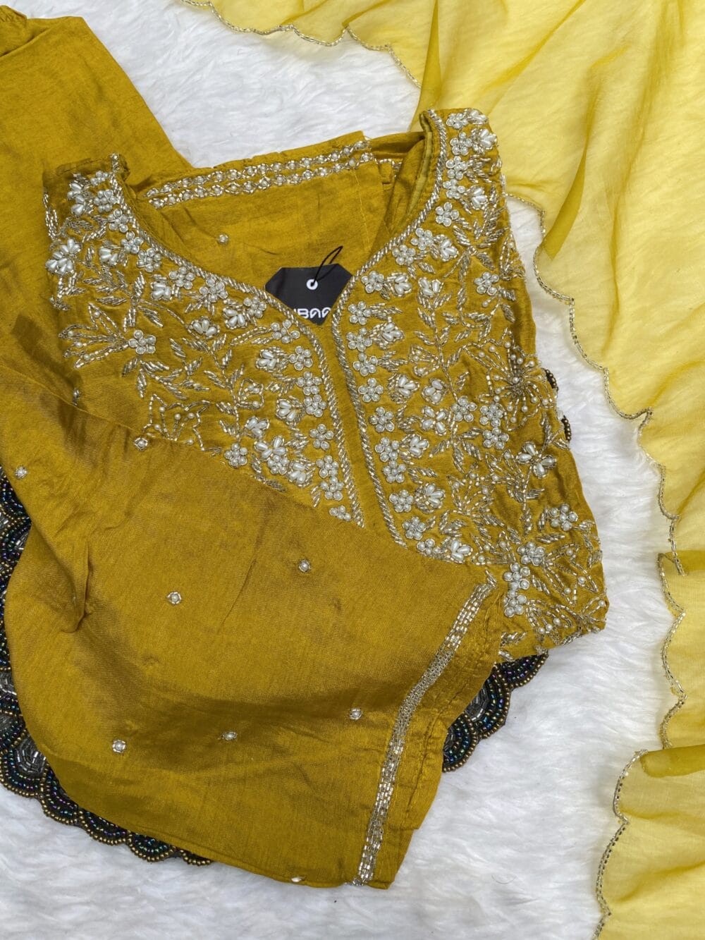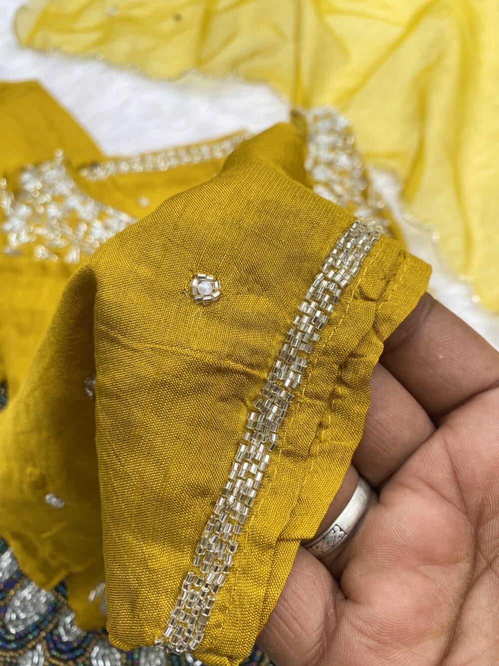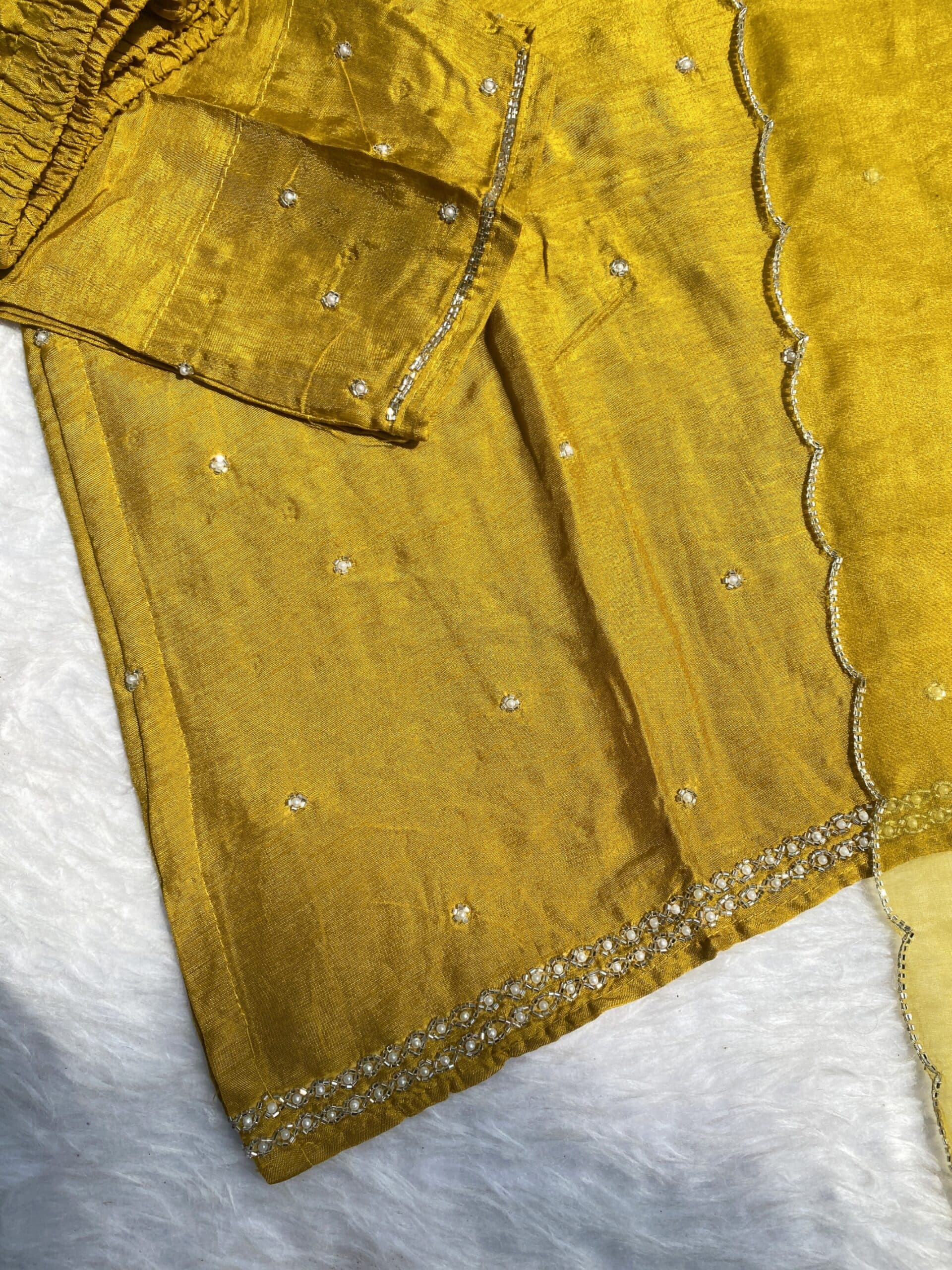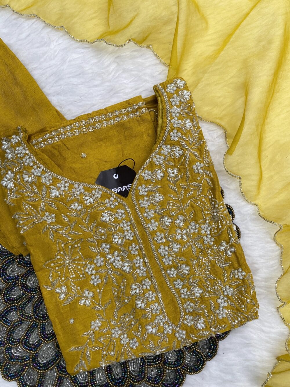 Heavy Cutdana and pearl work all over the yoke of the kurta and small pearl motives all over the top with Cutdana and pearl work on the bottom of the kurta with a long Cutdana scallope organza dupatta and a work dola silk bottom