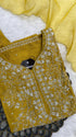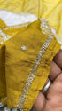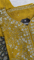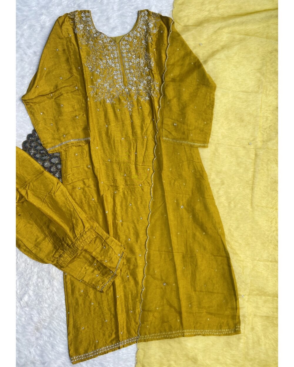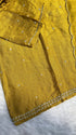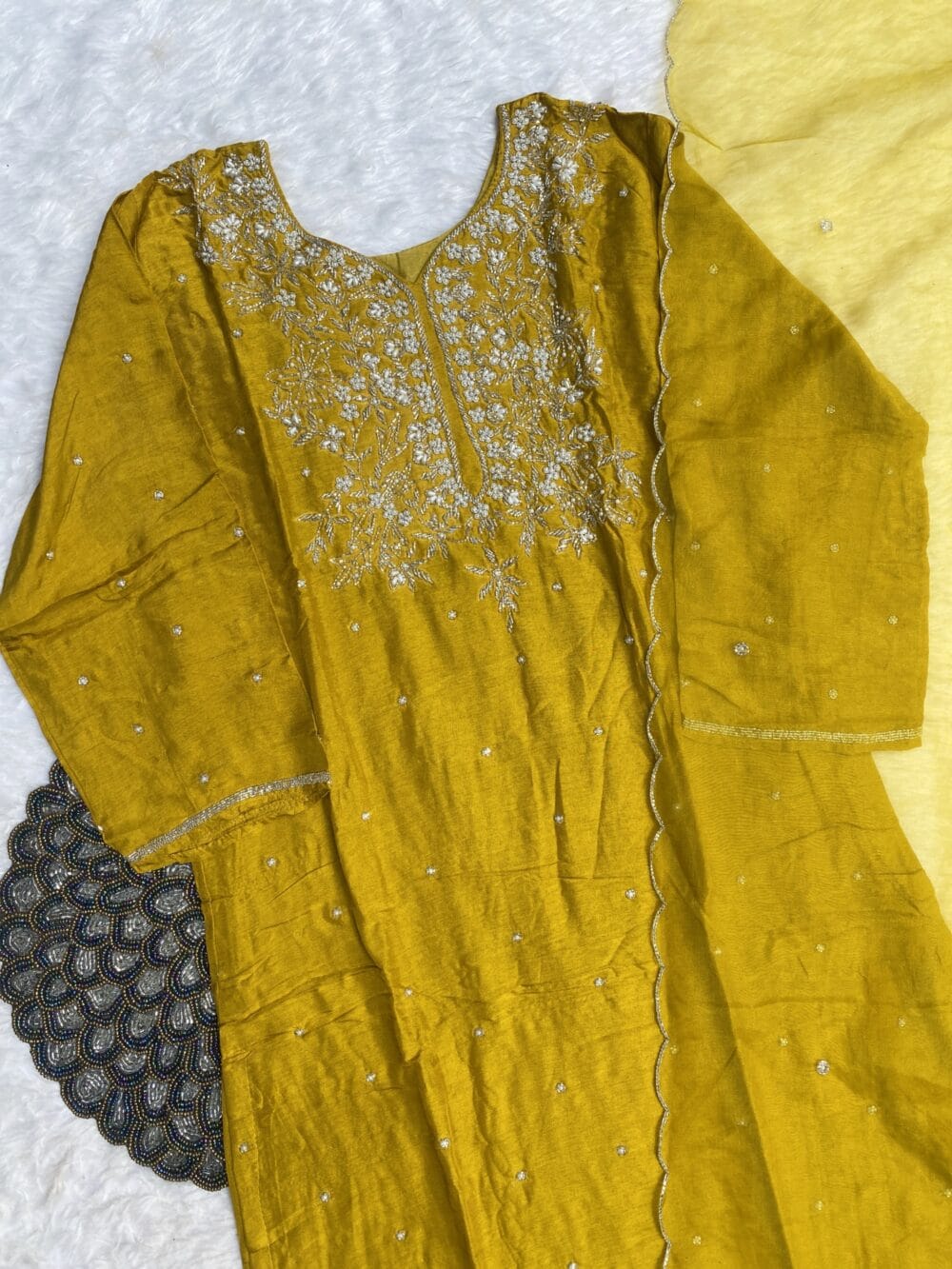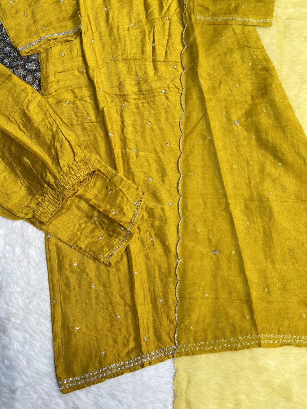 Heavy Cutdana and pearl work all over the yoke of the kurta and small pearl motives all over the top with Cutdana and pearl work on the bottom of the kurta with a long Cutdana scallope organza dupatta and a work dola silk bottom