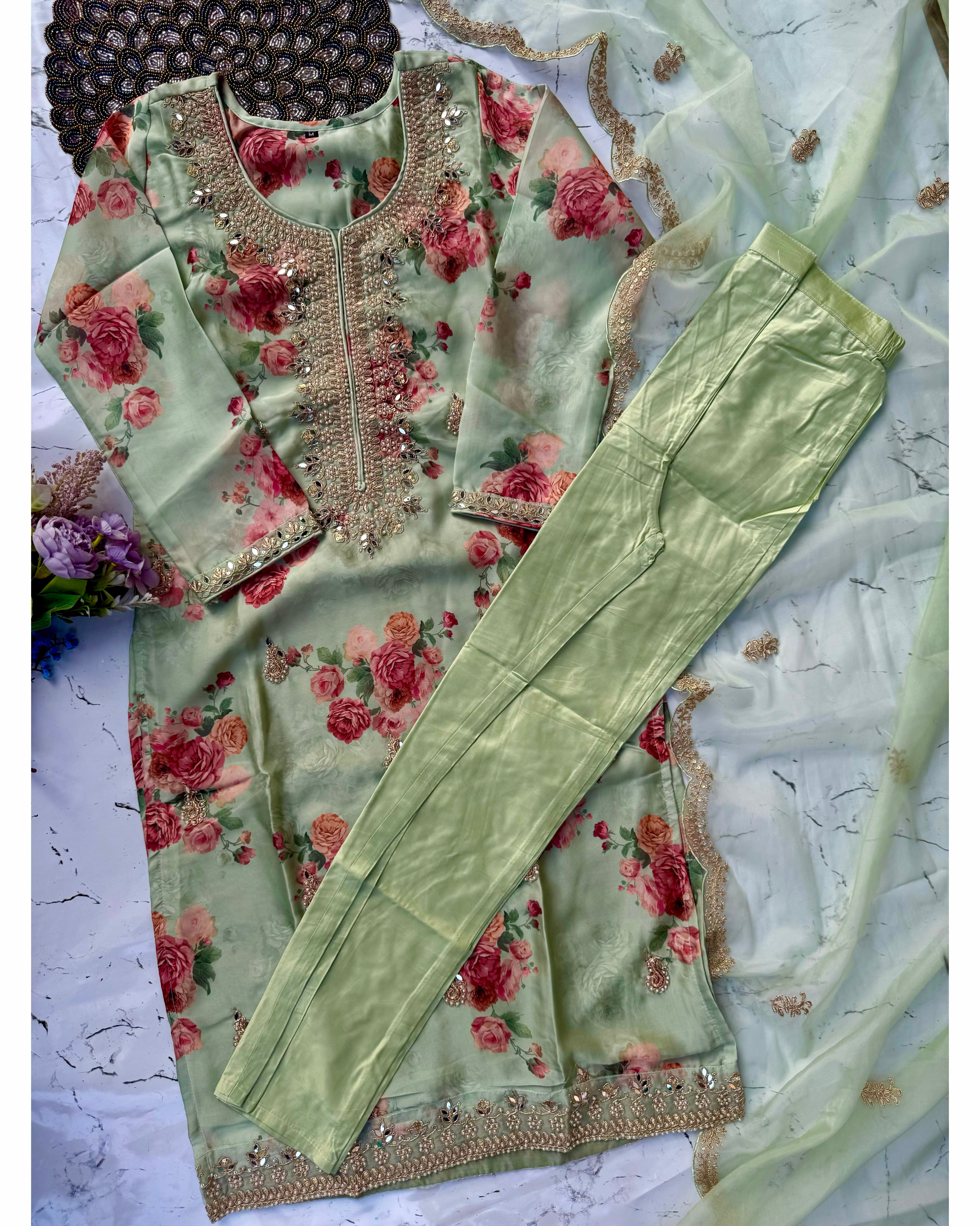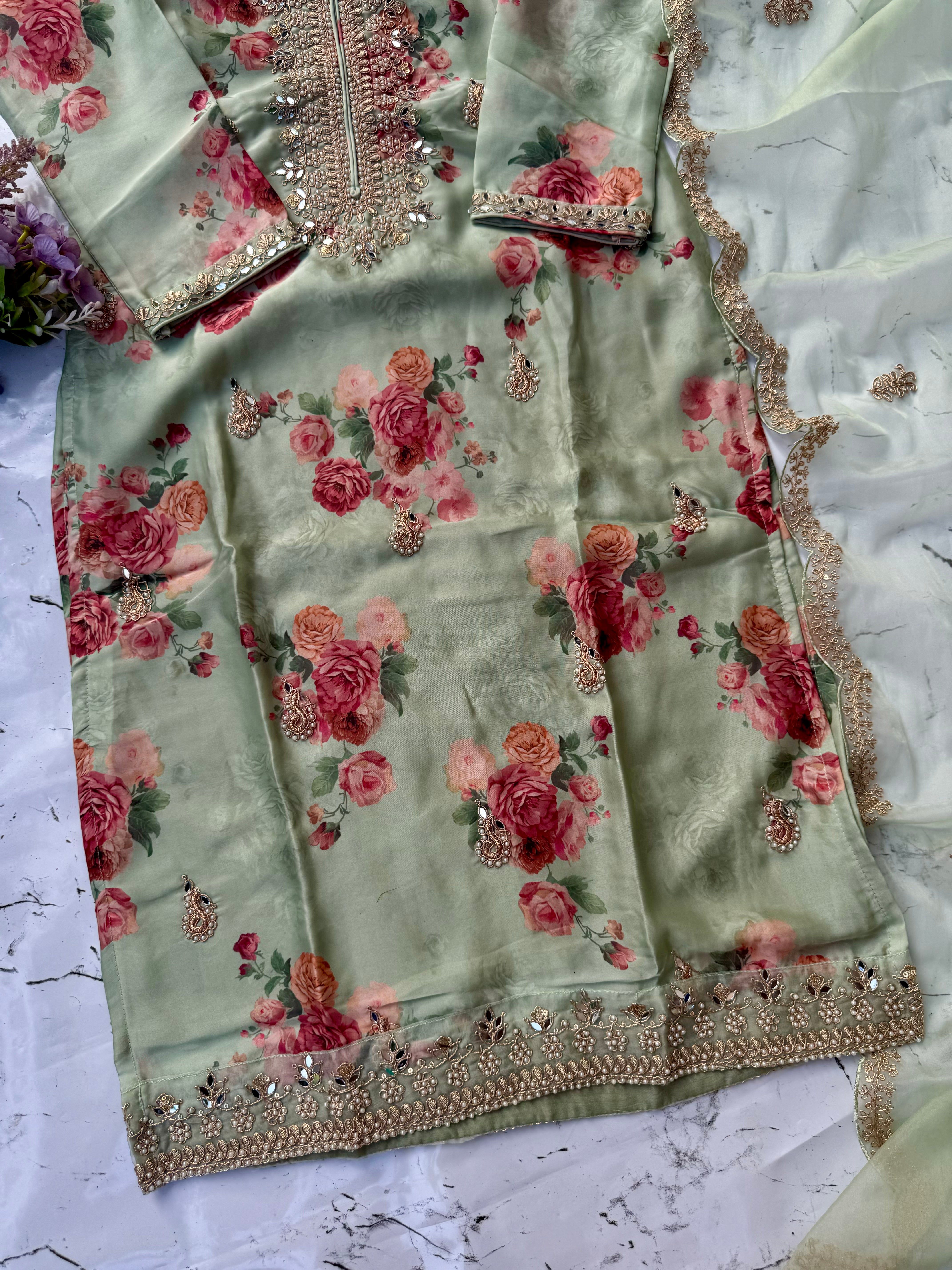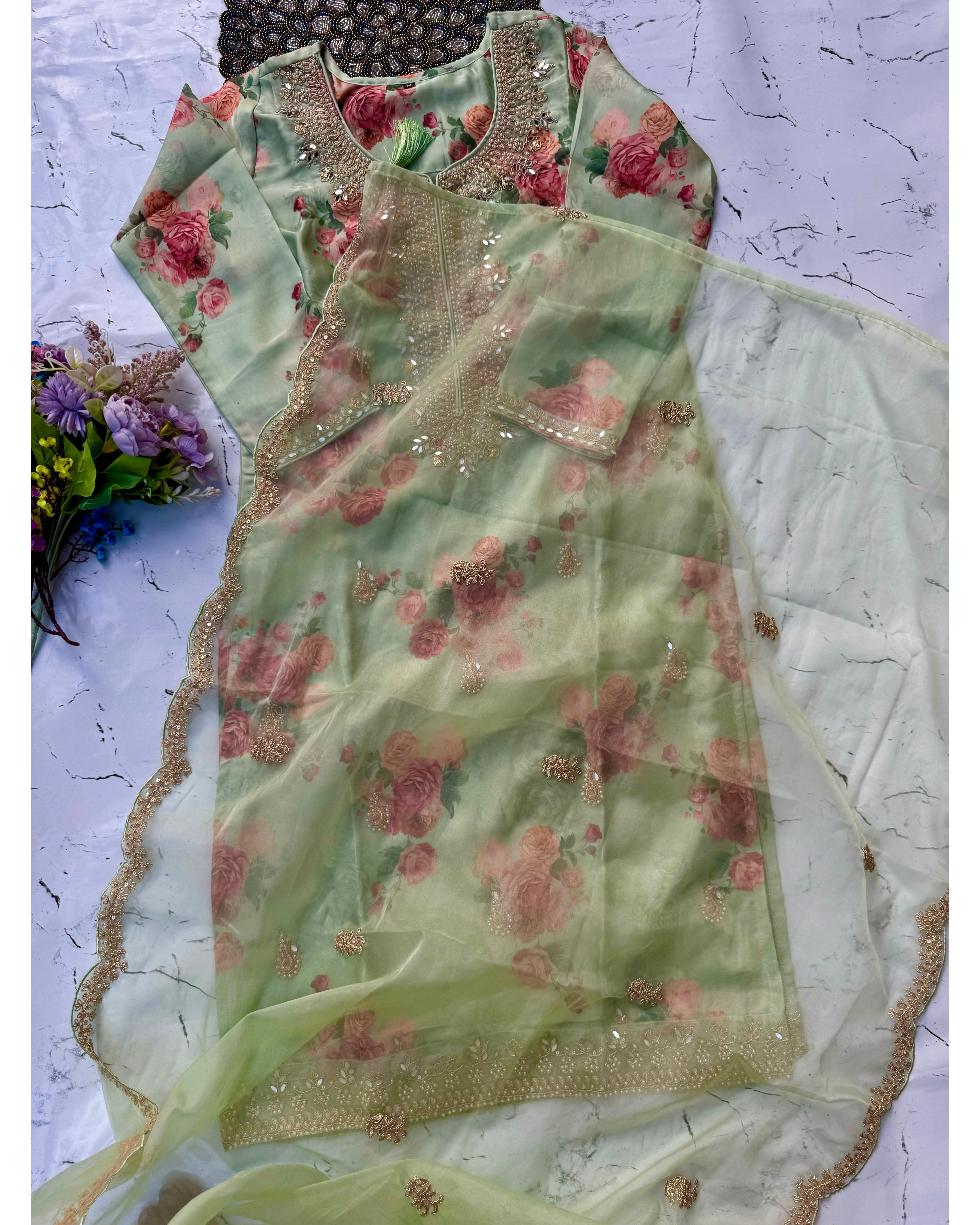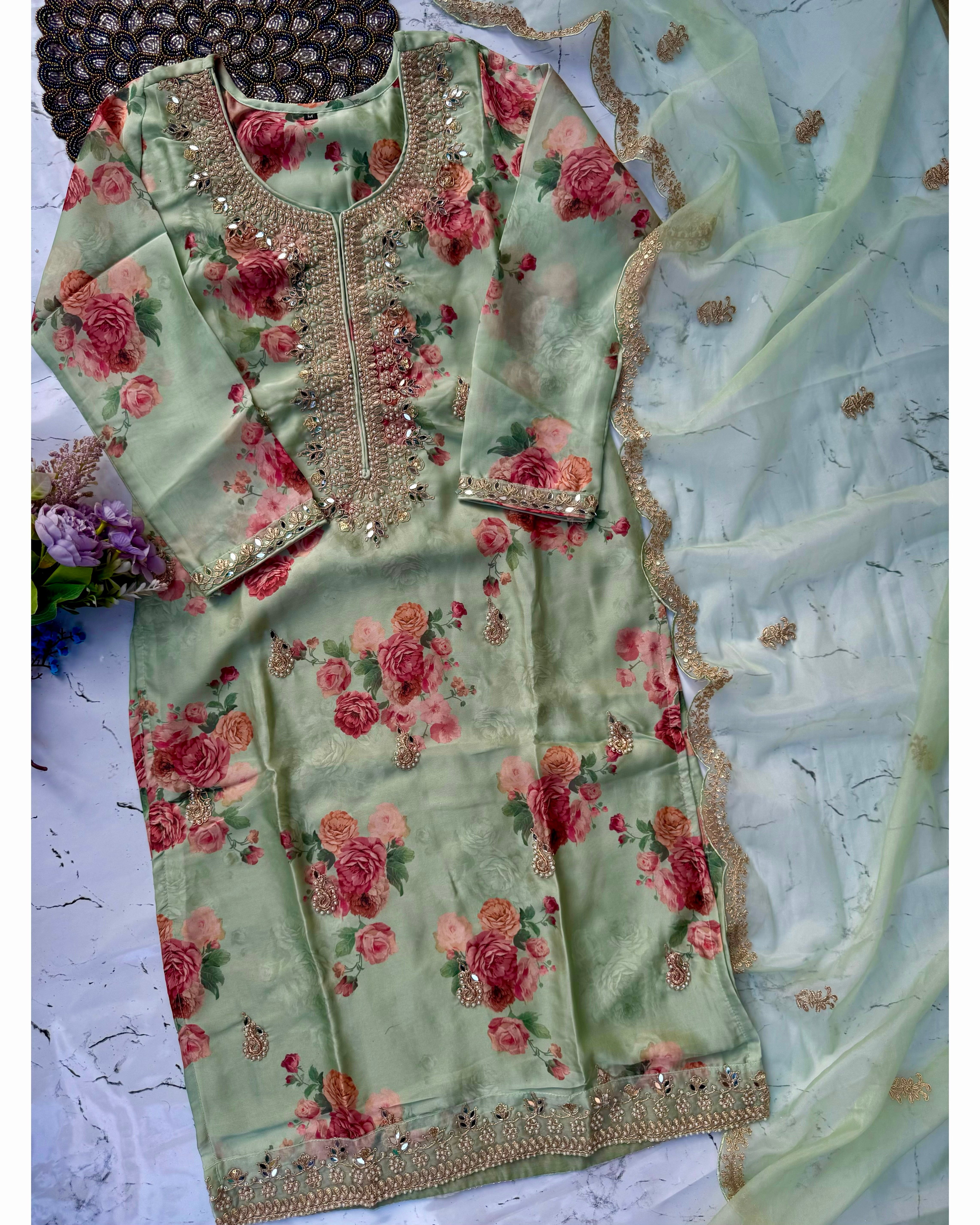 "Aditi" Pista green organza printed & handwork stright kurta set