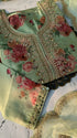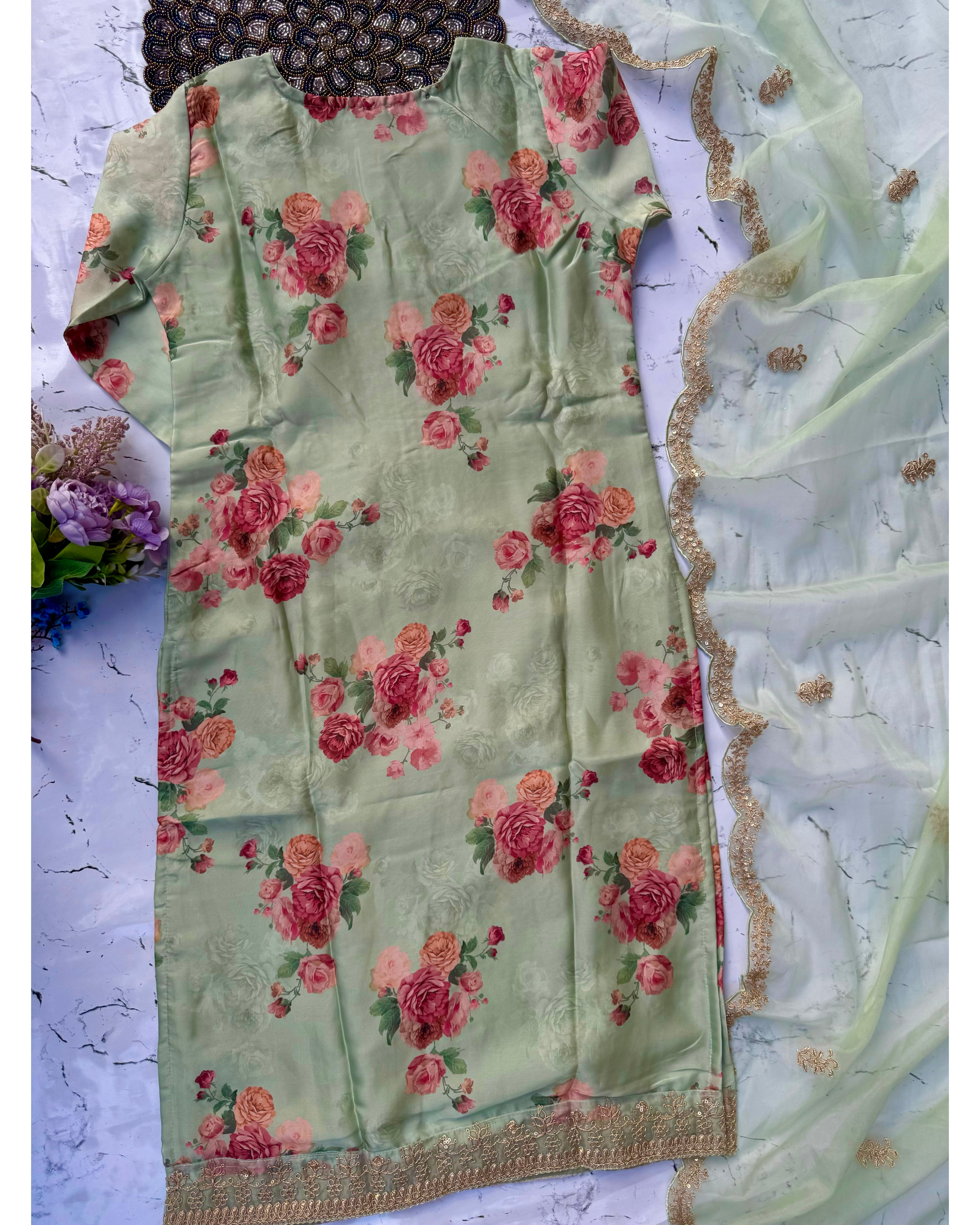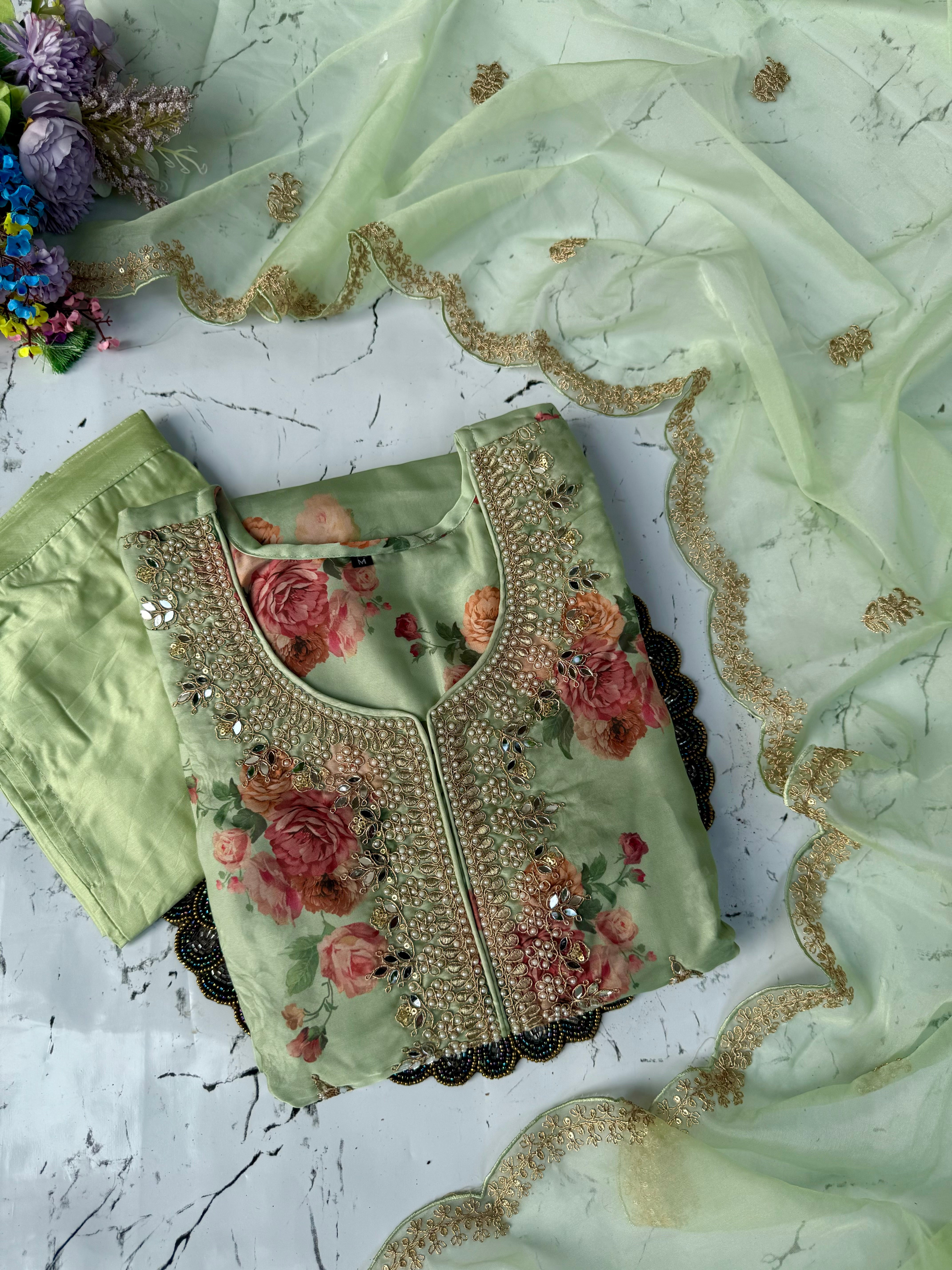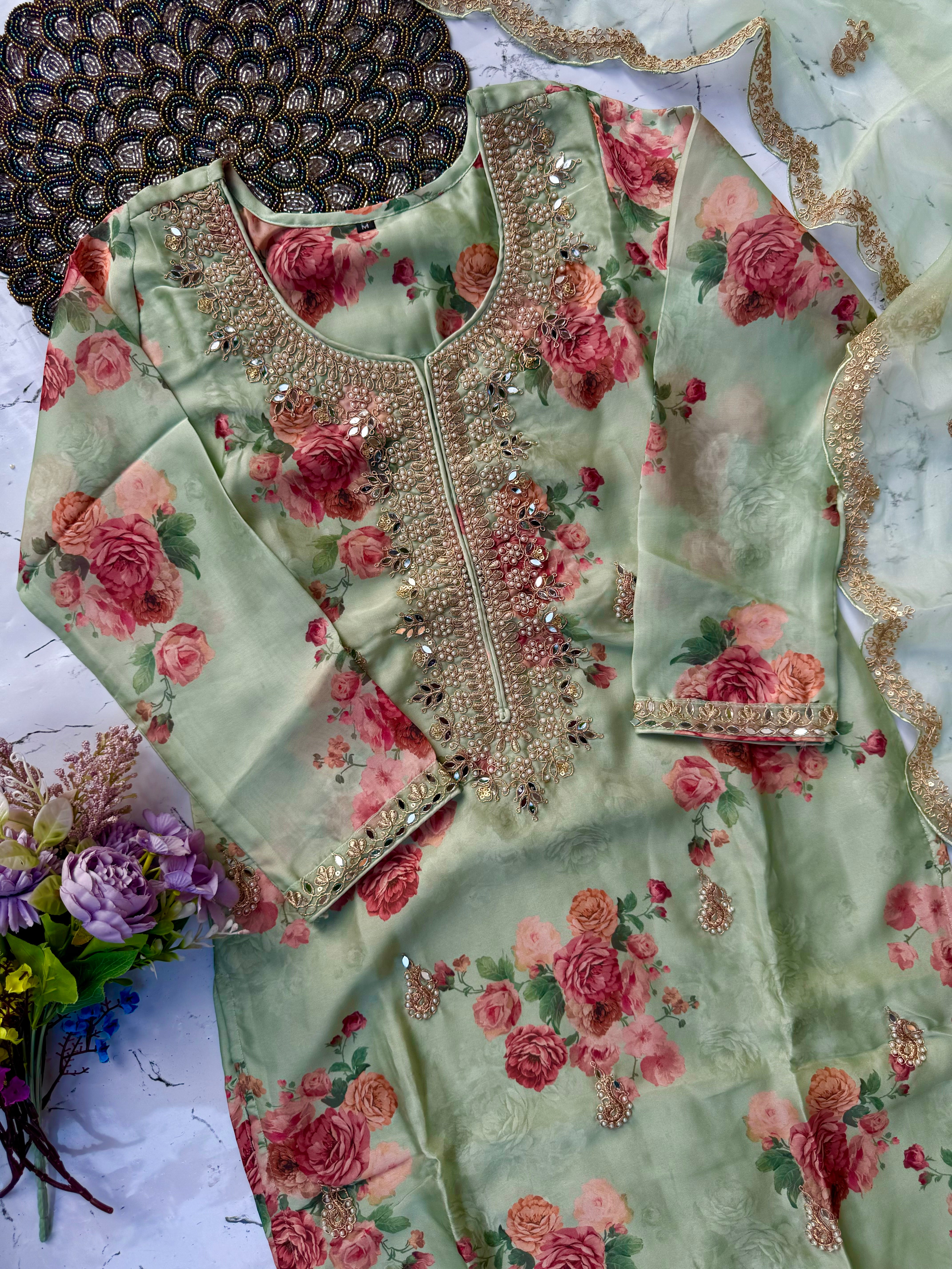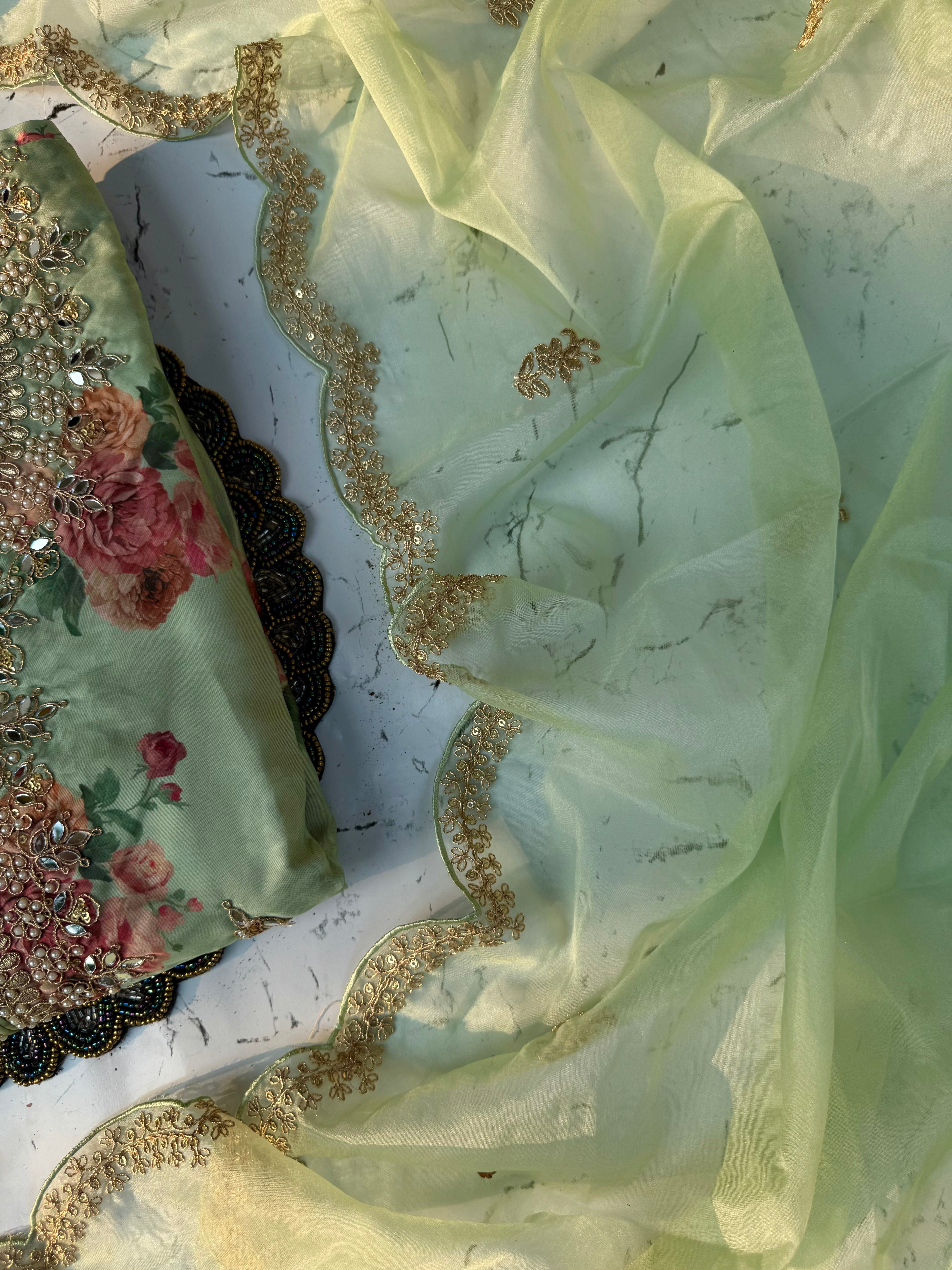 "Aditi" Pista green organza printed & handwork stright kurta set