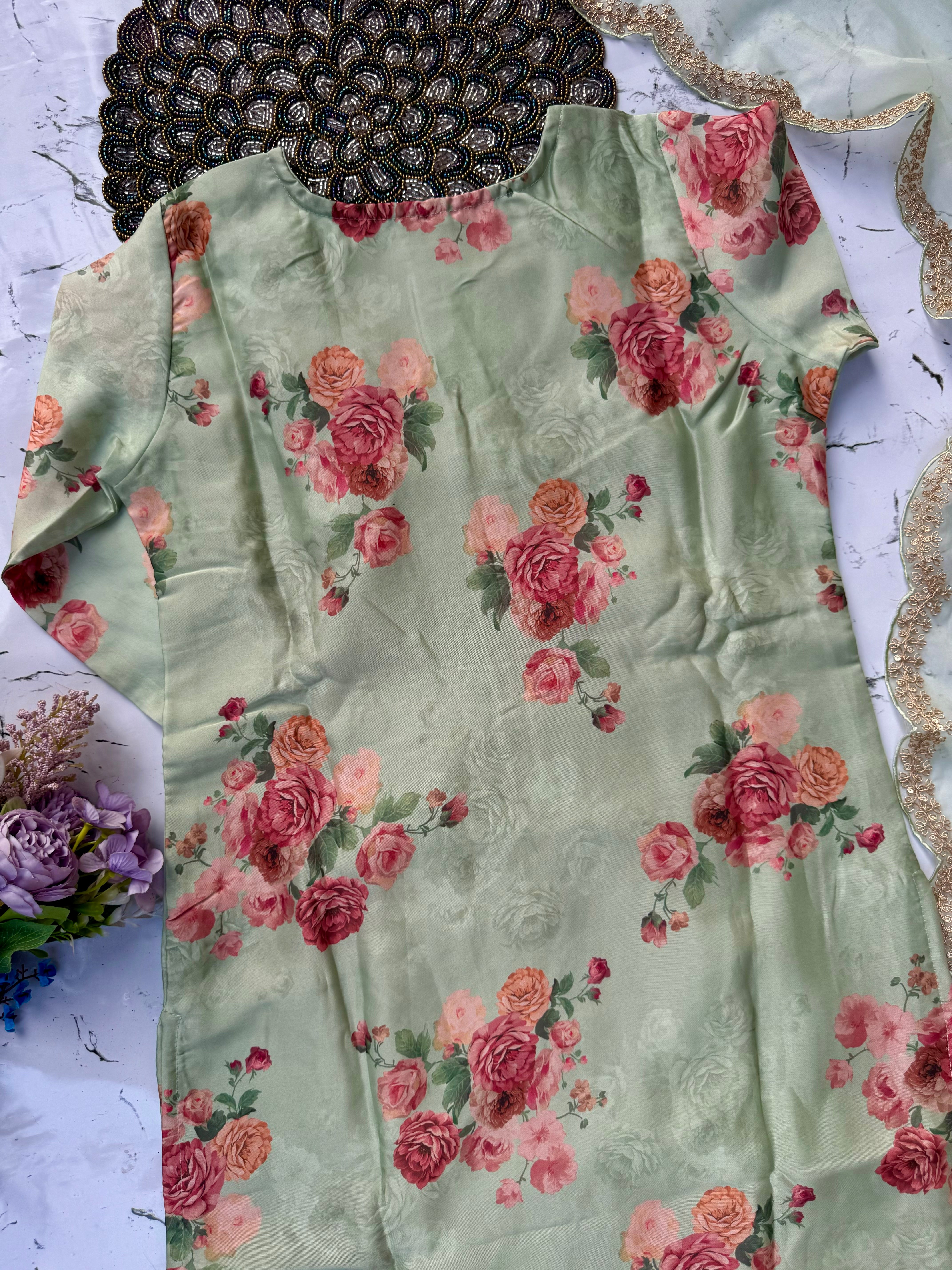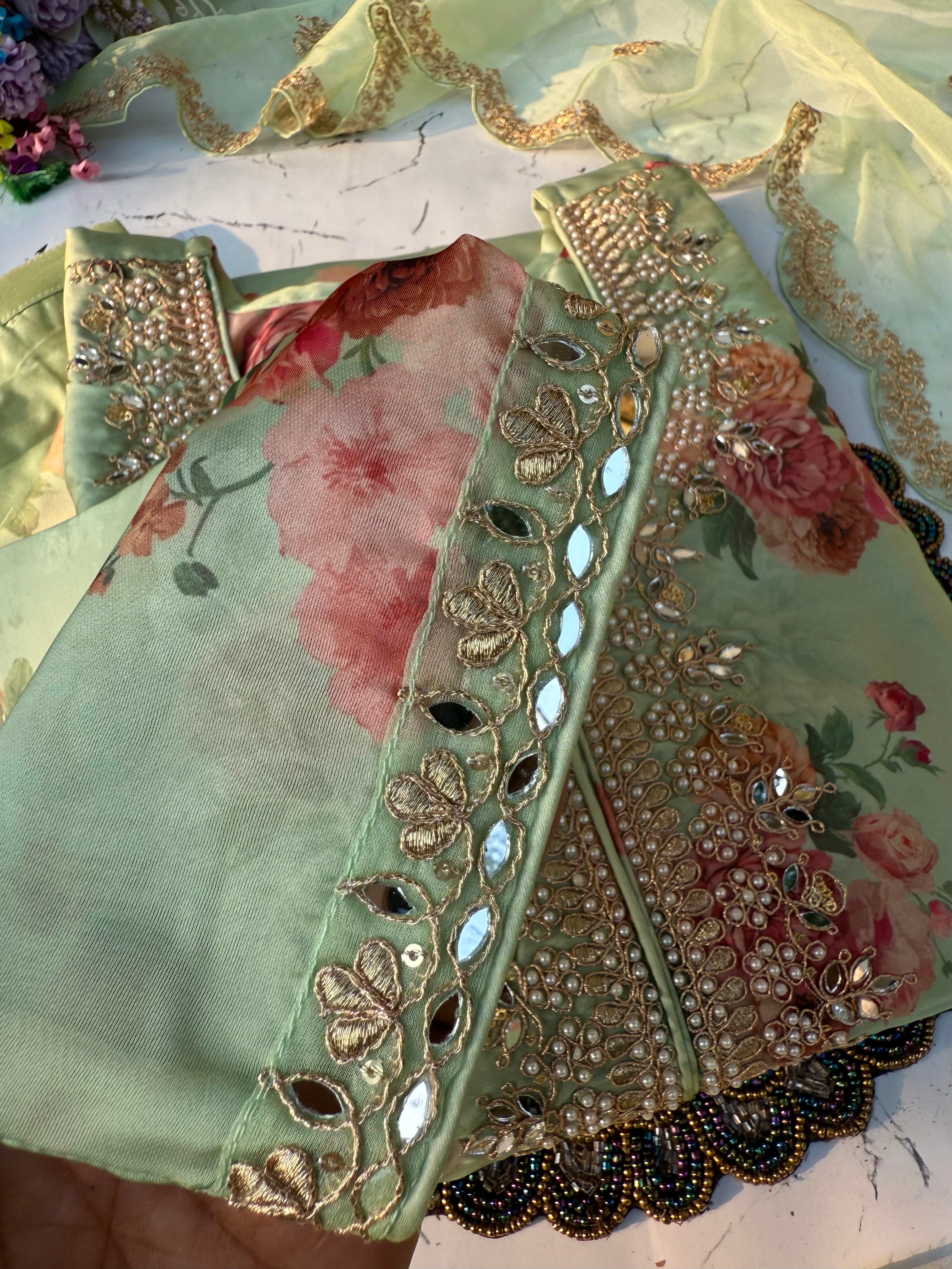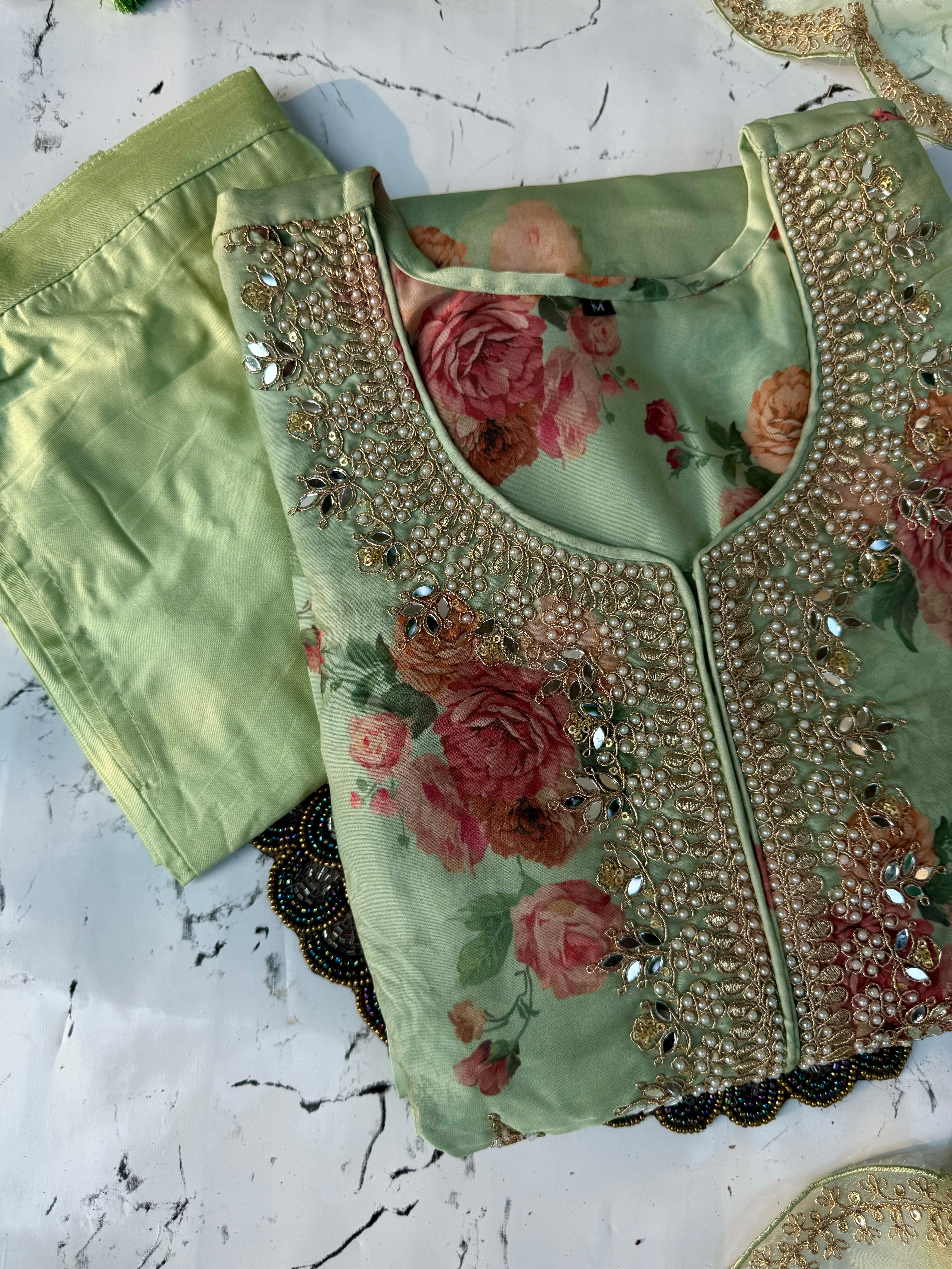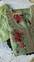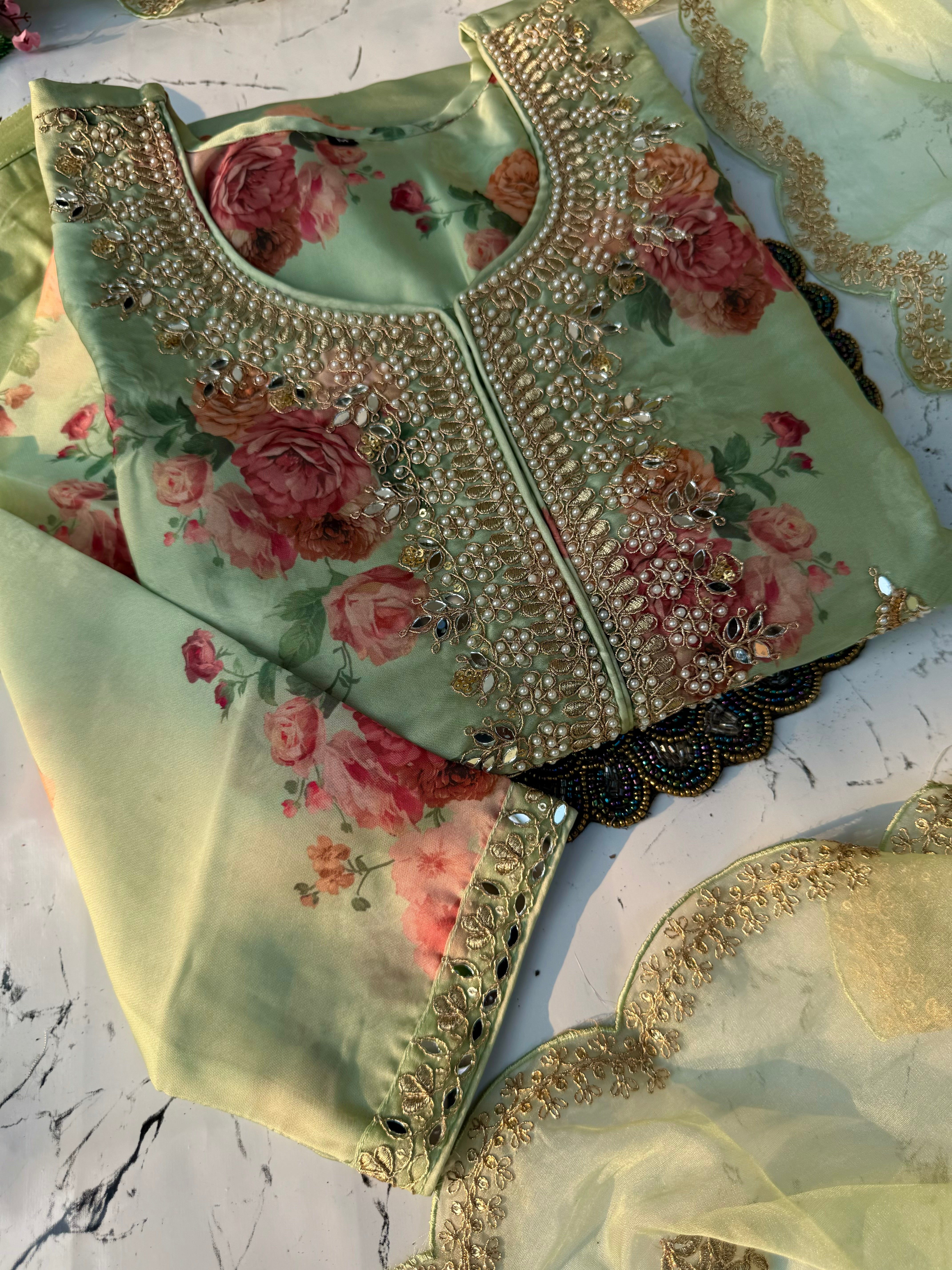 "Aditi" Pista green organza printed & handwork stright kurta set