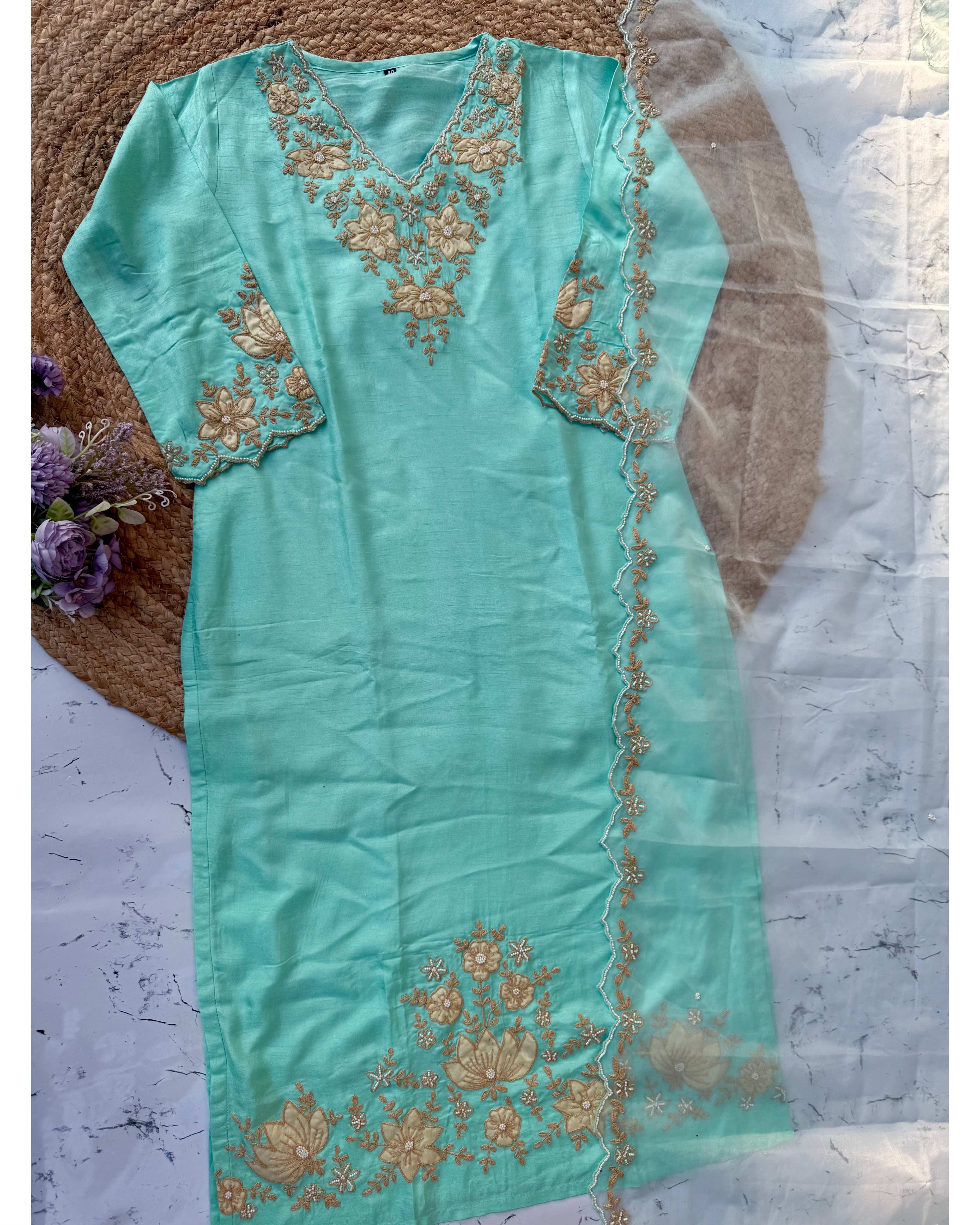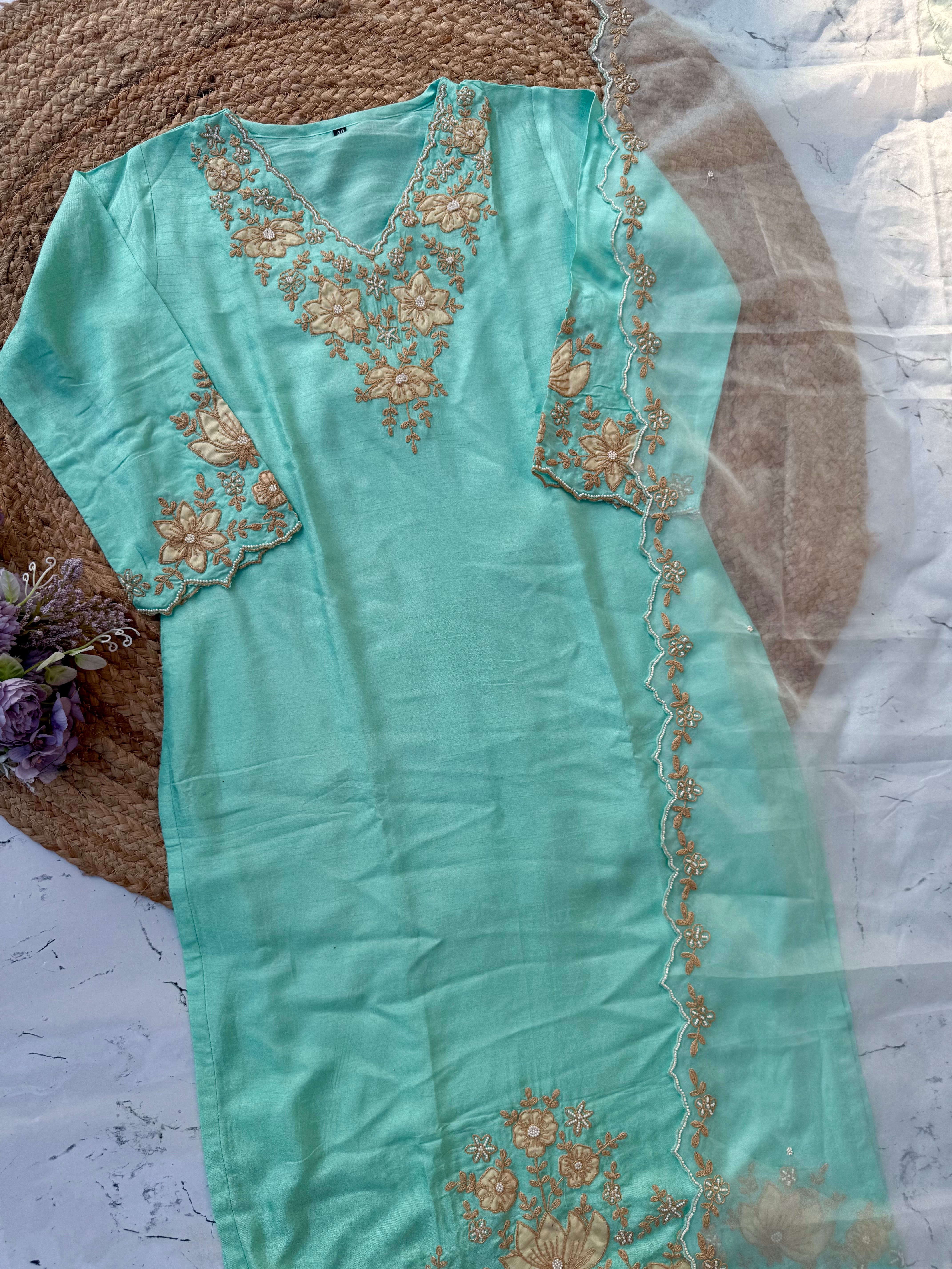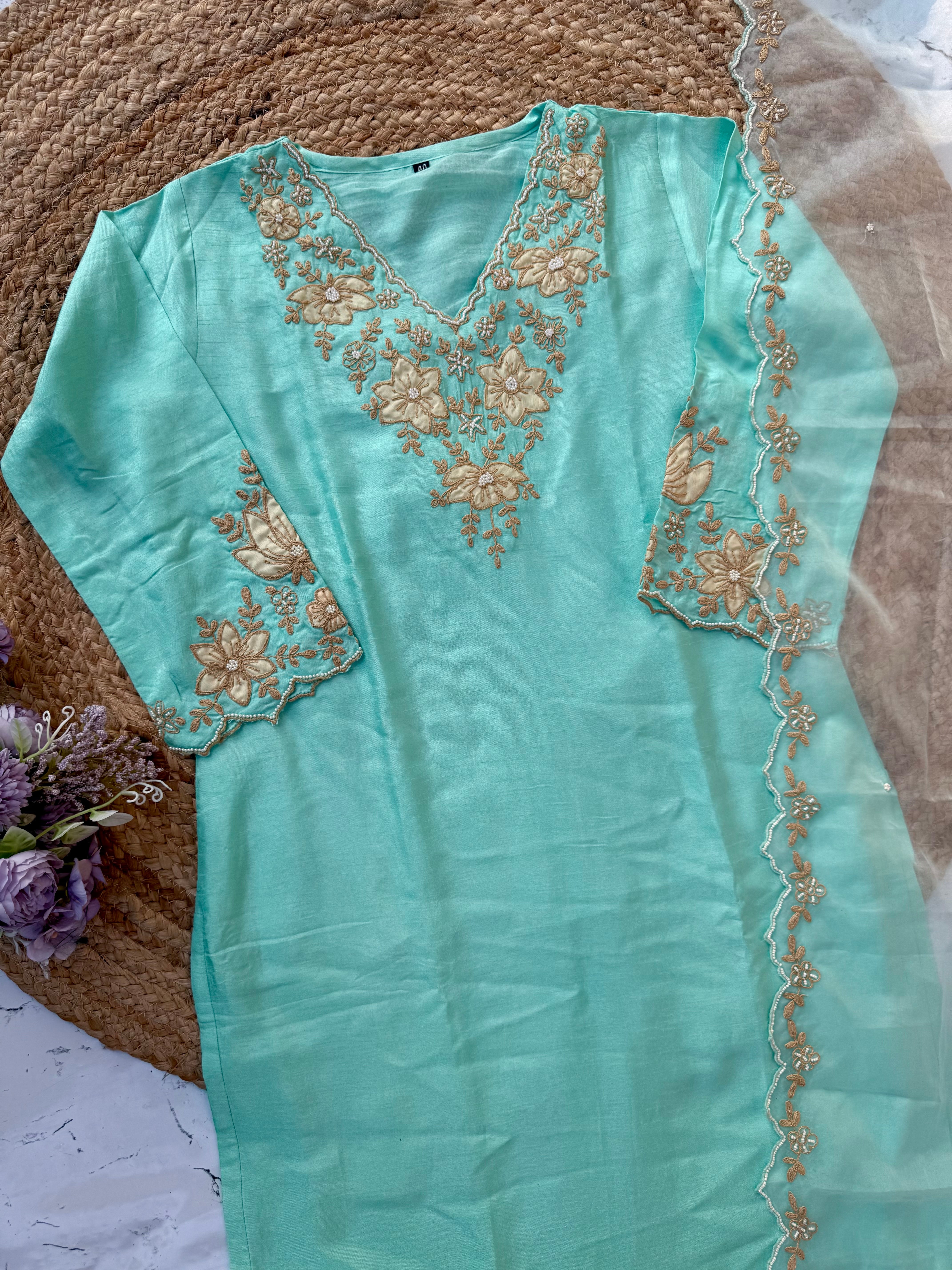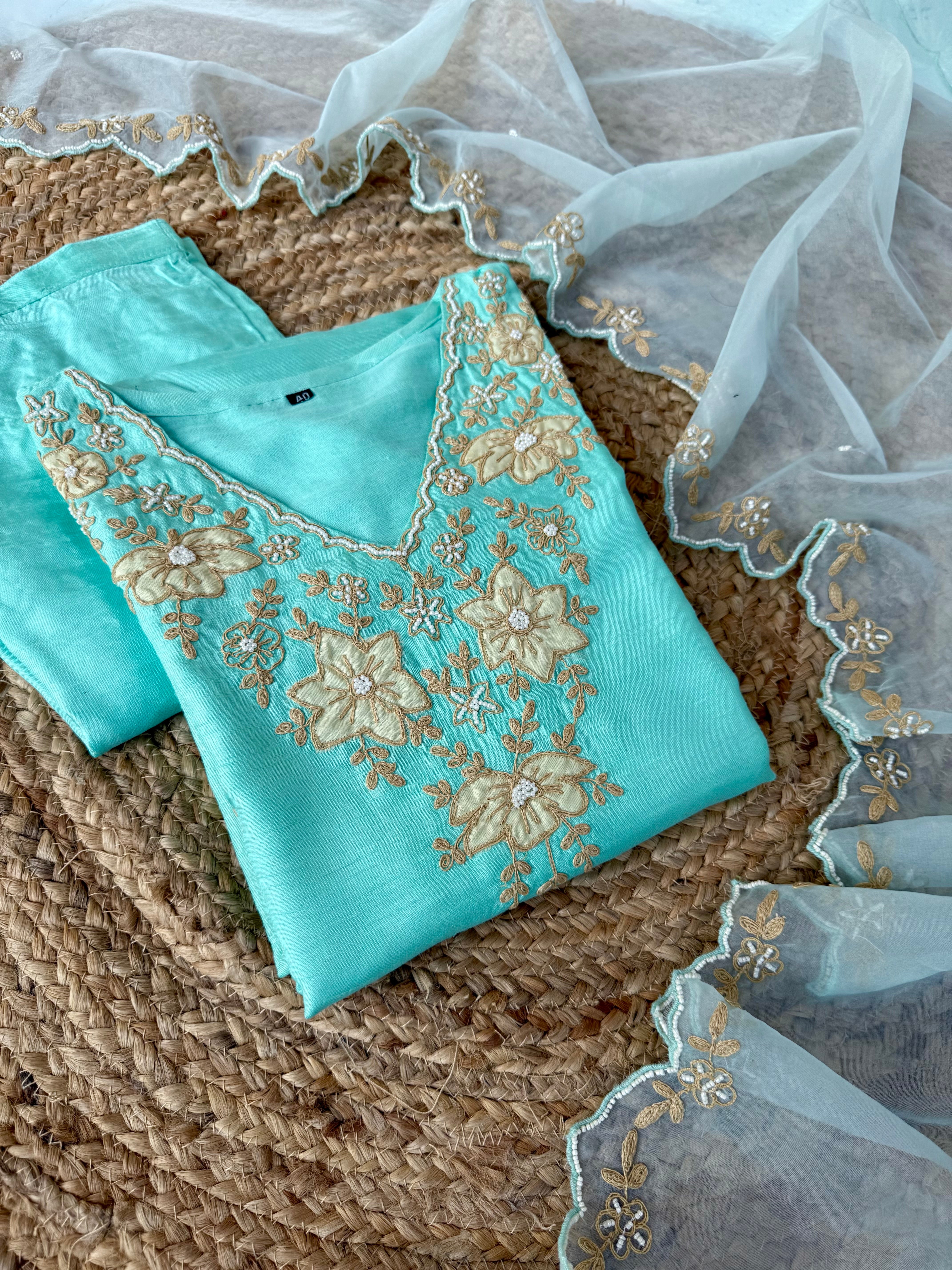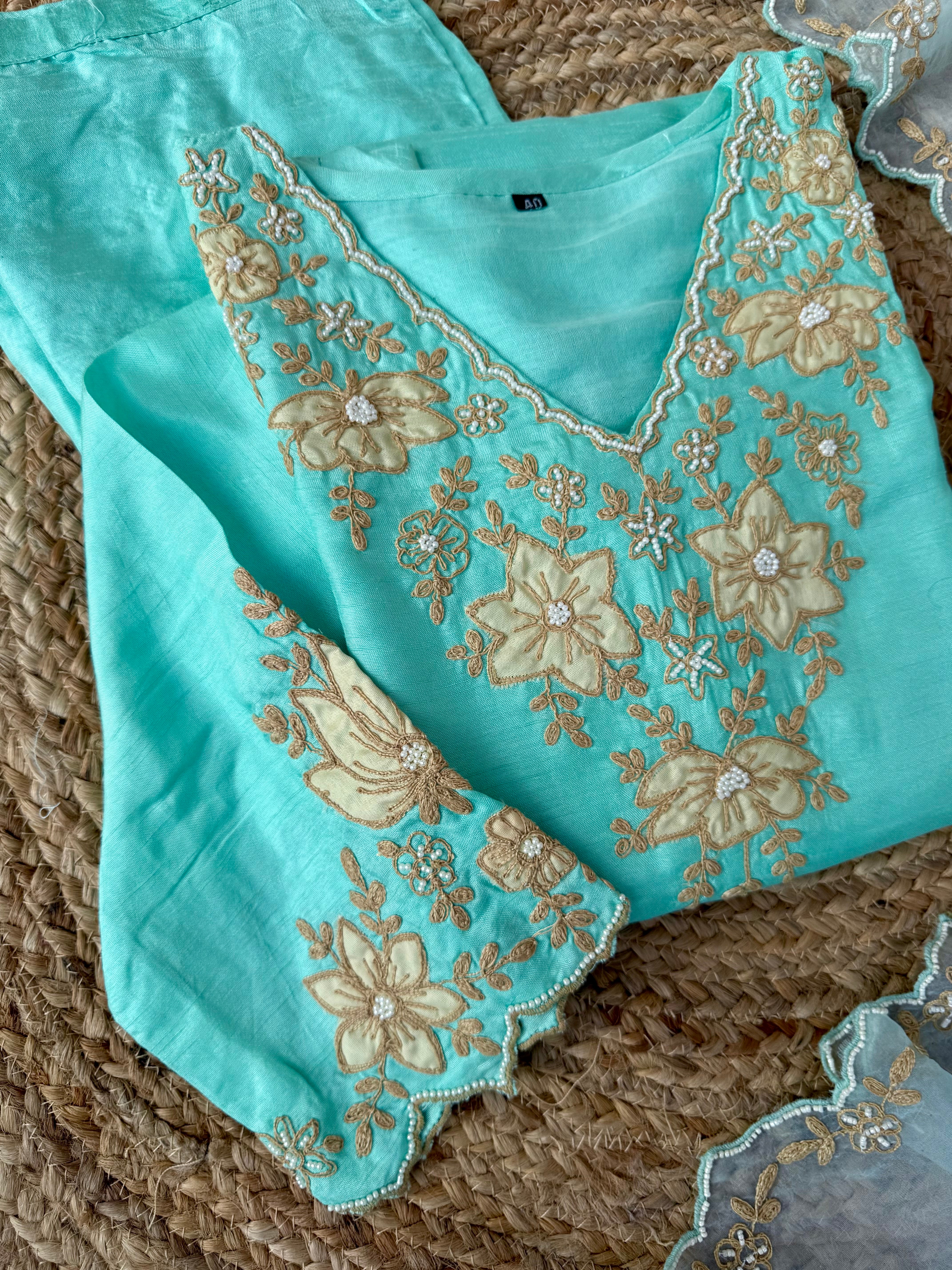Applique work handcrafted kurta set with work on the yoke Daman and sleeve of the kurta with a premium range viscose organza dupatta with applique work paired with a silk bottom with work