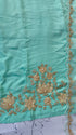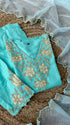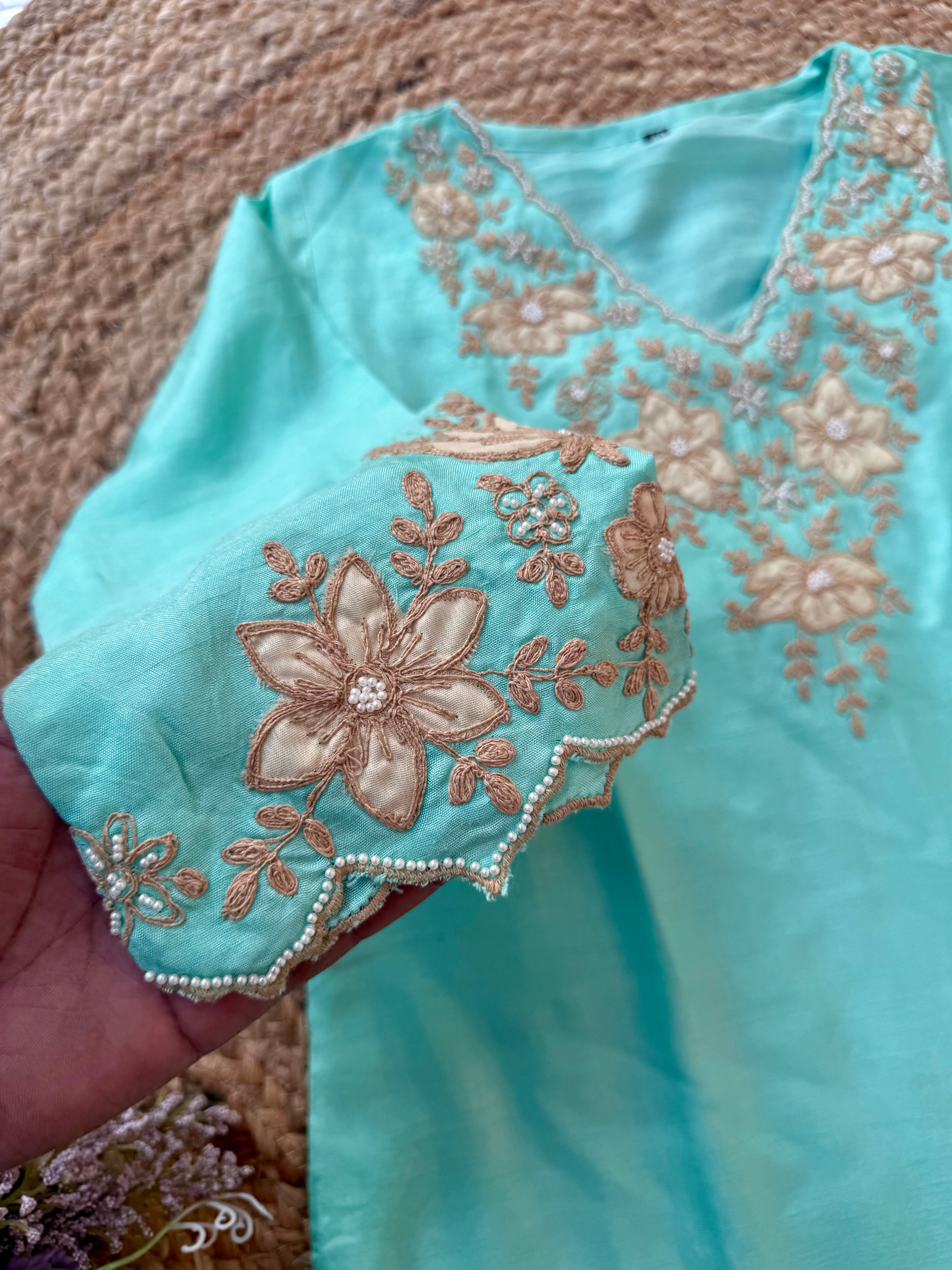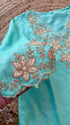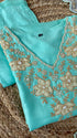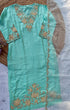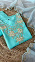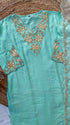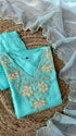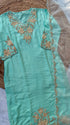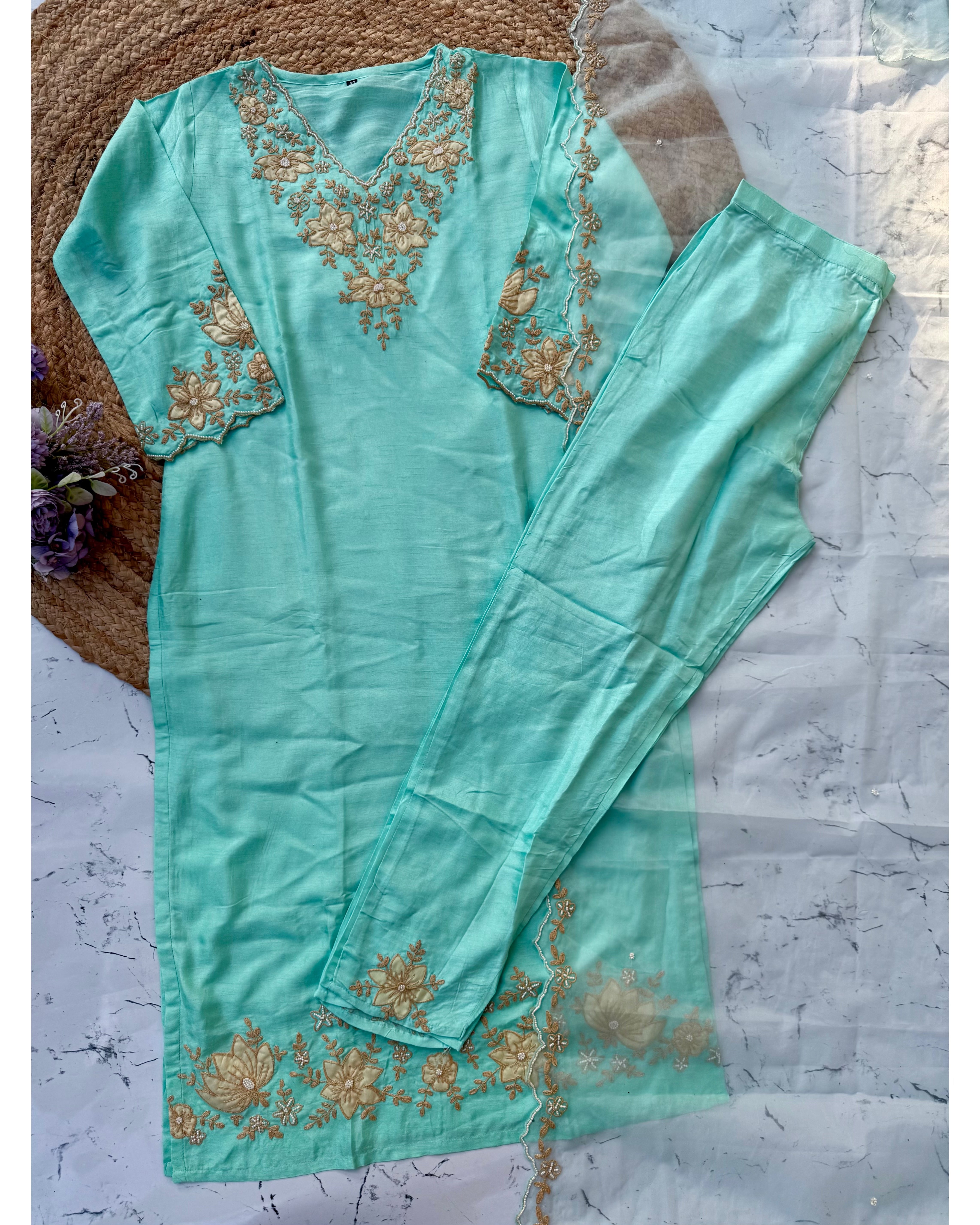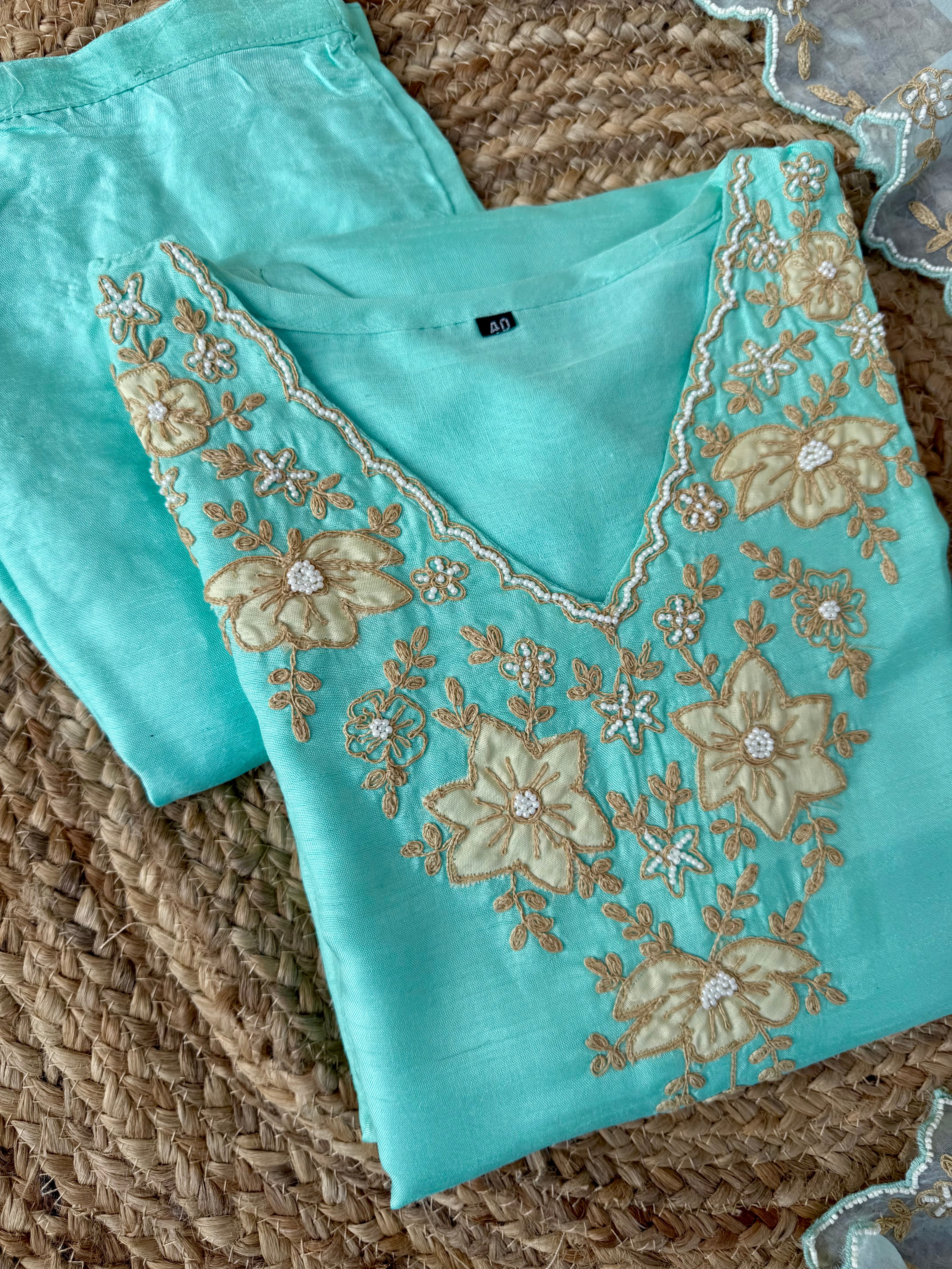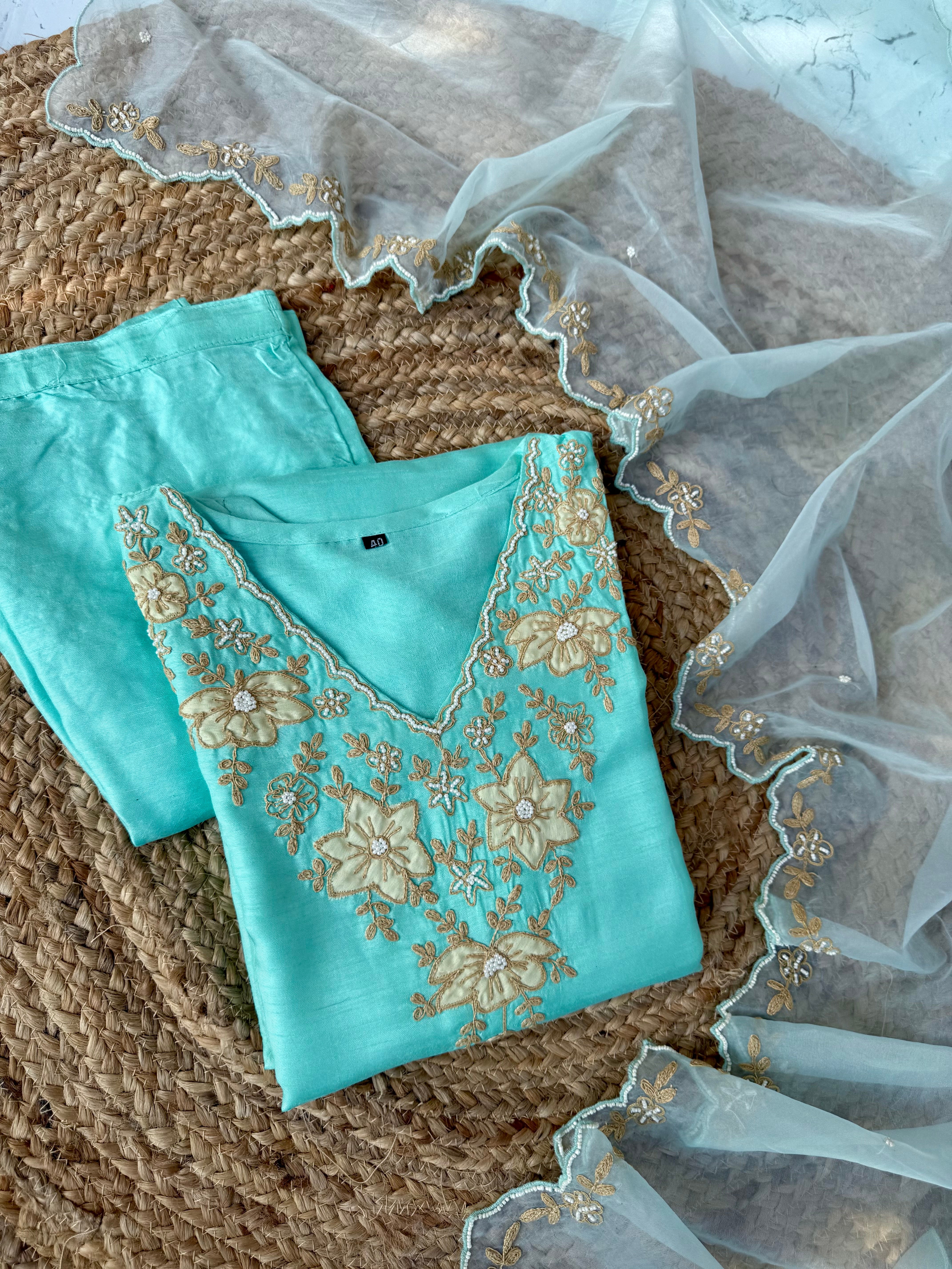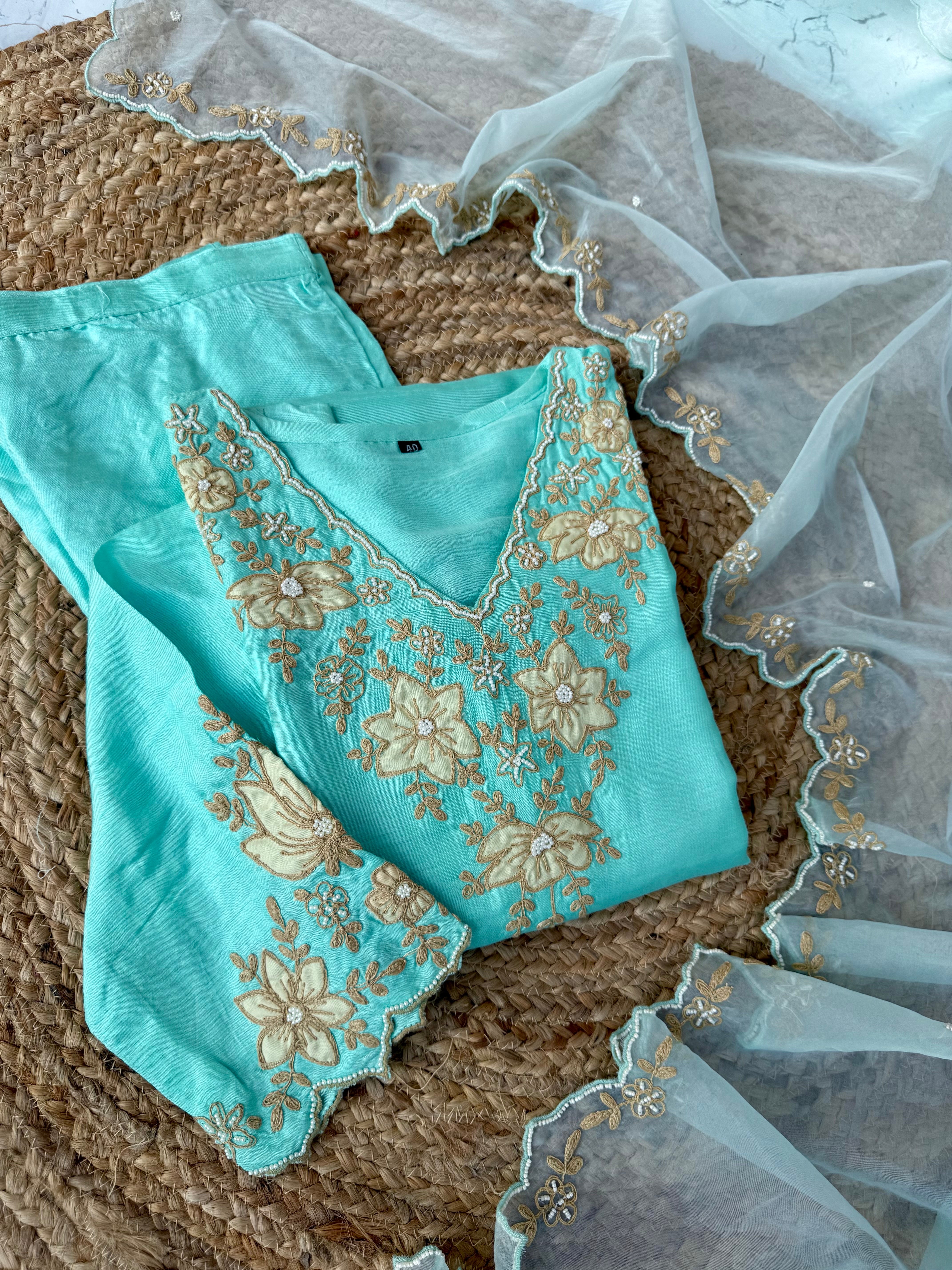 Applique work handcrafted kurta set with work on the yoke Daman and sleeve of the kurta with a premium range viscose organza dupatta with applique work paired with a silk bottom with work