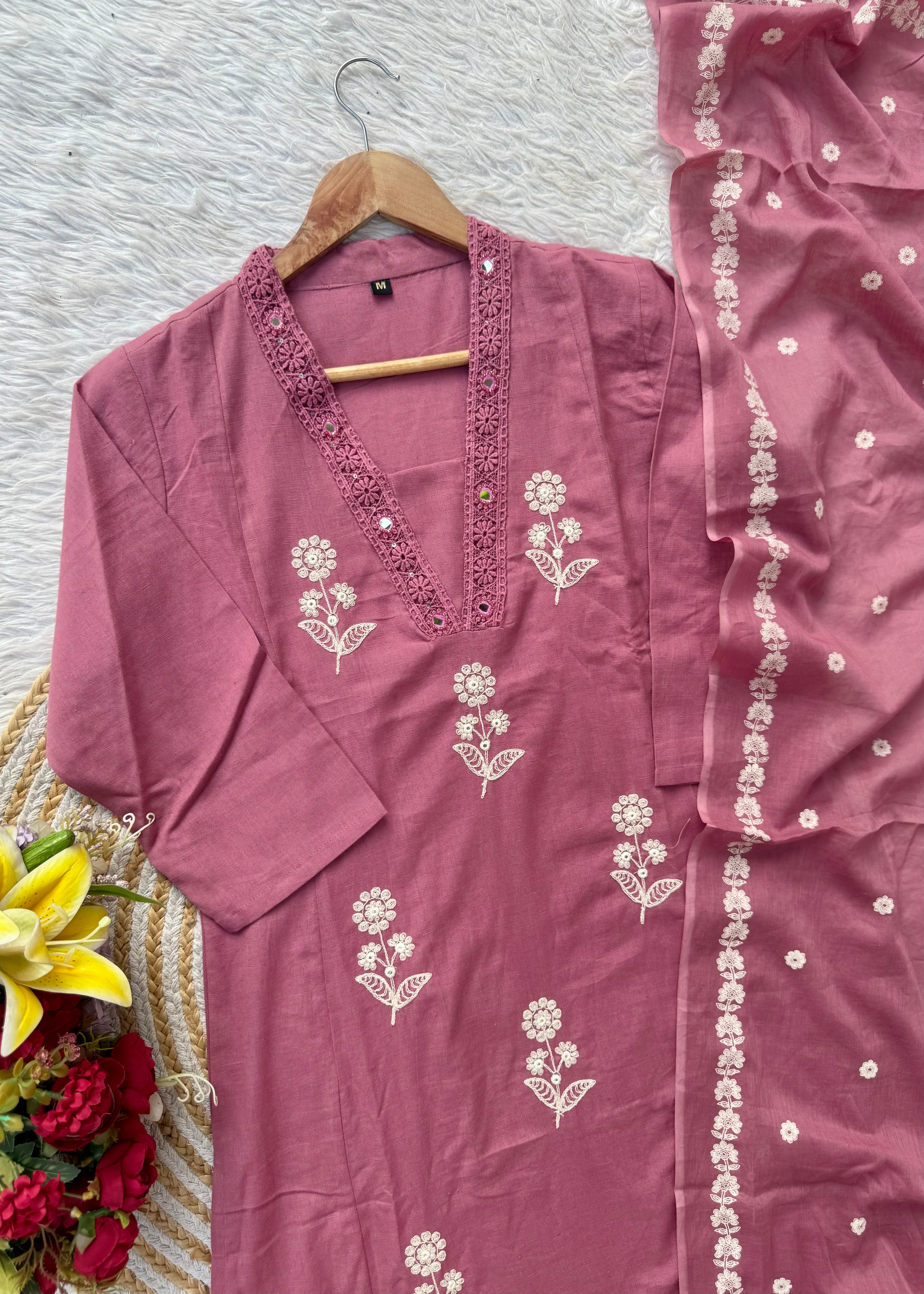 Flex cotton v neck kurta set with mirror work on the yoke and embroidered work all over the top with embroidered work long cotton dupatta and a cotton bottom with pokets