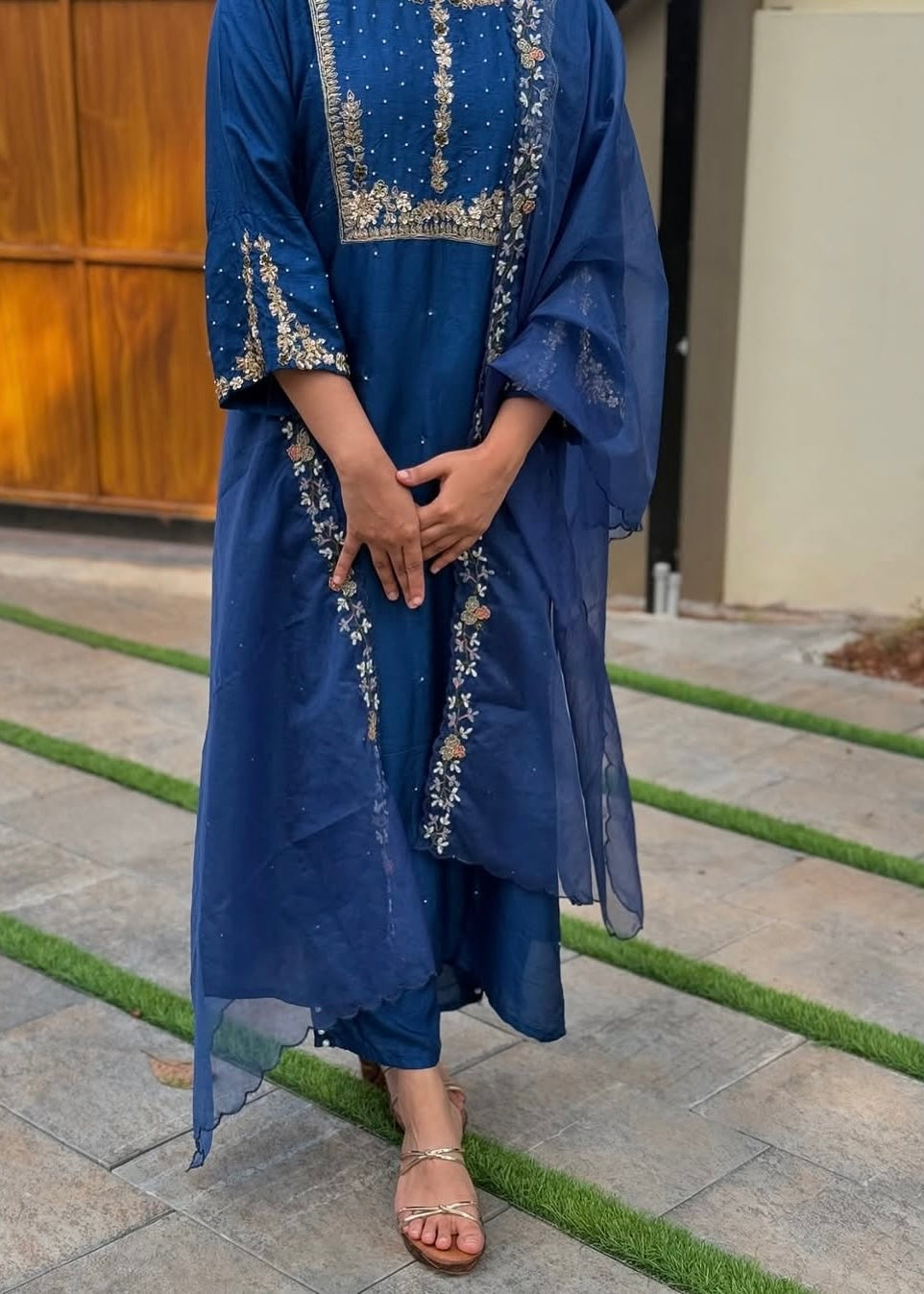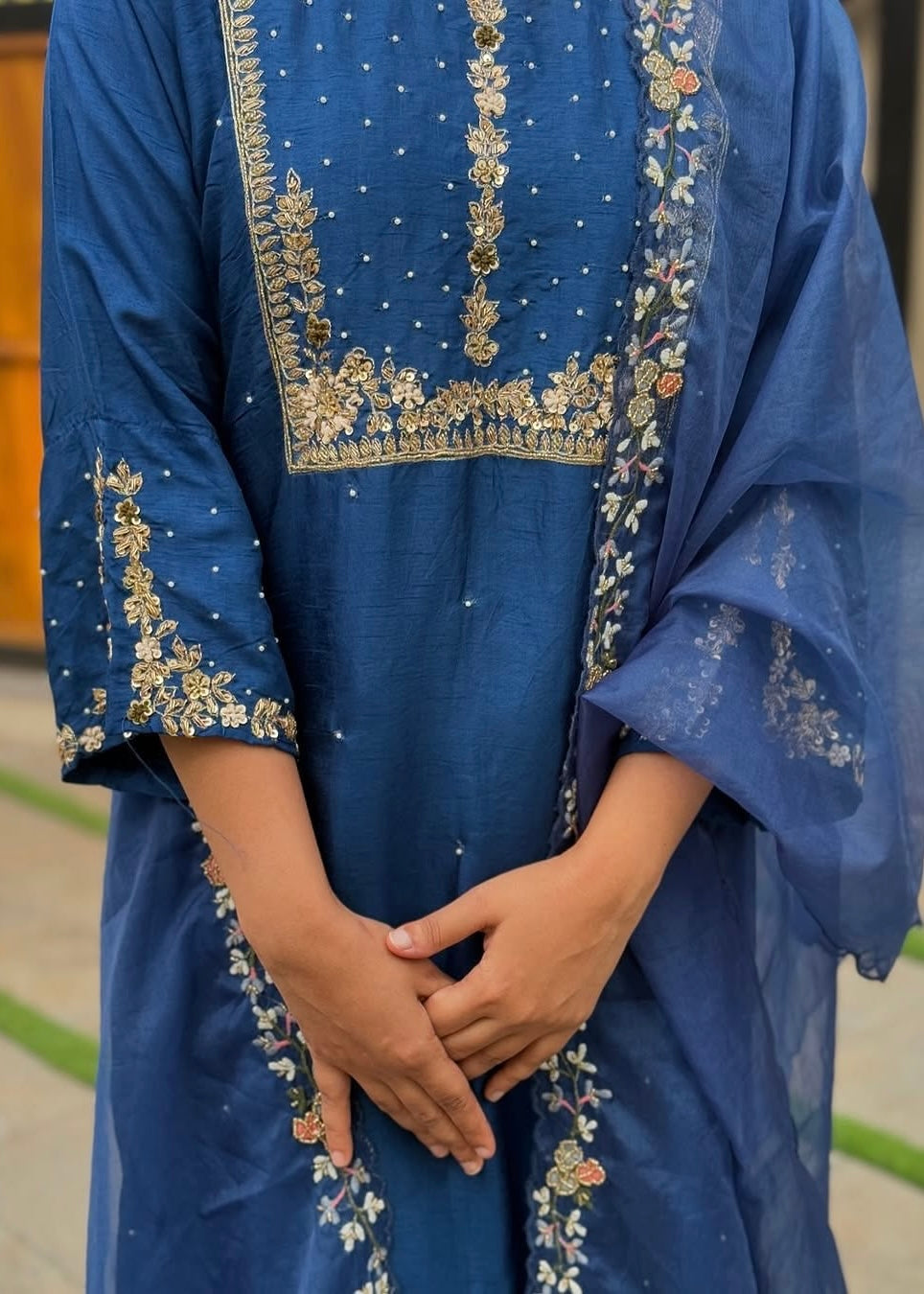 A very beautiful piece with zardozi & zari handwork on the voke and sleeve of the kurta with a beautiful one sided scallop organza dupatta and a silk bottom with pearl work