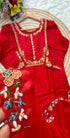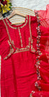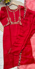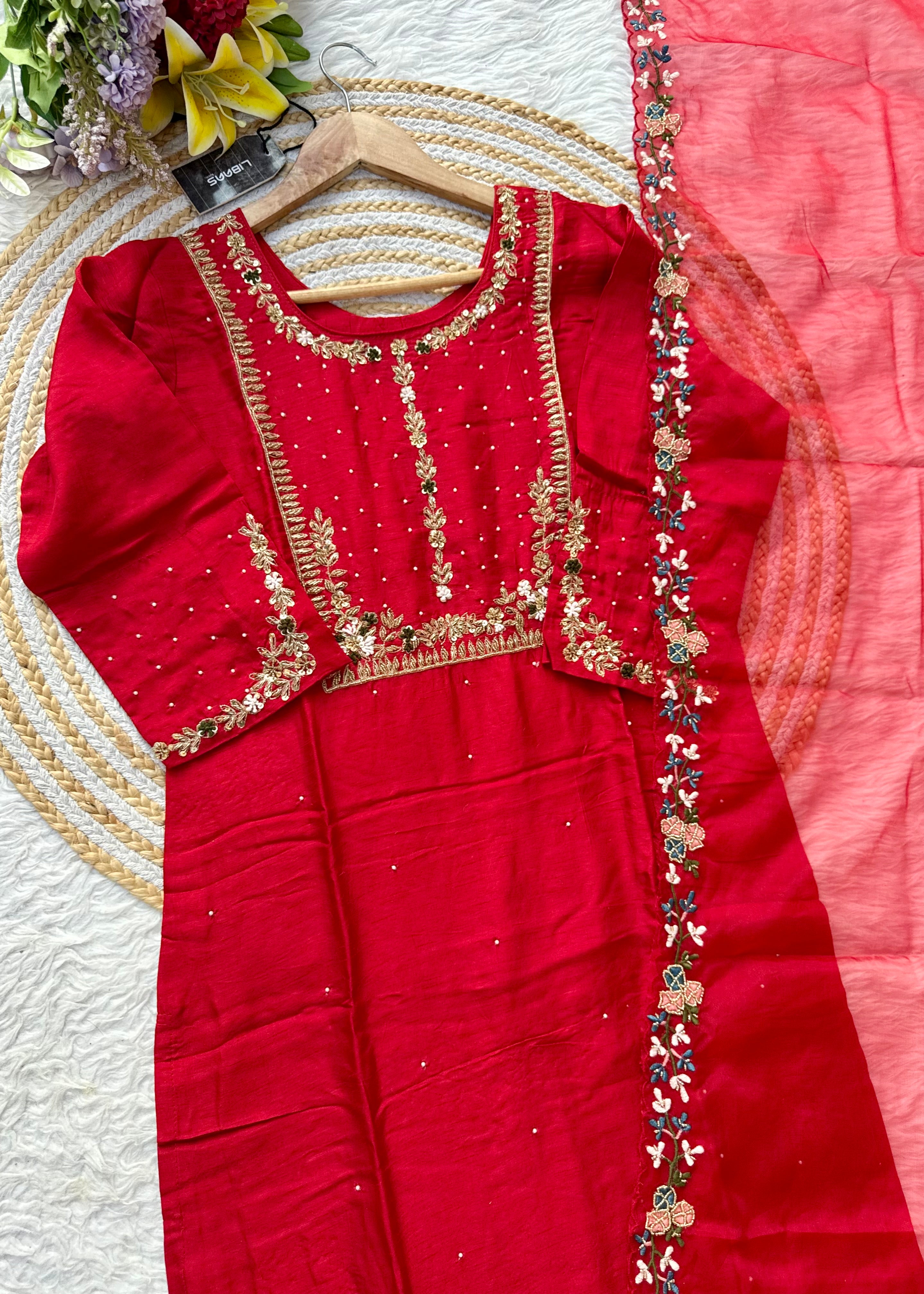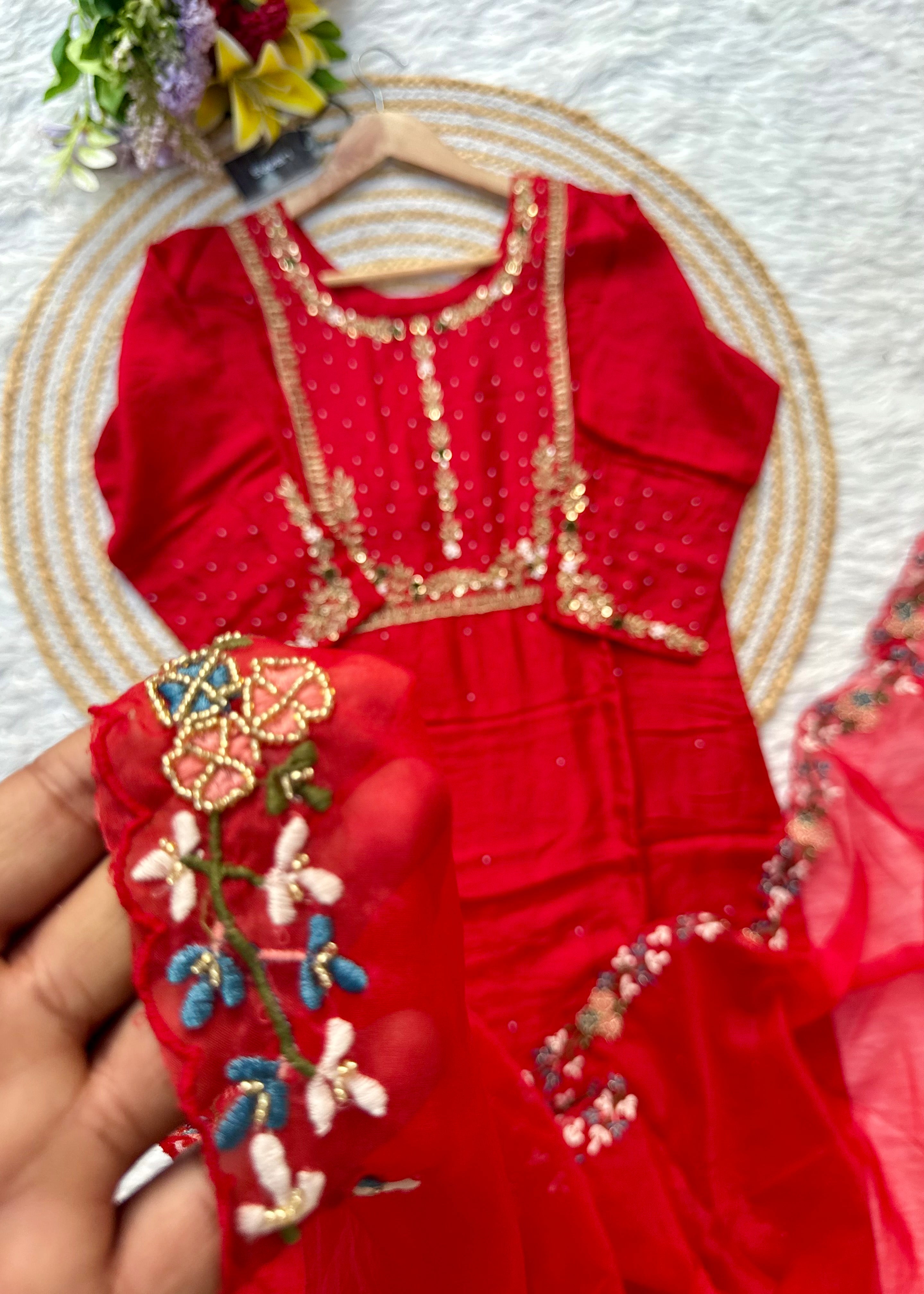 A very beautiful piece with zardozi & zari handwork on the voke and sleeve of the kurta with a beautiful one sided scallop organza dupatta and a silk bottom with pearl work
