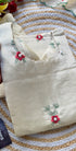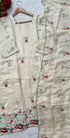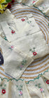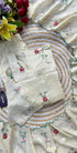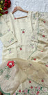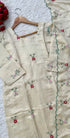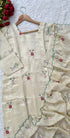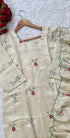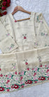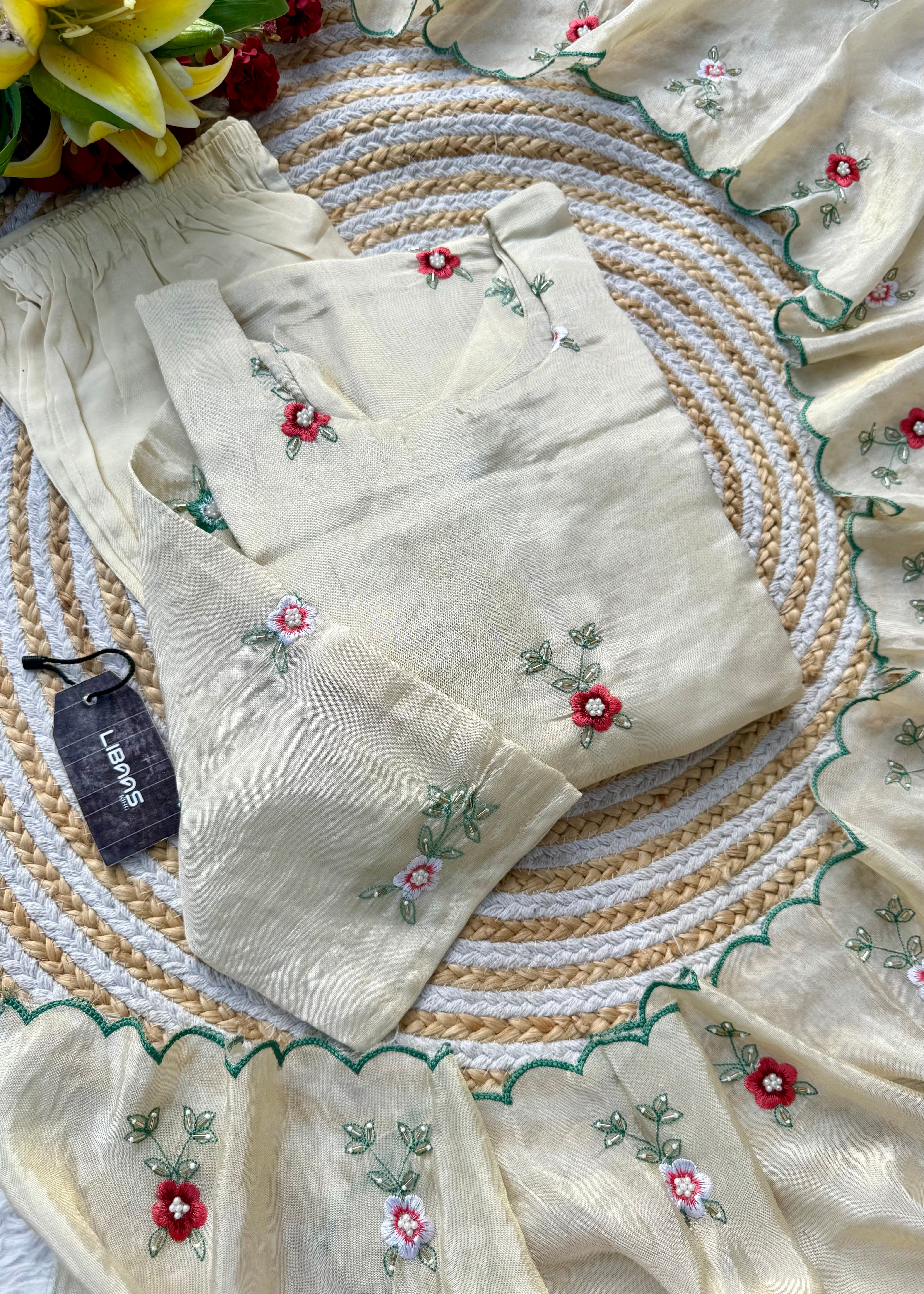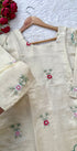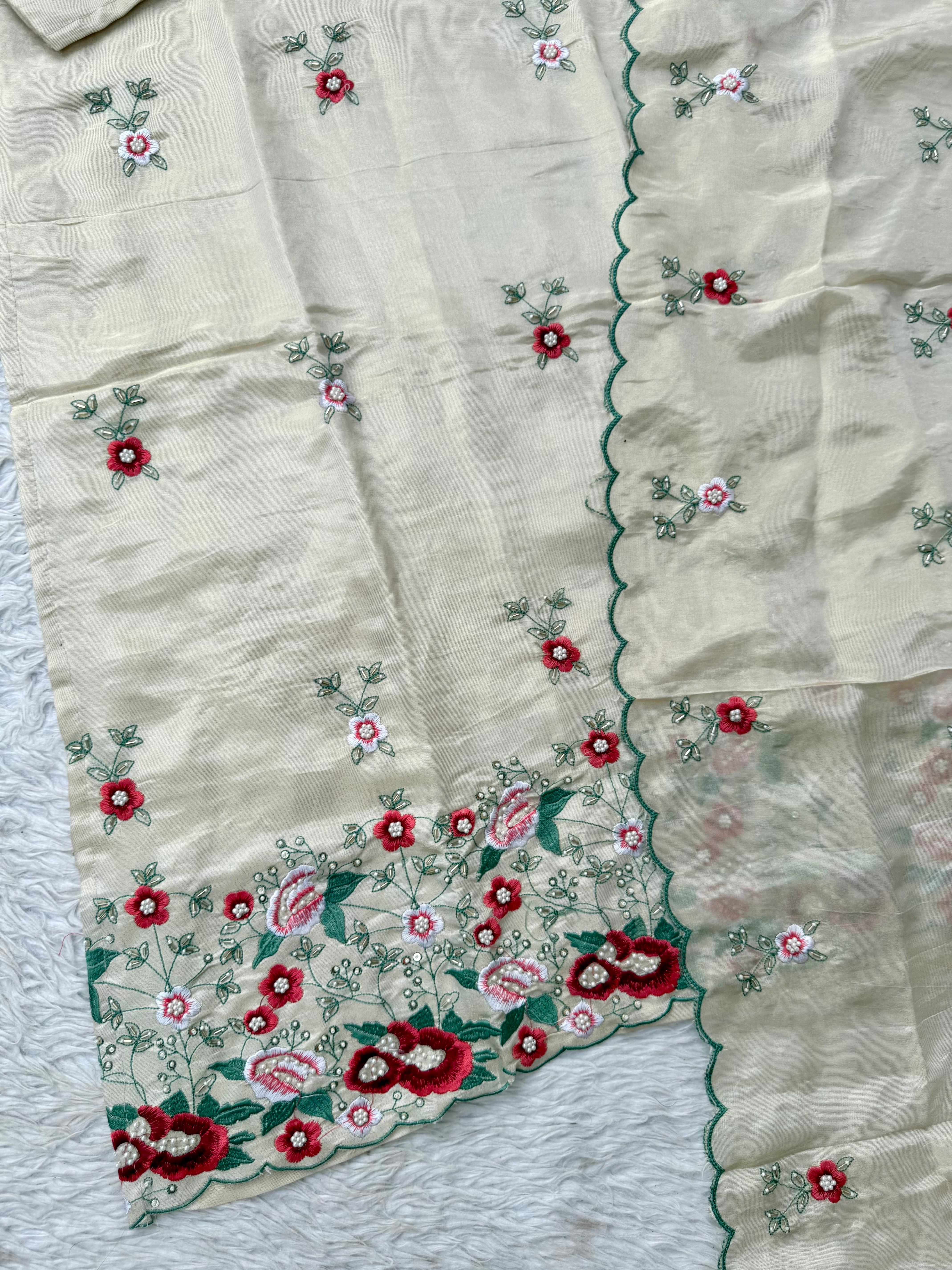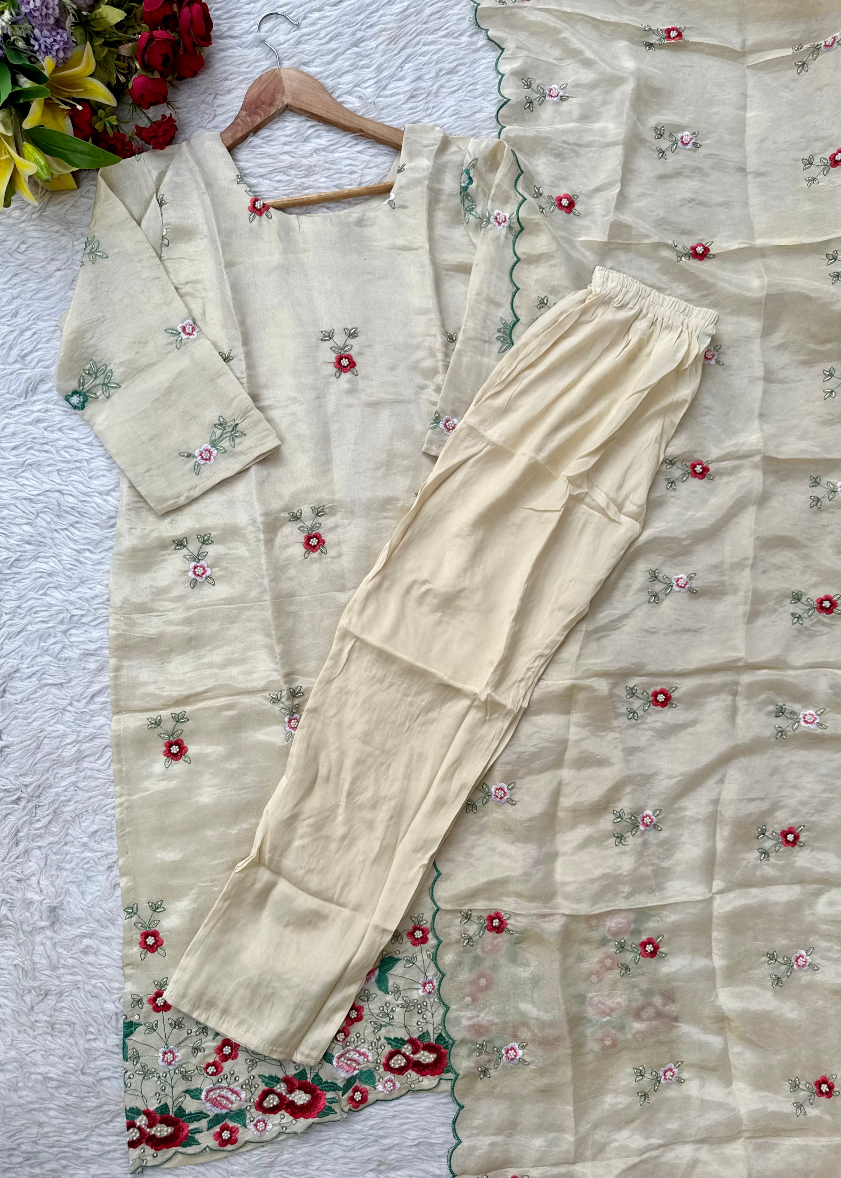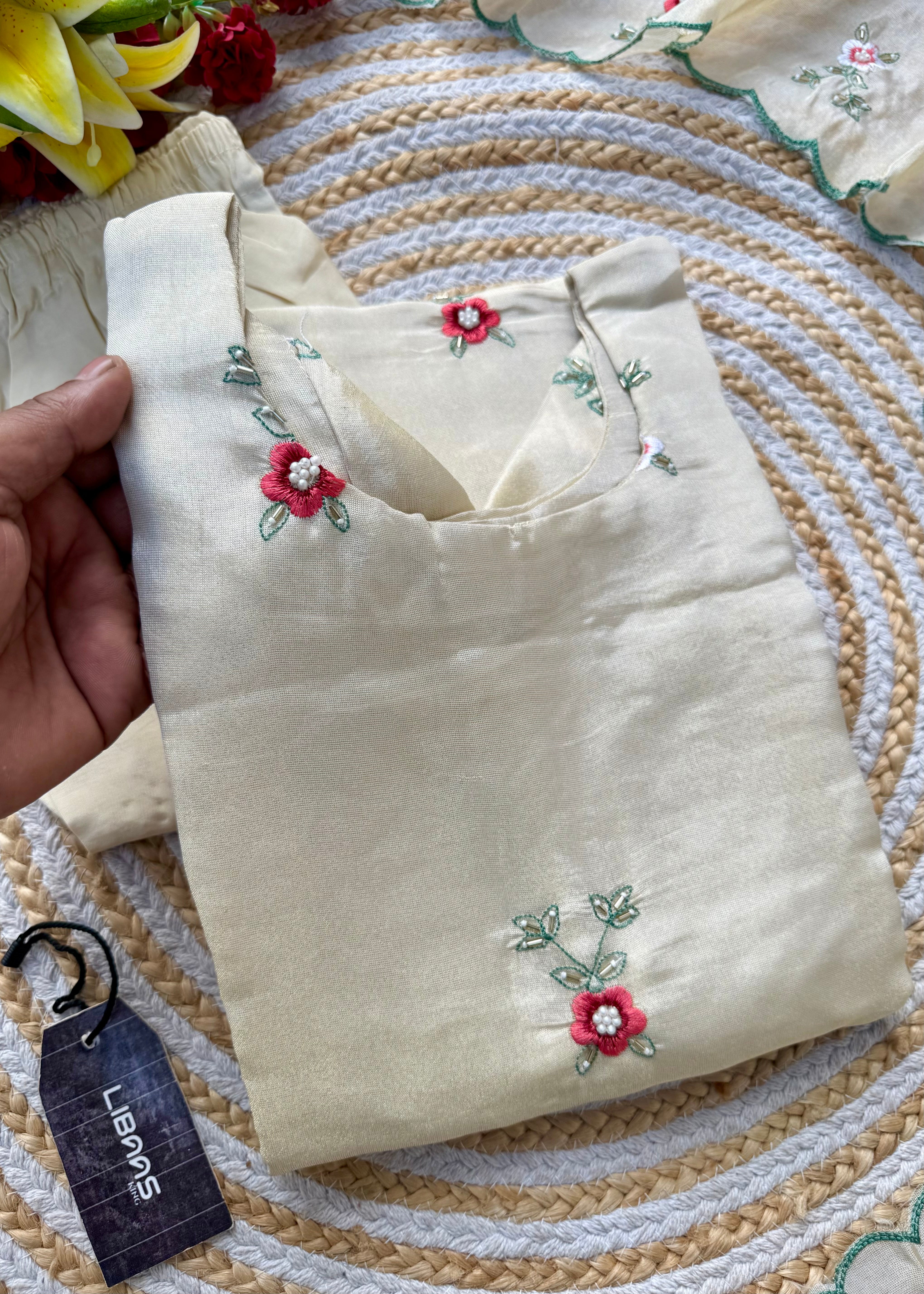 A very beautiful tissue silk kurta set with handwork small flower motive all over the kurta using resam and pearl work with a same work tissue silk dupatta paired with a plane silk bottom