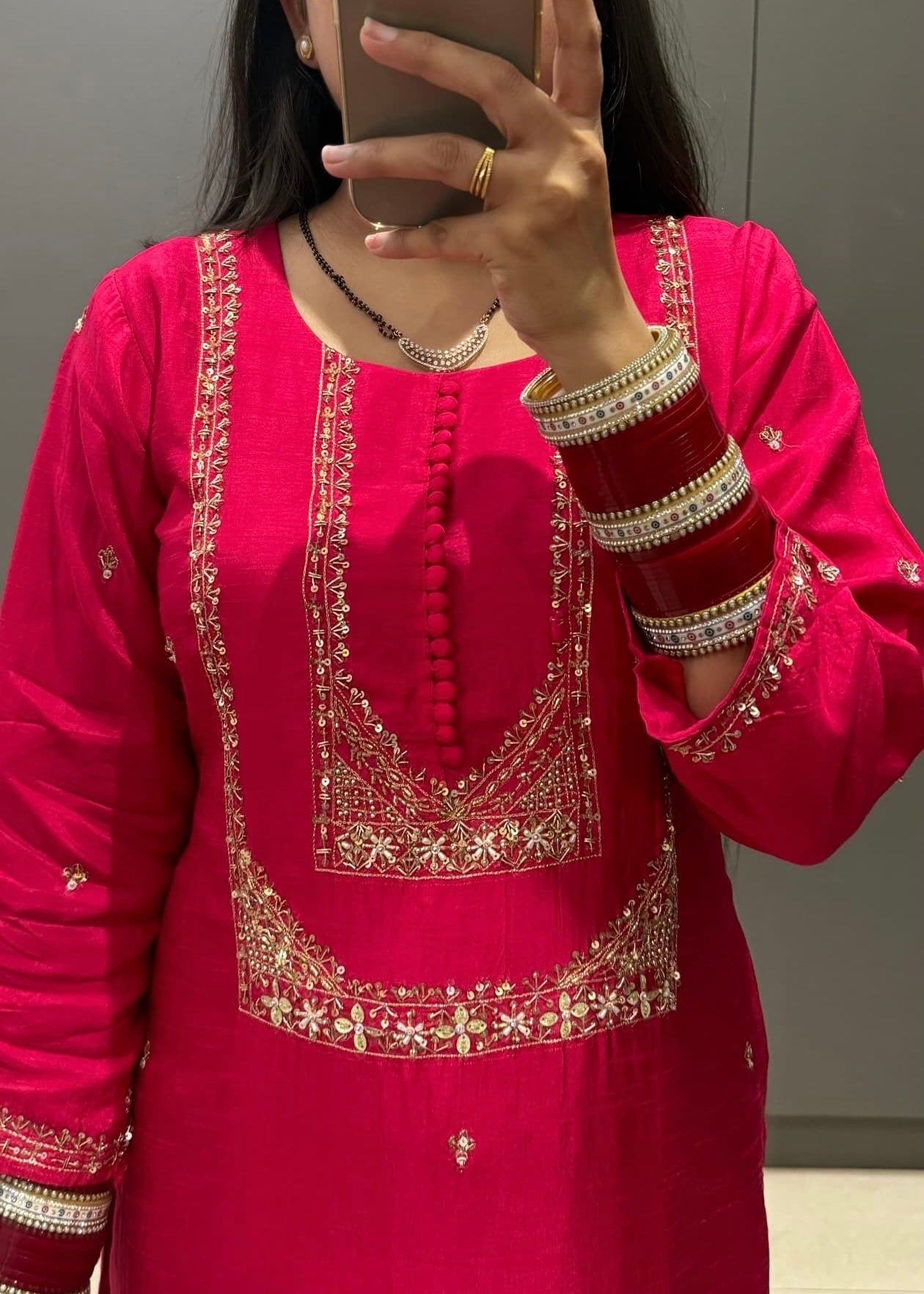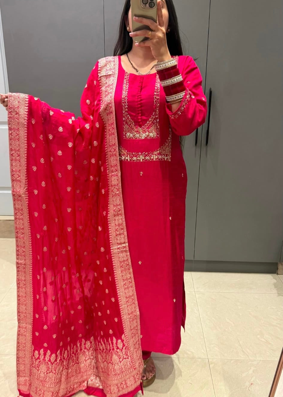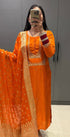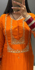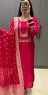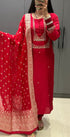 The kurta features delicate handwork on the yoke and sleeves, paired with a Dola silk bottom and a Banarasi weaving organza dupatta for a regal finishing touch.
