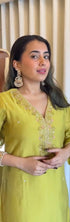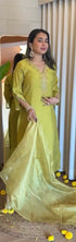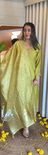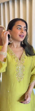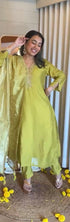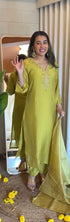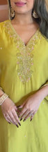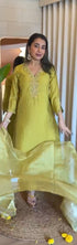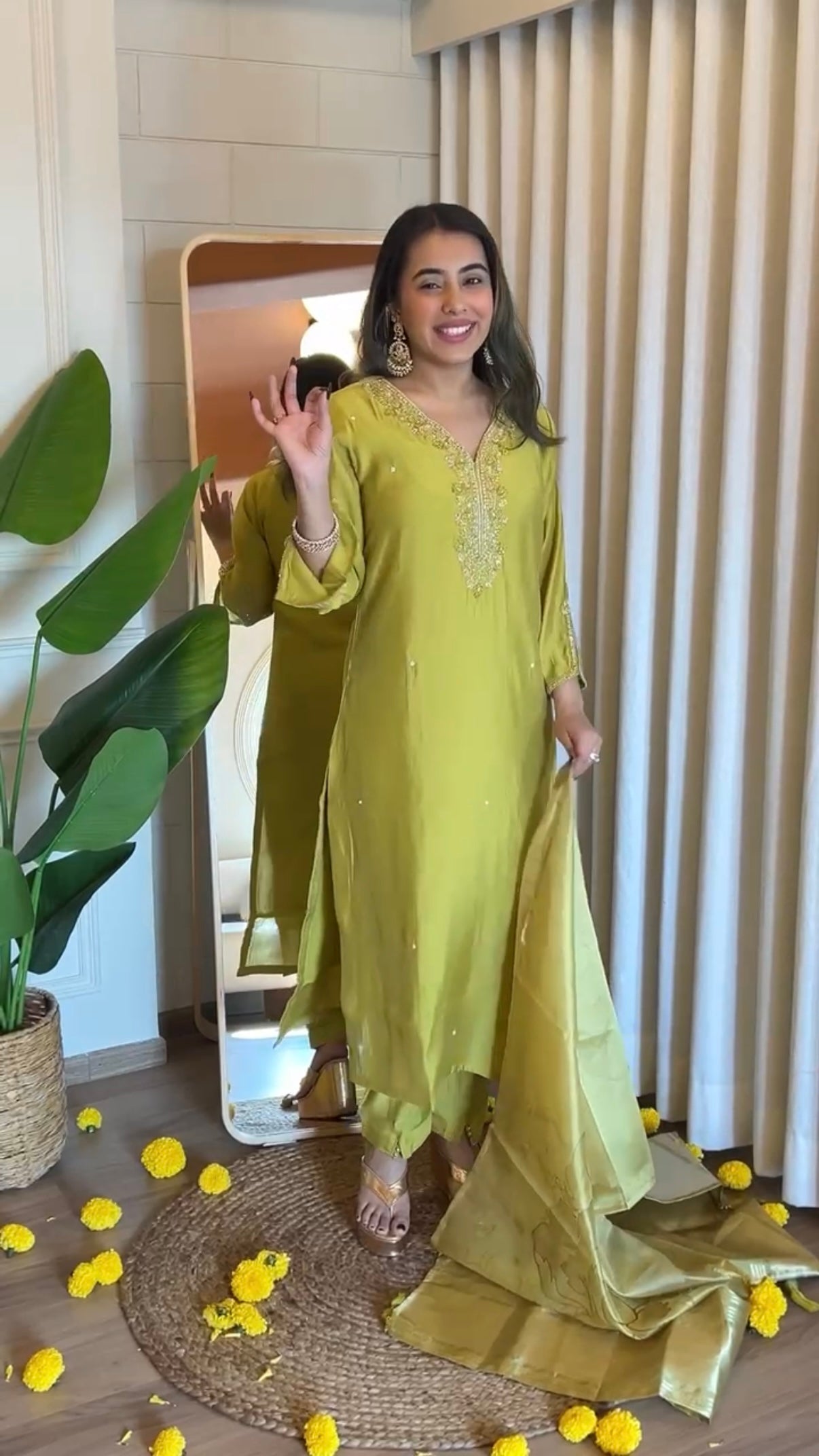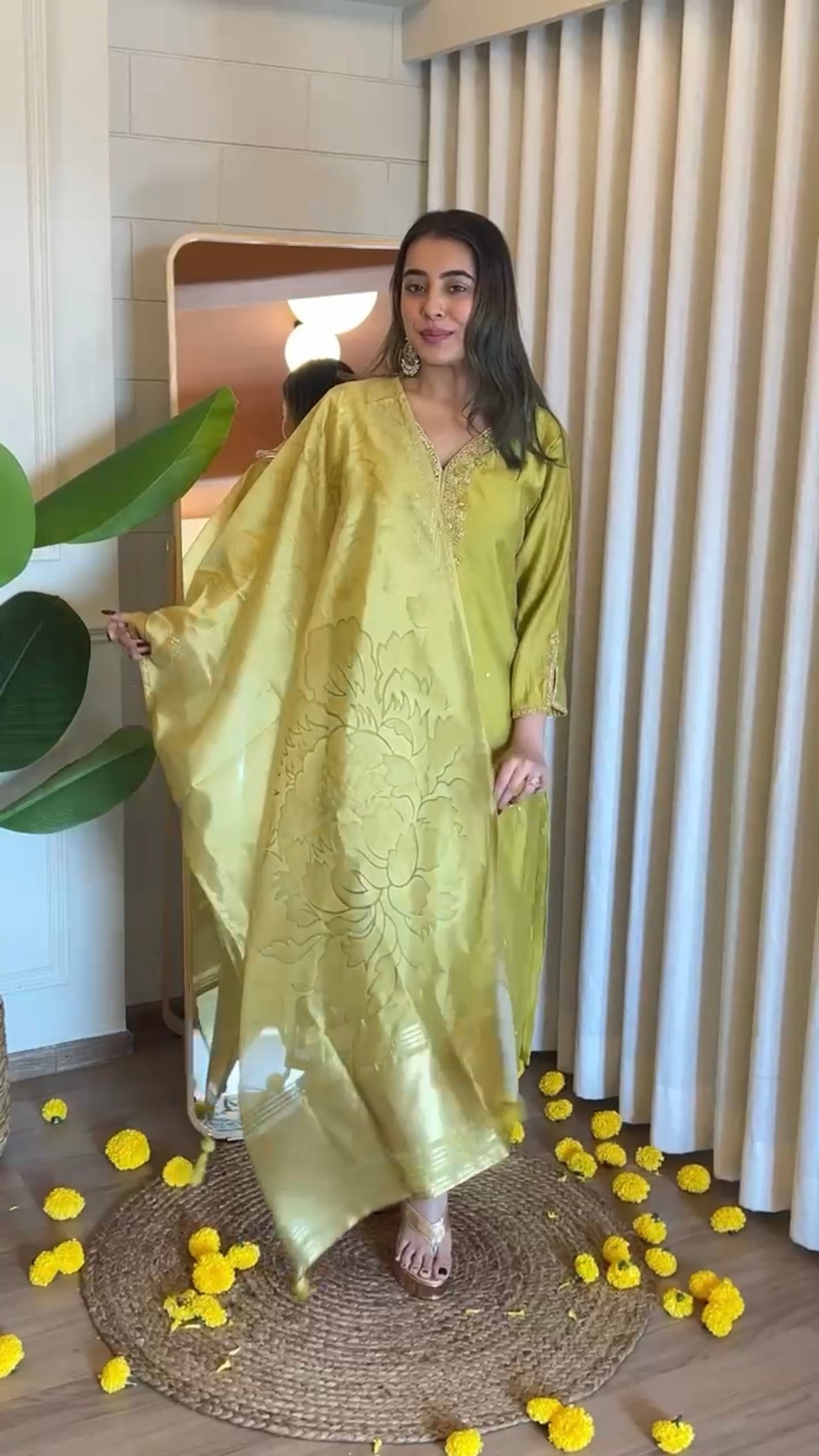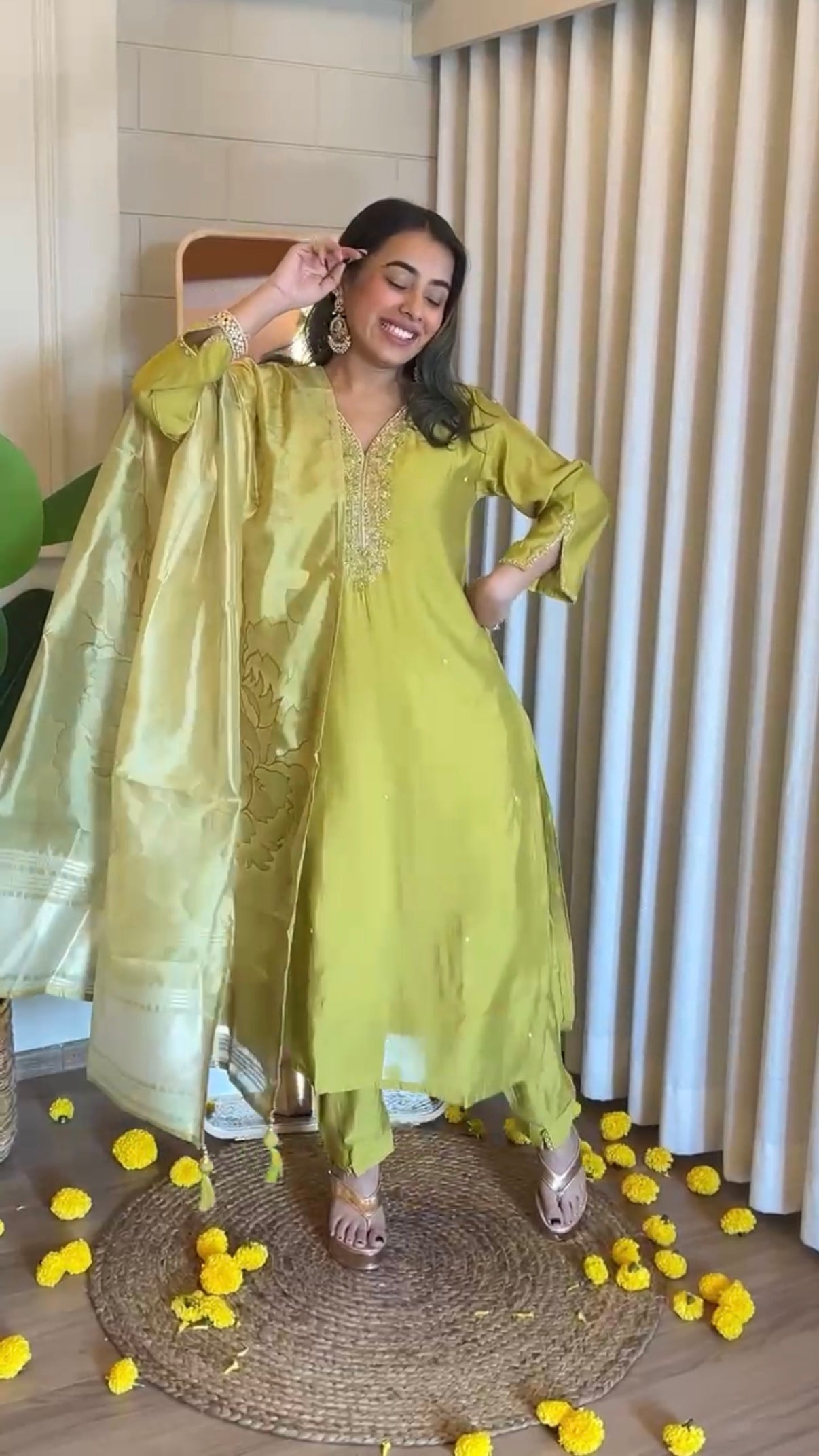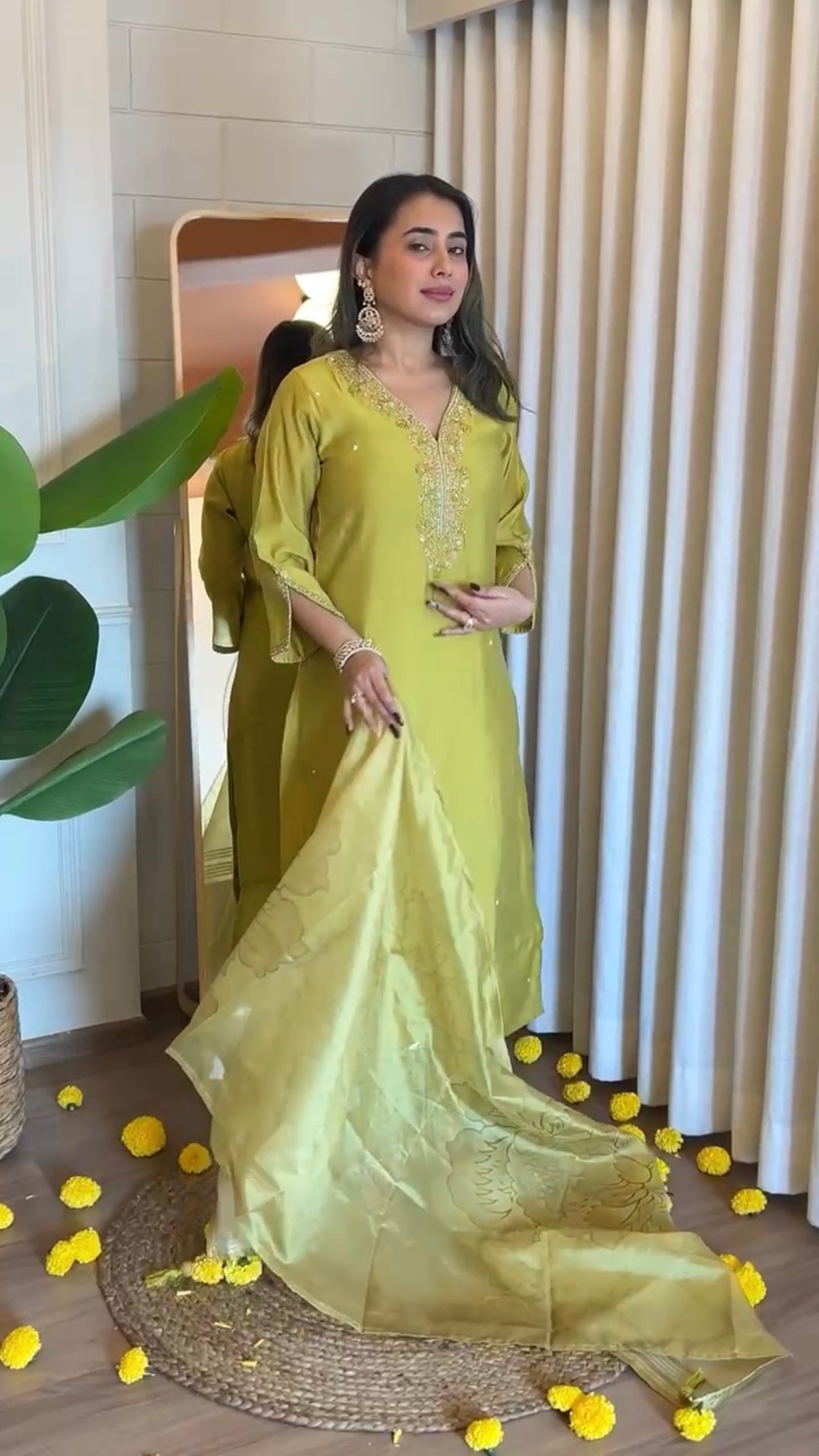 Premium Roman silk kurti with handwork on the yoke & sleeves of the kurta with a printed organza dupatta and a silk bottom