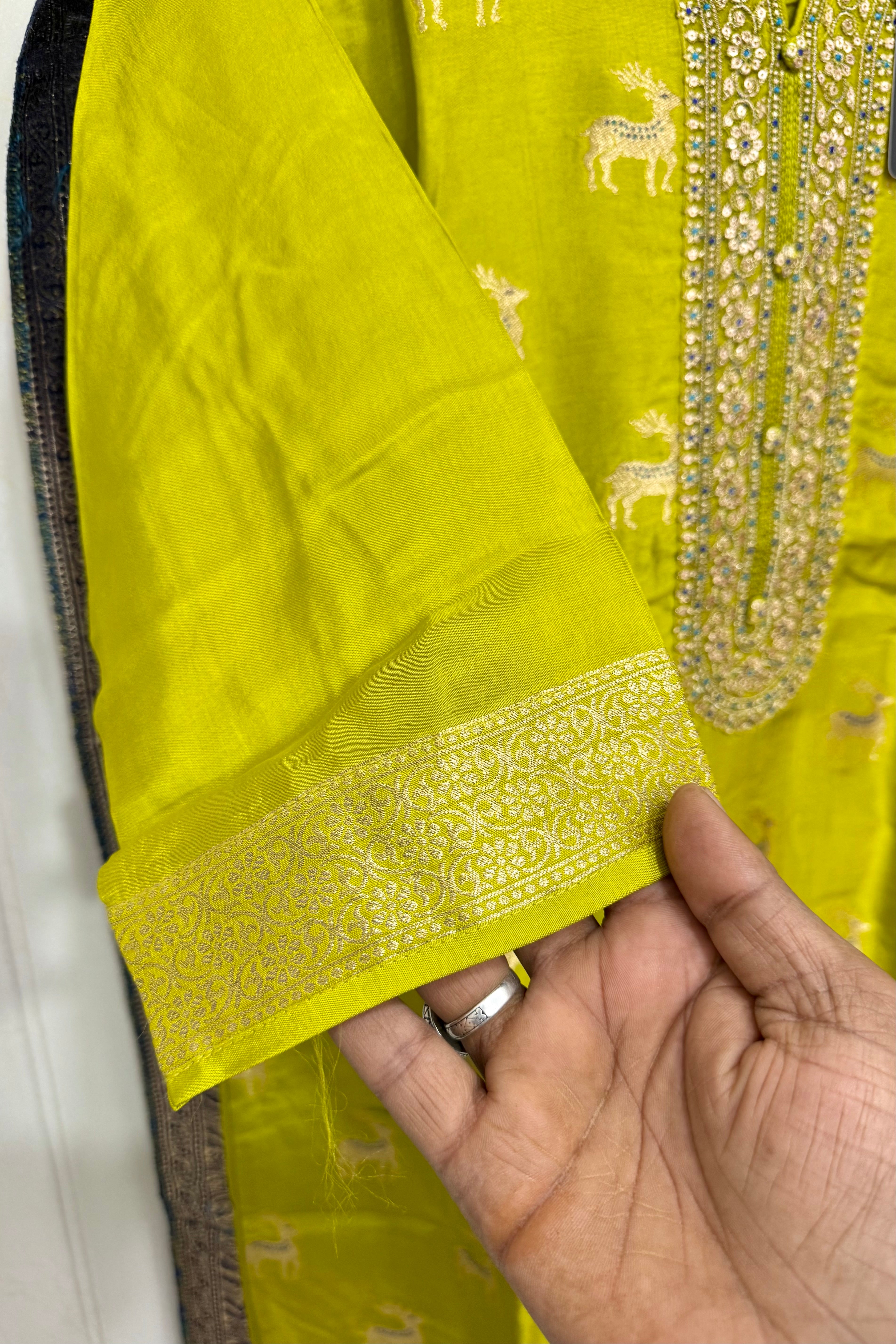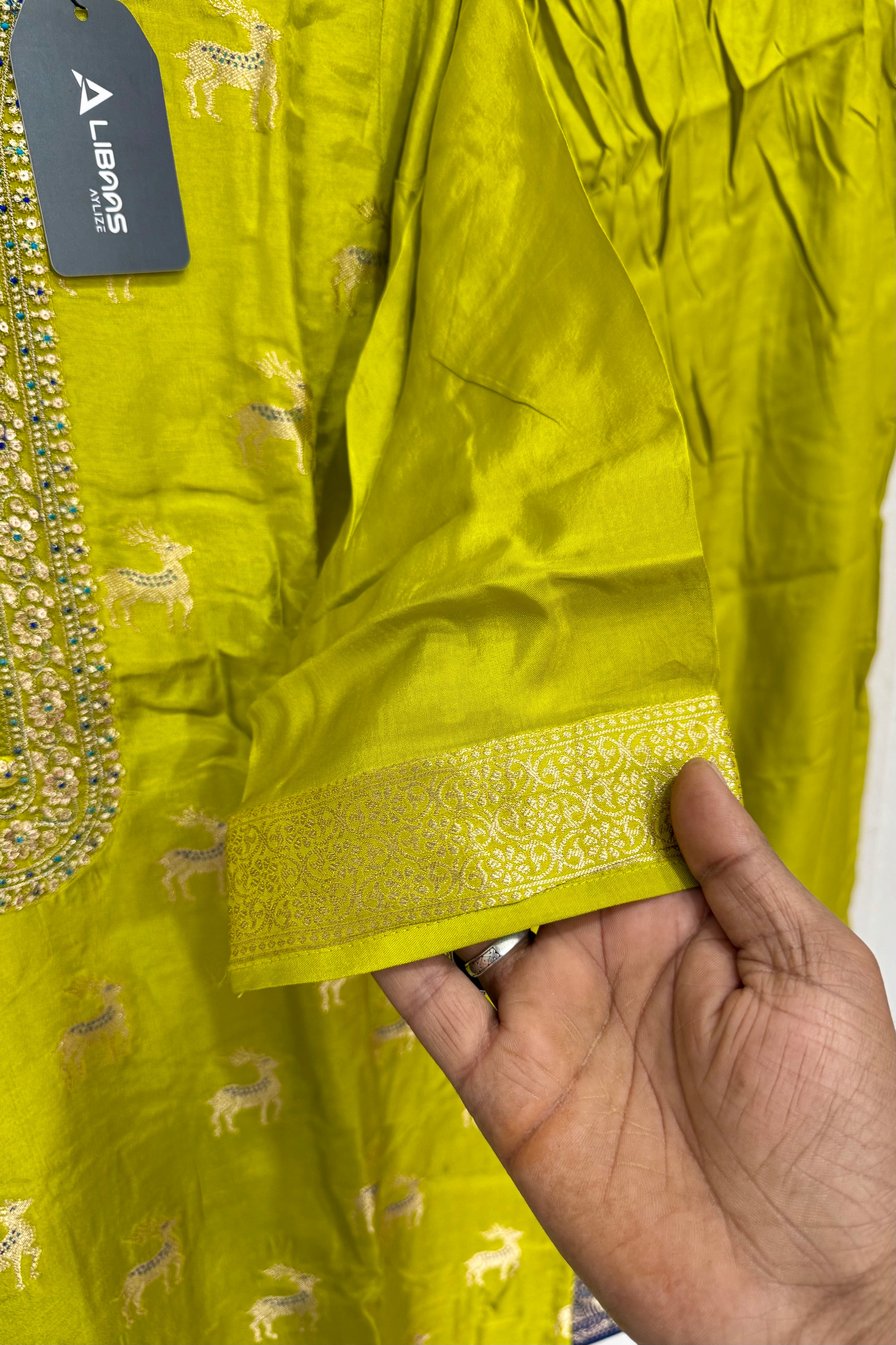 jacquard silk kurta set with handwork on the neck line & Jacquard weaving all over the kurta with a long banarsi weaving dupatta paired with a silk bottom