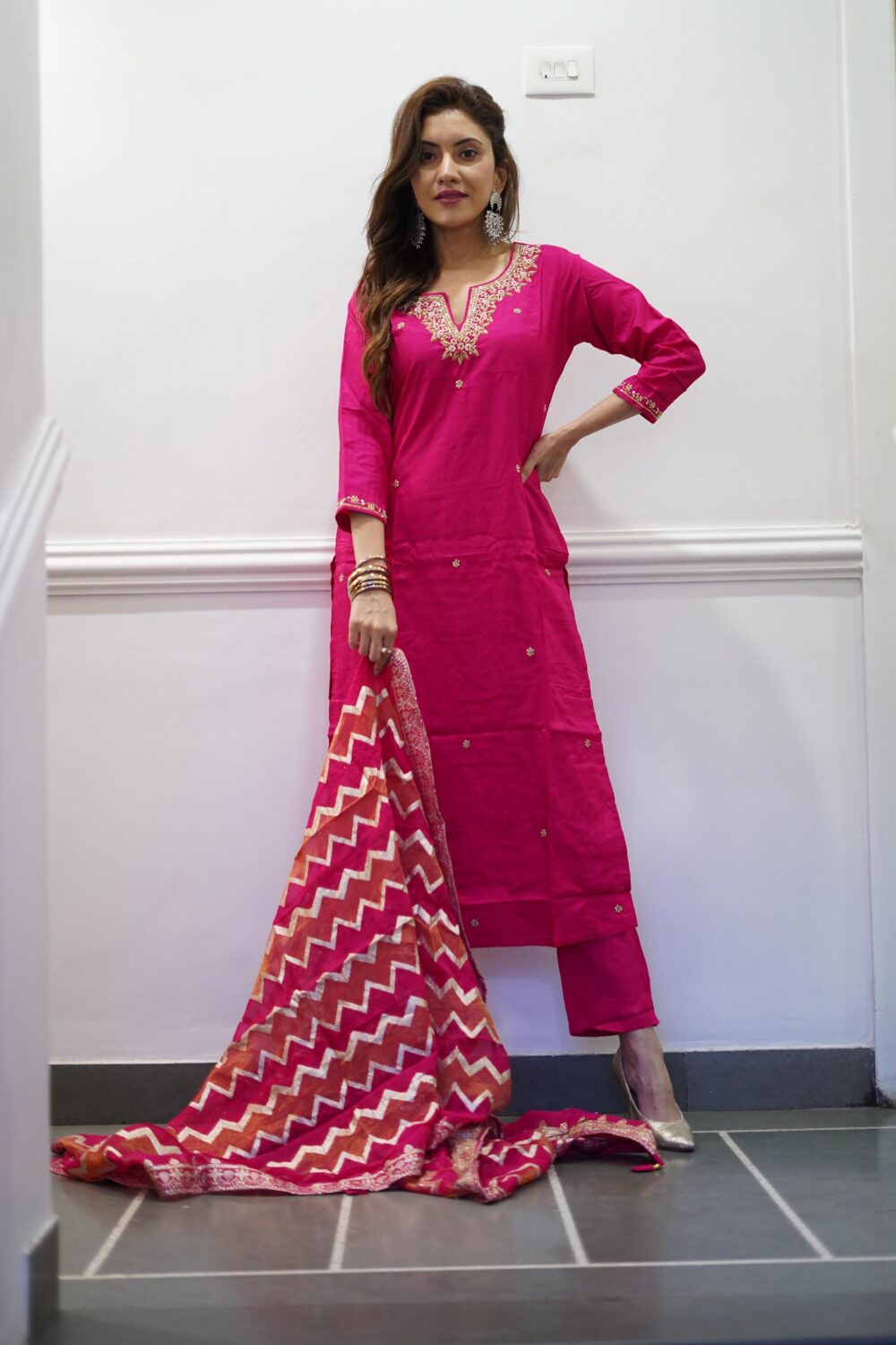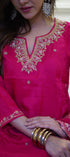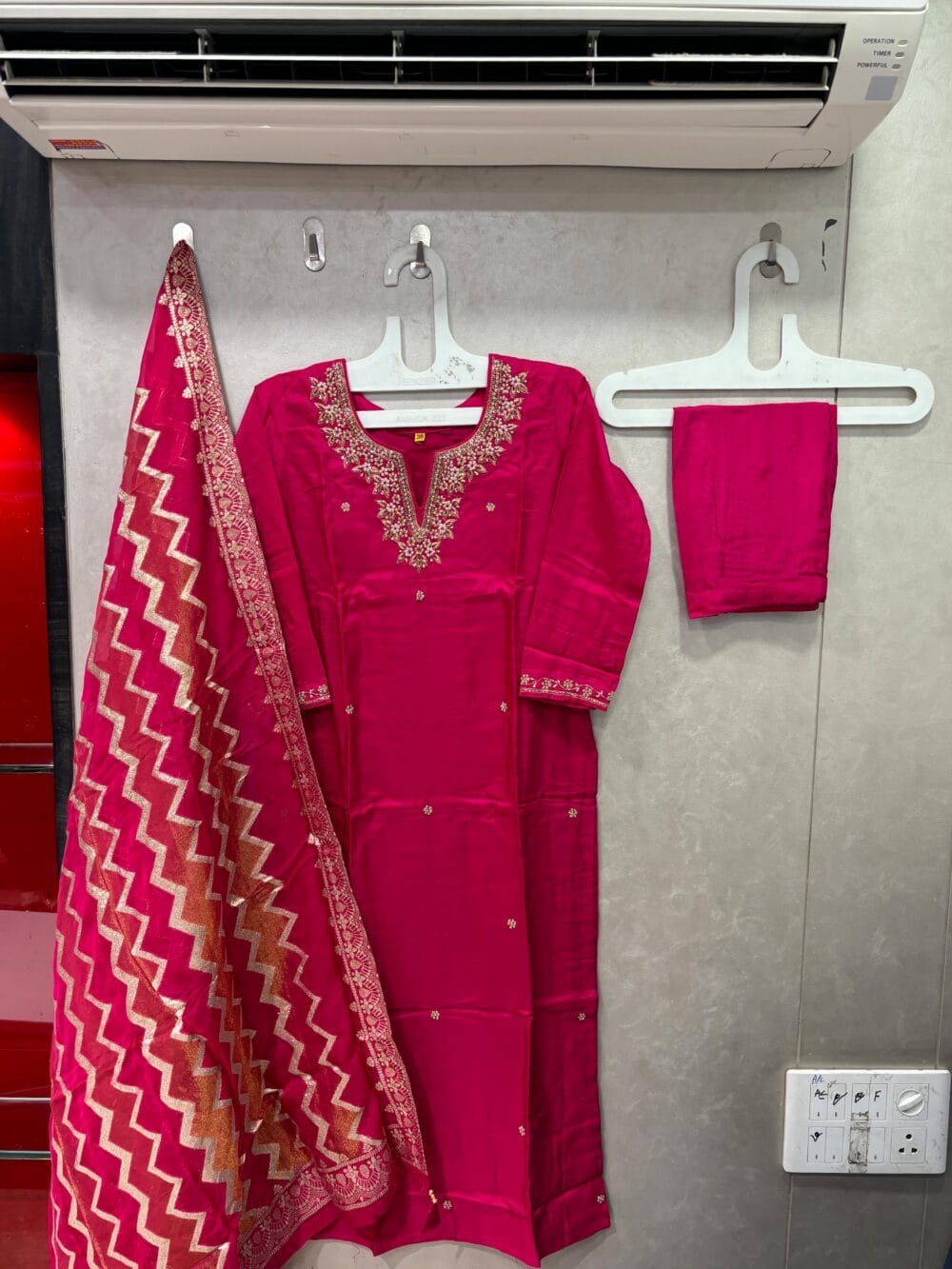 A very beautiful piece with handwork on the yoke and sleeves of the kurta with a beautiful banarsi dupatta and a silk bottom