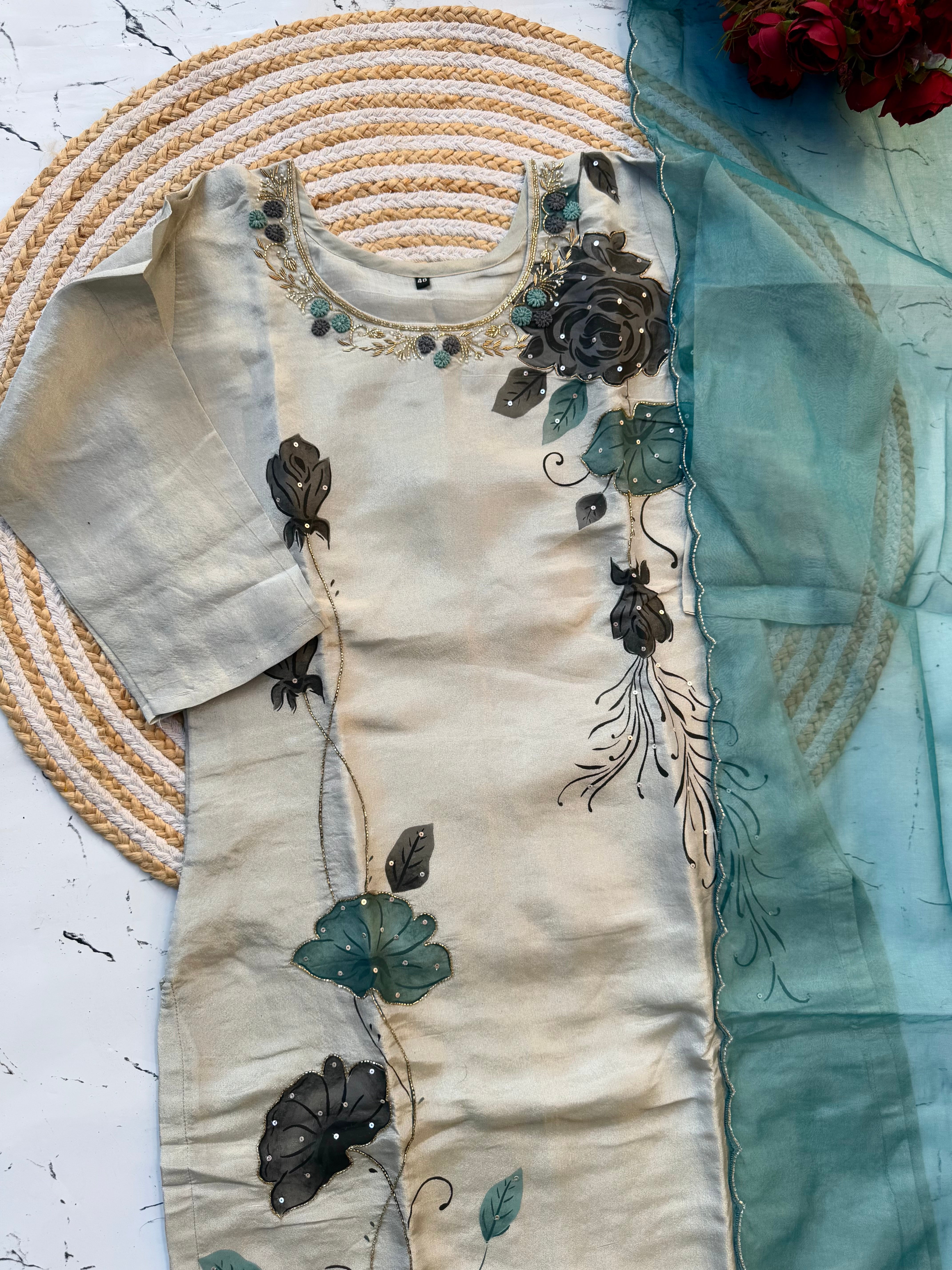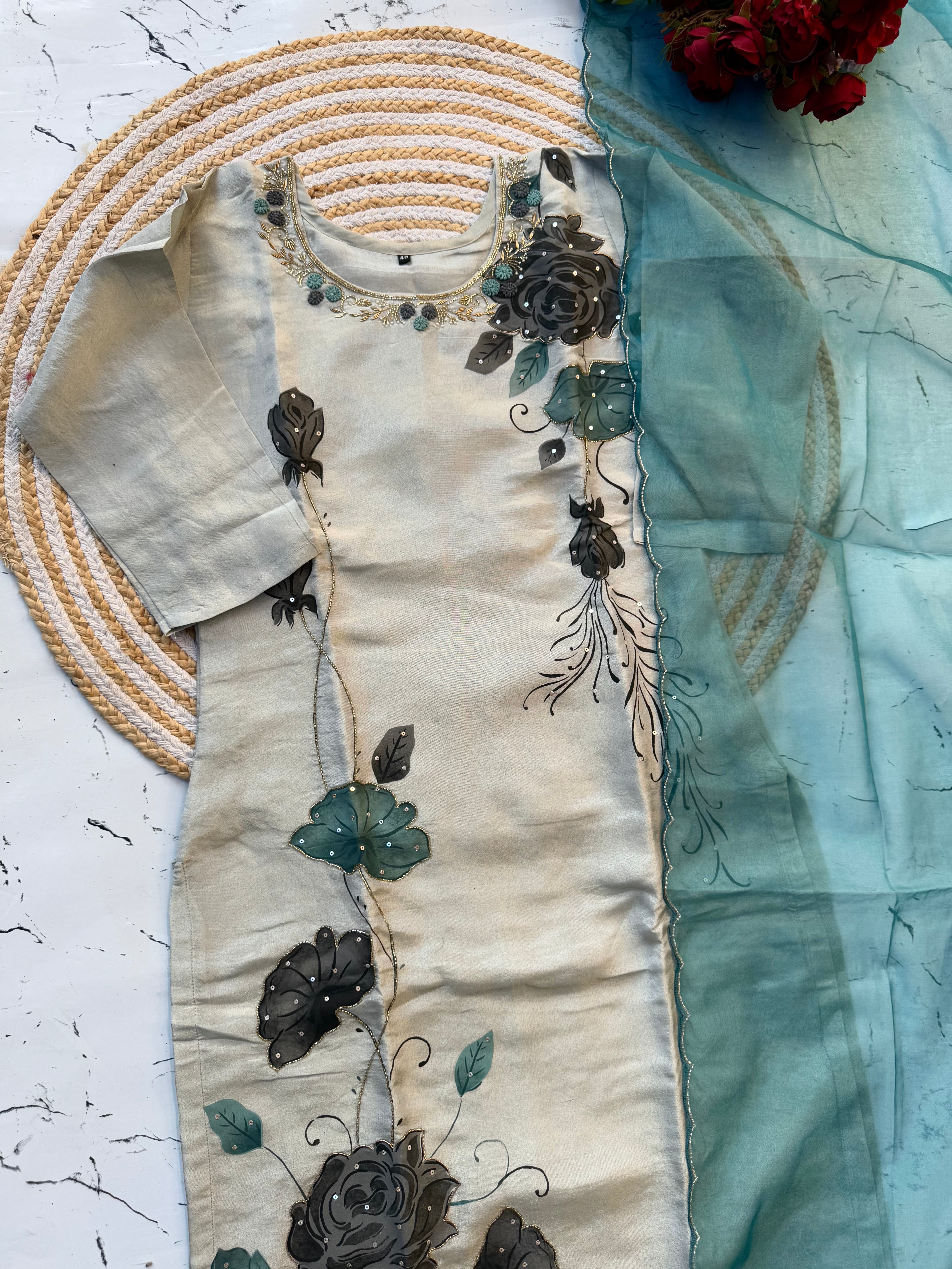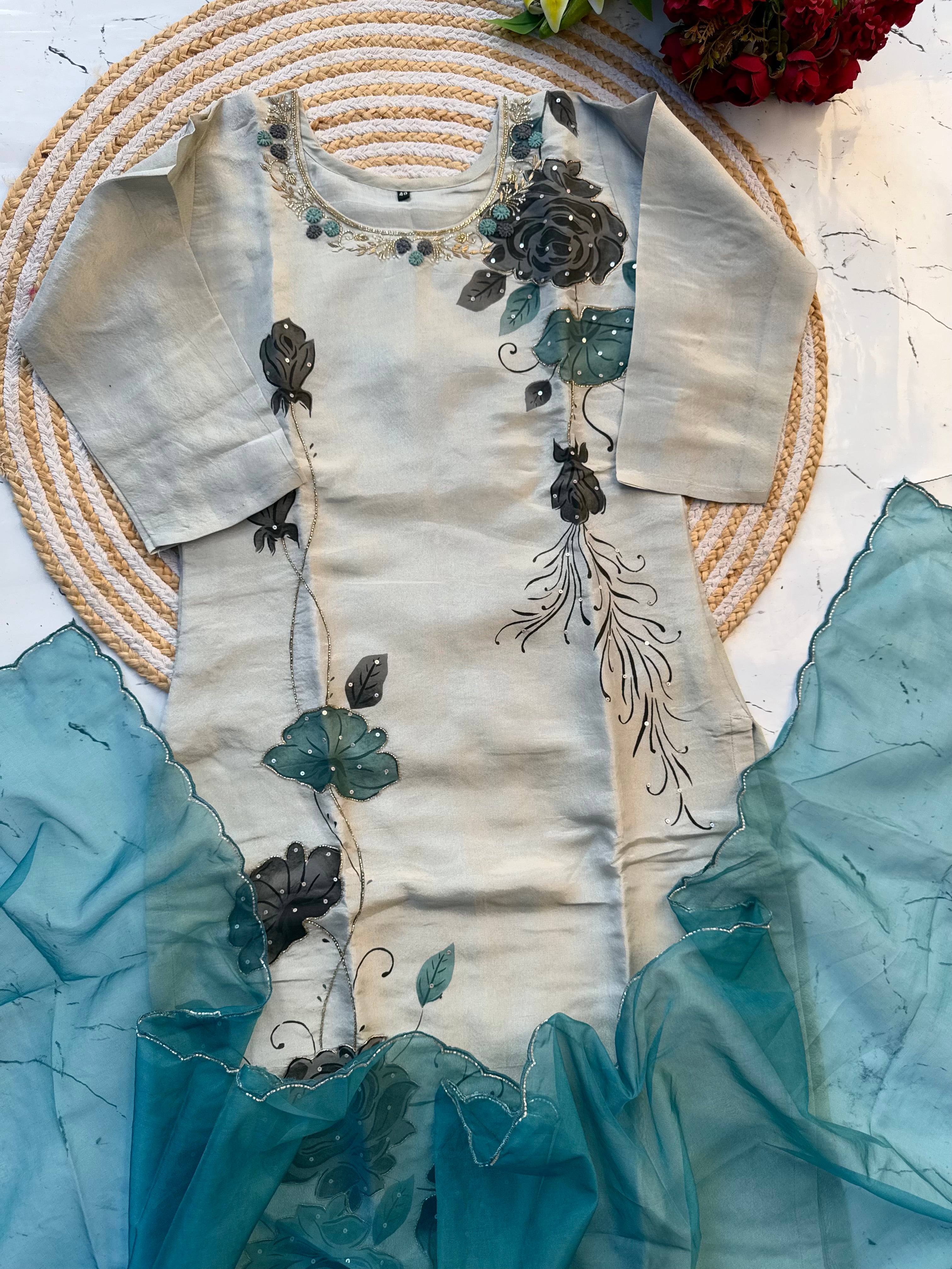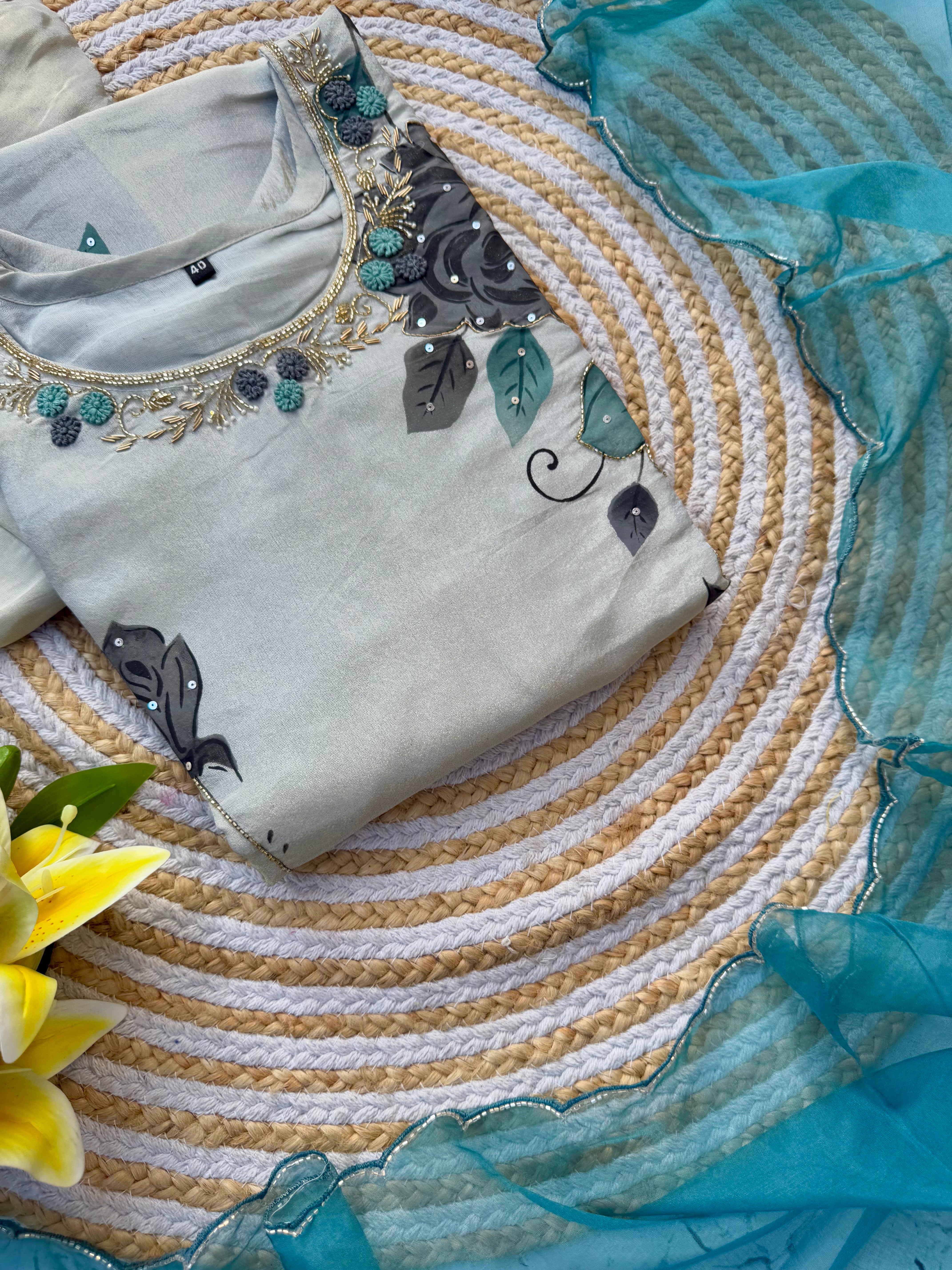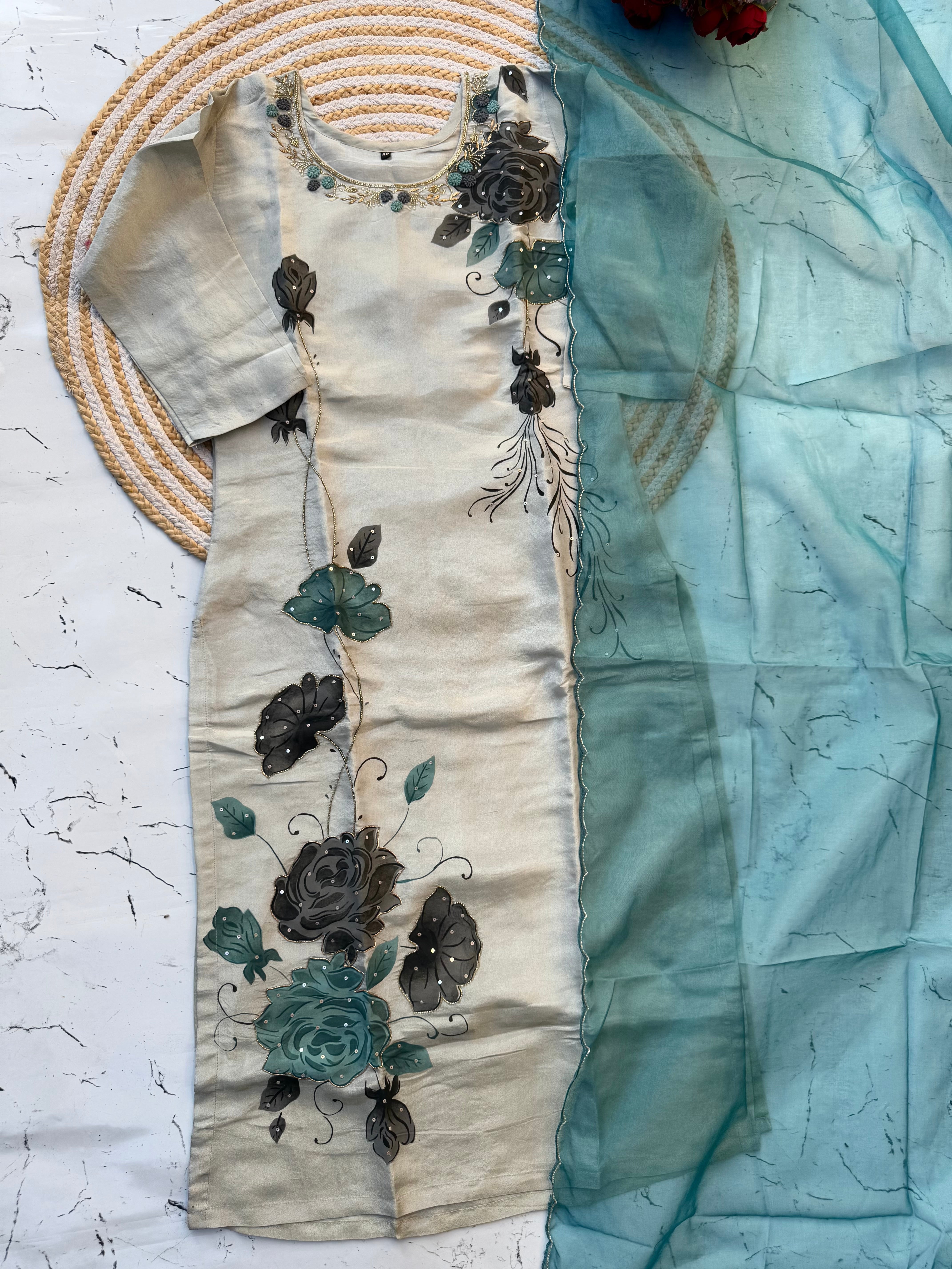 Russian silk kurti set with handwork on the yoke of the kurta with poket on top with a printed organza dupatta and a silk bottom with work