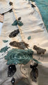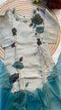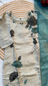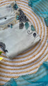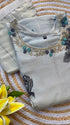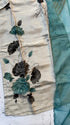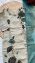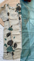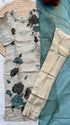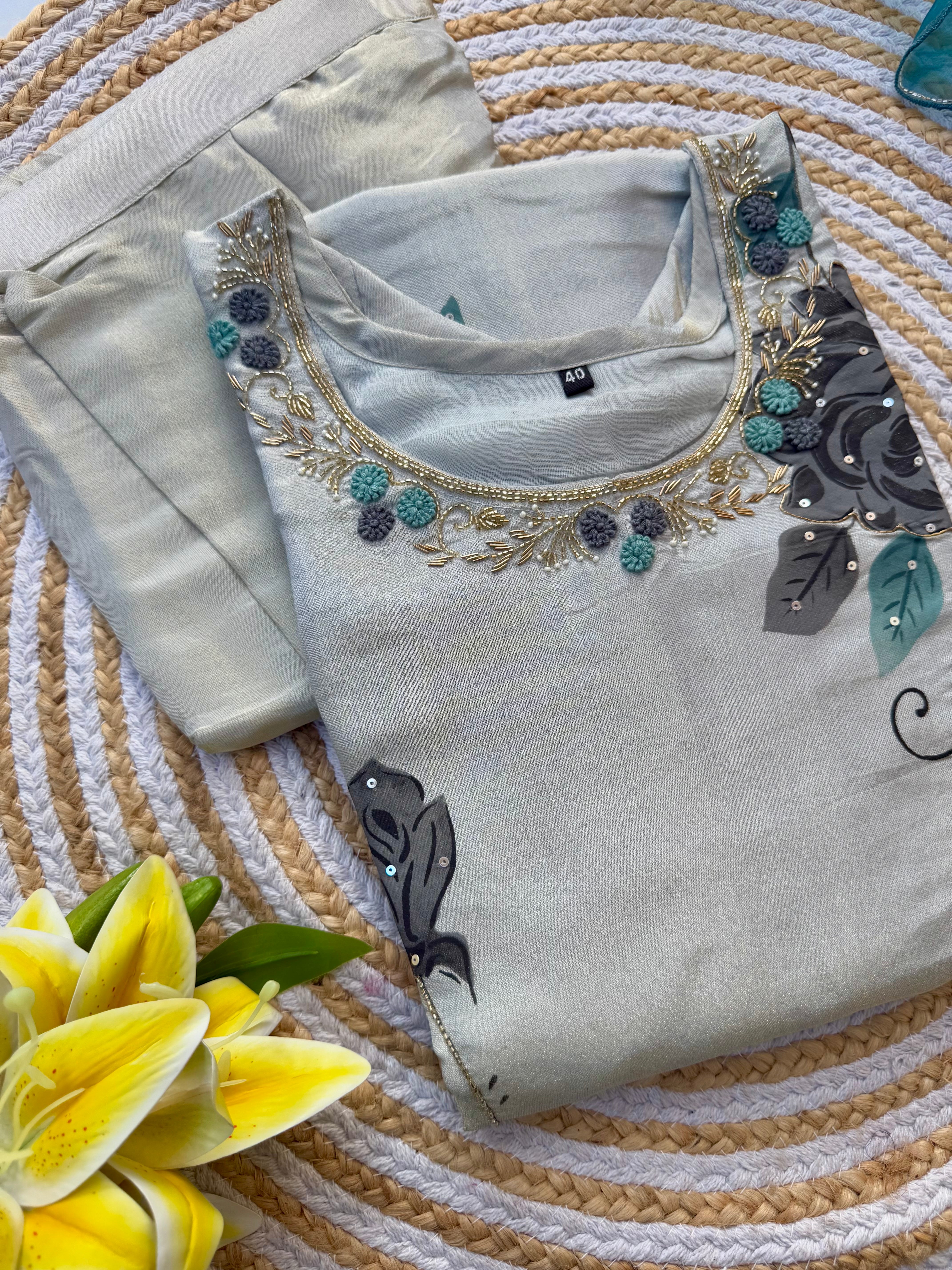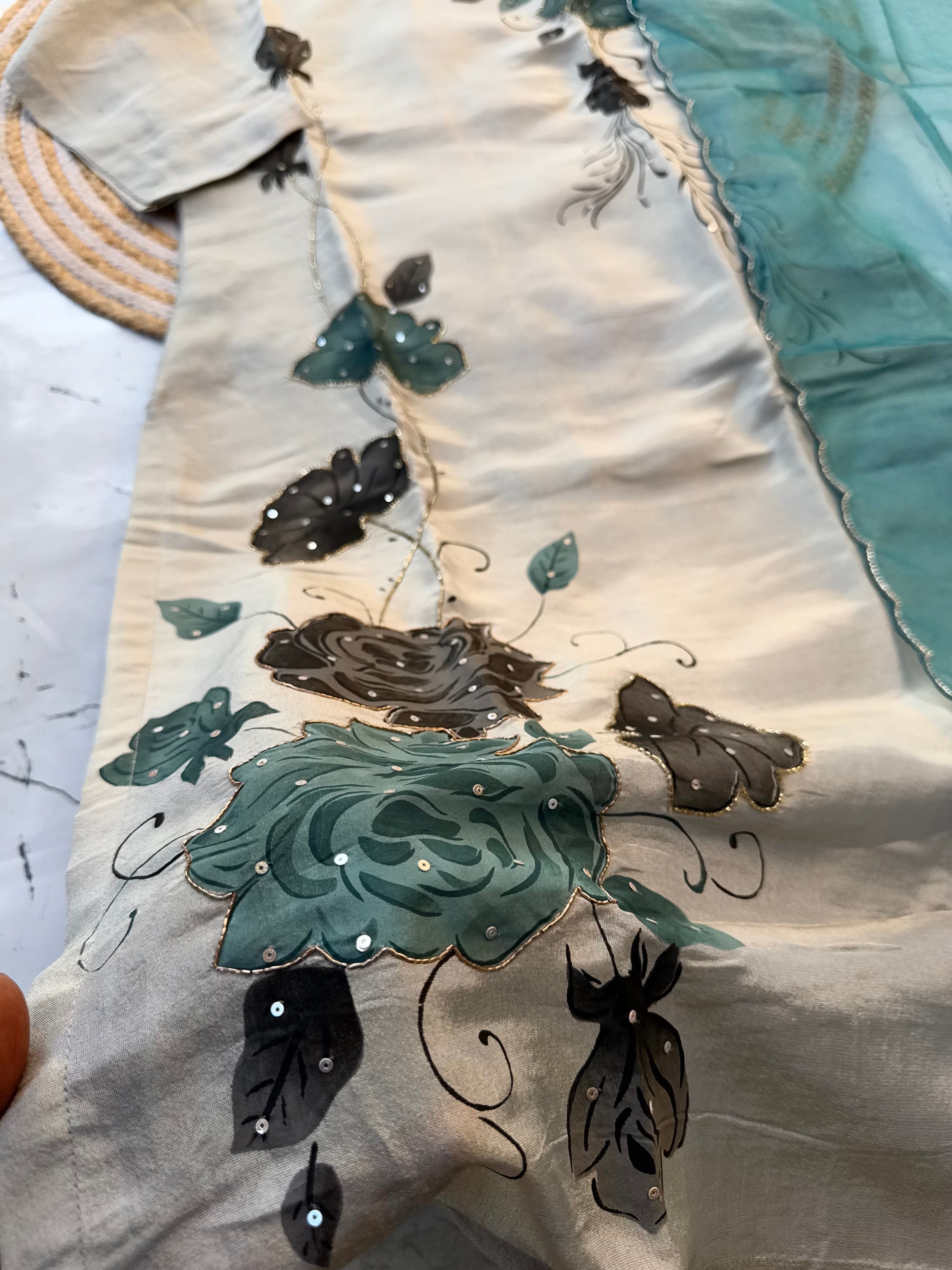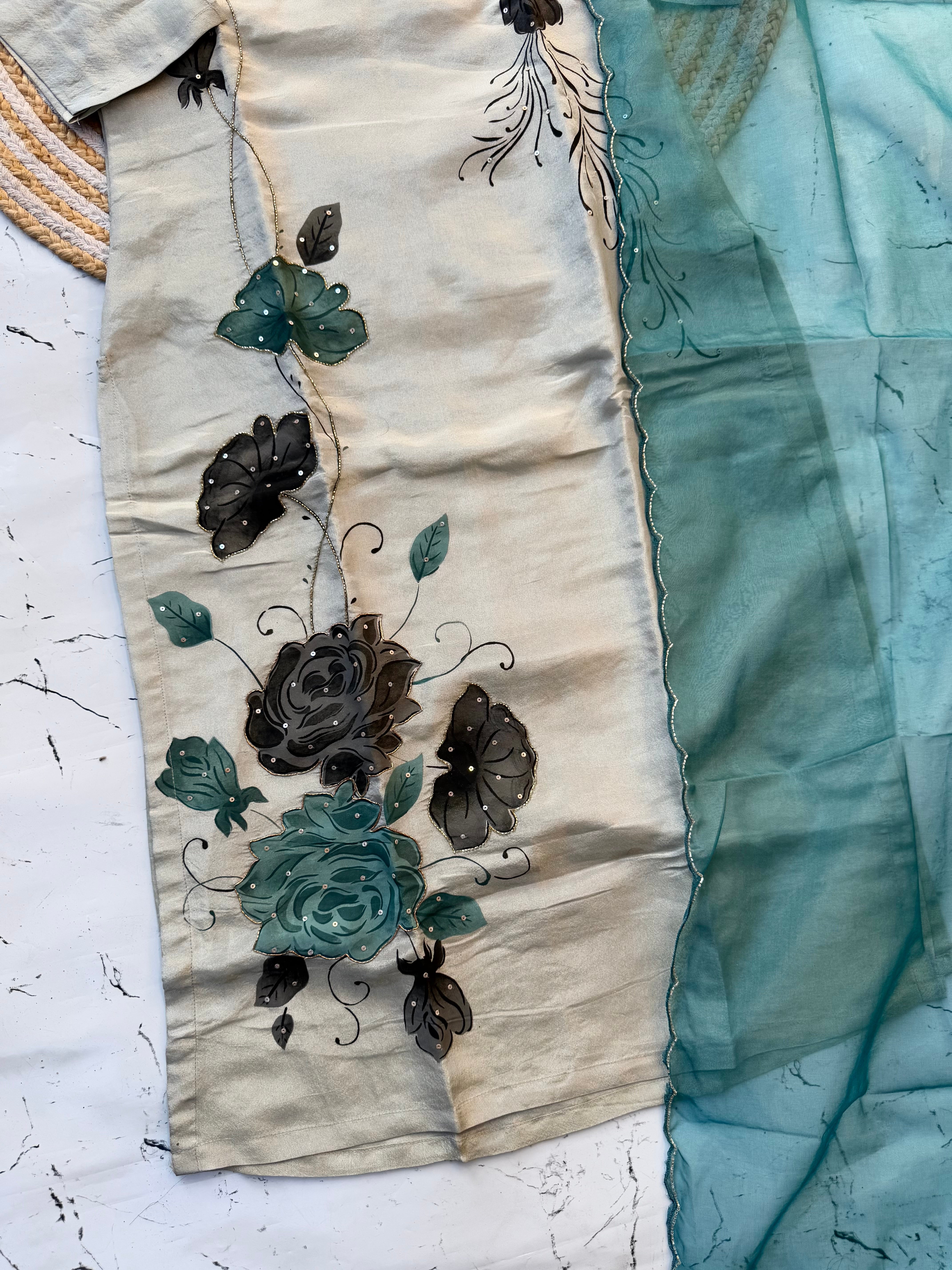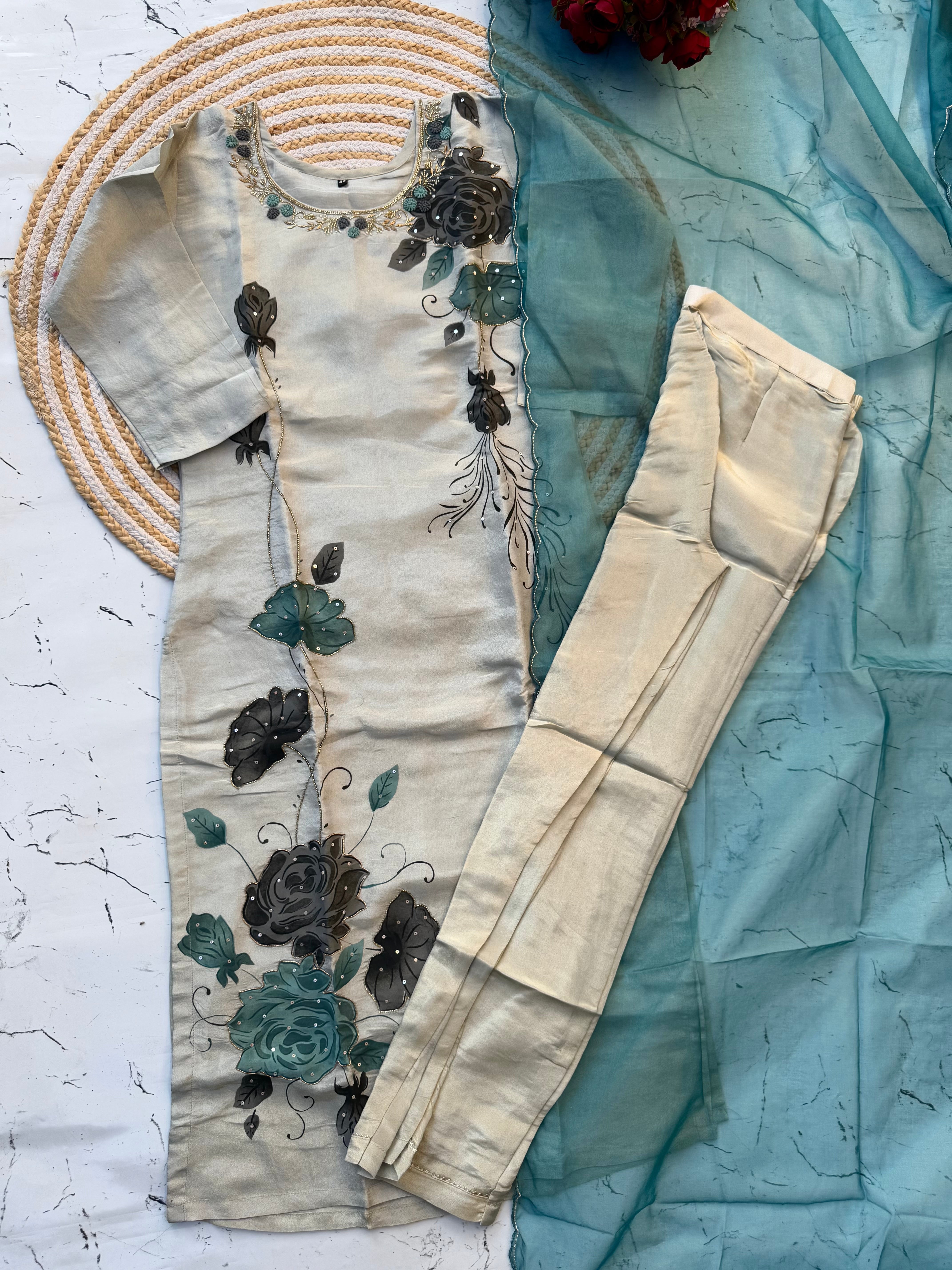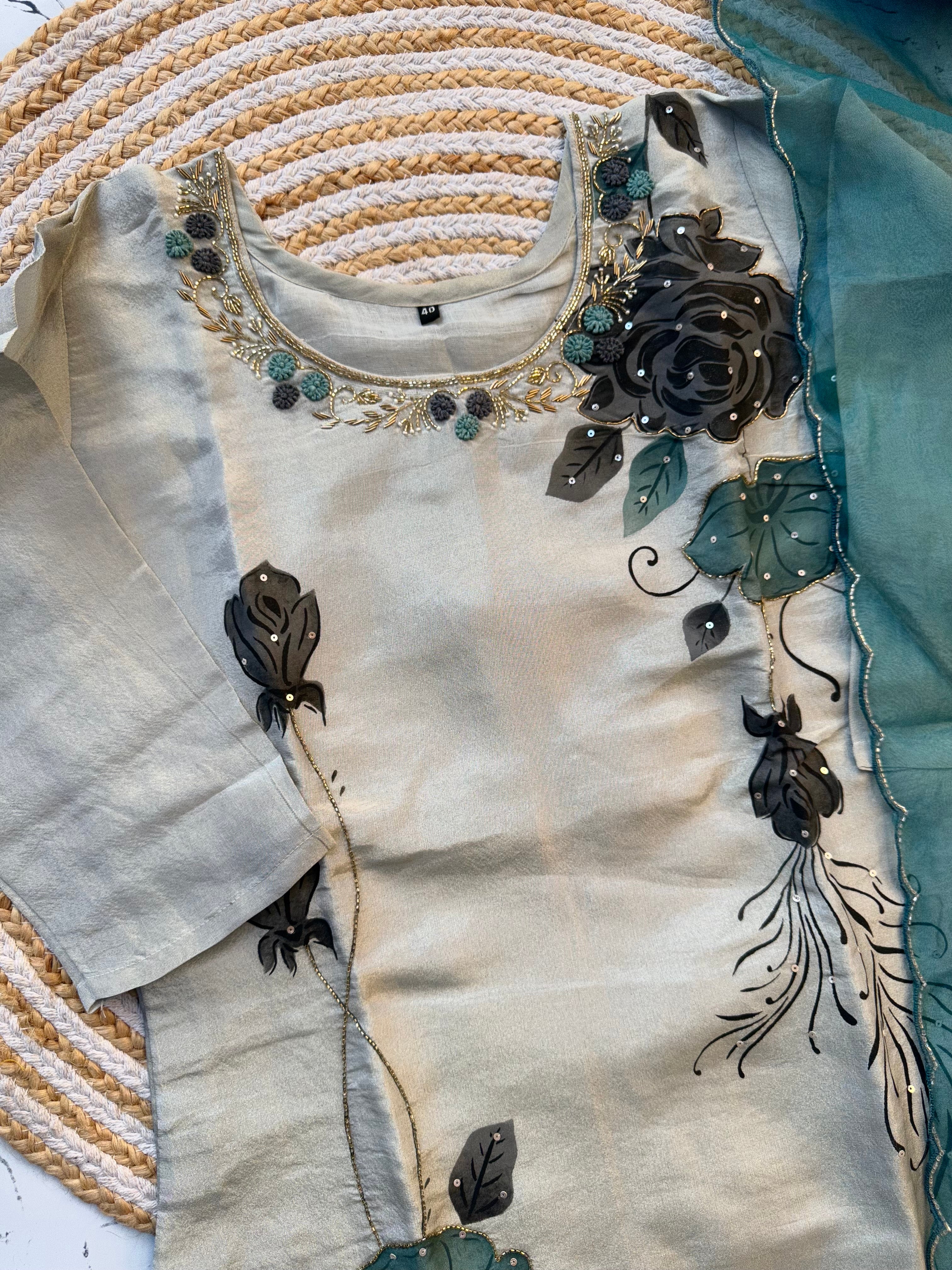 Russian silk kurti set with handwork on the yoke of the kurta with poket on top with a printed organza dupatta and a silk bottom with work