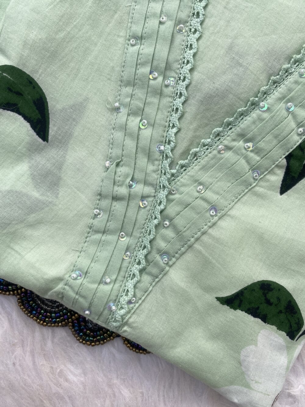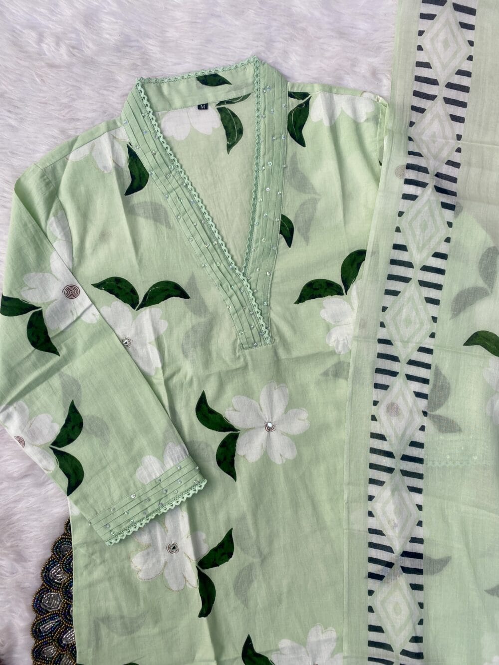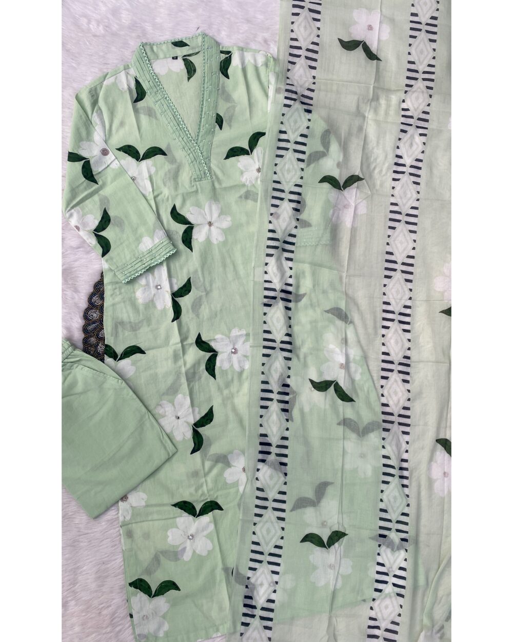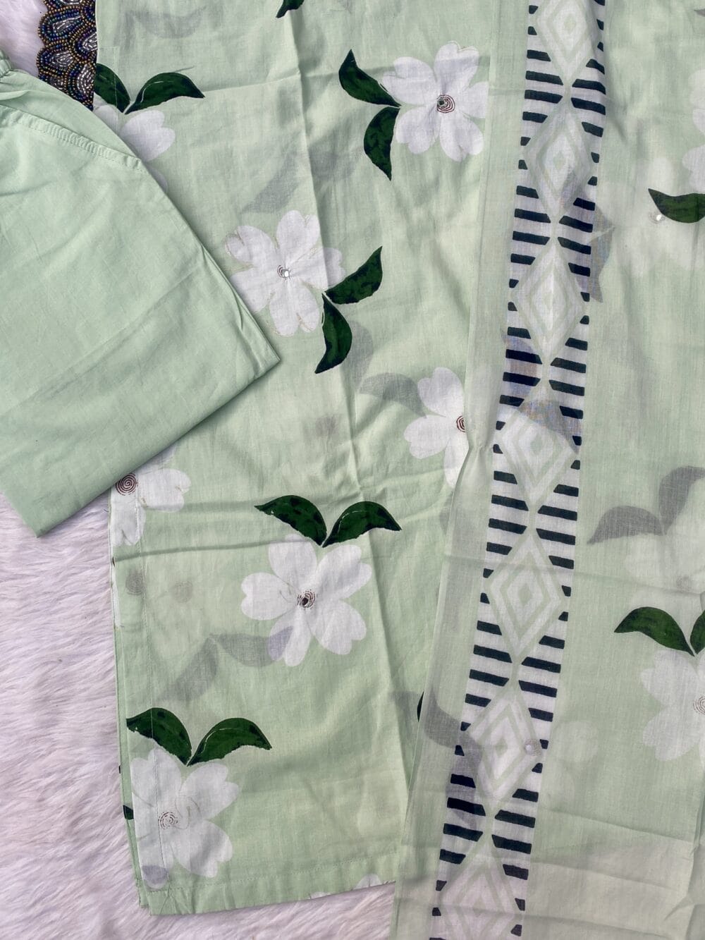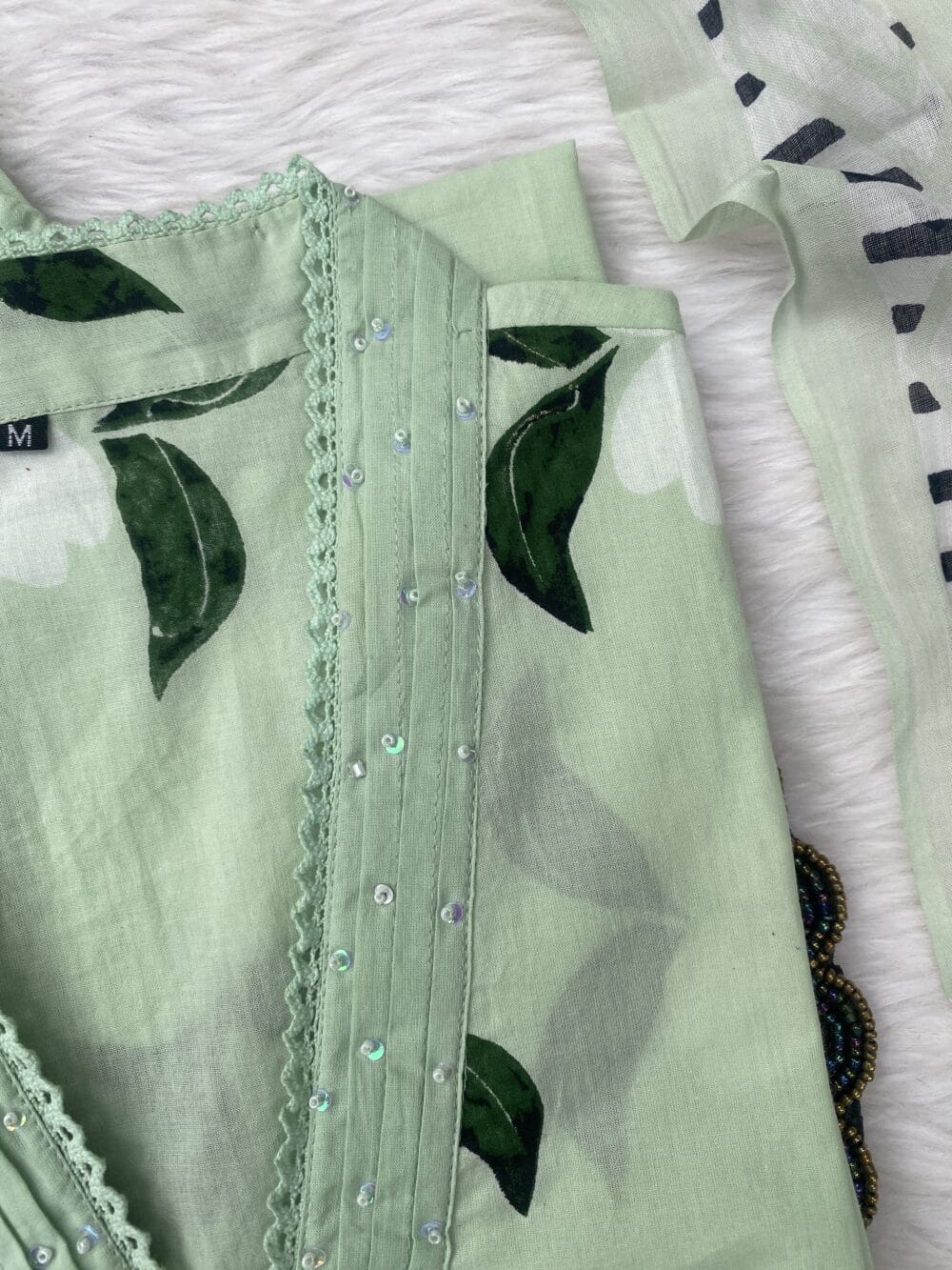 A very beautiful digitally printed and gold foil printed V neck cotton set with lace detailing and mirror work one the flowers with cotton printed dupatta and a cotton bottom