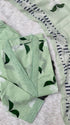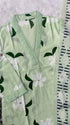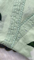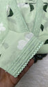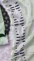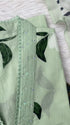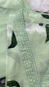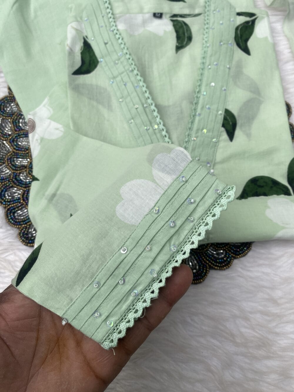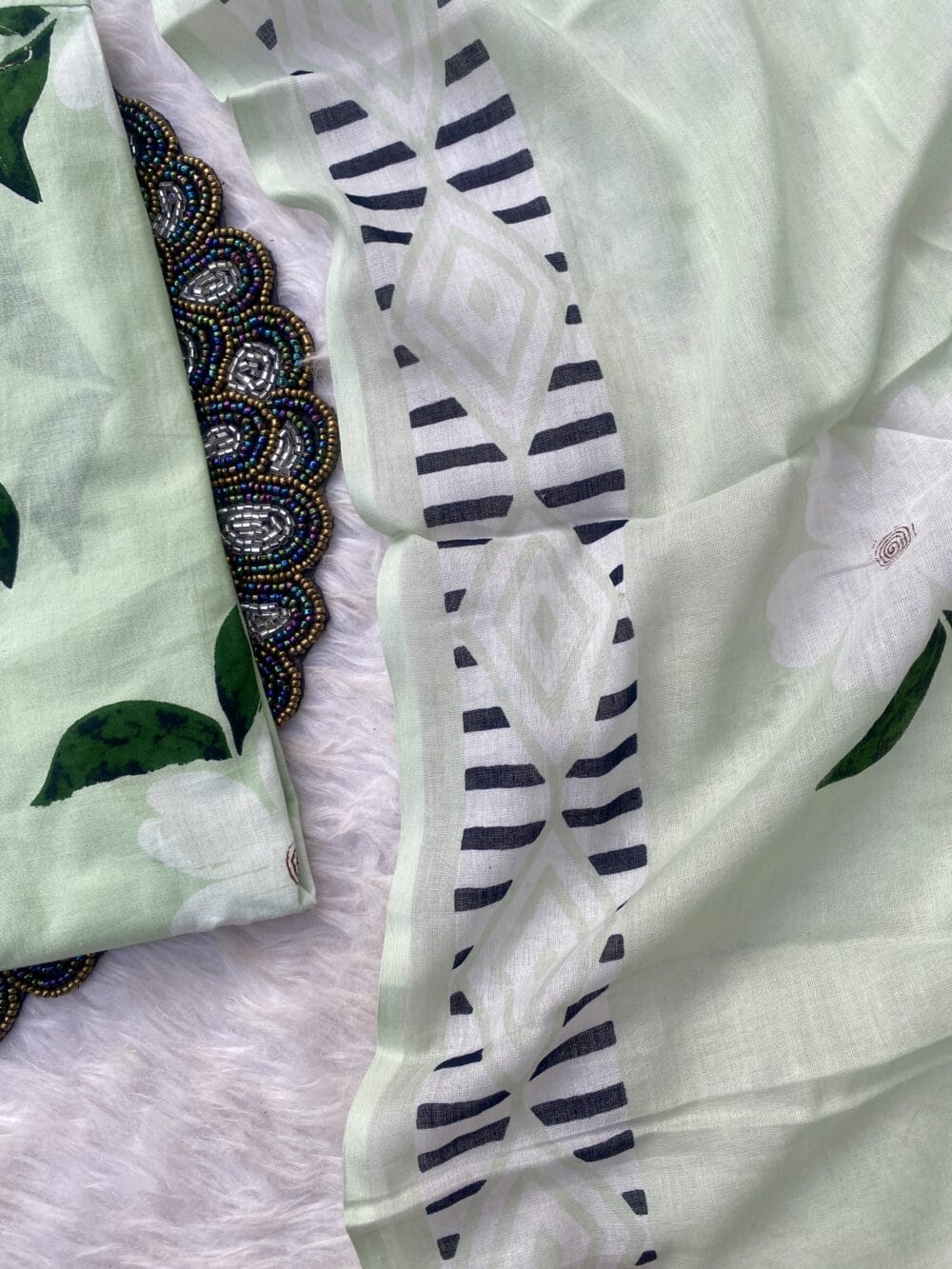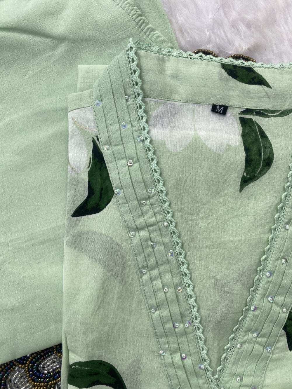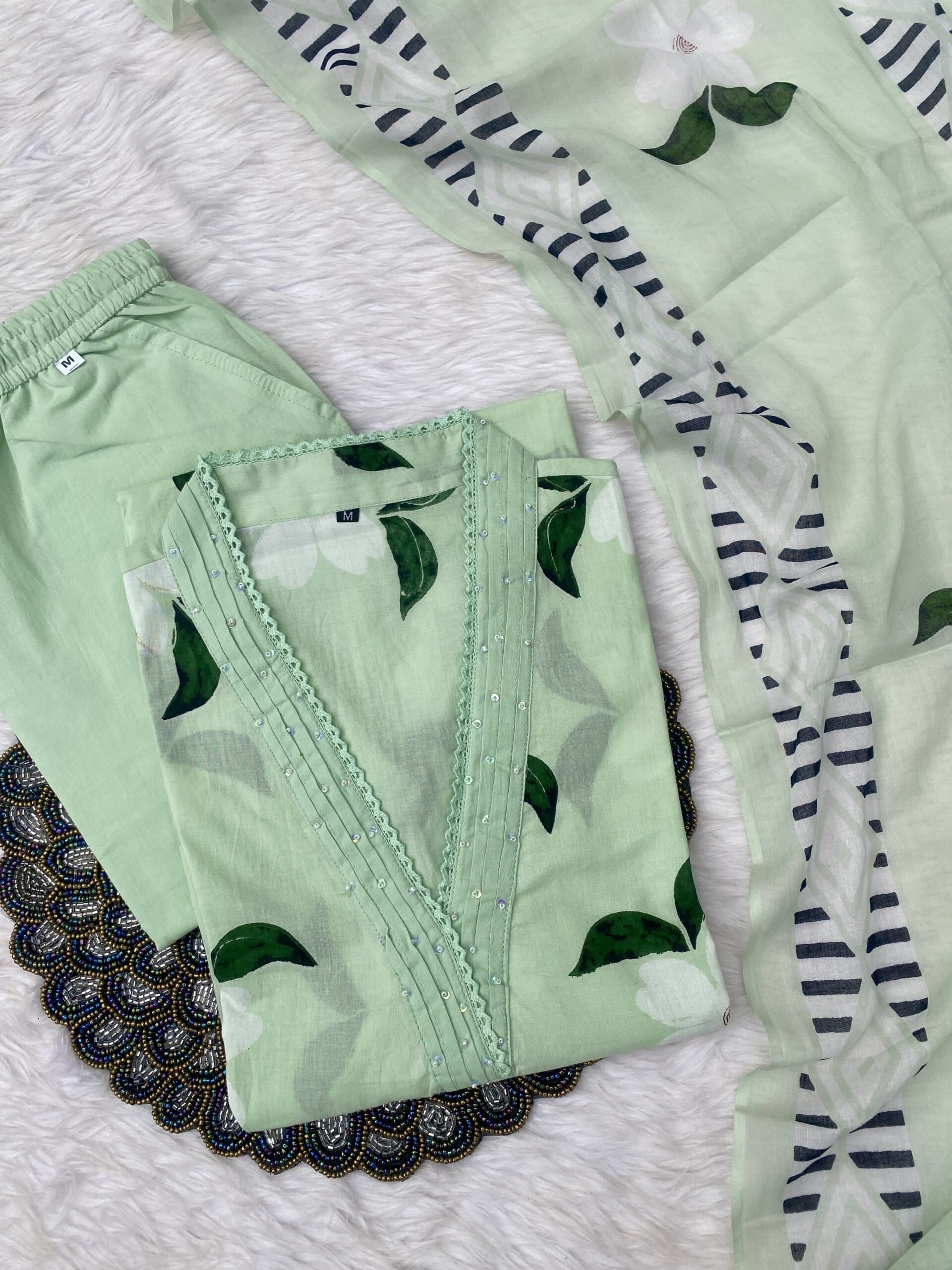 A very beautiful digitally printed and gold foil printed V neck cotton set with lace detailing and mirror work one the flowers with cotton printed dupatta and a cotton bottom
