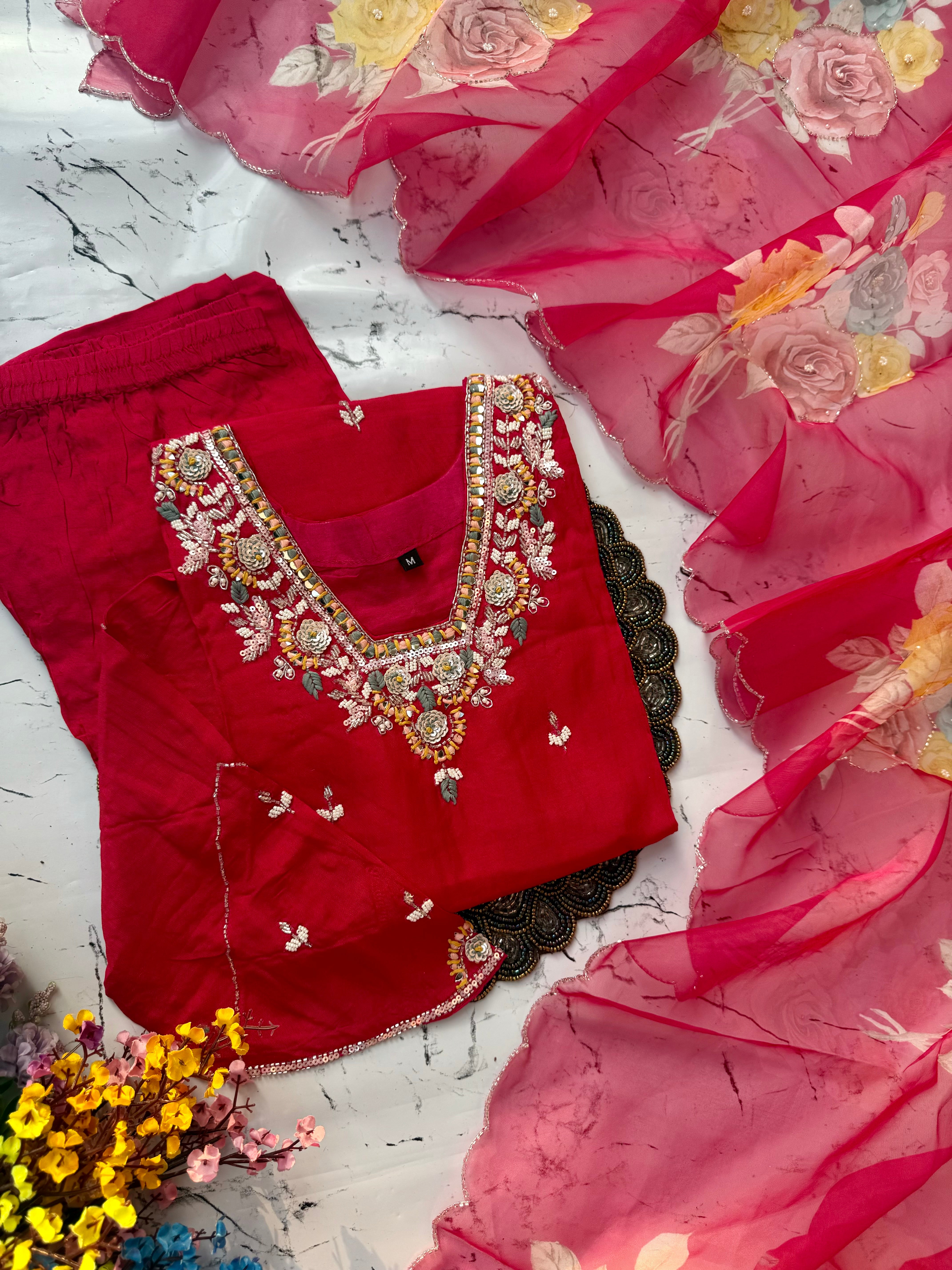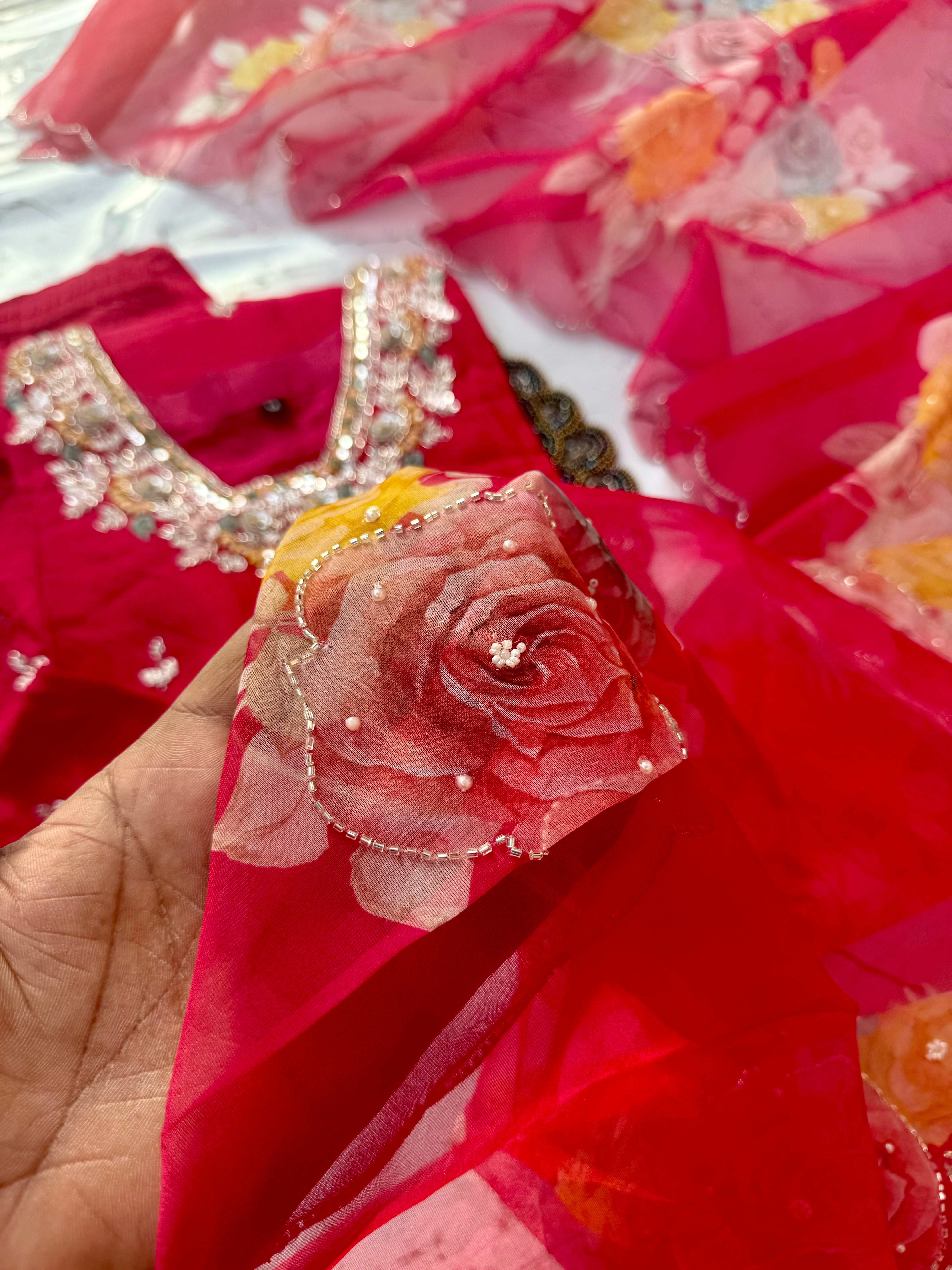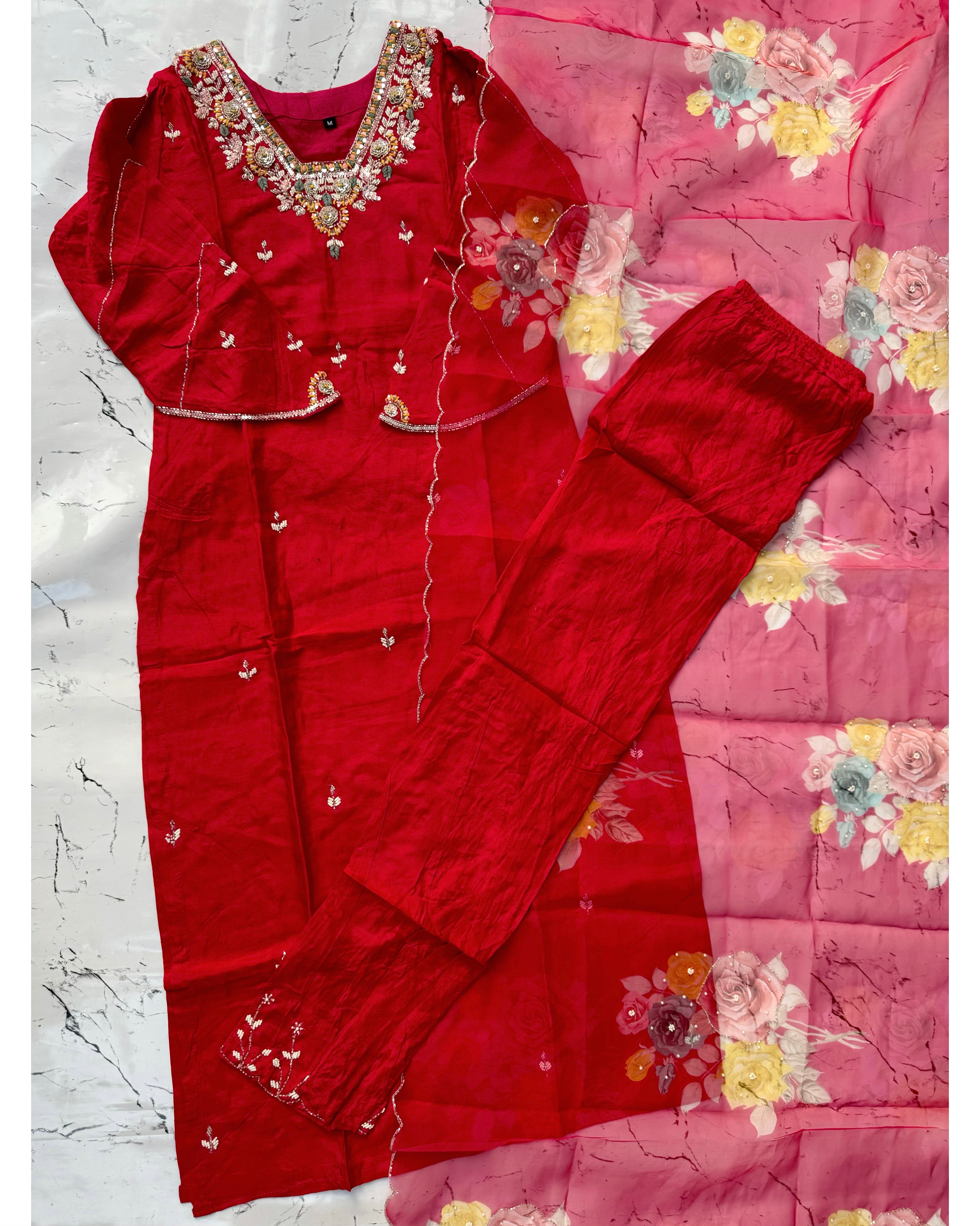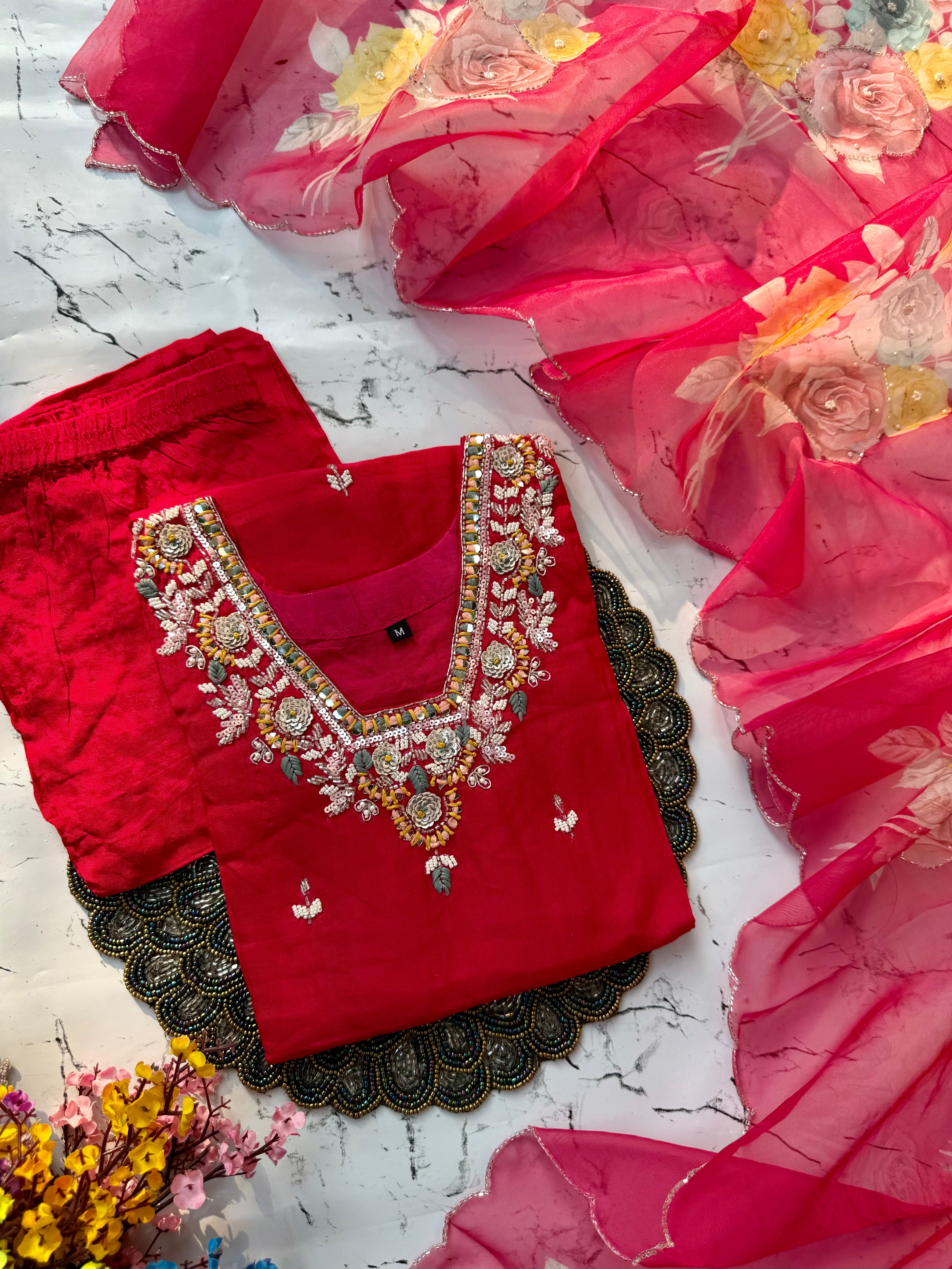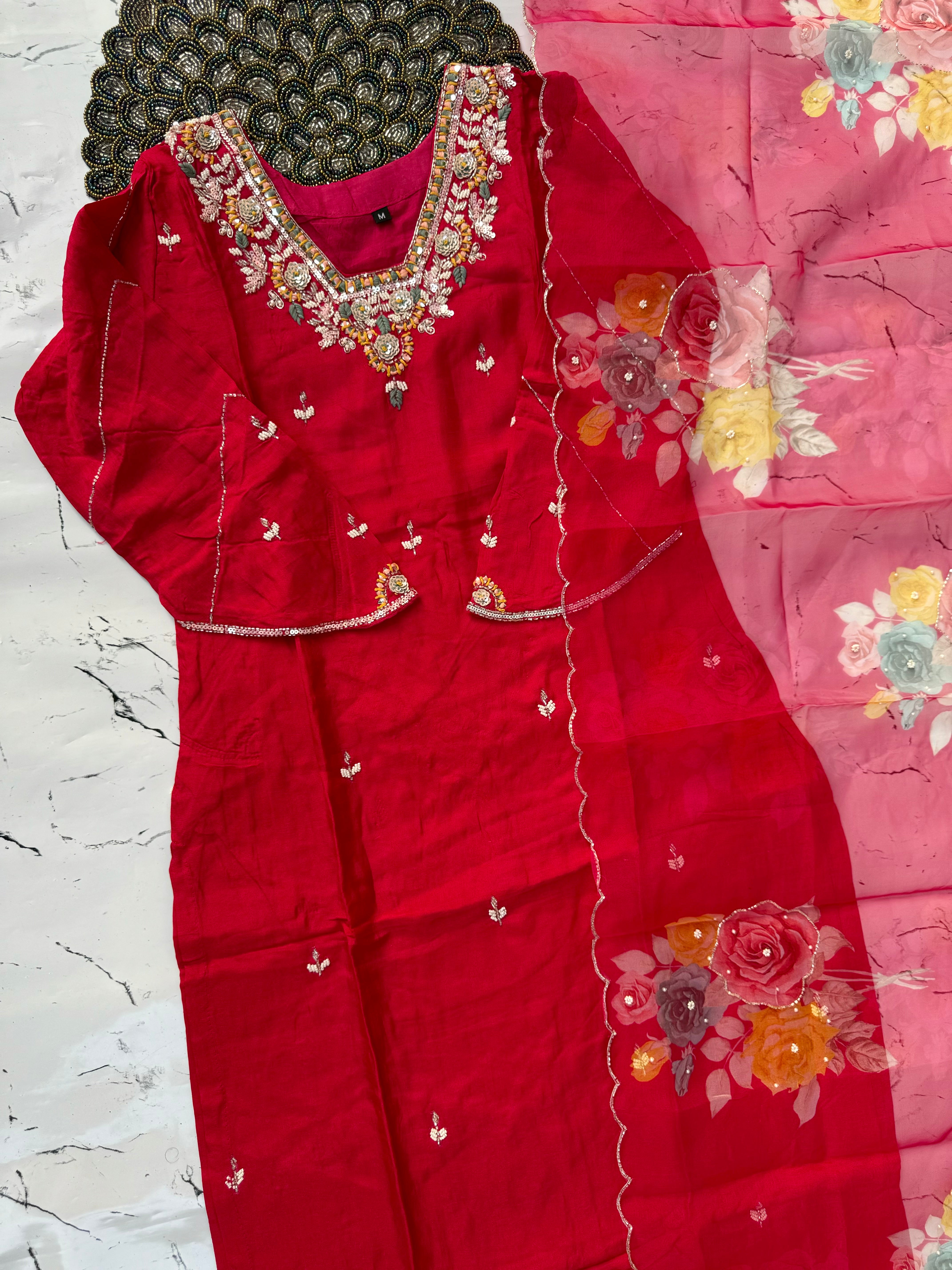 Dola silk kurti dupatta bottom set with handwork on the yoke and sleeves of the kurta with a beautiful Printed & handwork organza dupatta with a silk bottom with work