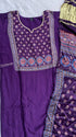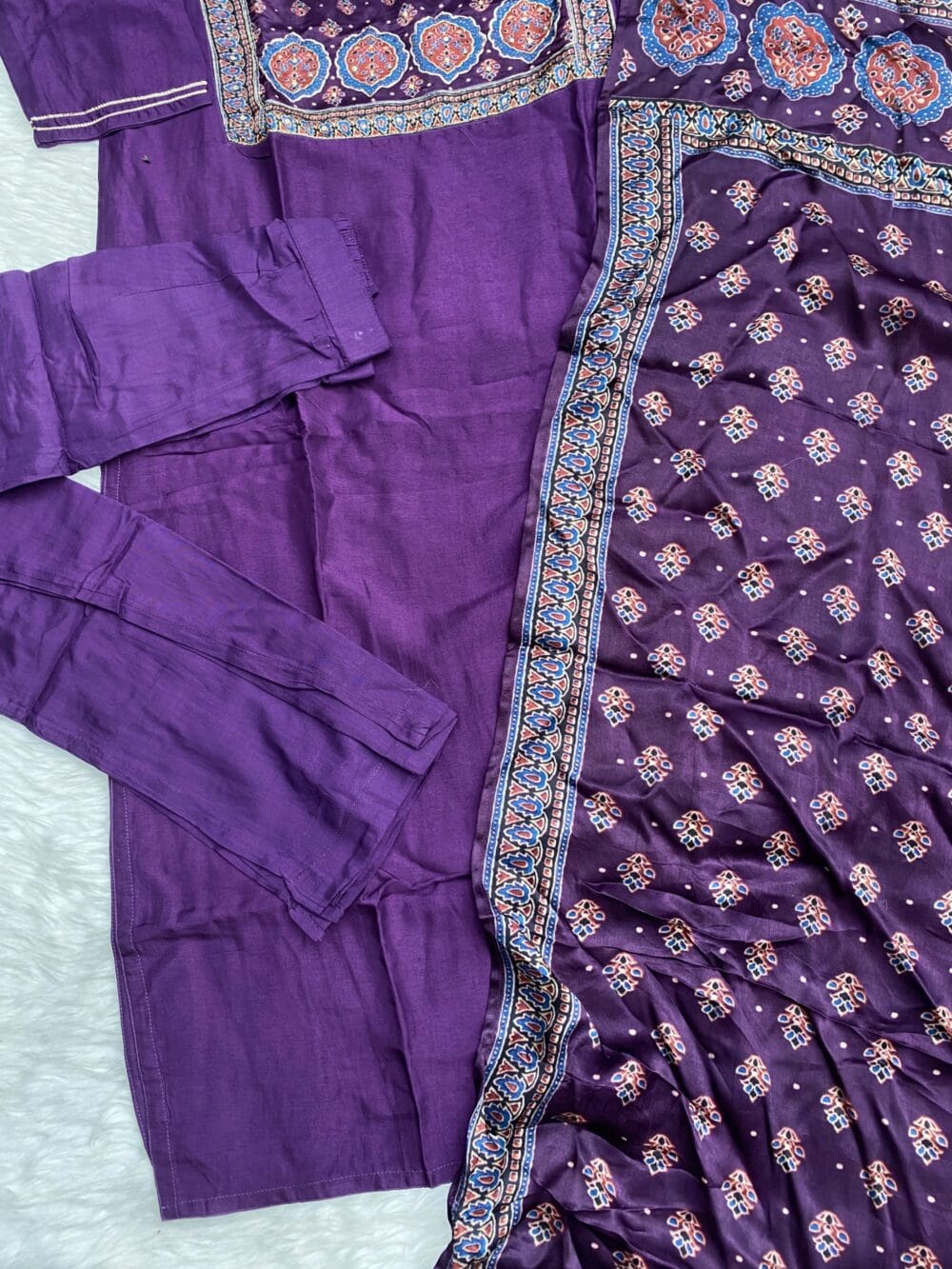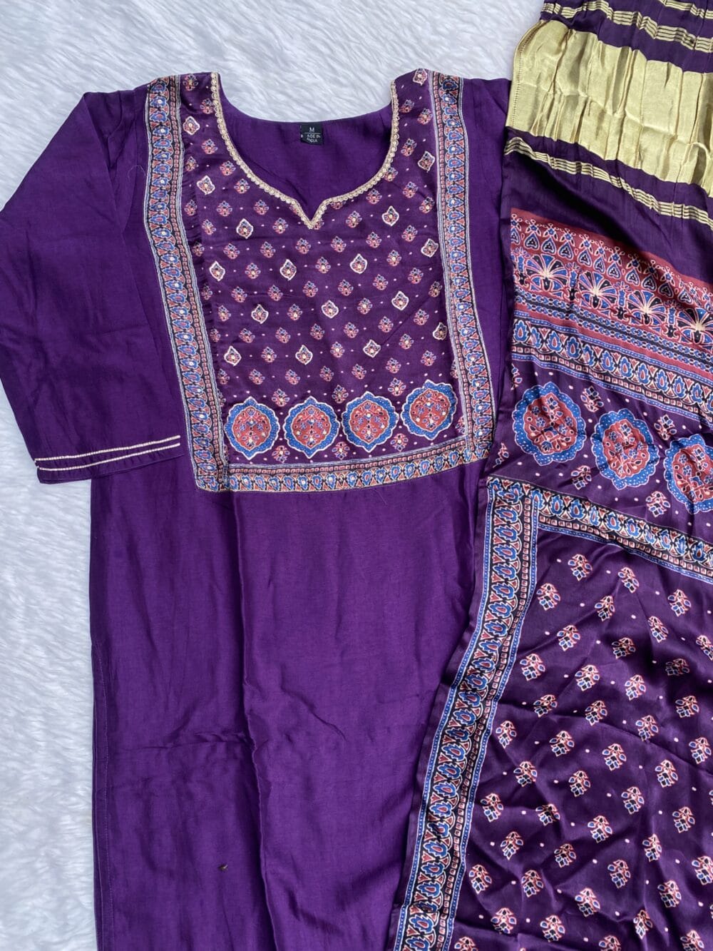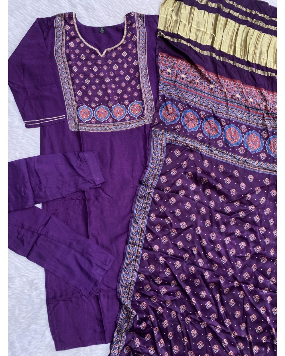 Russian silk kurti with handwork on the neck line with a long gajji silk dupatta paired with a plane silk bottom.