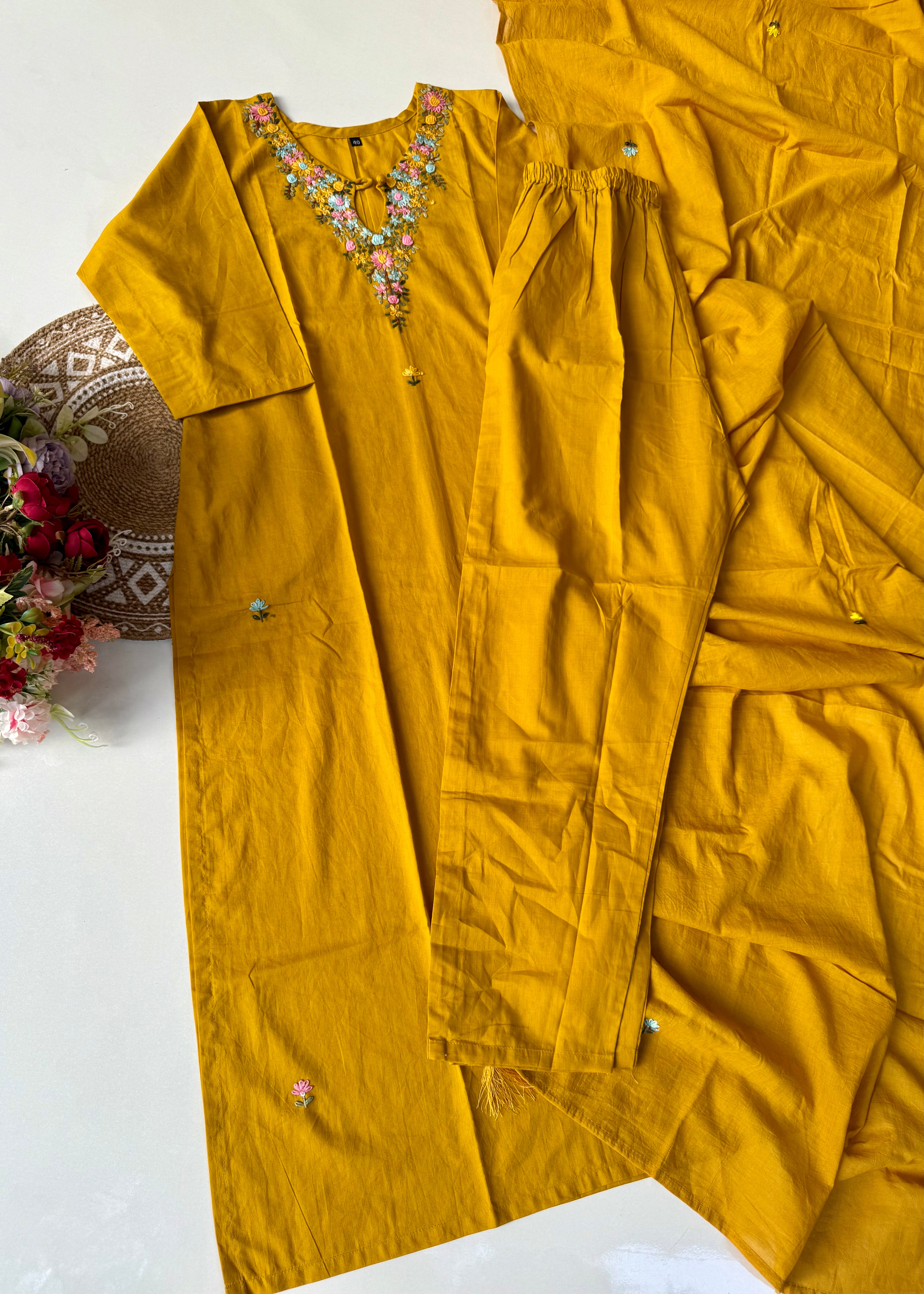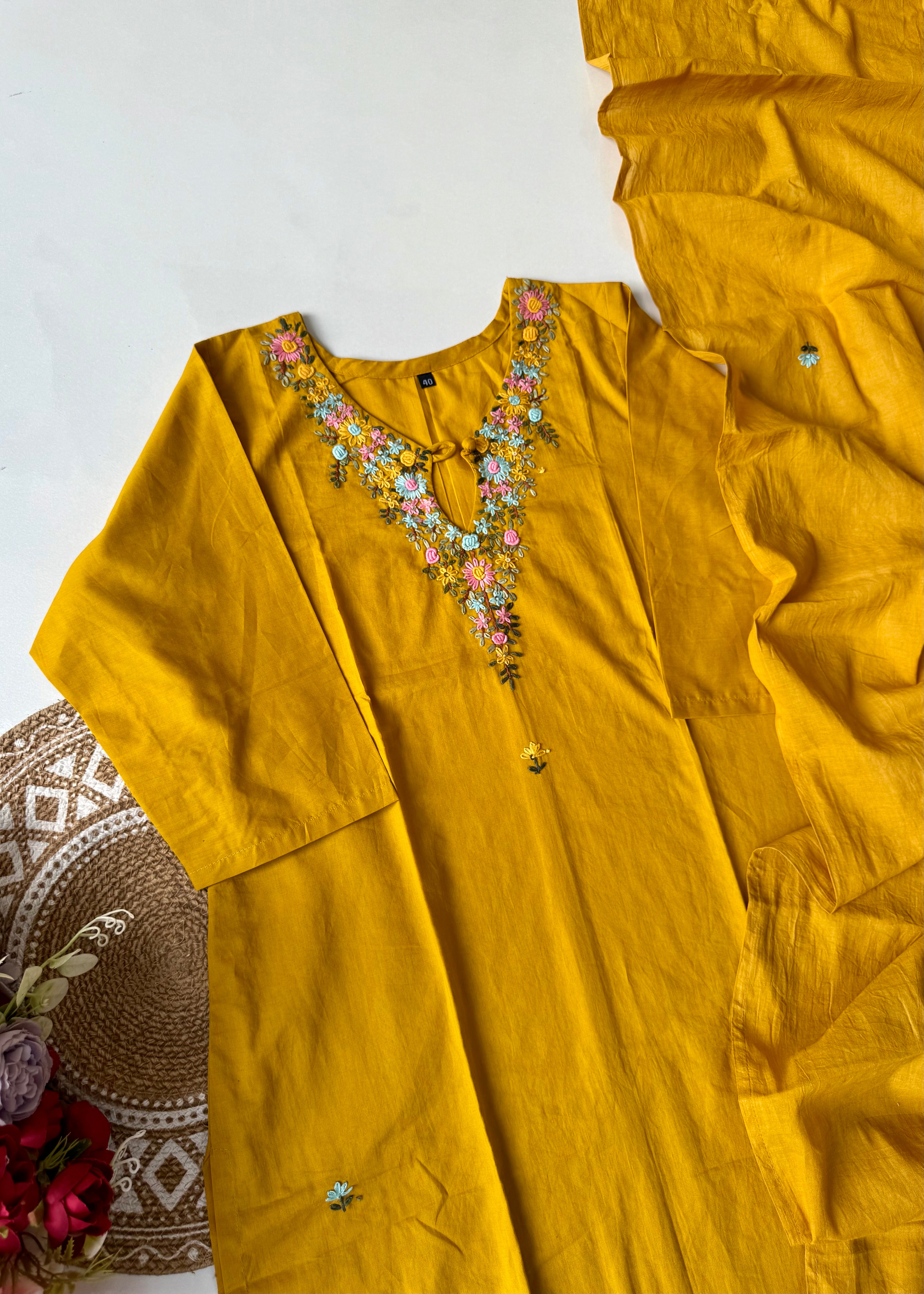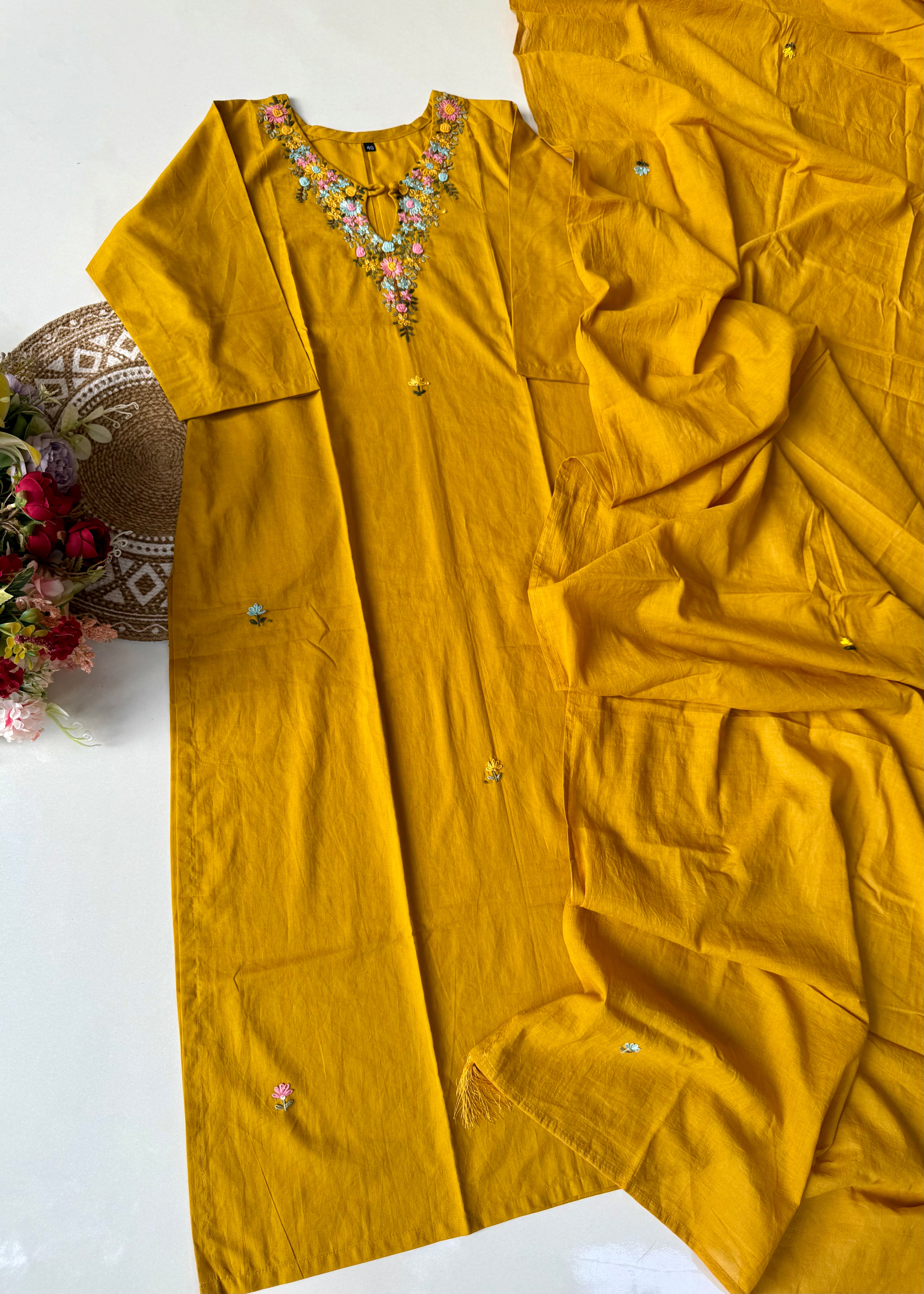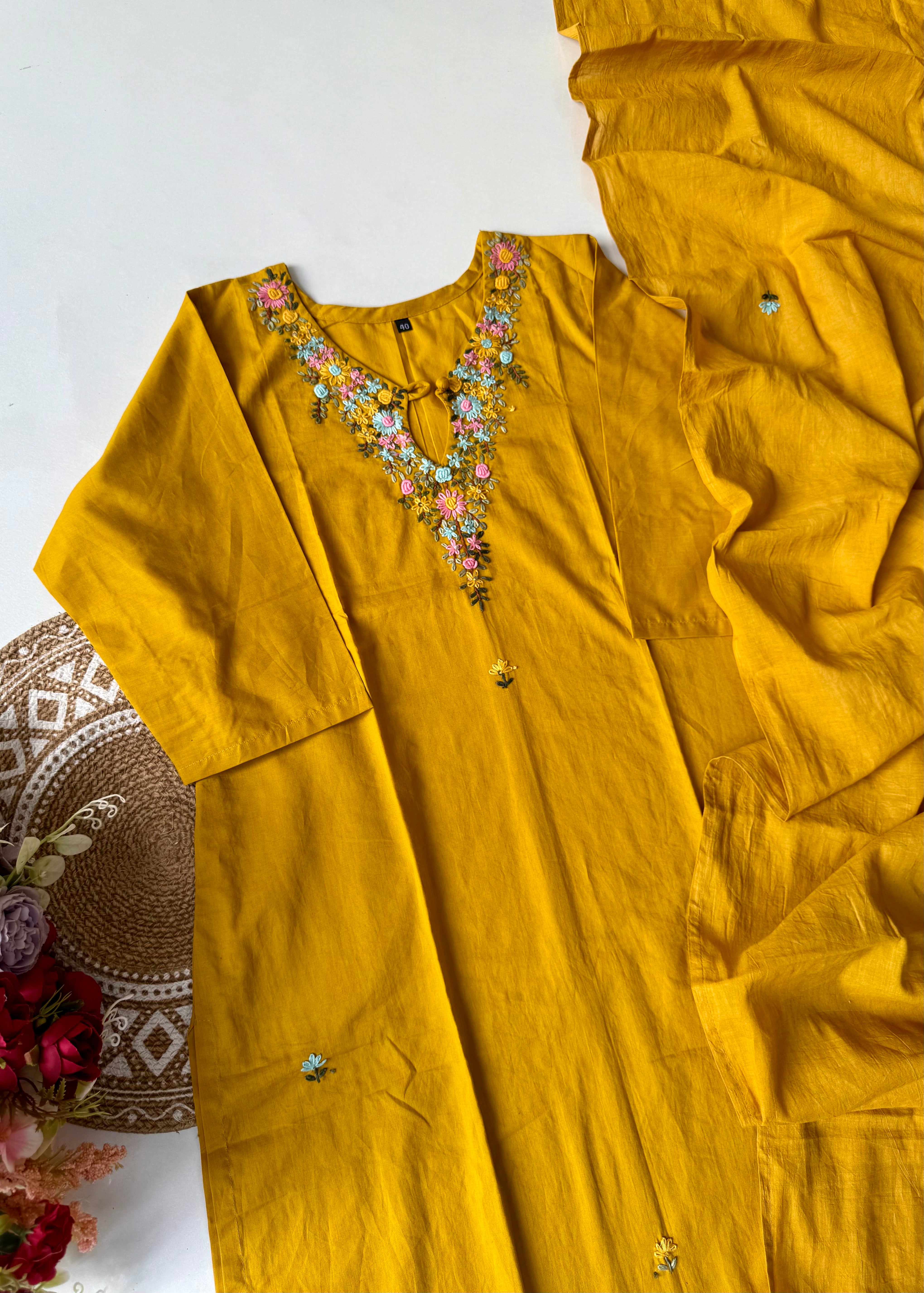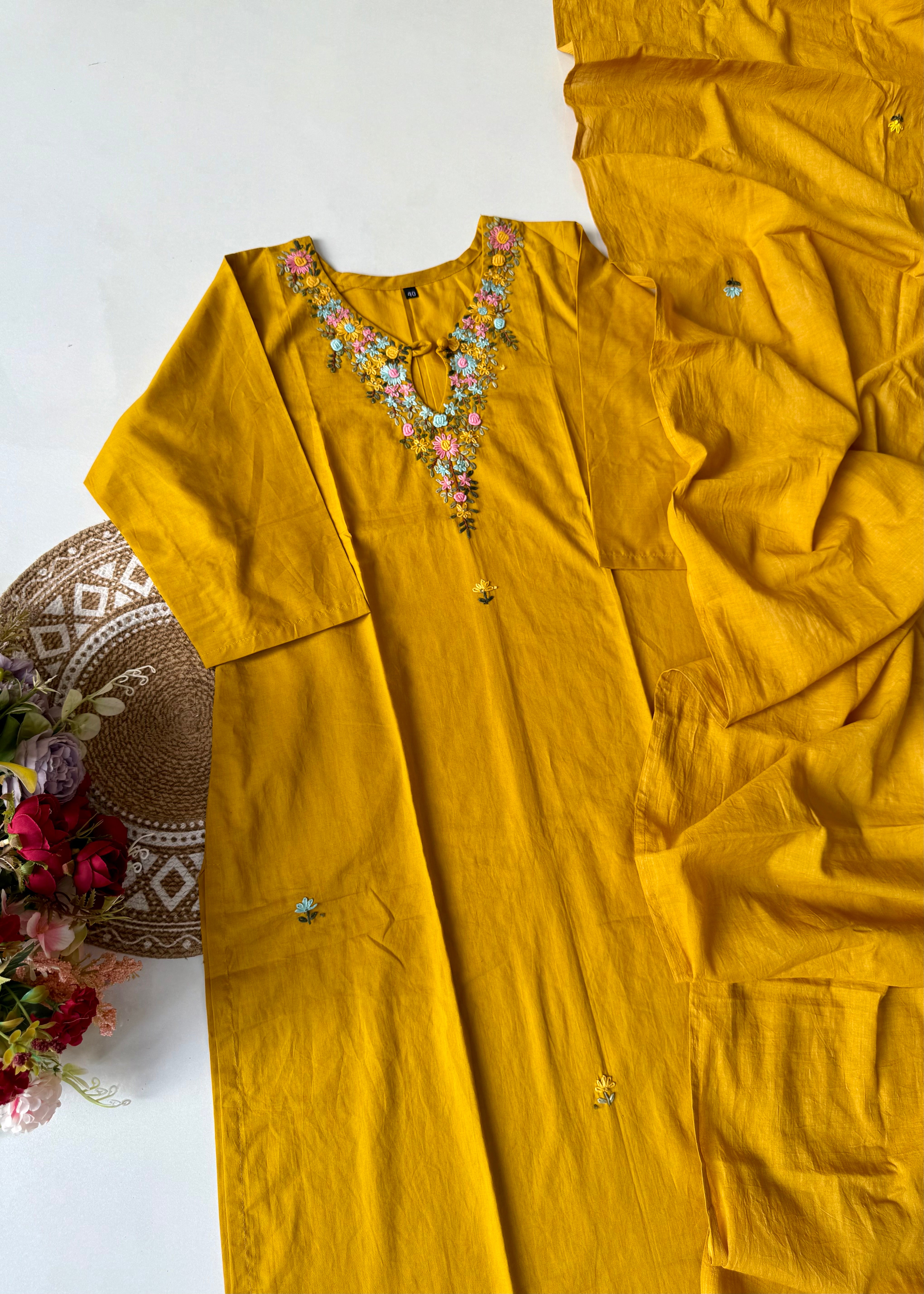 Premium cotton kurta set with thread work all over the top with a cotton dupatta and a cotton pant