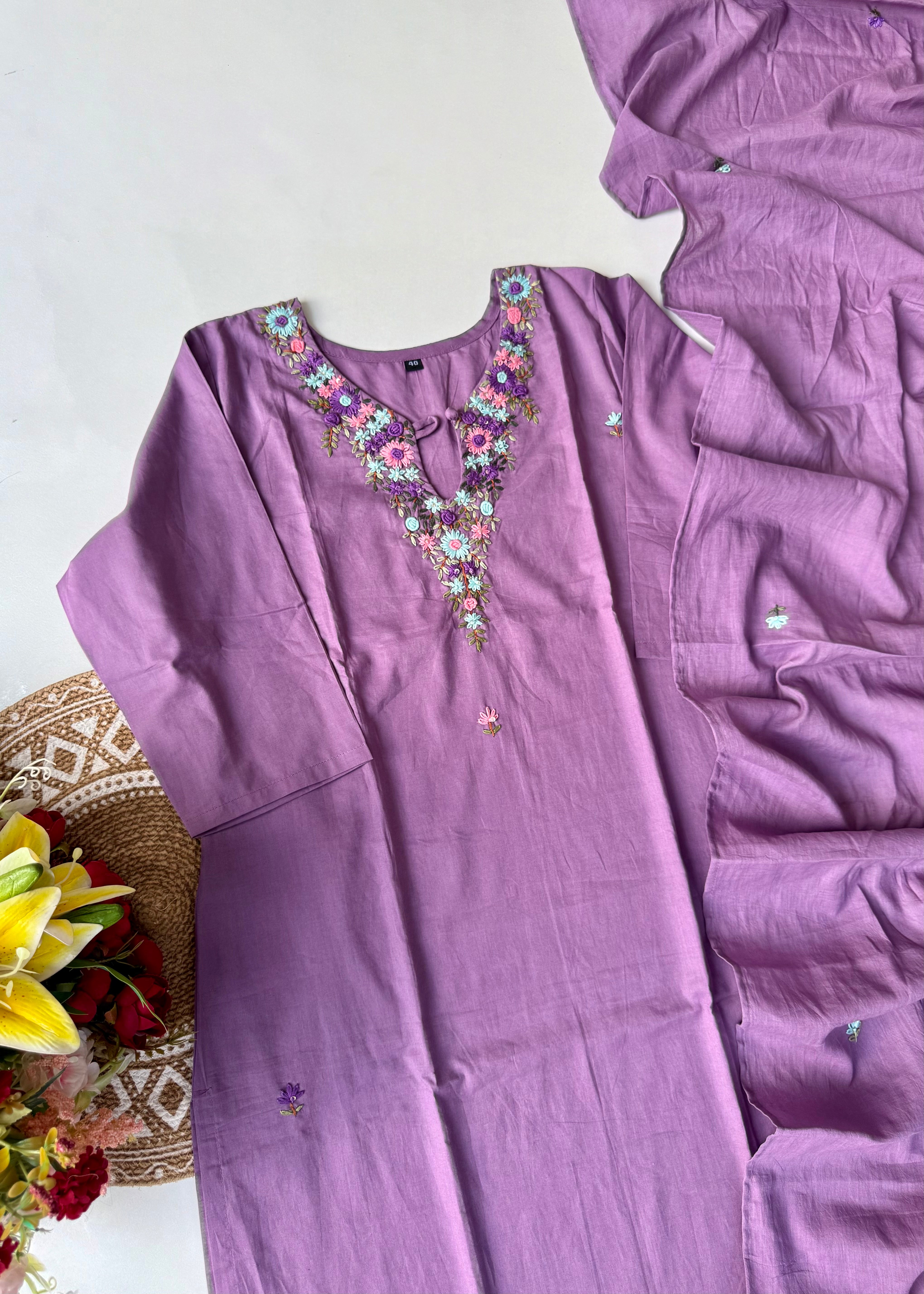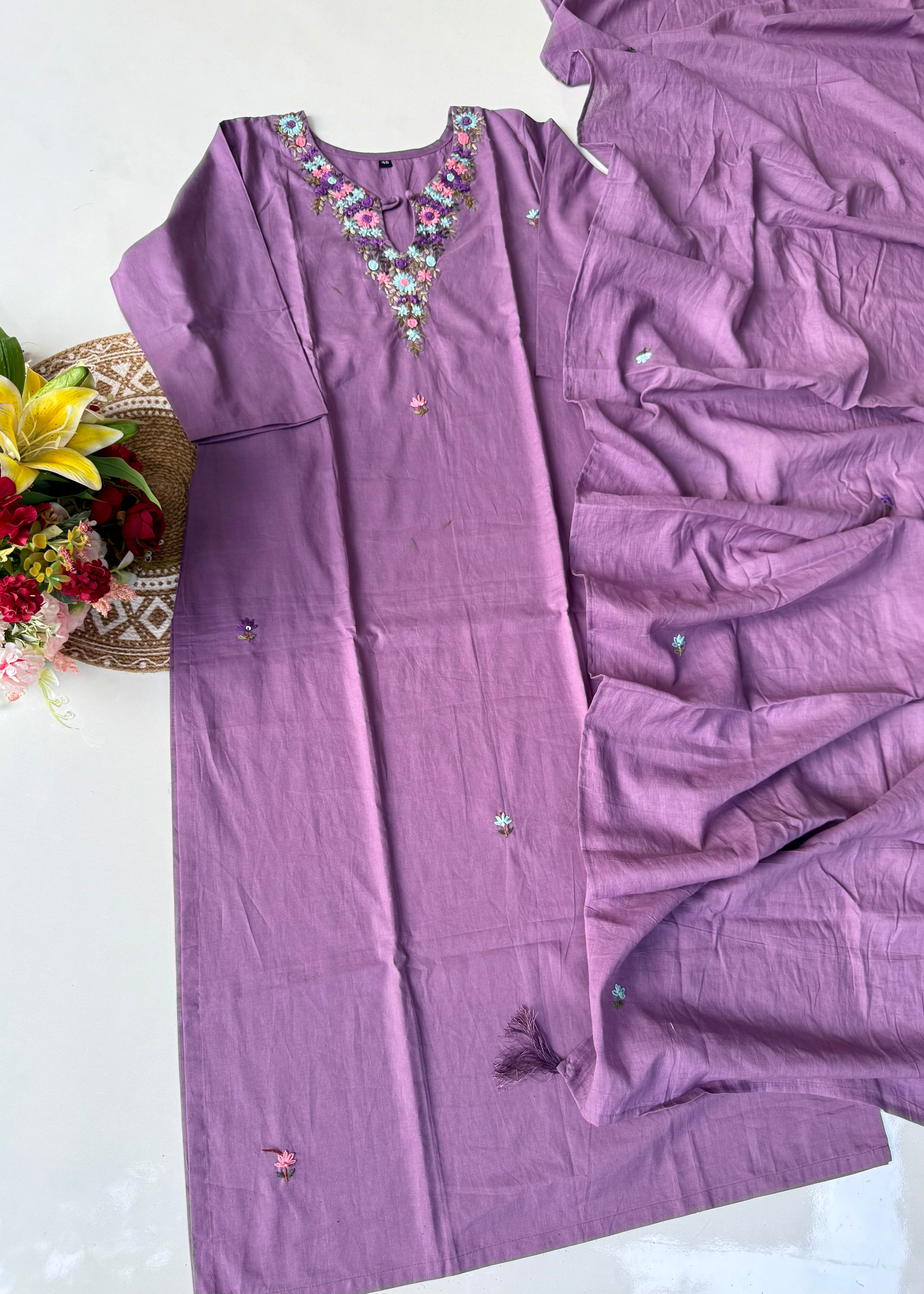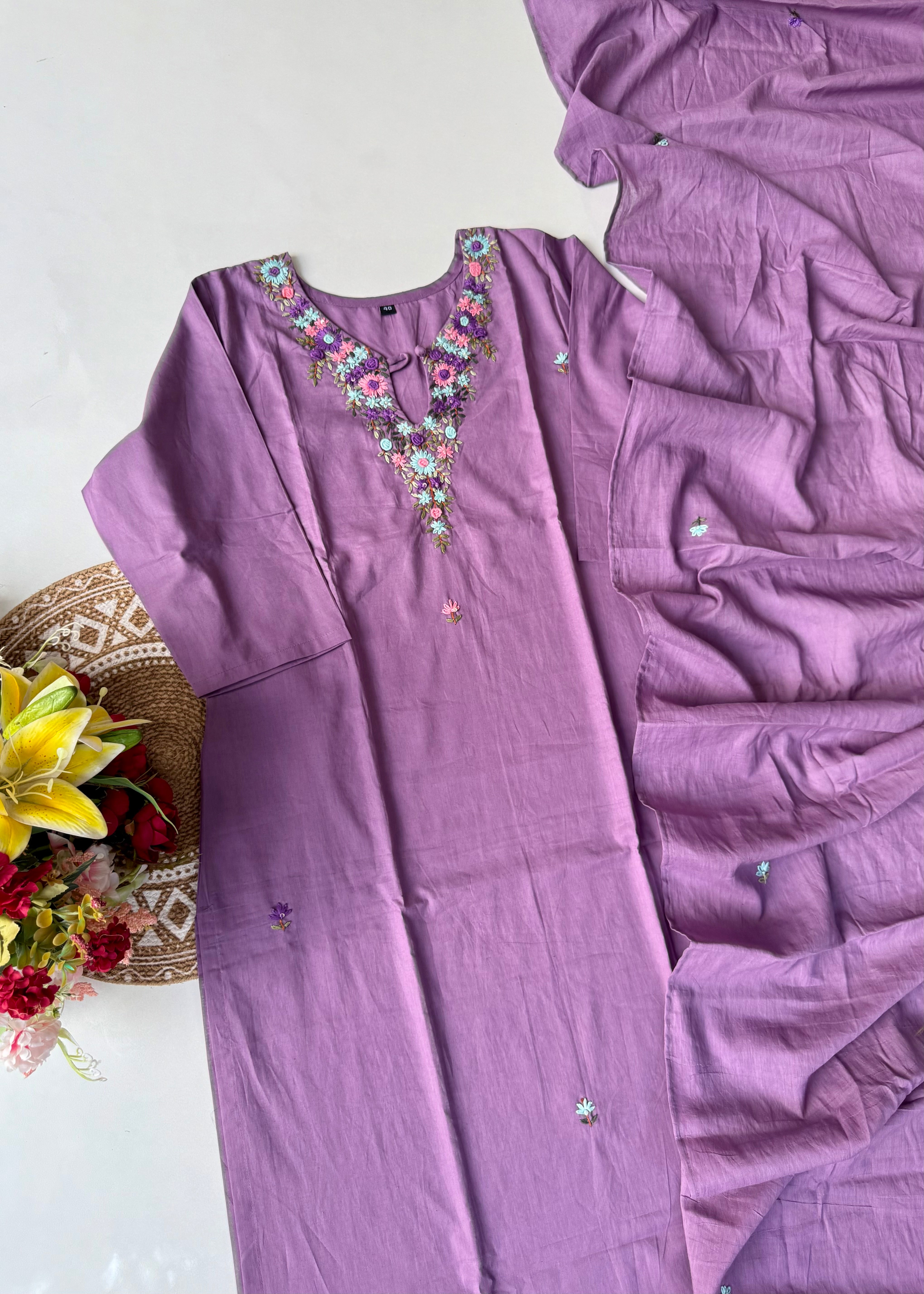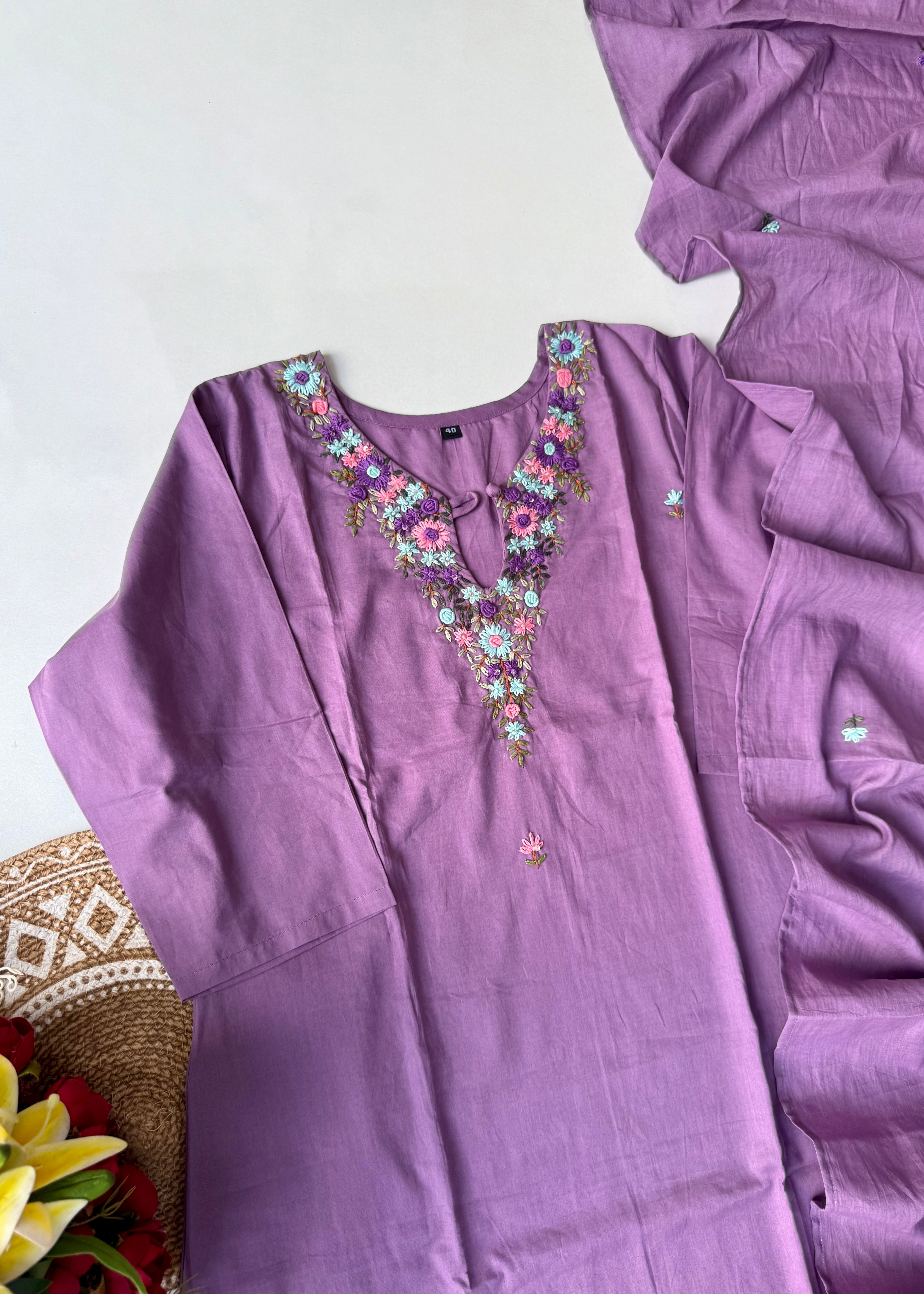 Premium cotton kurta set with thread work all over the top with a cotton dupatta and a cotton pant