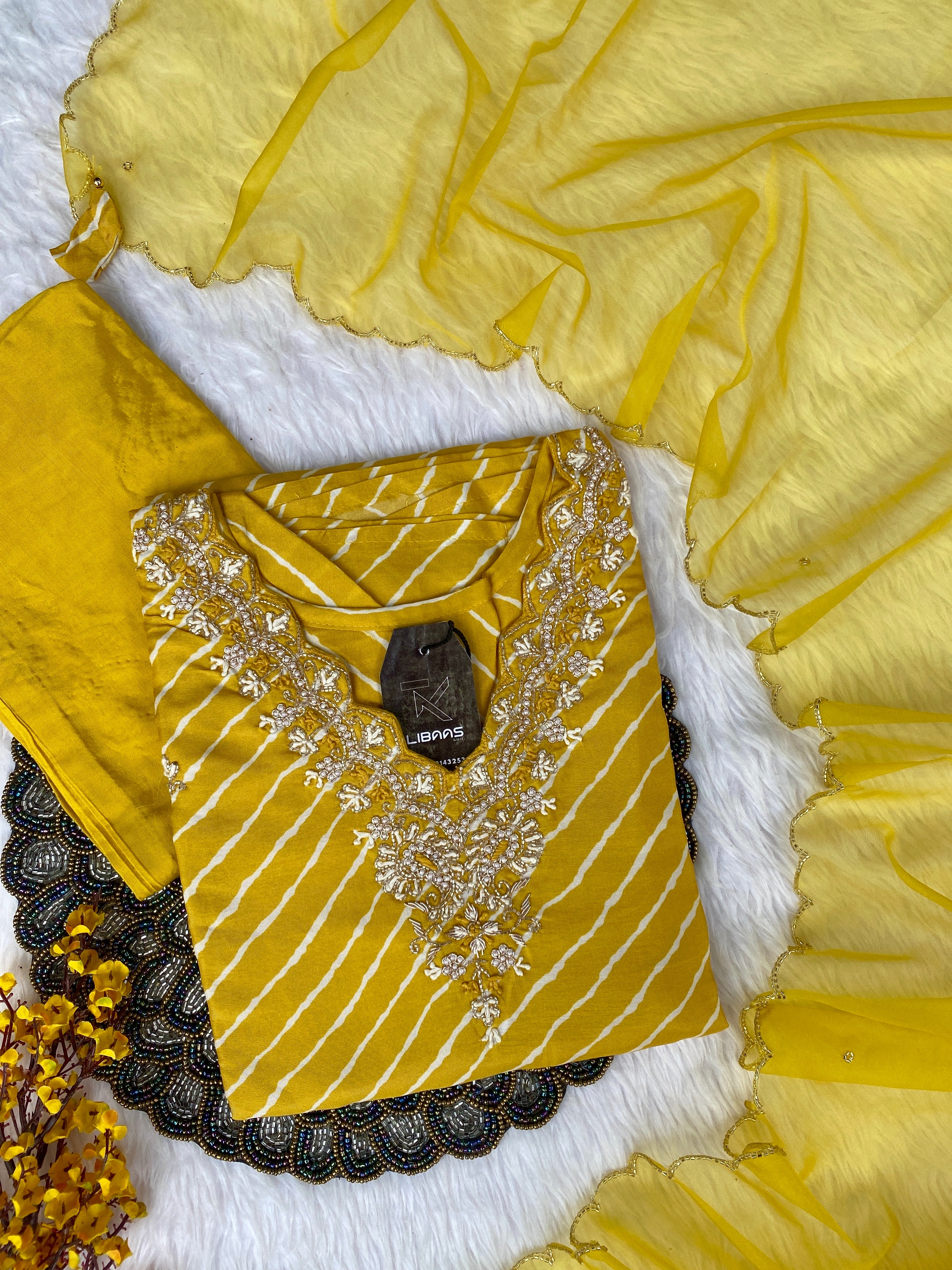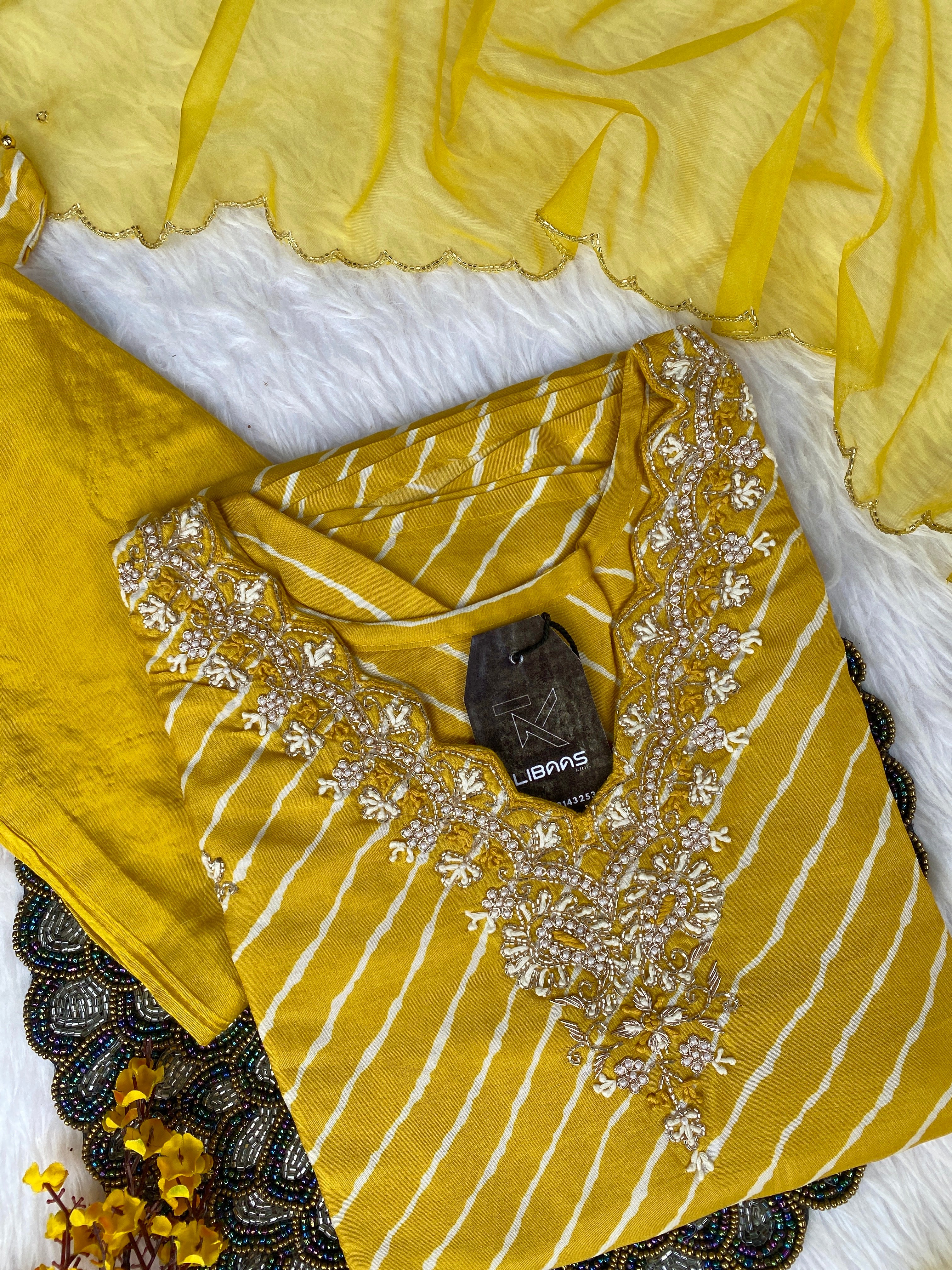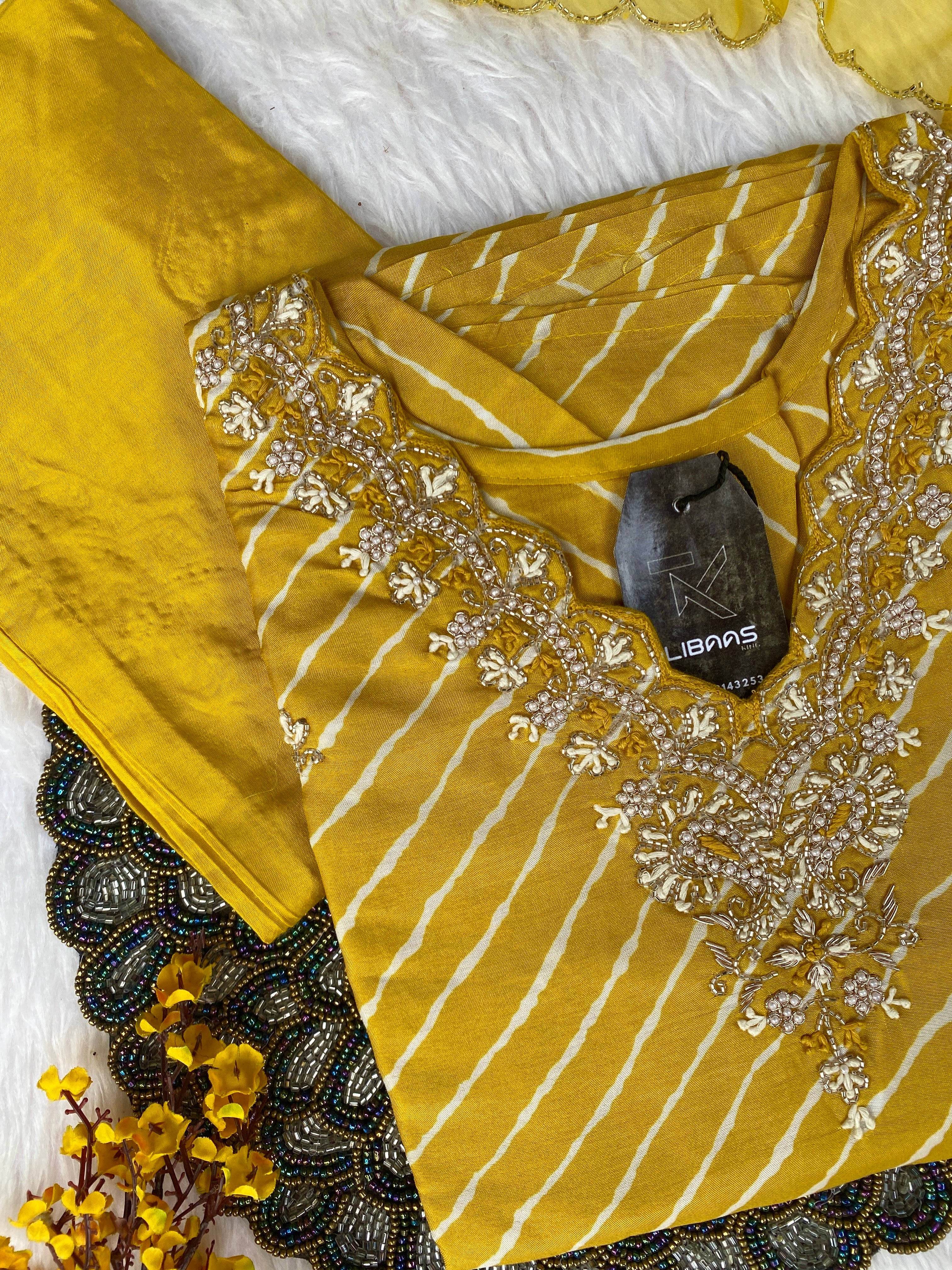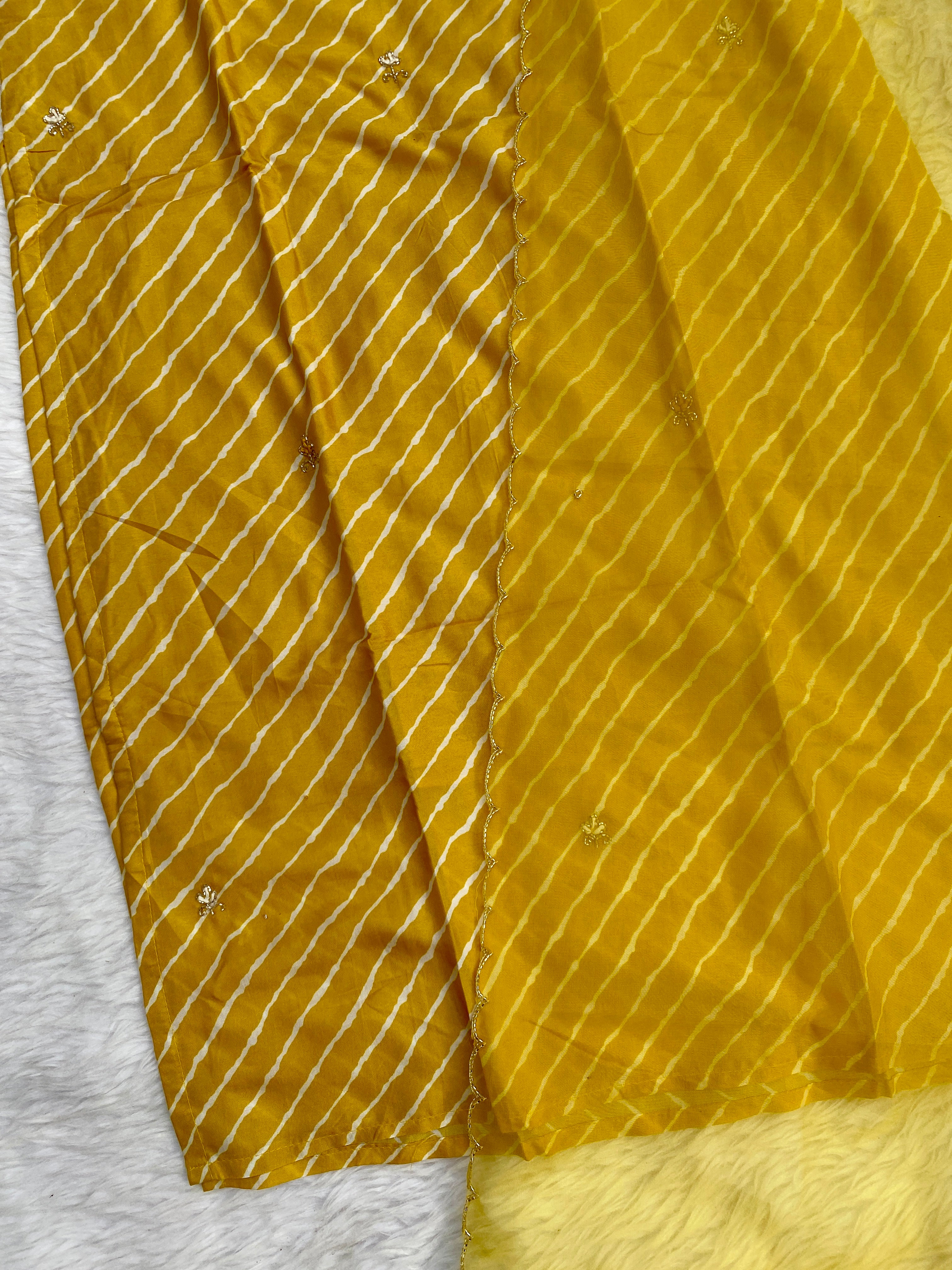 Bandhni printed dola silk set with handwork of the yoke of the kurta with Tissue oraganza scalping dupatta with a plane silk bottom