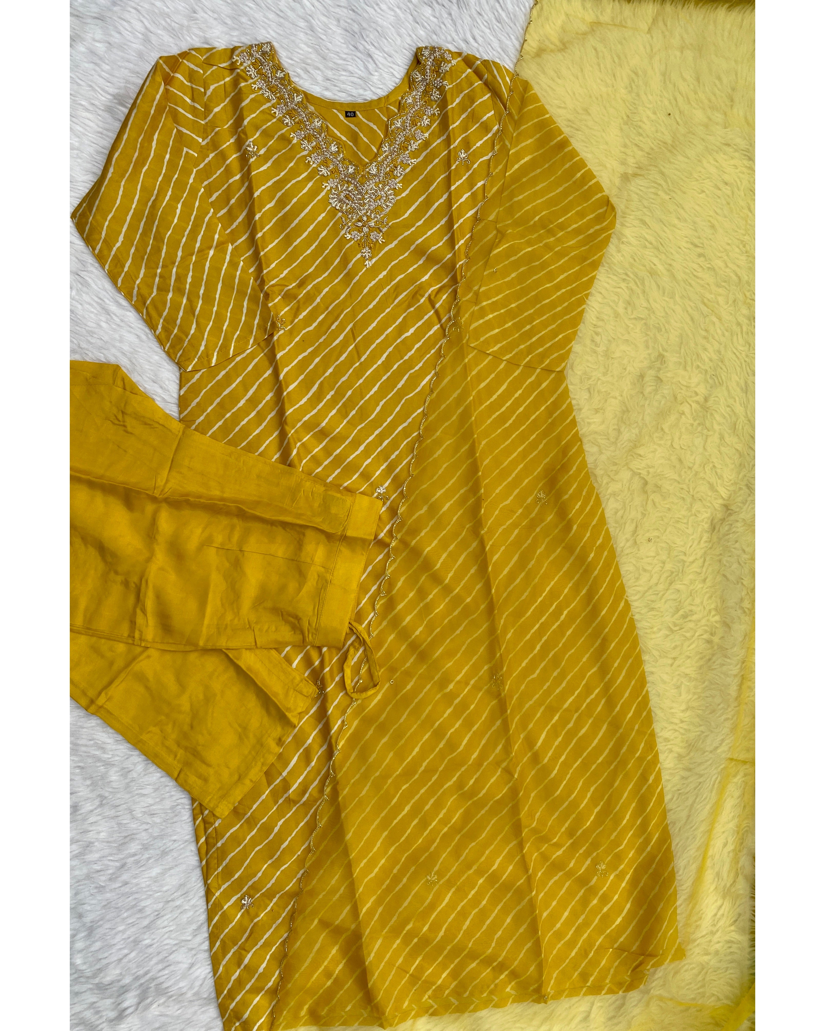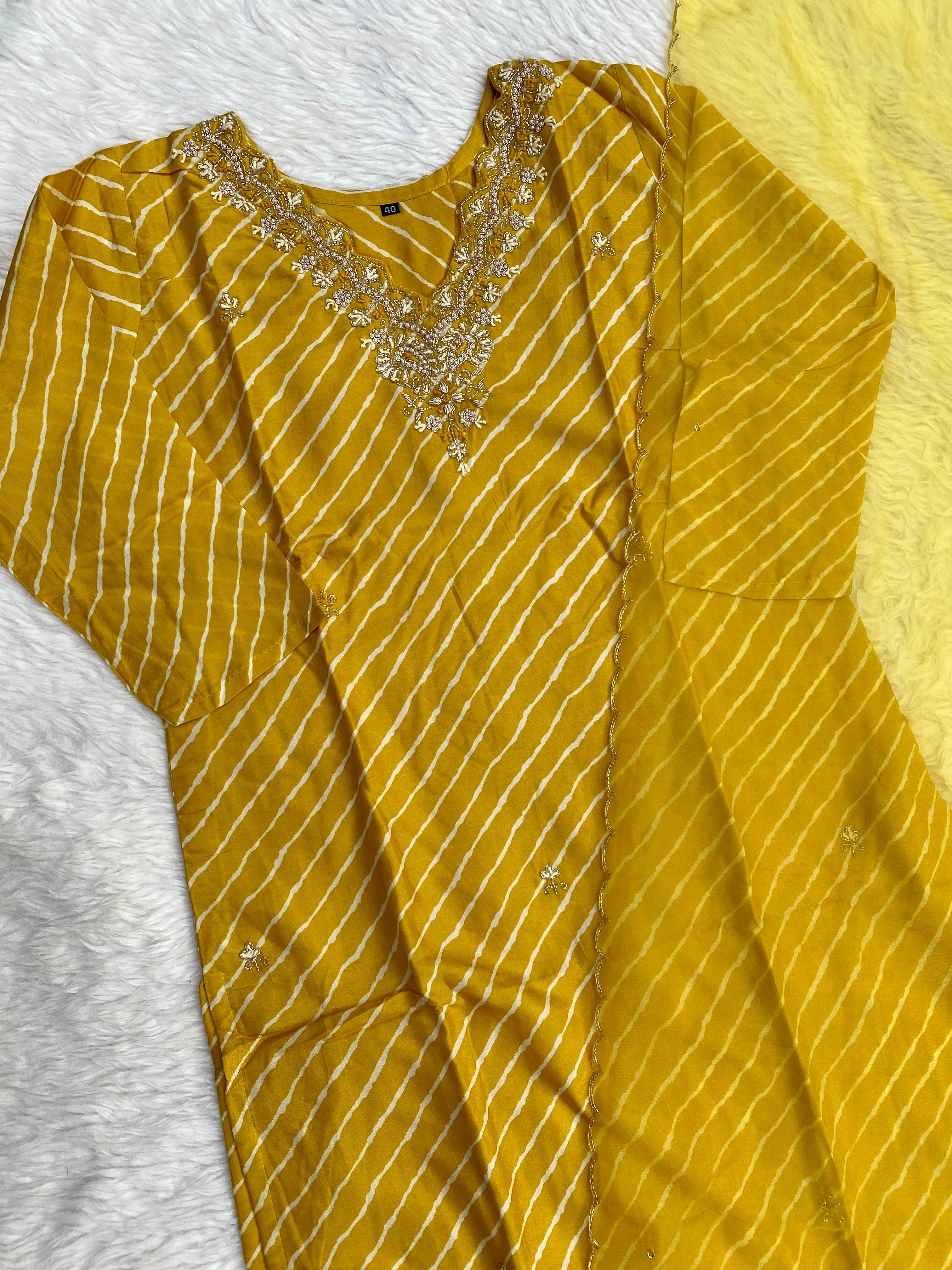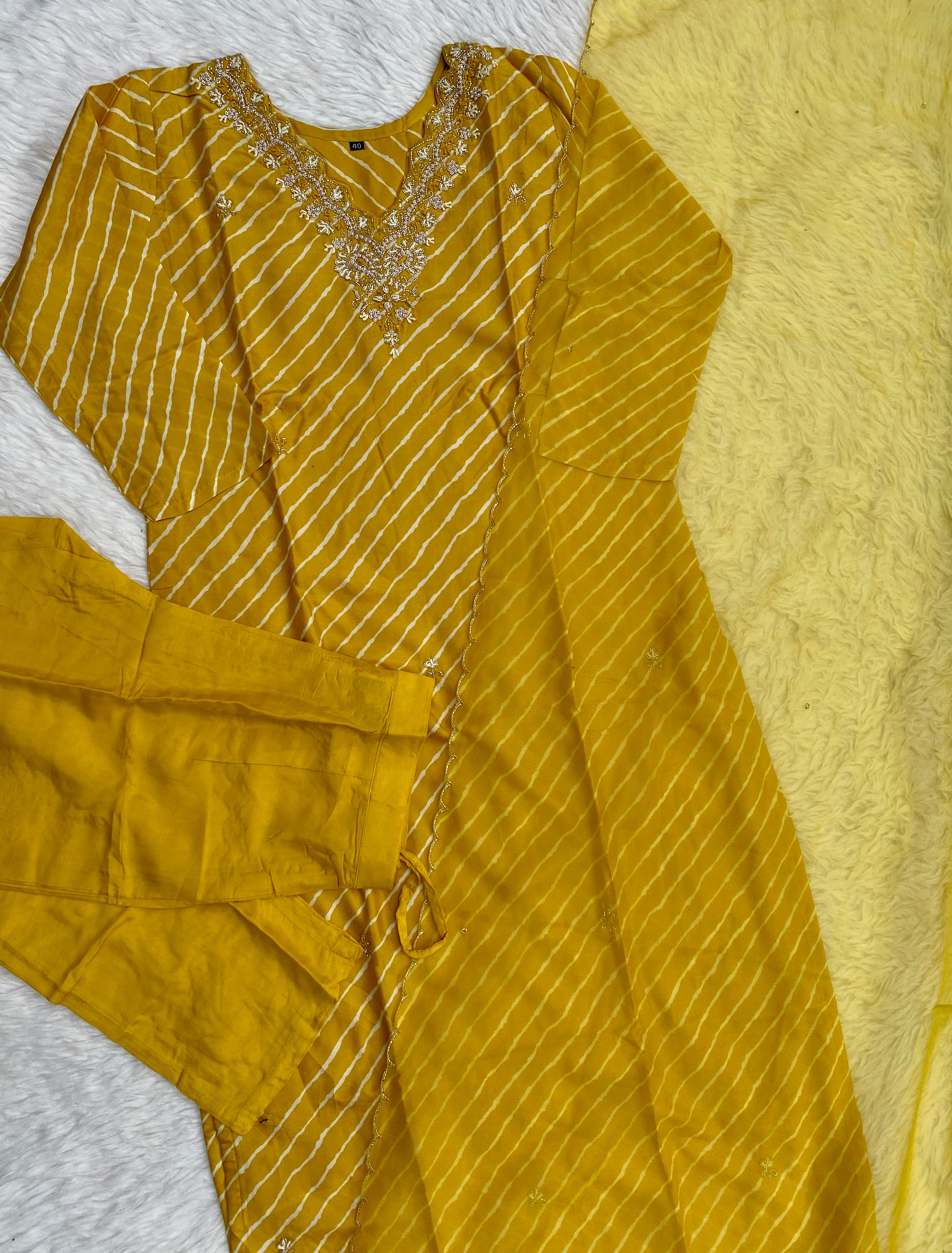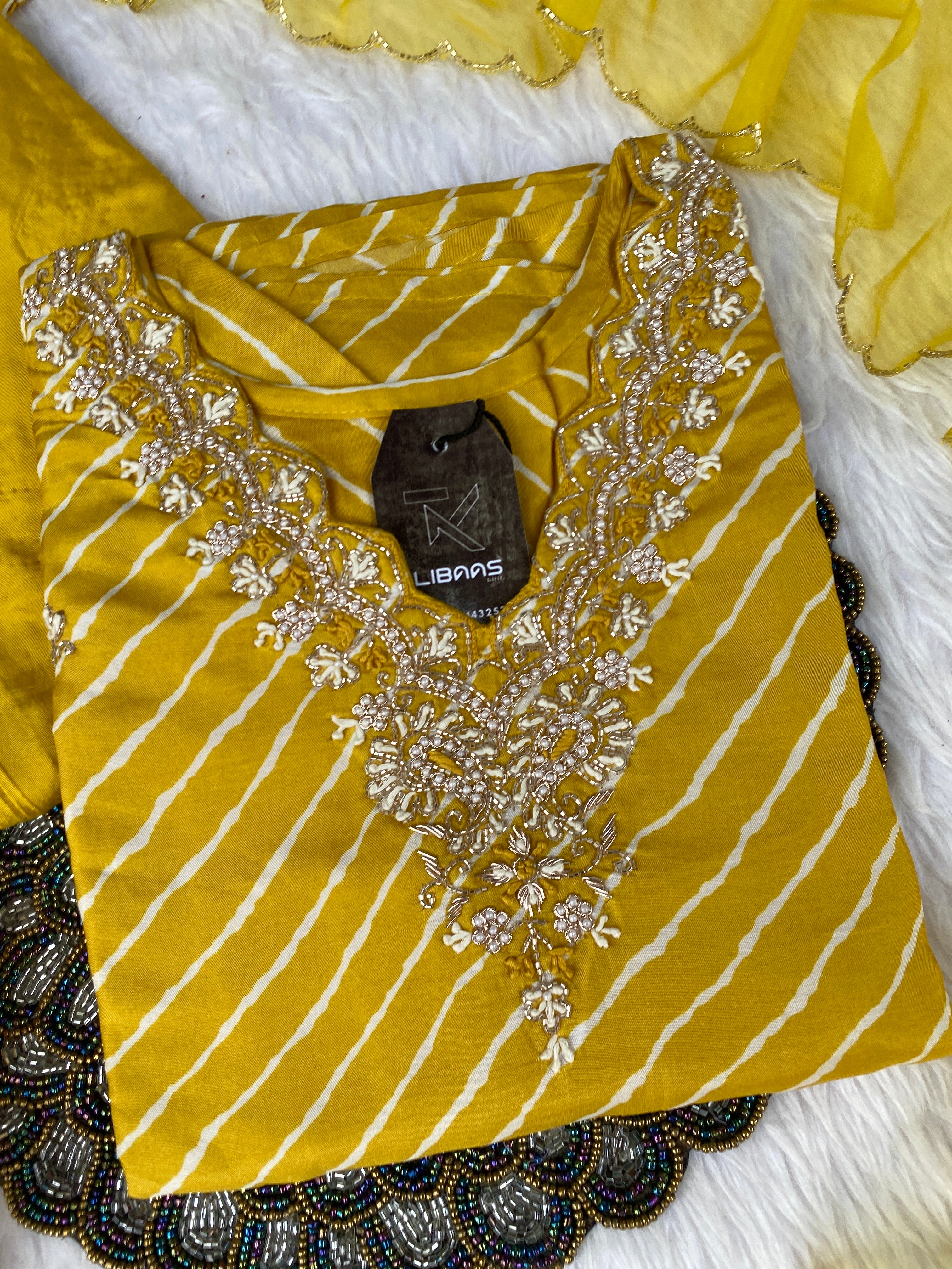 Bandhni printed dola silk set with handwork of the yoke of the kurta with Tissue oraganza scalping dupatta with a plane silk bottom