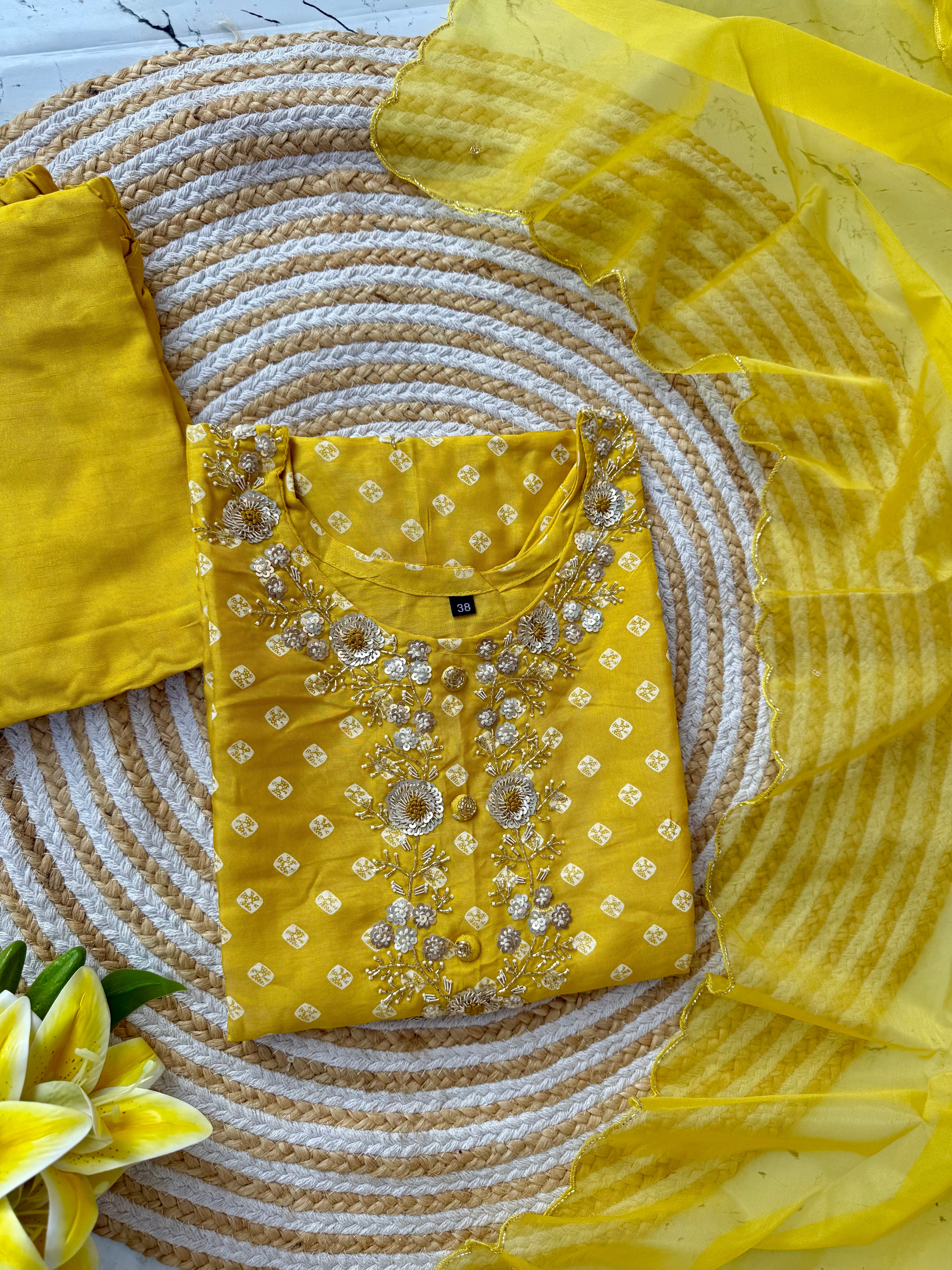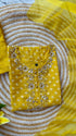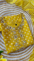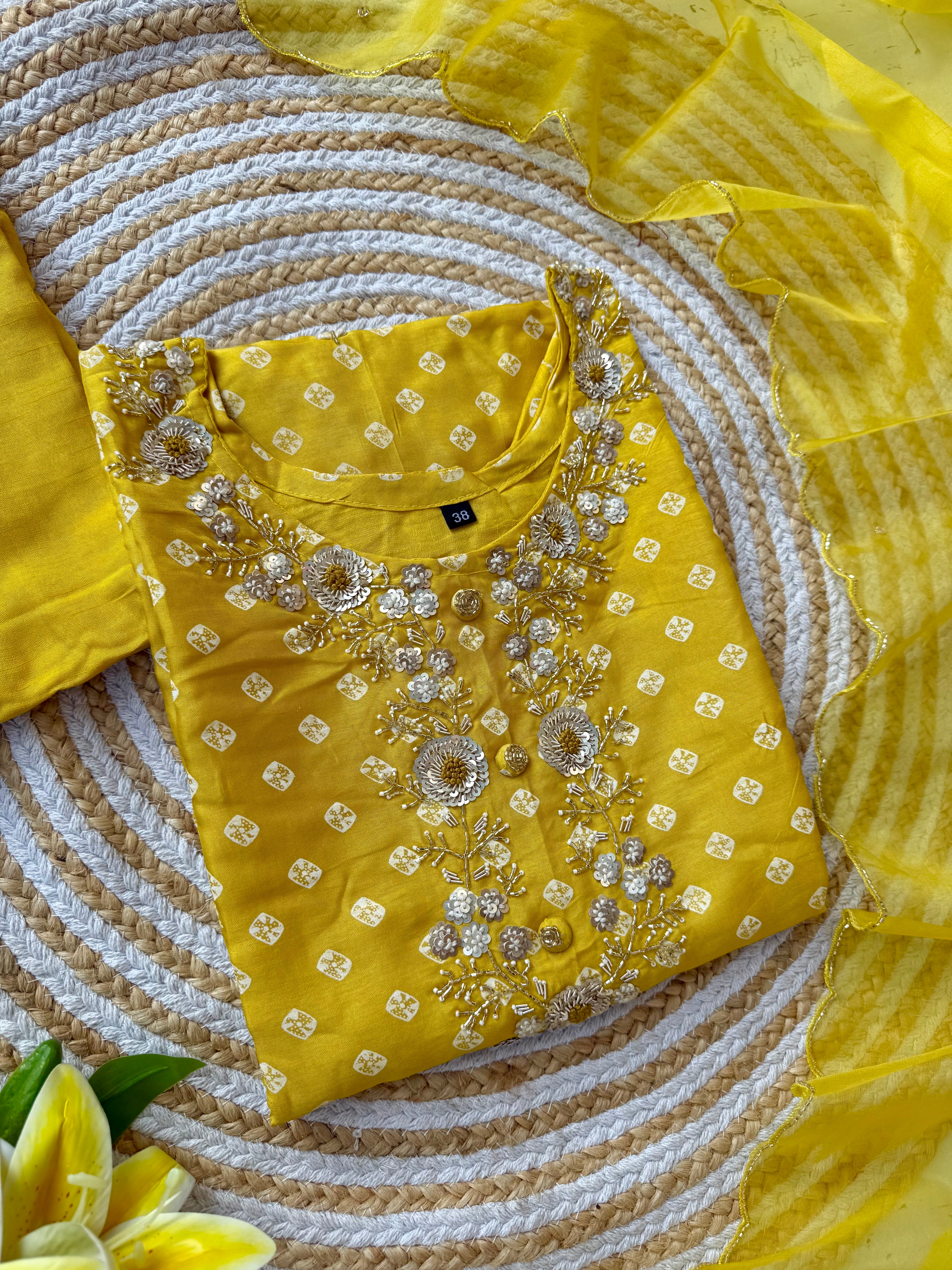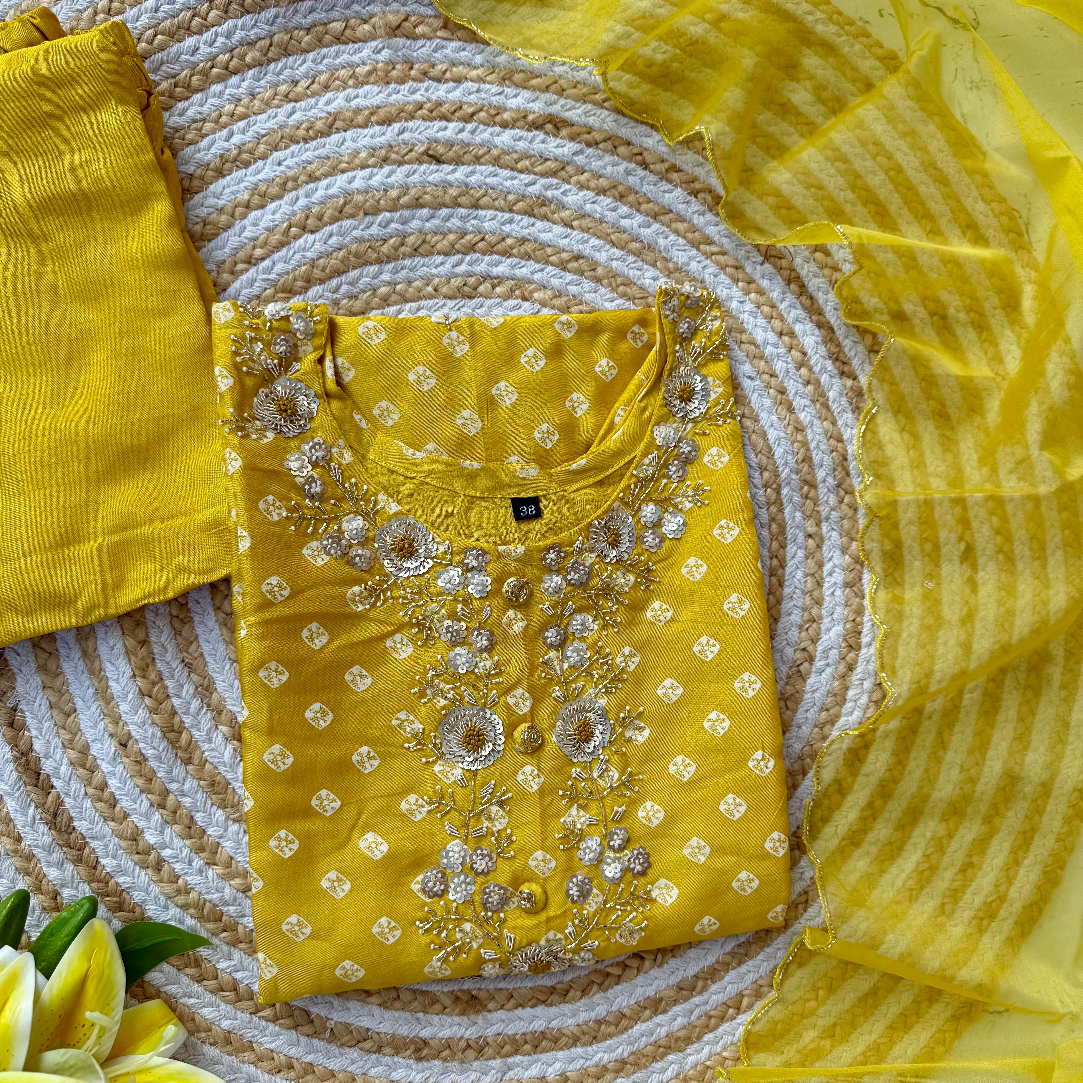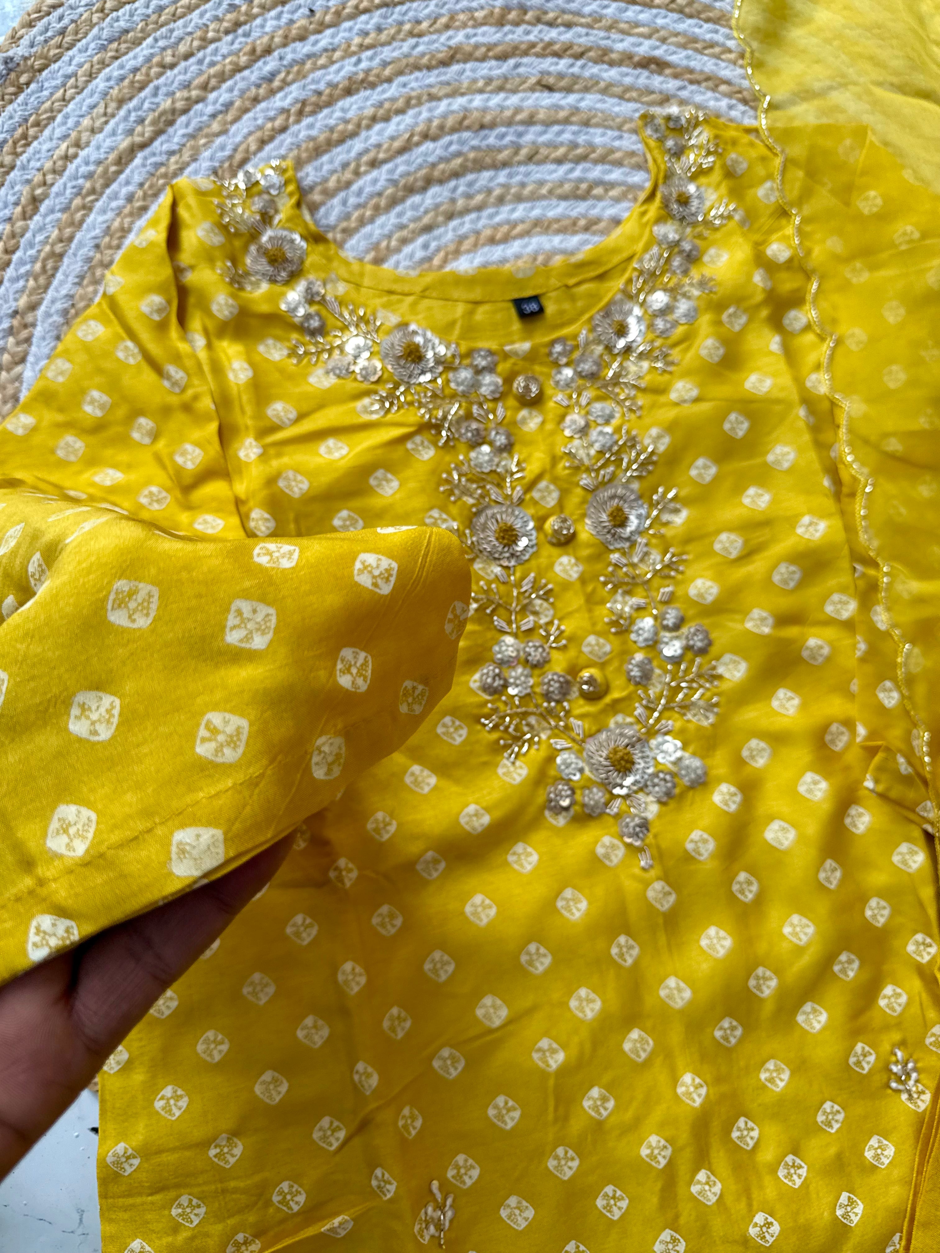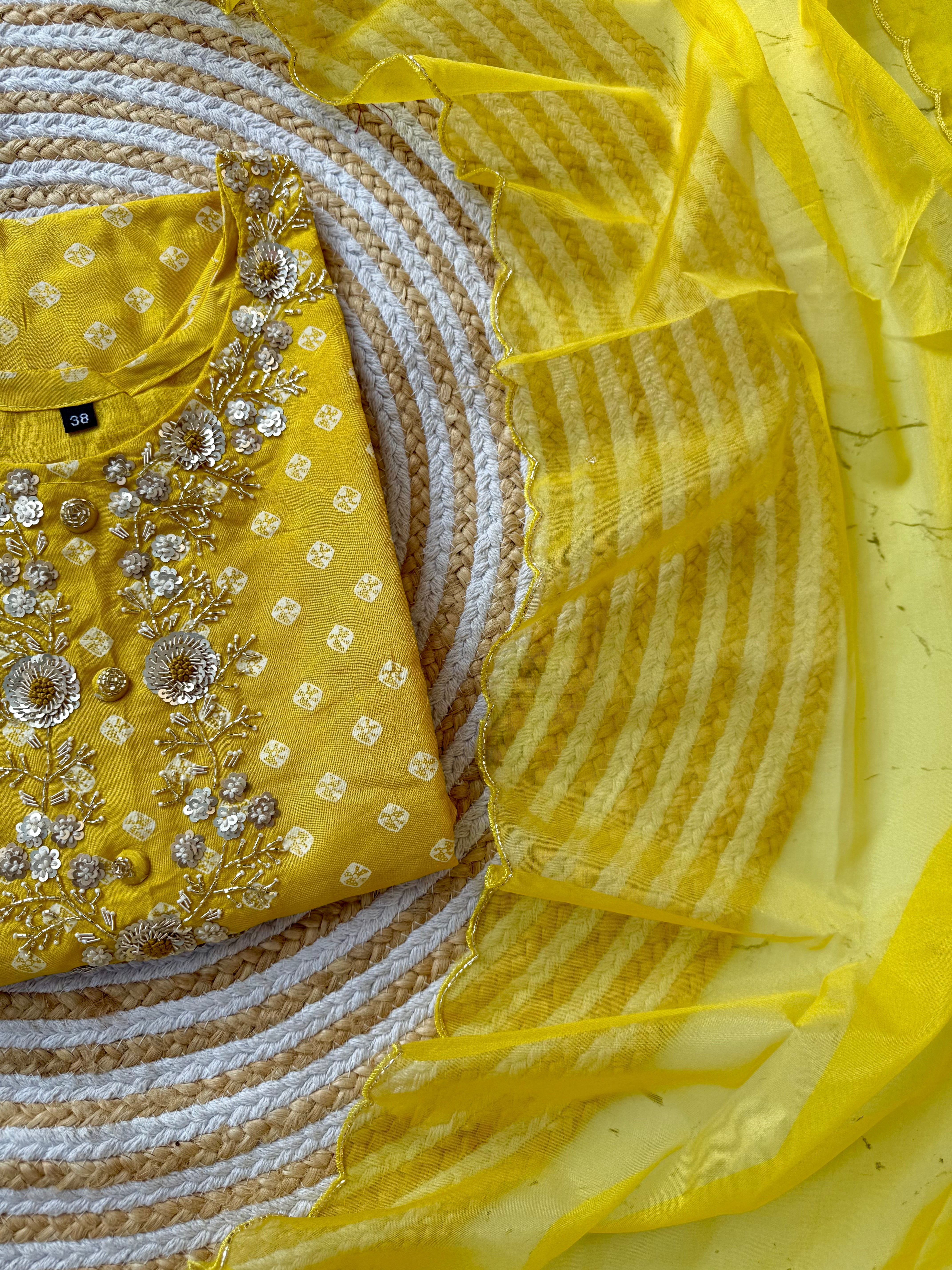‘’ BHANDEJ” Beautiful yellow shade bhandej dola silk set