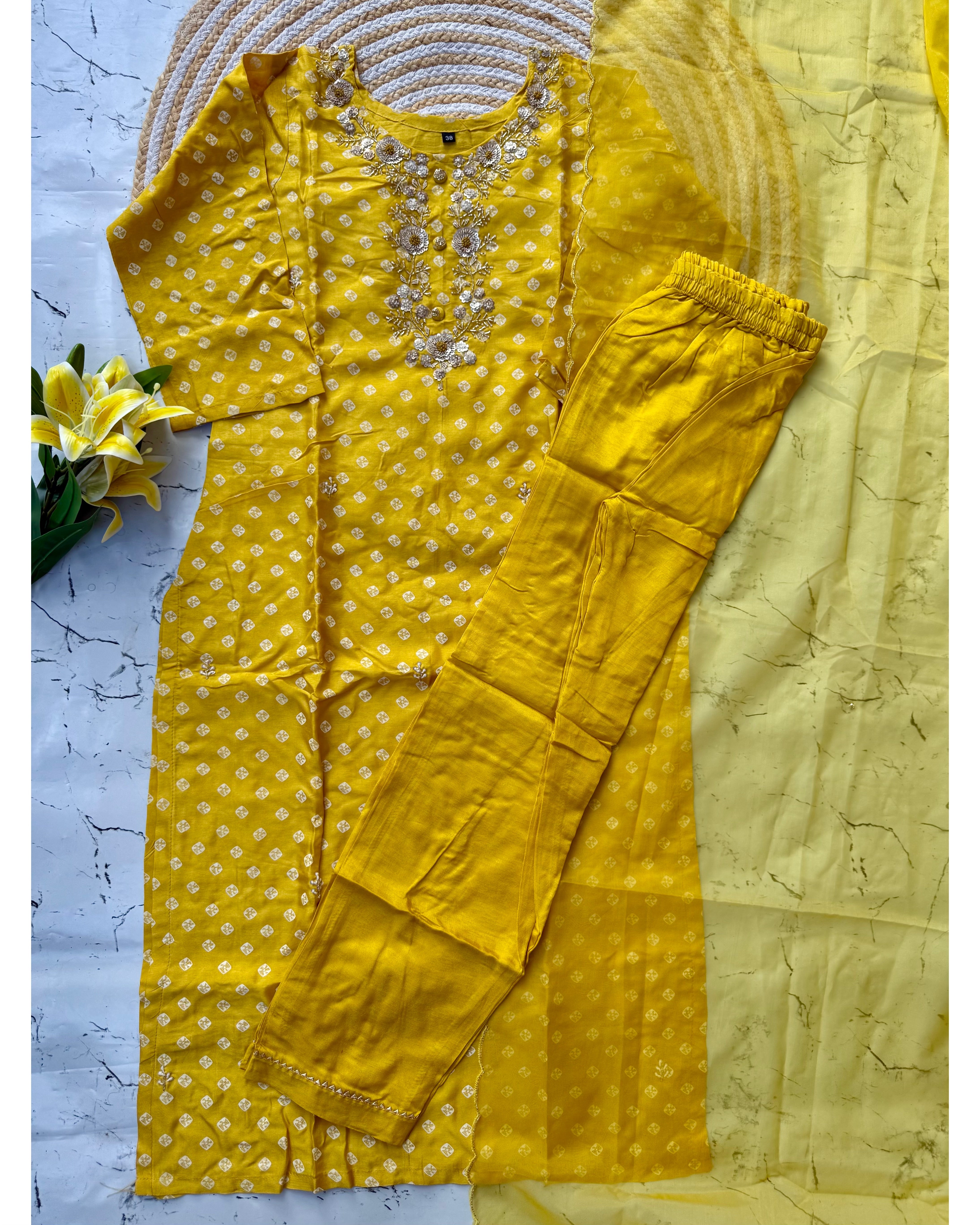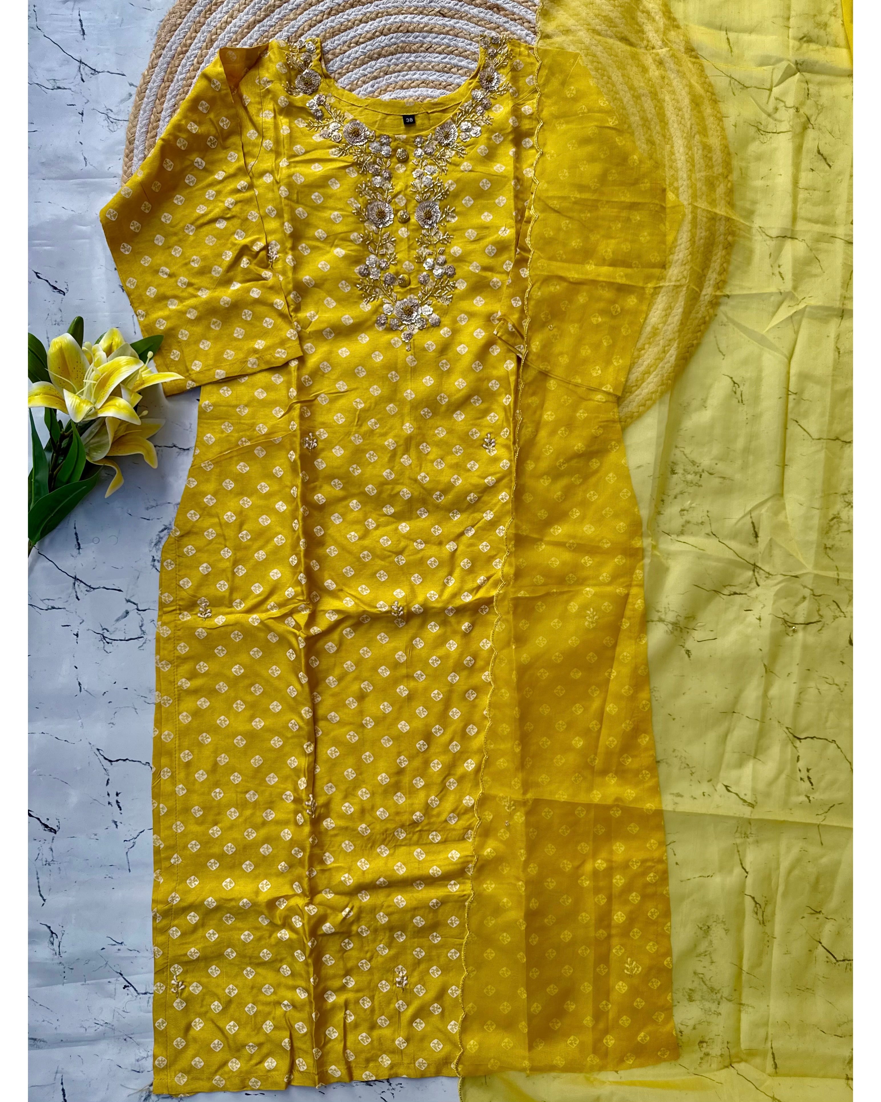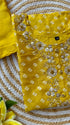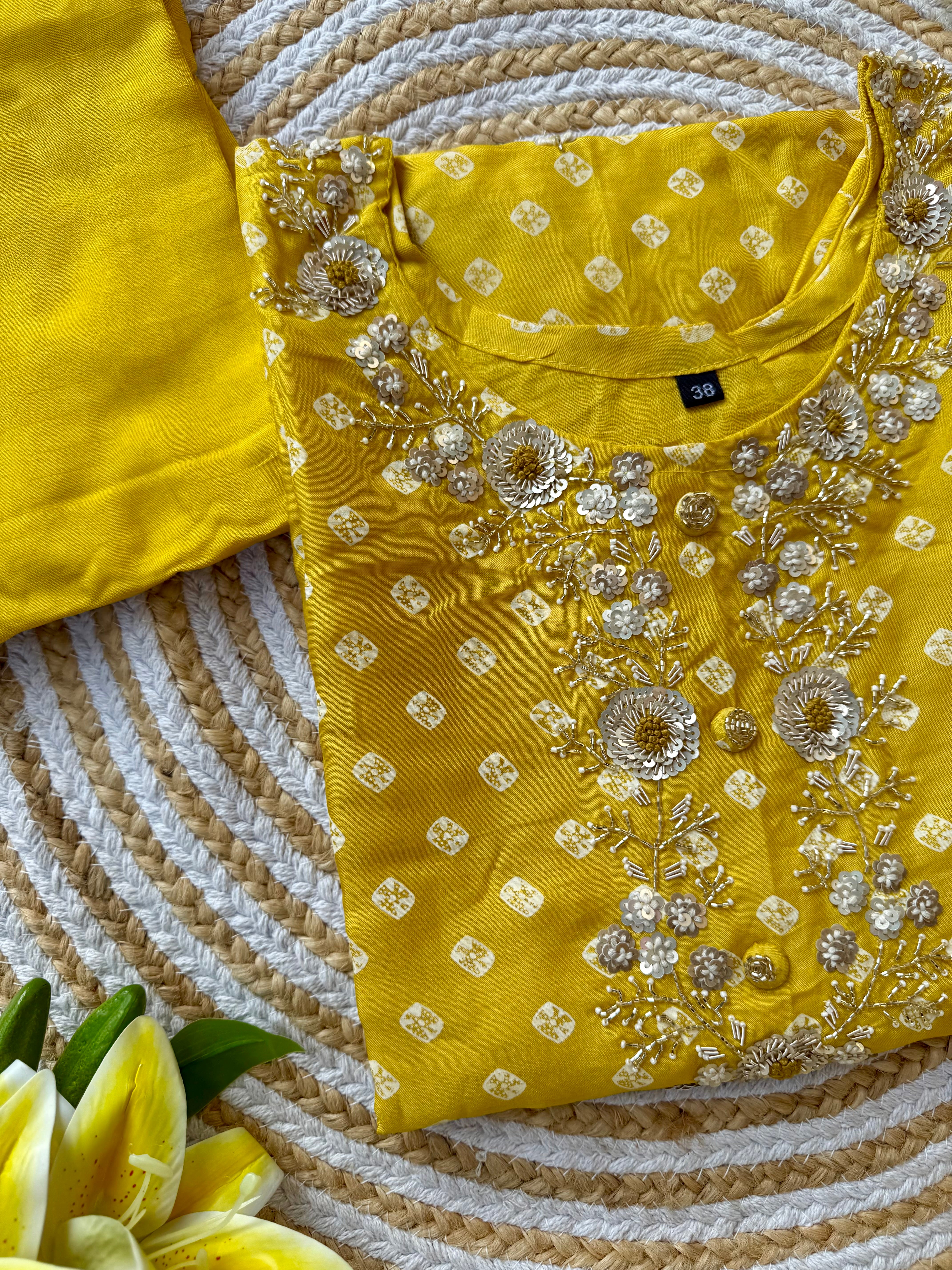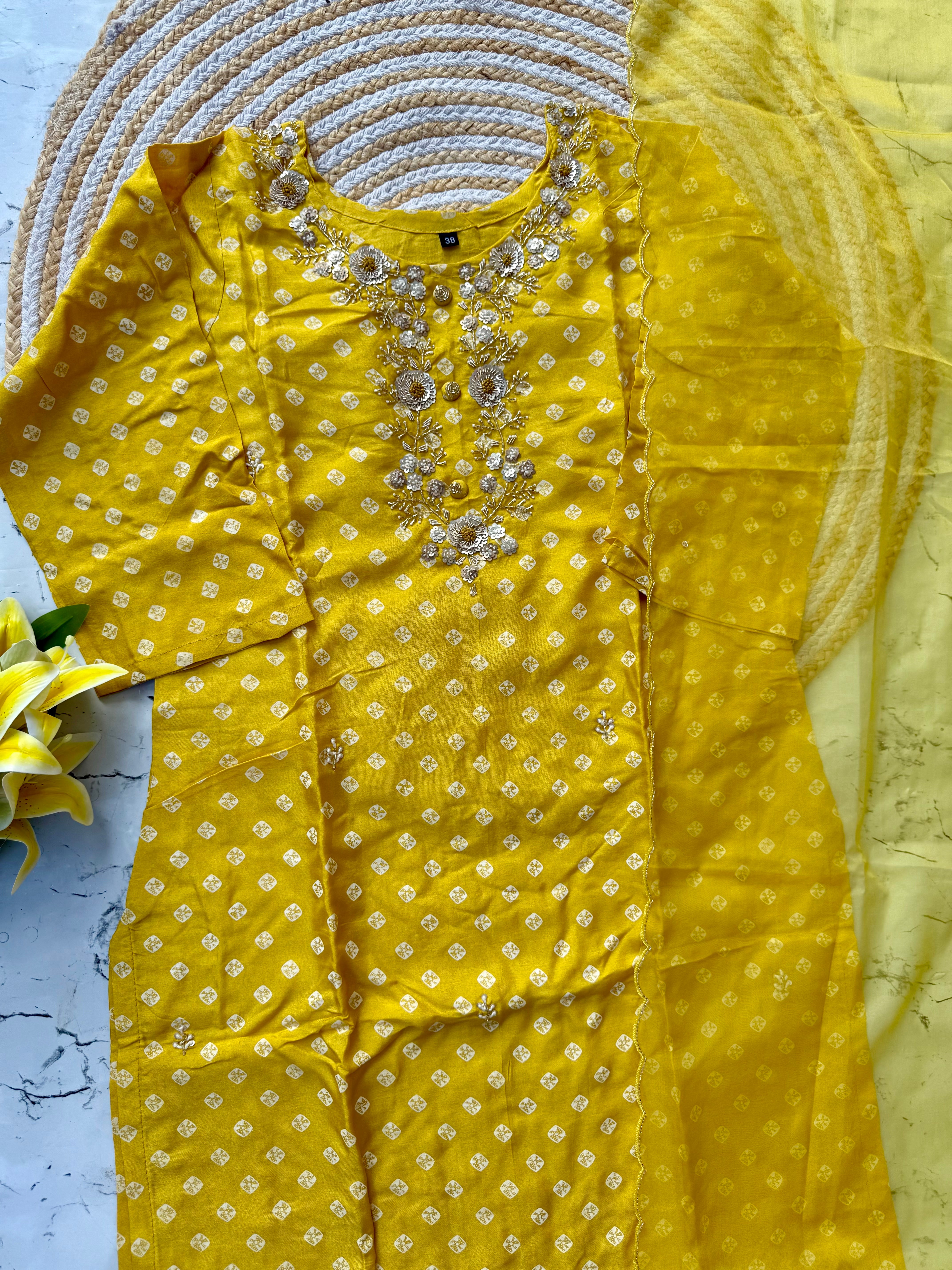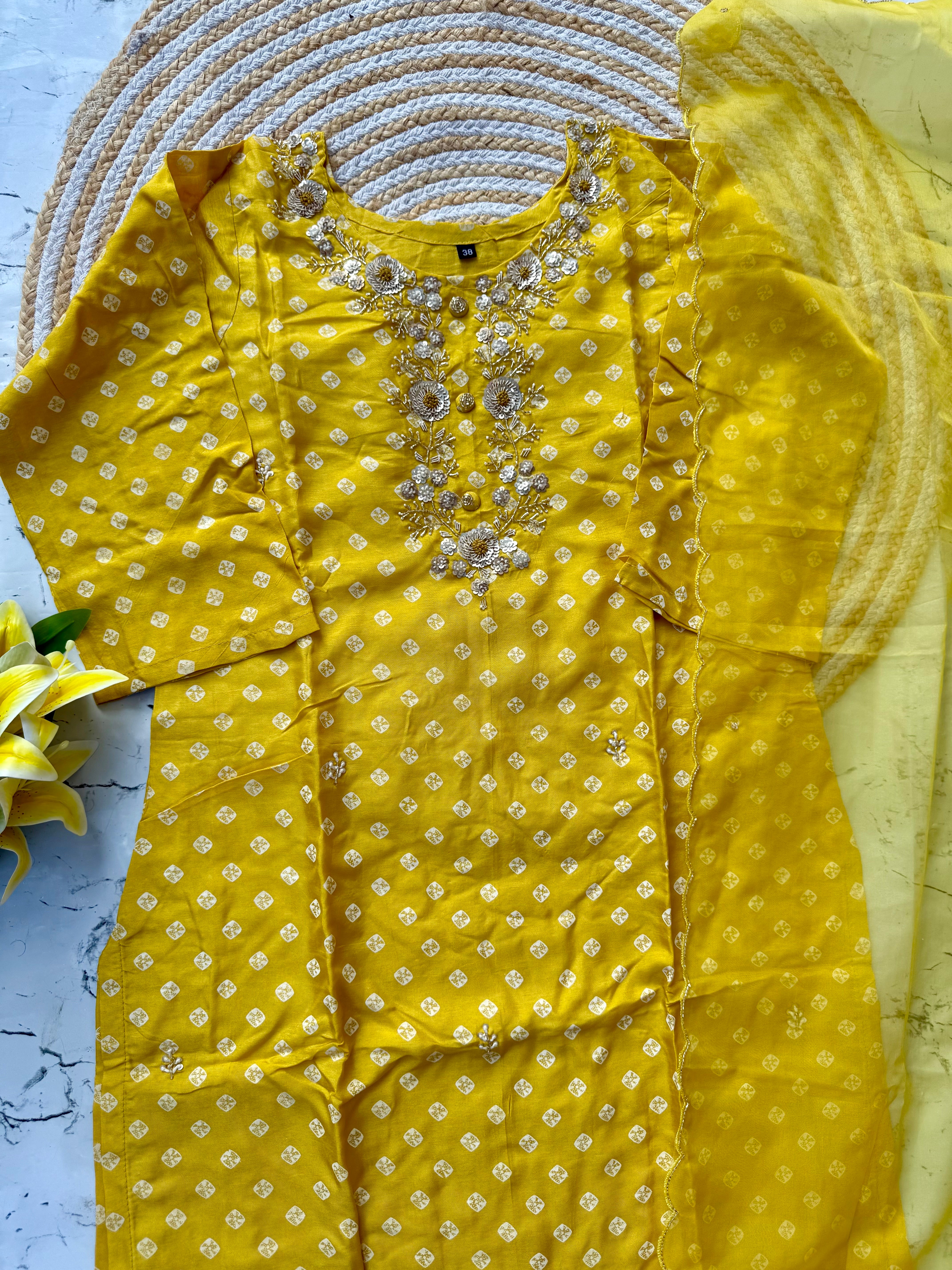 ‘’ BHANDEJ” Beautiful yellow shade bhandej dola silk set