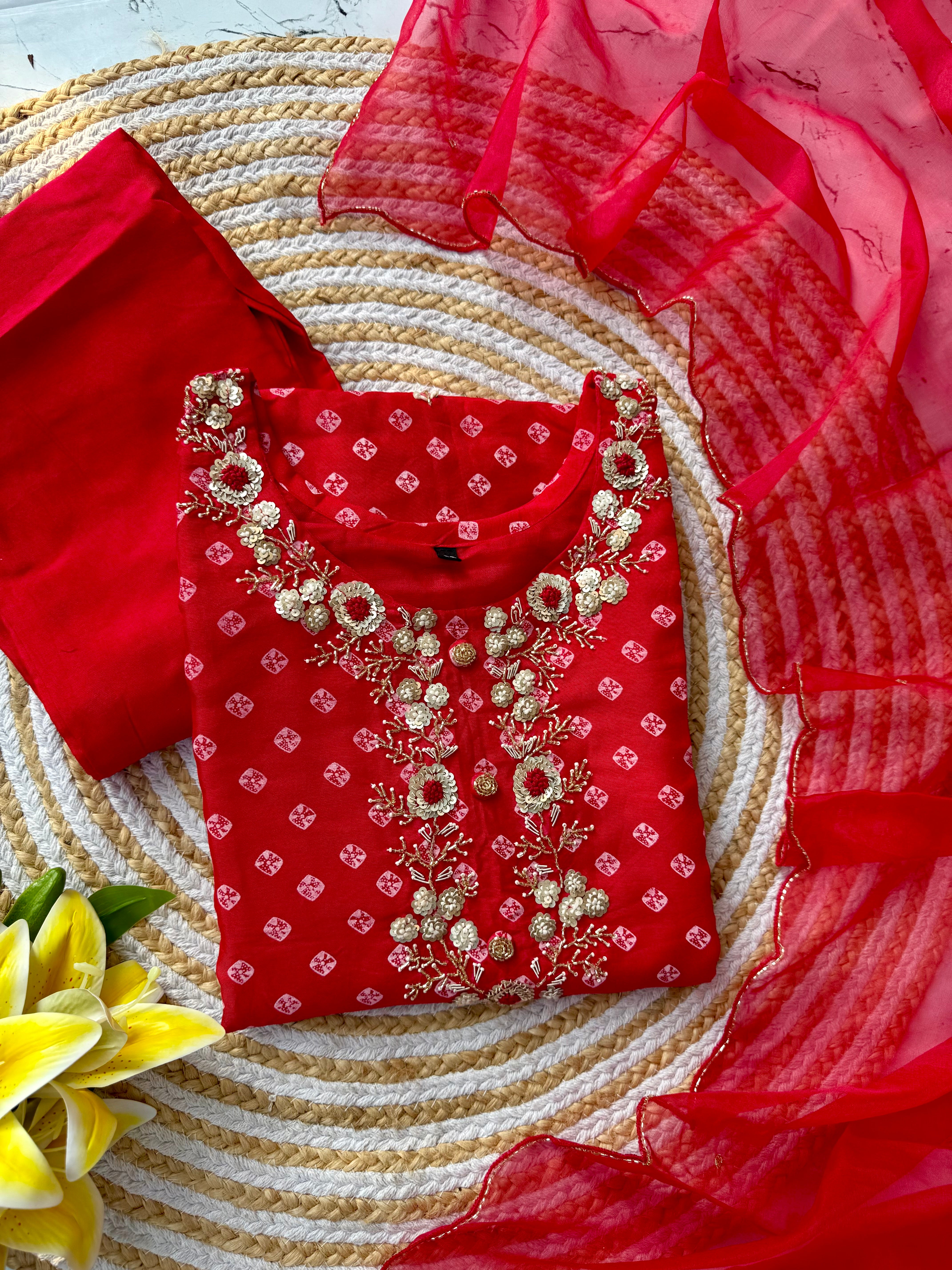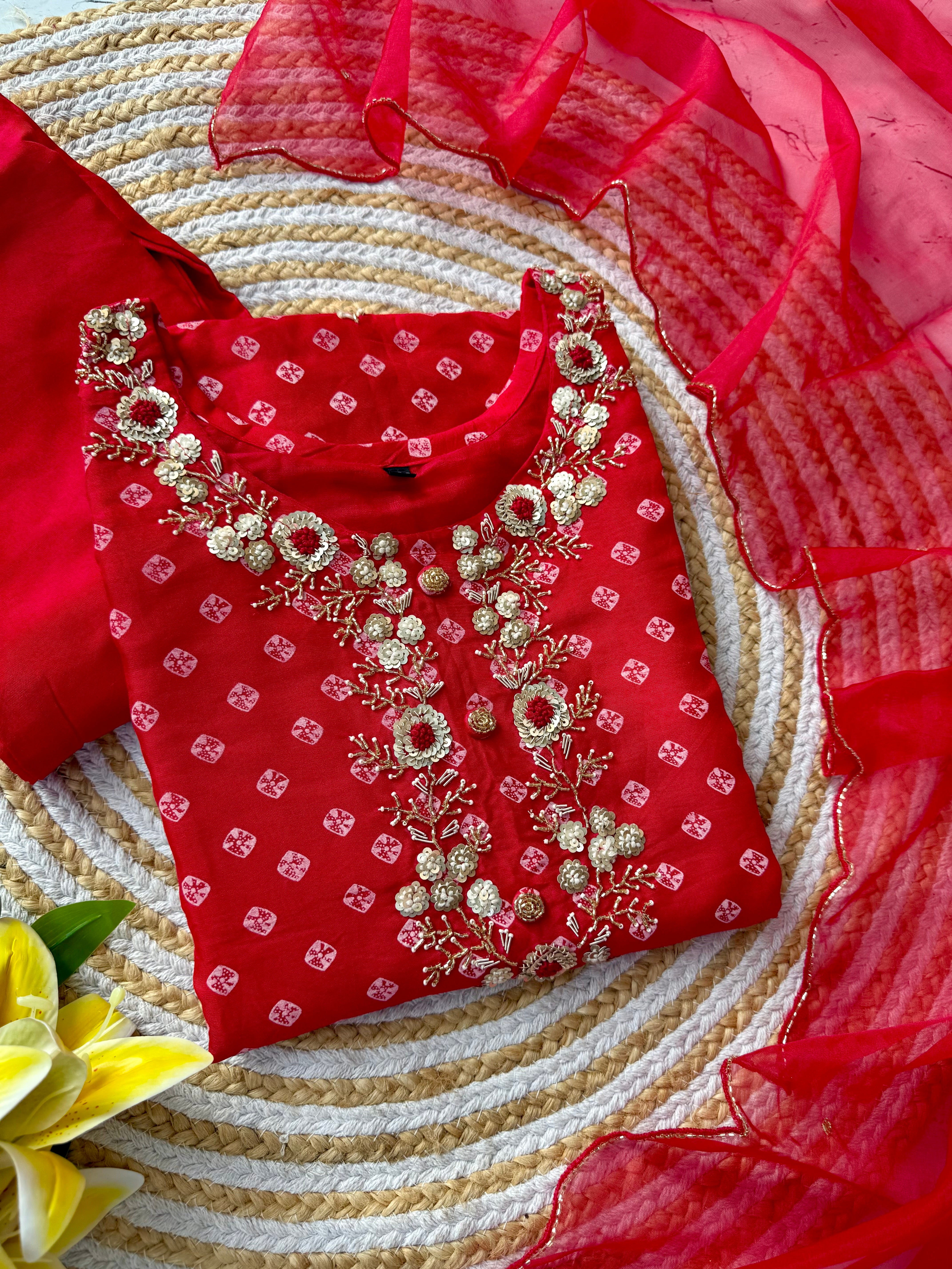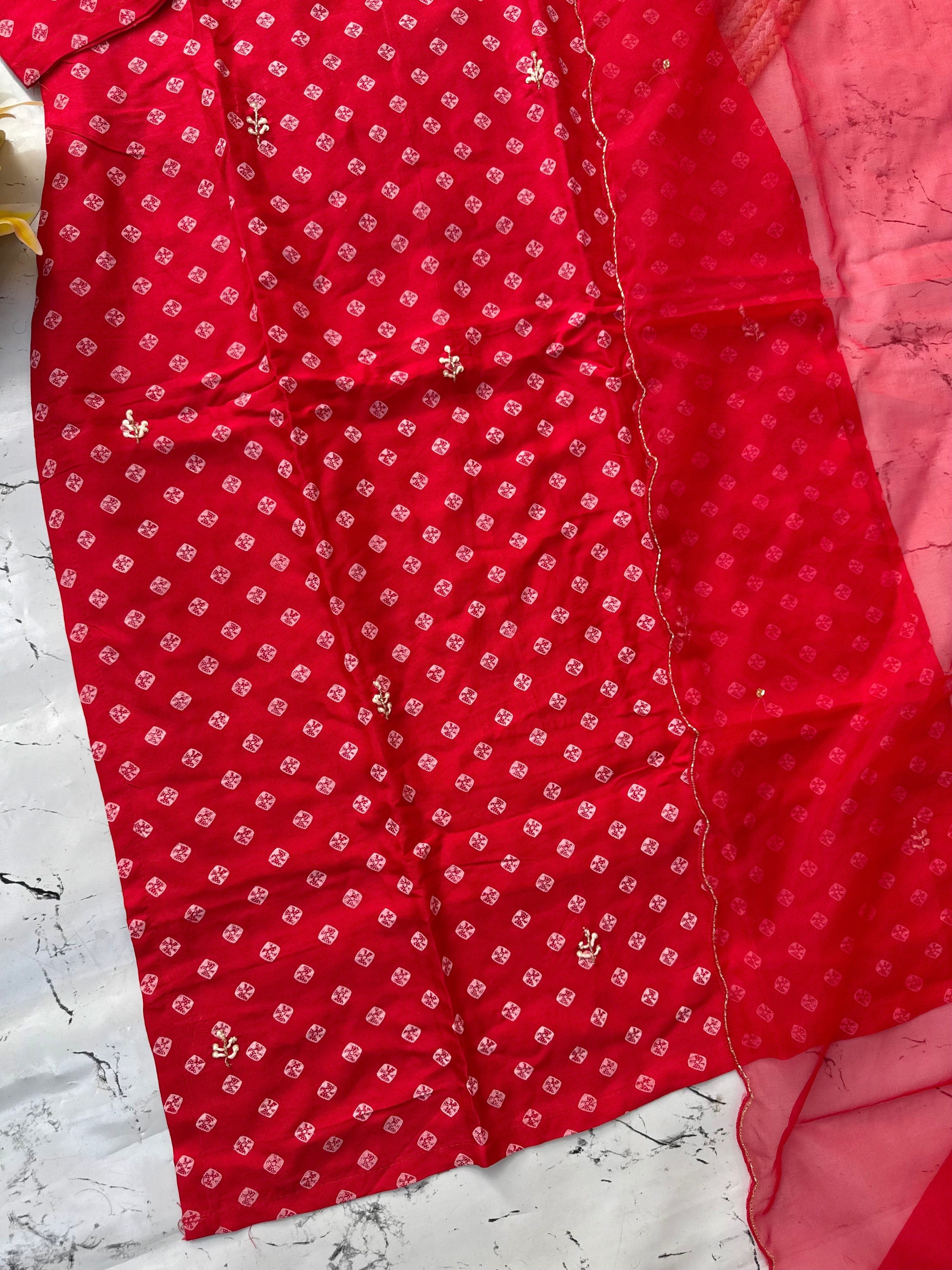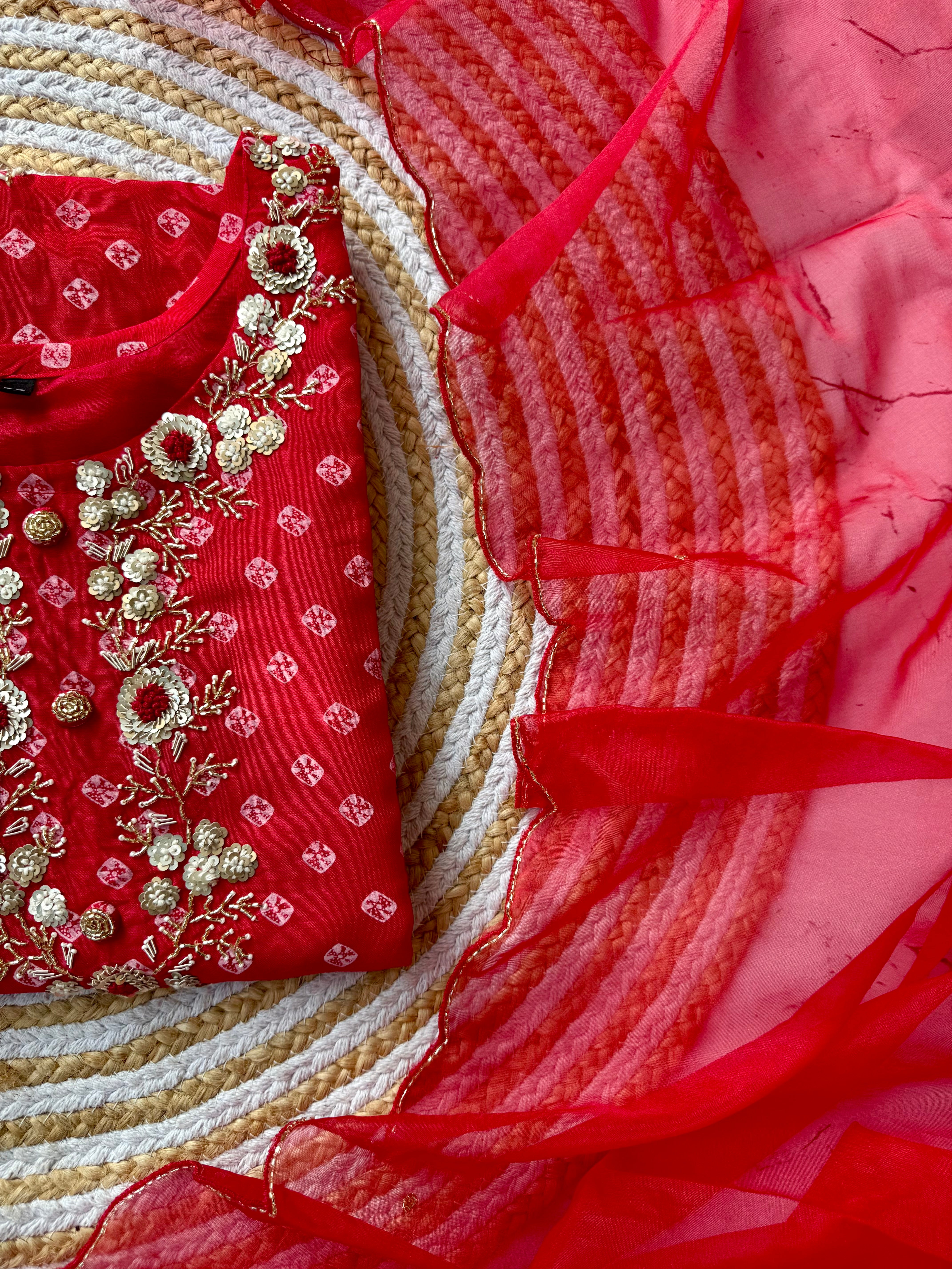Beautiful red shade bhandej dola silk set with handwork on the neck line using sequence, zari and real work with a long soft organza dupatta with Cutdana scallope and a dola silk bottom