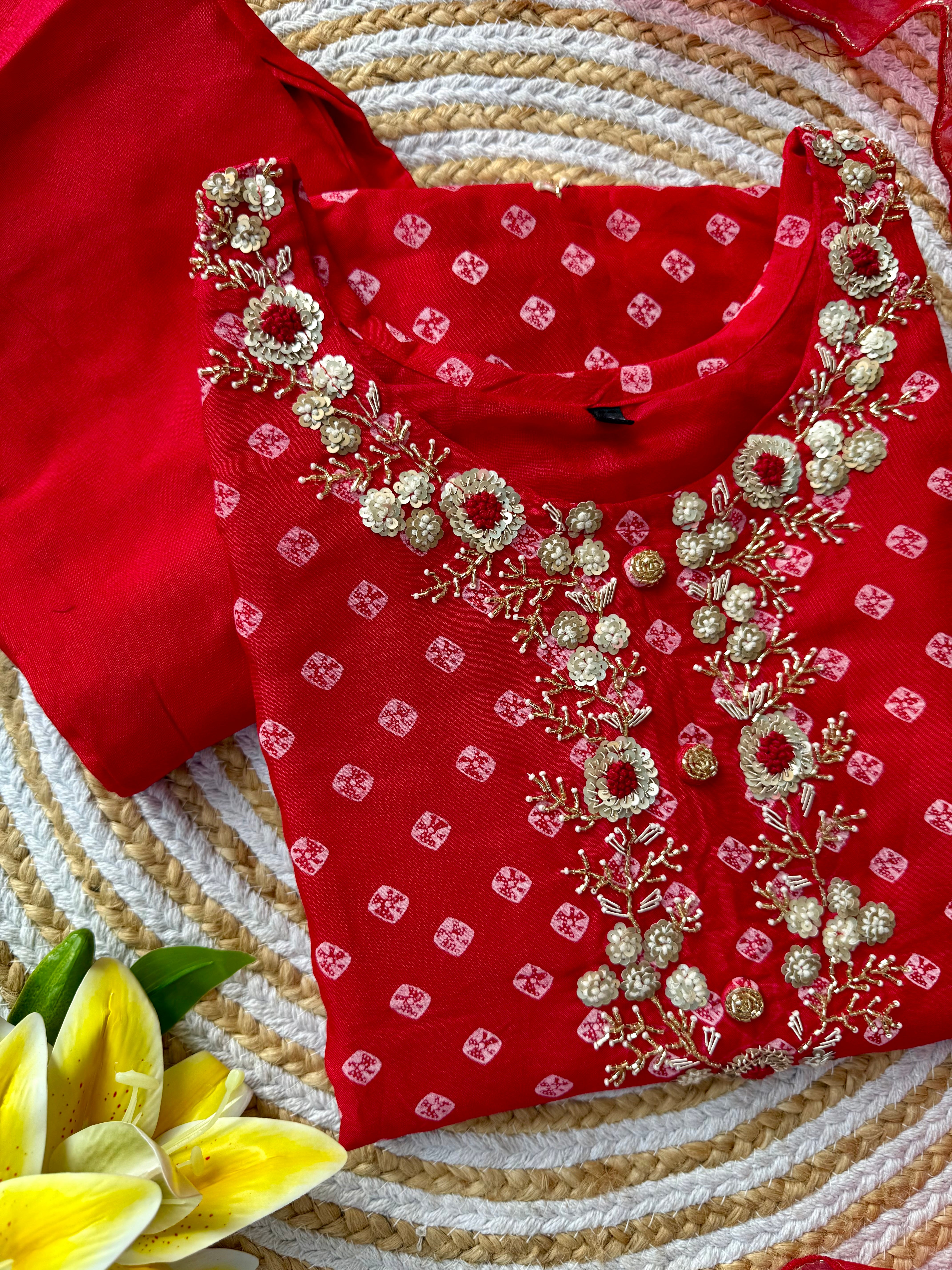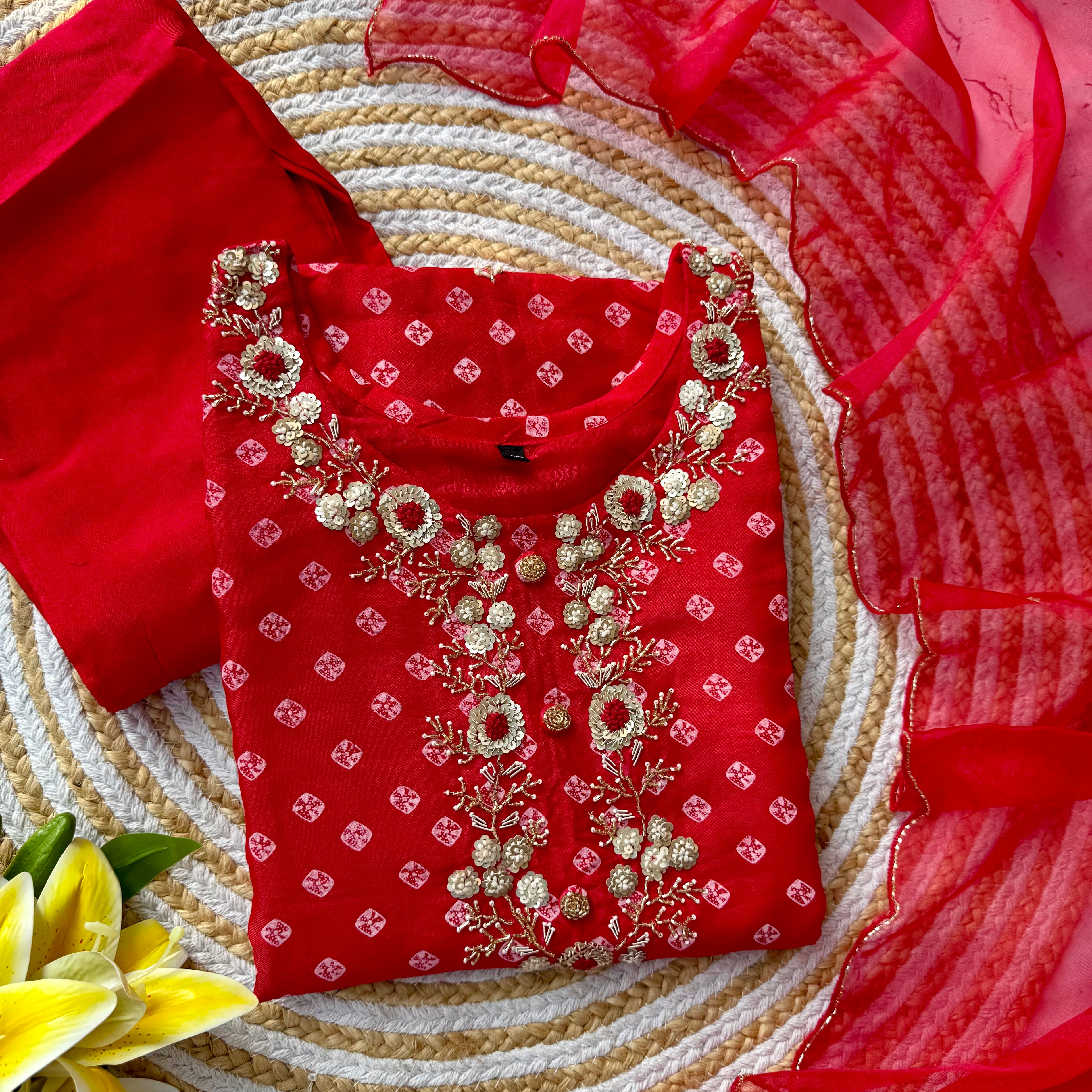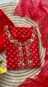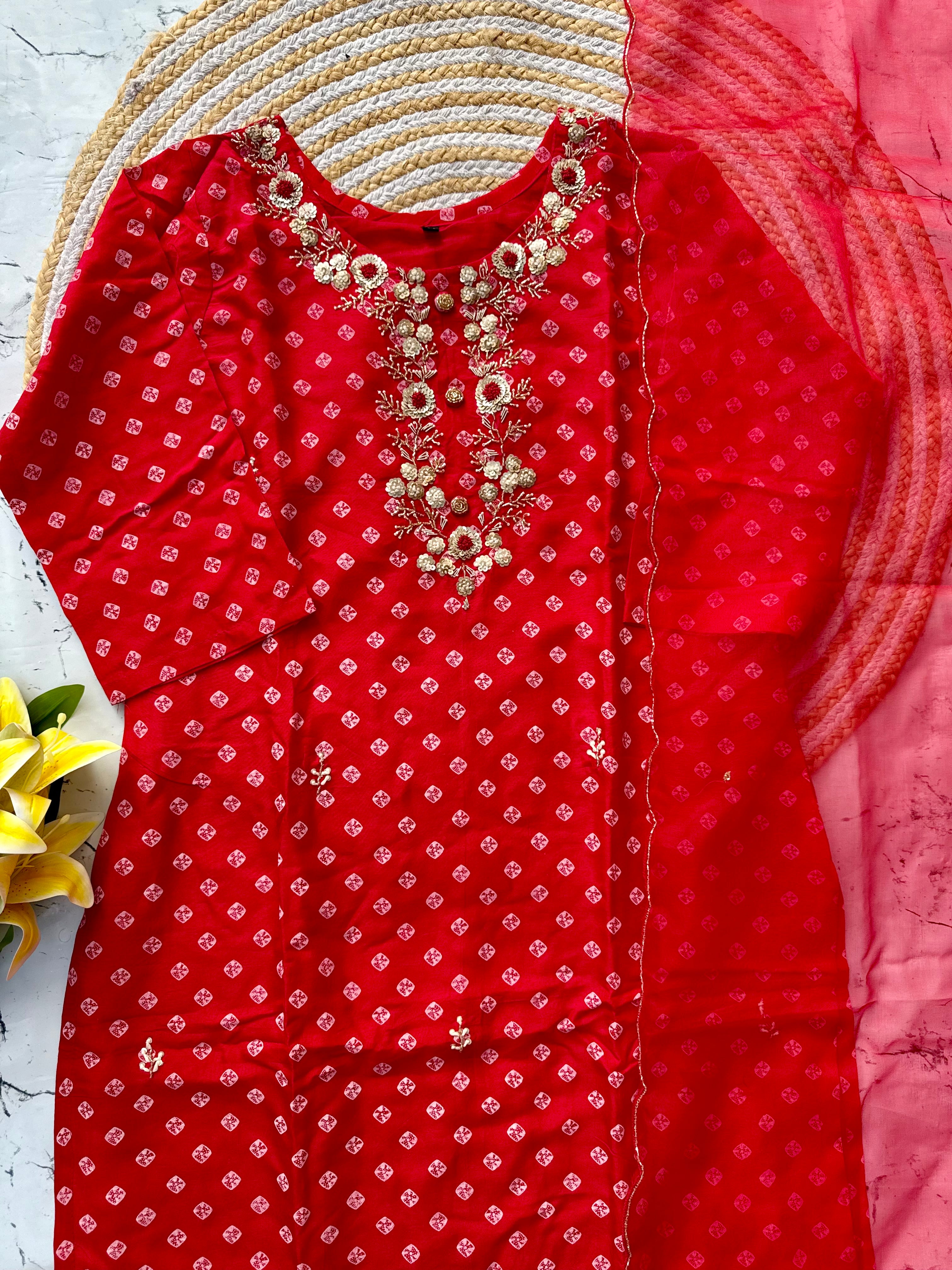 Beautiful red shade bhandej dola silk set with handwork on the neck line using sequence, zari and real work with a long soft organza dupatta with Cutdana scallope and a dola silk bottom