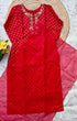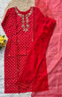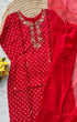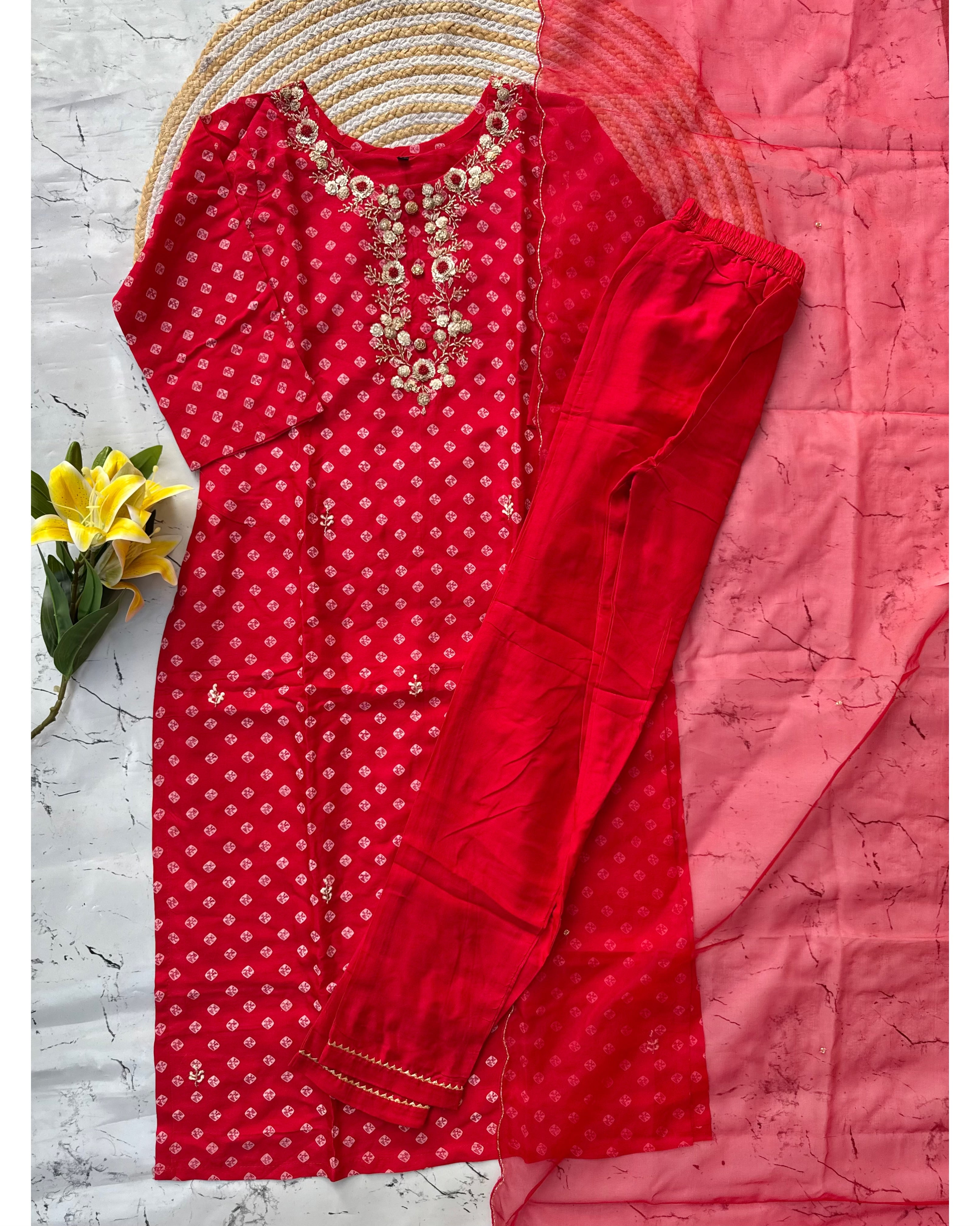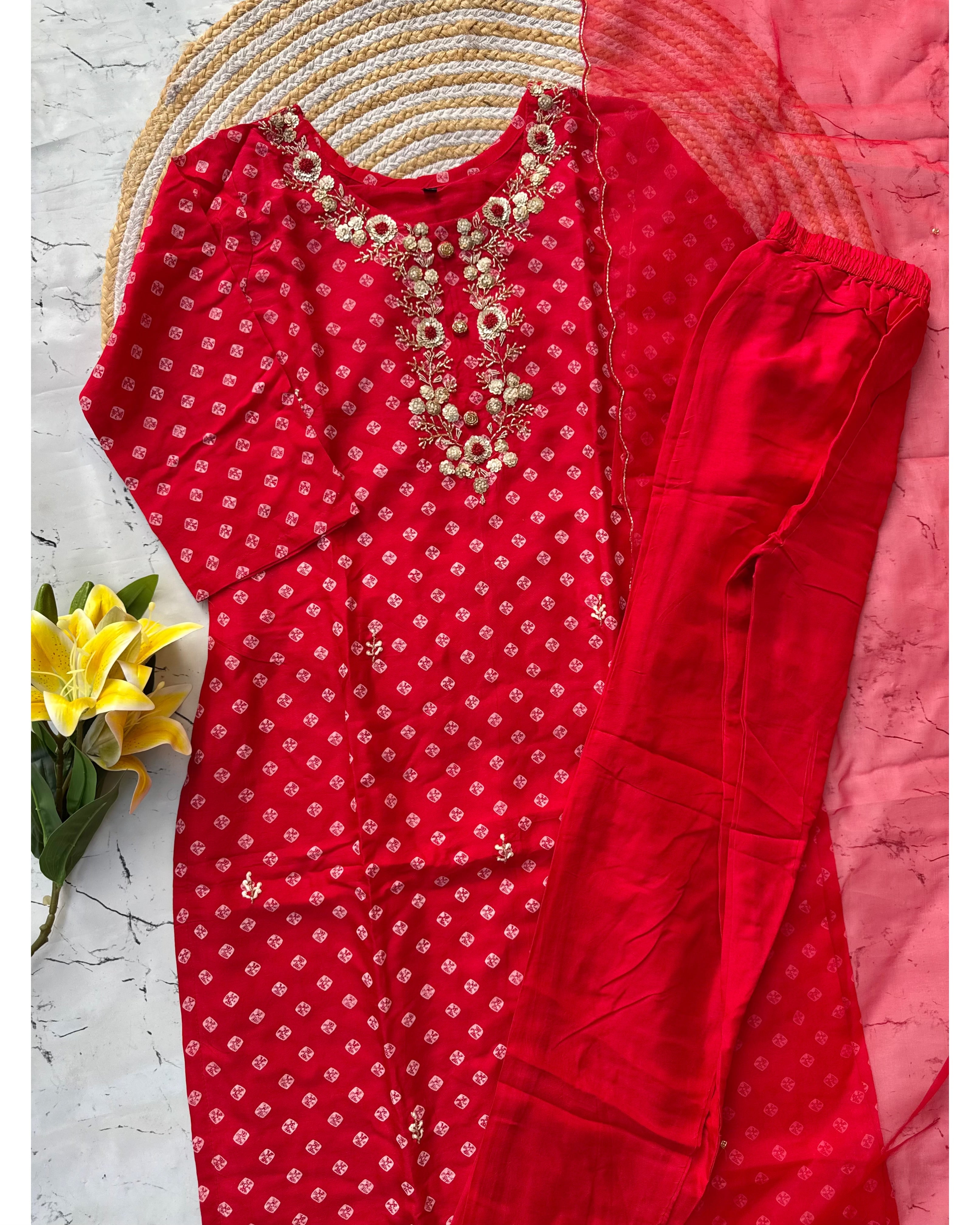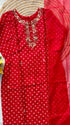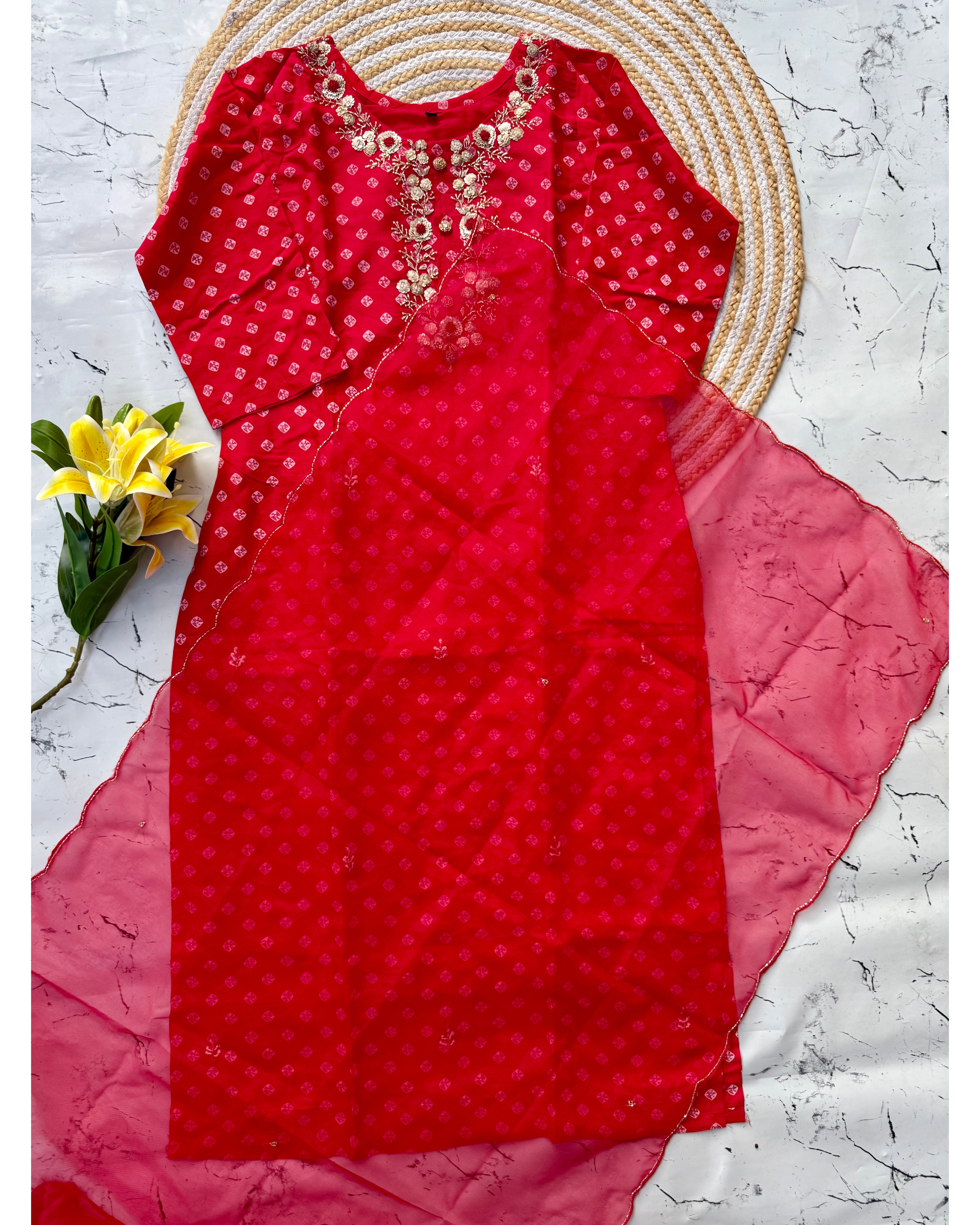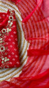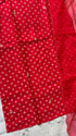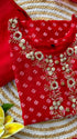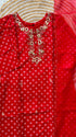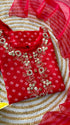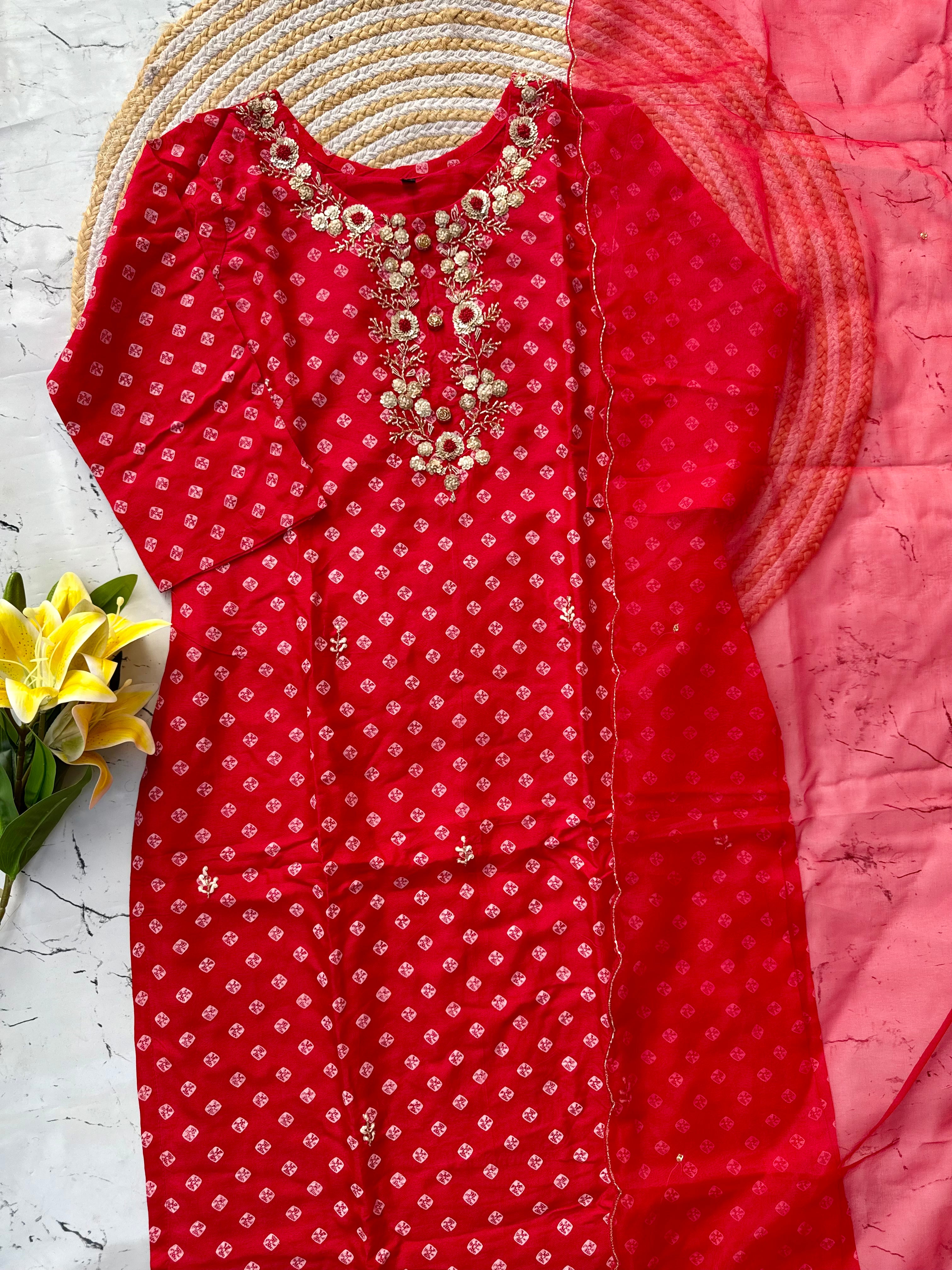 Beautiful red shade bhandej dola silk set with handwork on the neck line using sequence, zari and real work with a long soft organza dupatta with Cutdana scallope and a dola silk bottom
