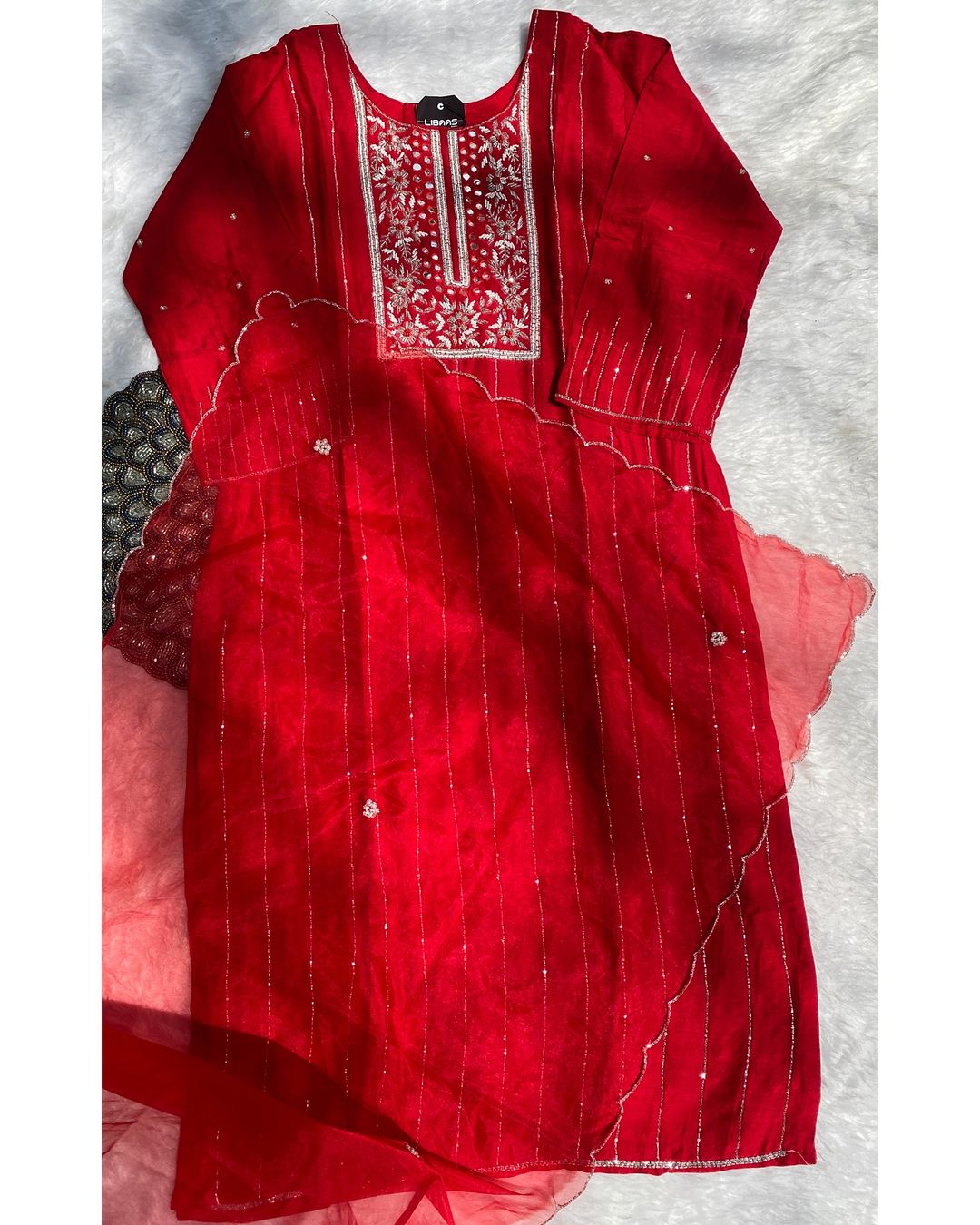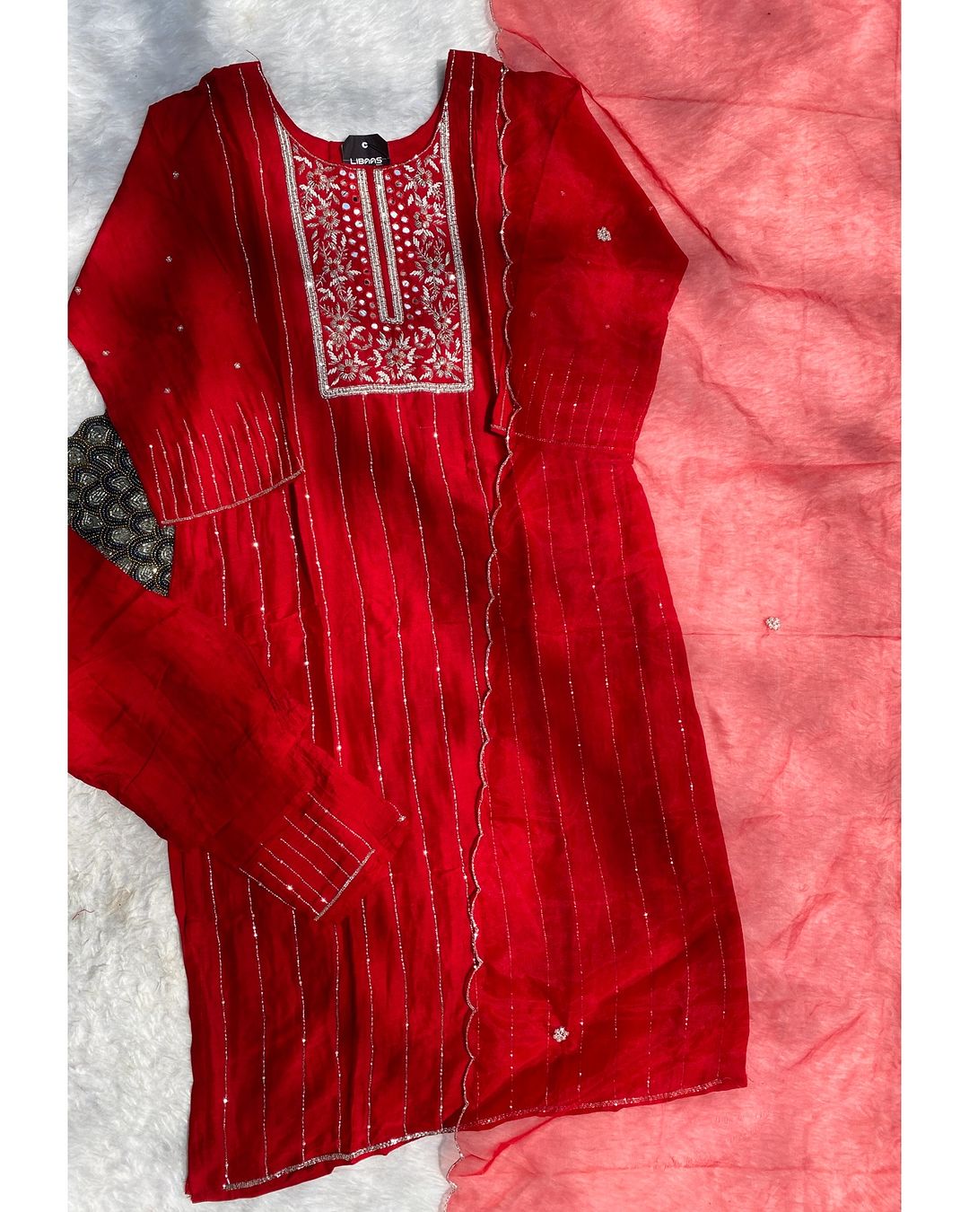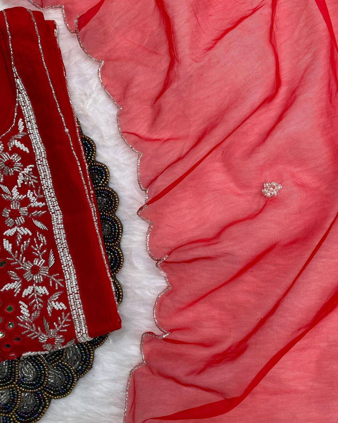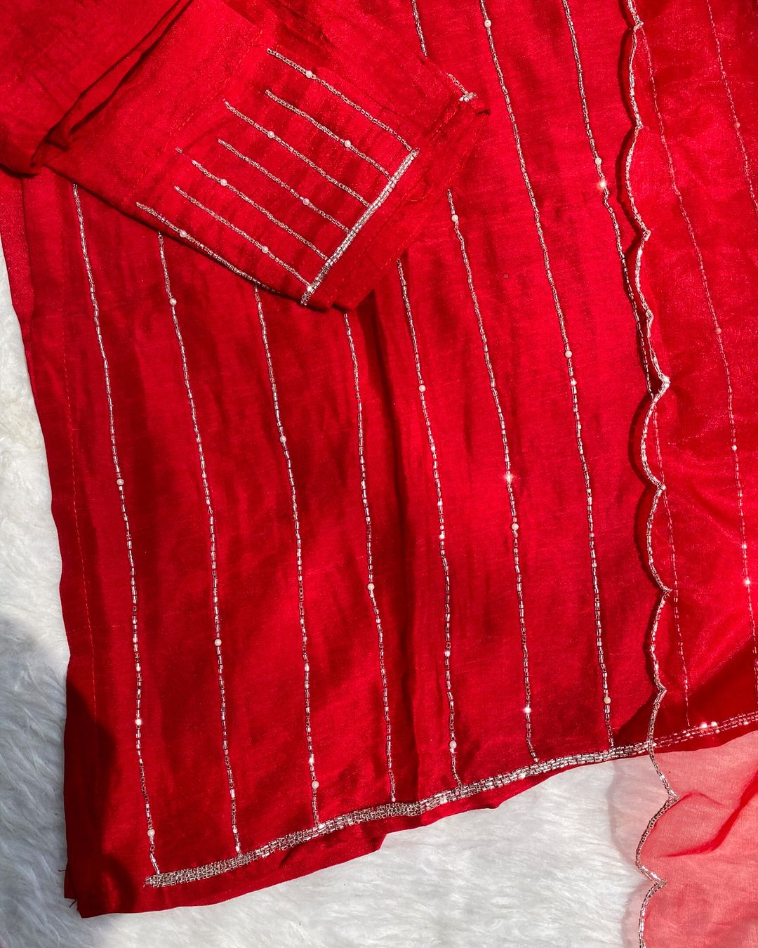 Beautifully handcrafted dola silk set with handwork all over the top using Cutdana and pearl work all over the yoke & sleeve of the kurta with a long organza dupatta with Cutdana scallope and small motives all over the dupatta paired with a handwork dola silk bottom