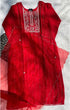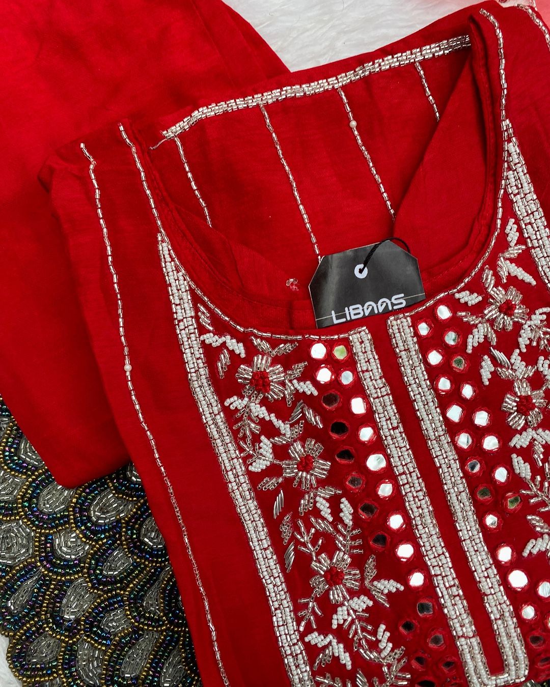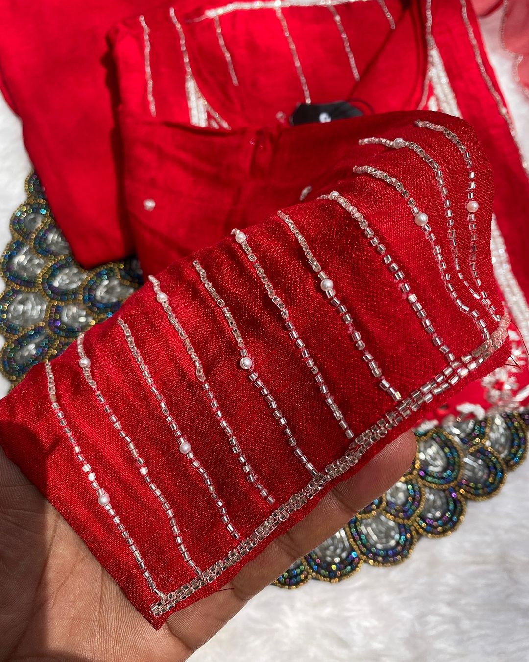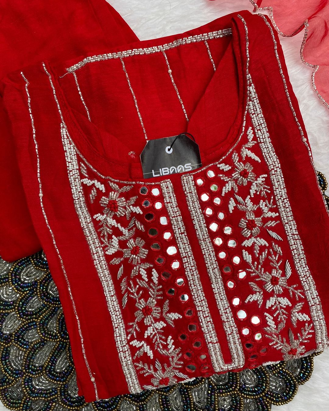 Beautifully handcrafted dola silk set with handwork all over the top using Cutdana and pearl work all over the yoke & sleeve of the kurta with a long organza dupatta with Cutdana scallope and small motives all over the dupatta paired with a handwork dola silk bottom