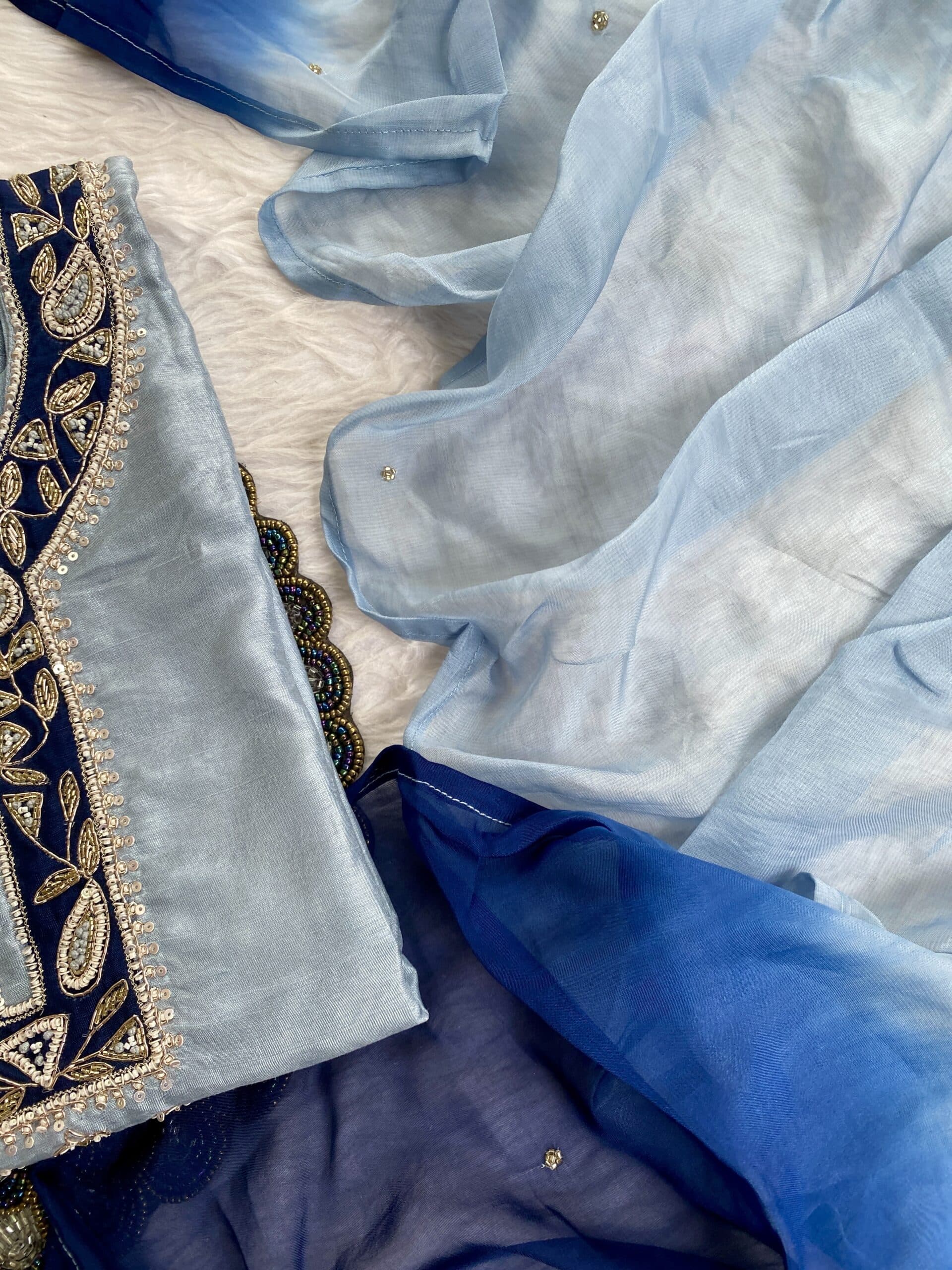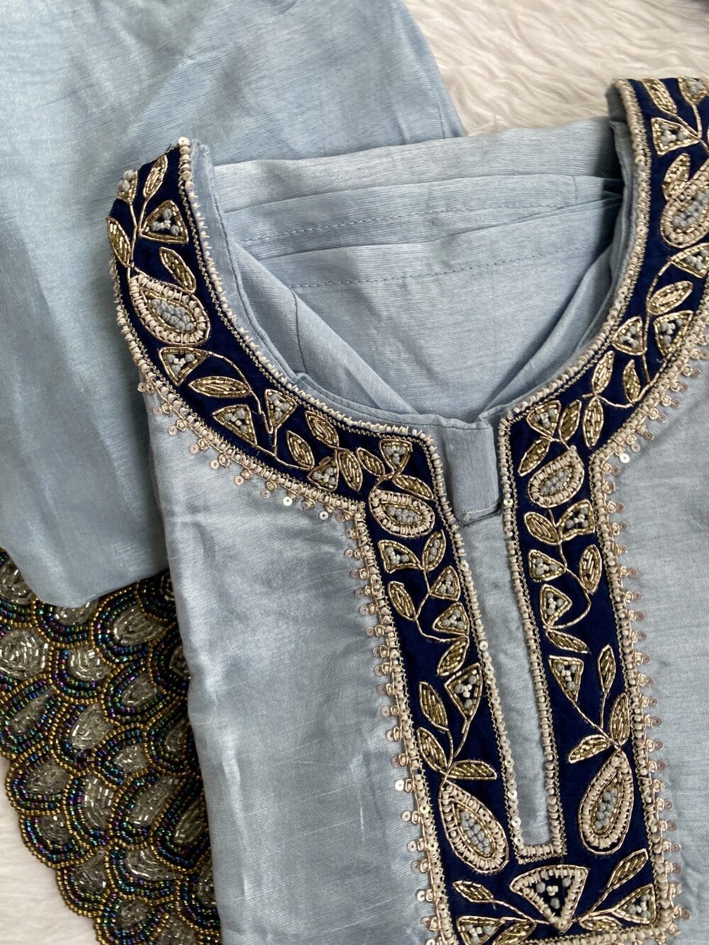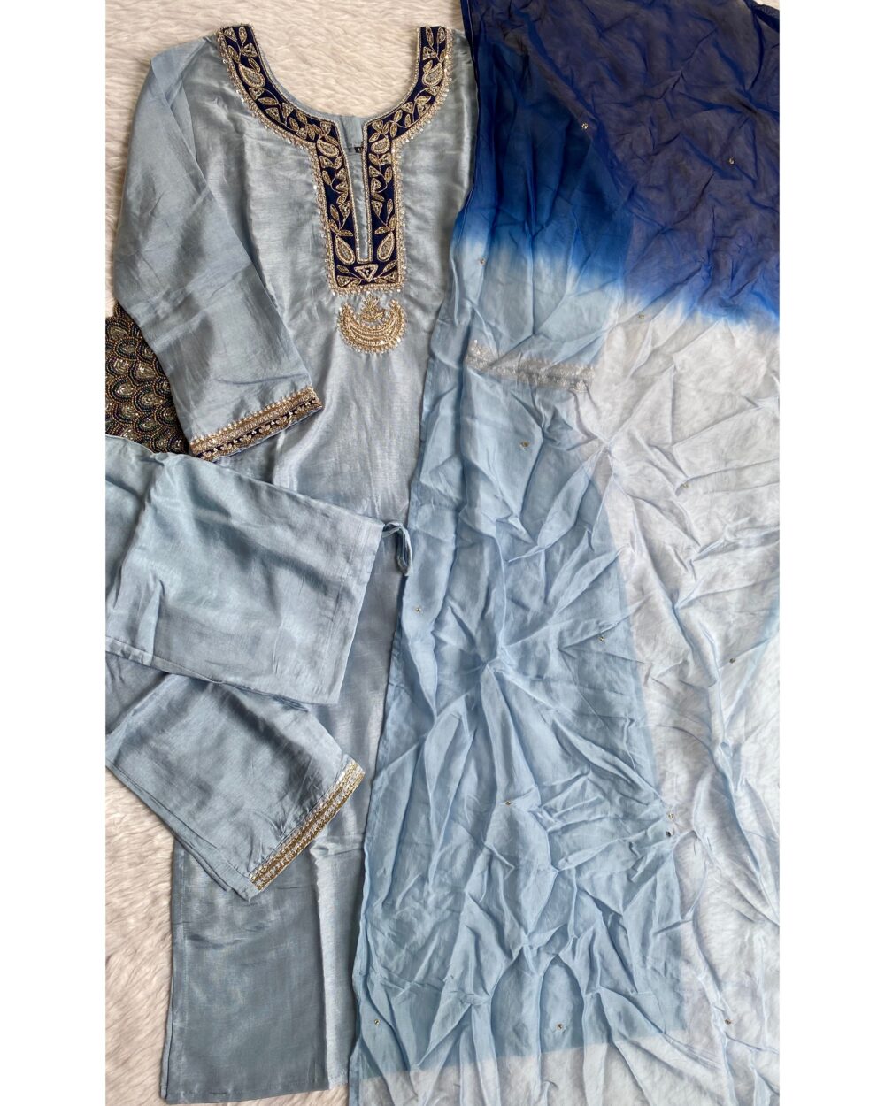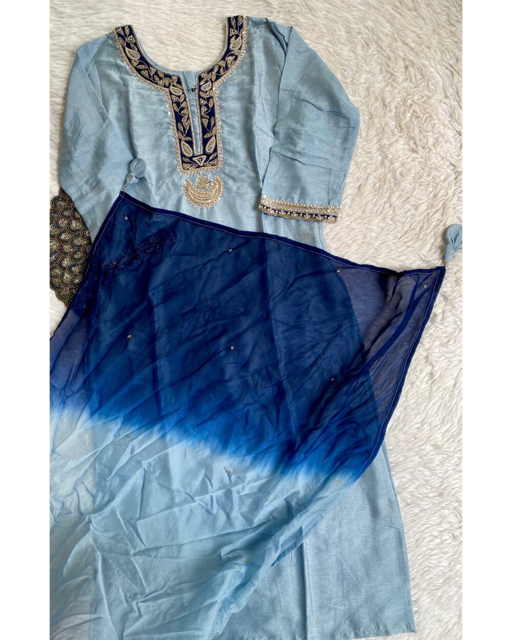 Beautiful blue shade Handwork kurta set with beautiful handwork on the yoke and sleeve of the kurta with a Double tone long Chinnon dupatta and a dola silk bottom