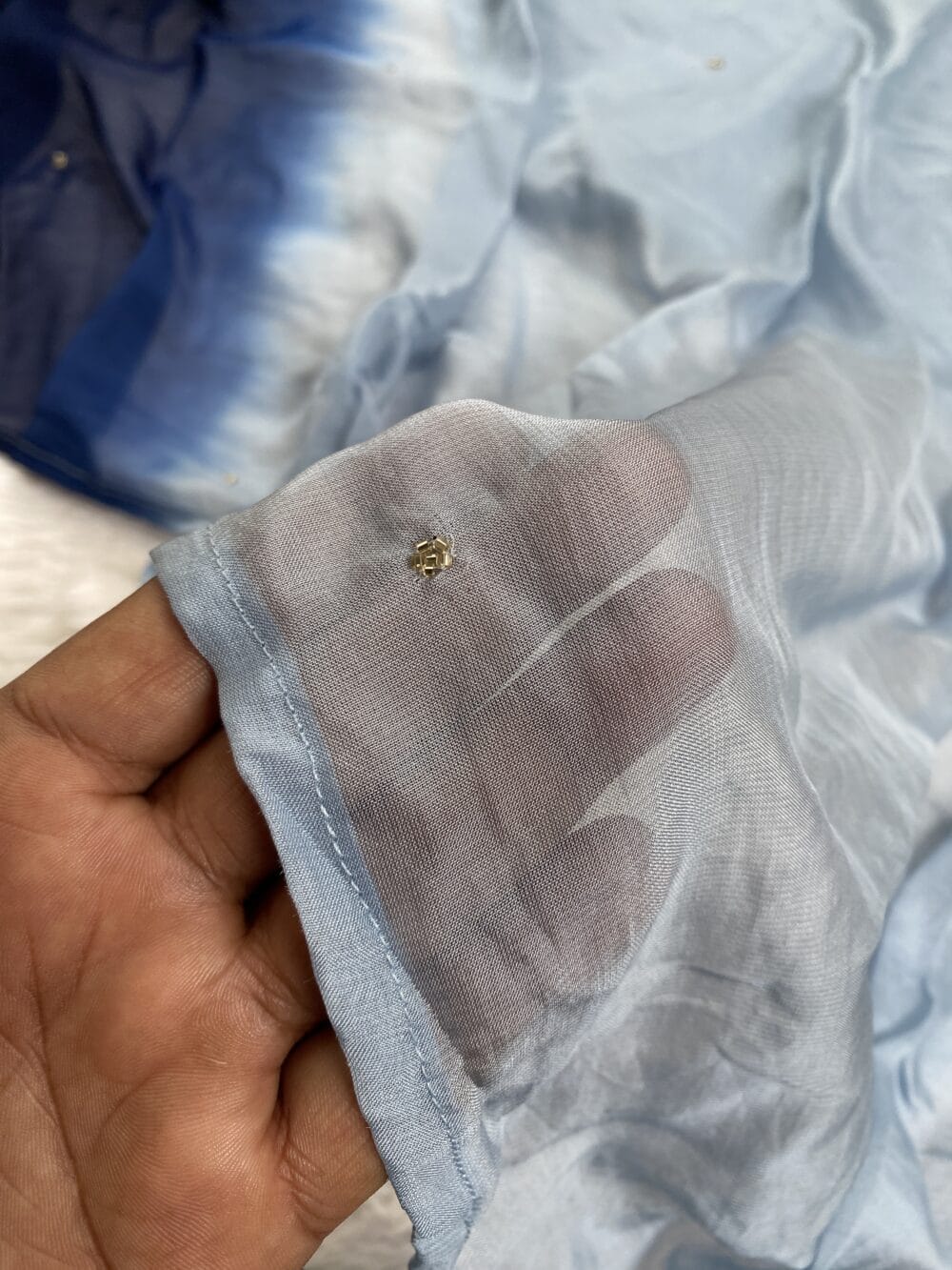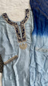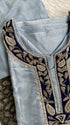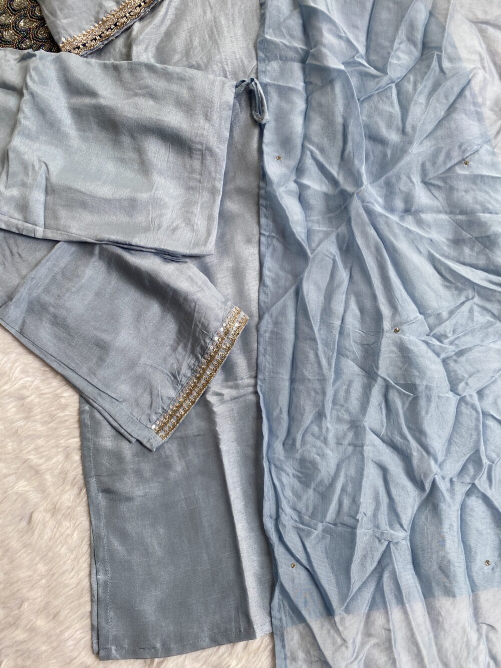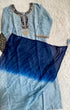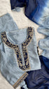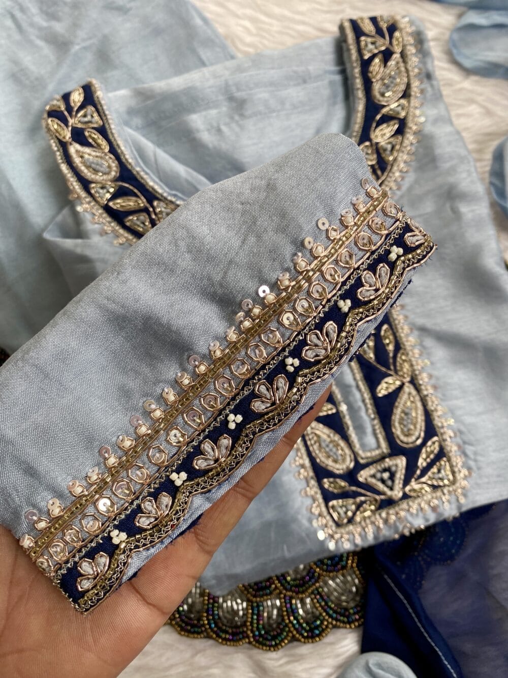 Beautiful blue shade Handwork kurta set with beautiful handwork on the yoke and sleeve of the kurta with a Double tone long Chinnon dupatta and a dola silk bottom
