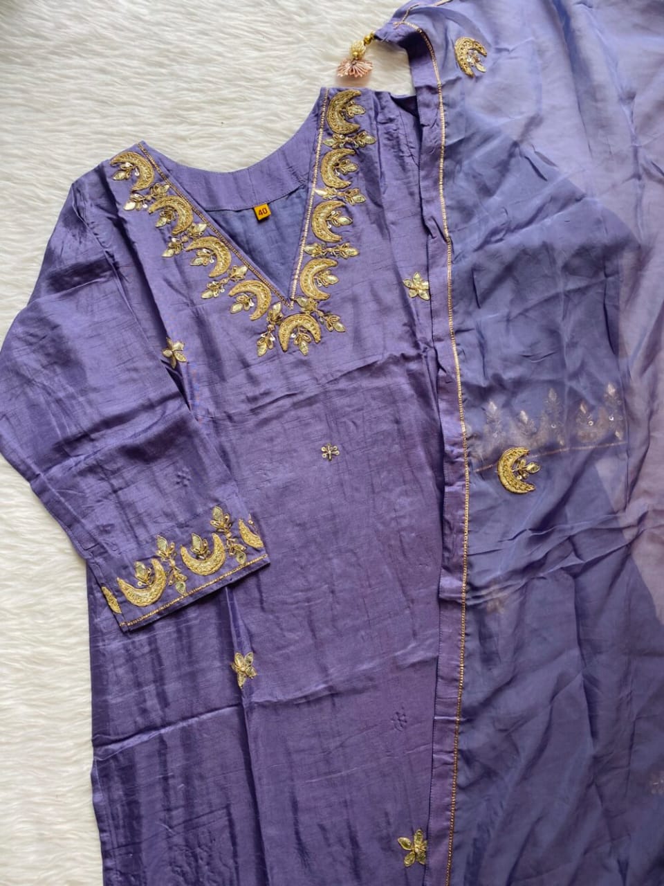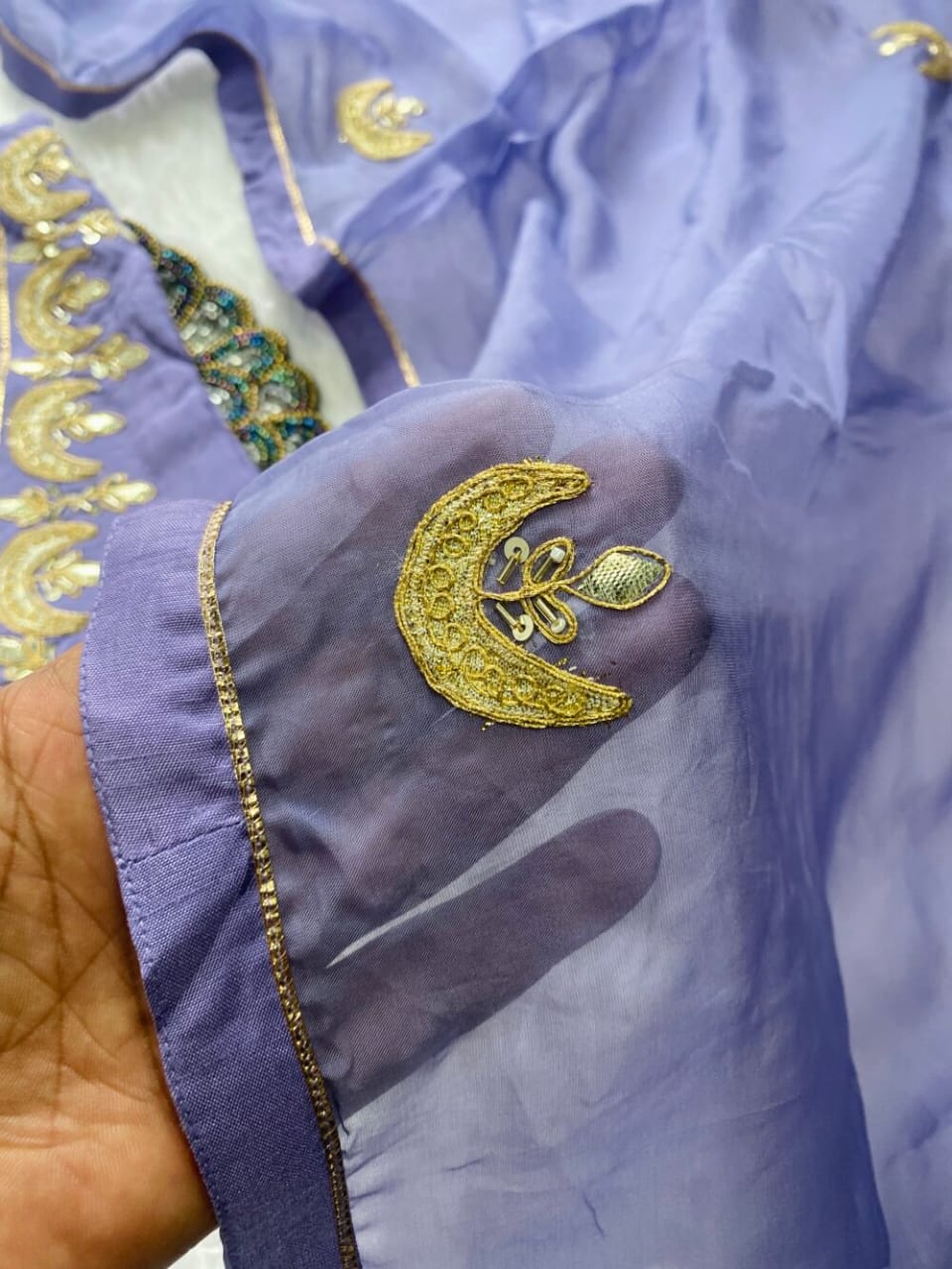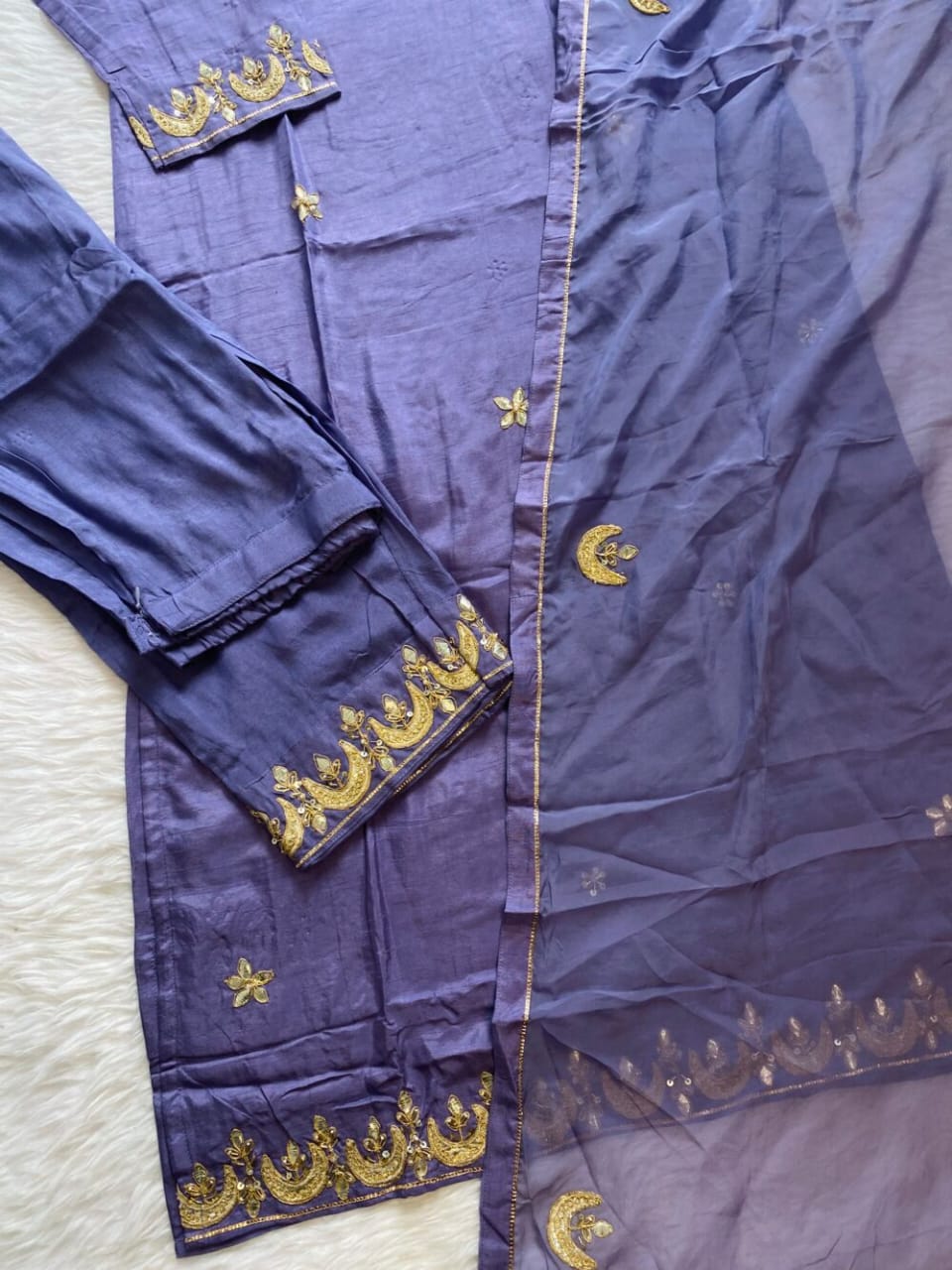 A very beautiful piece  handwork on the voke and sleeve of the kurta with a beautiful work organza dupatta and a silk bottom with work