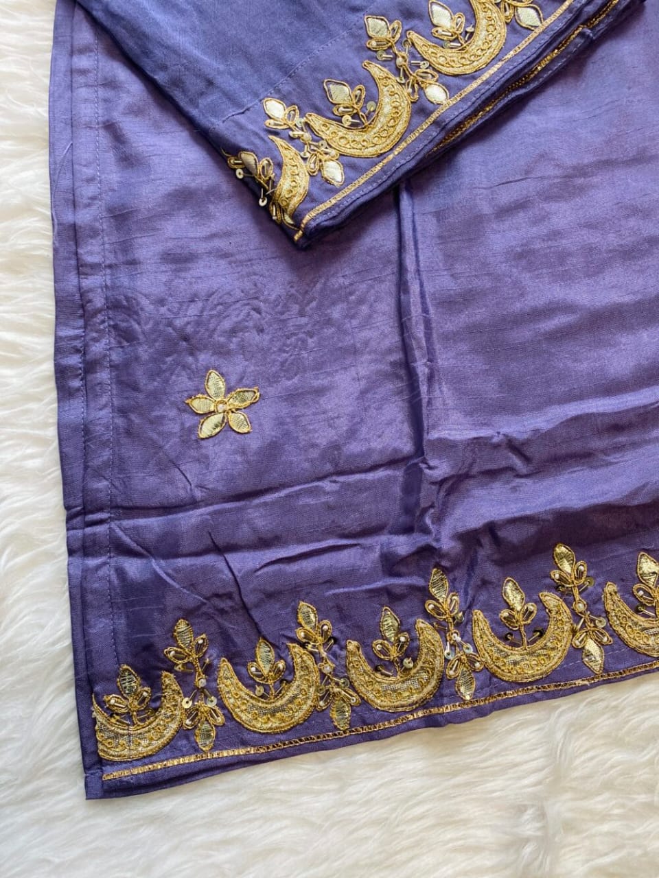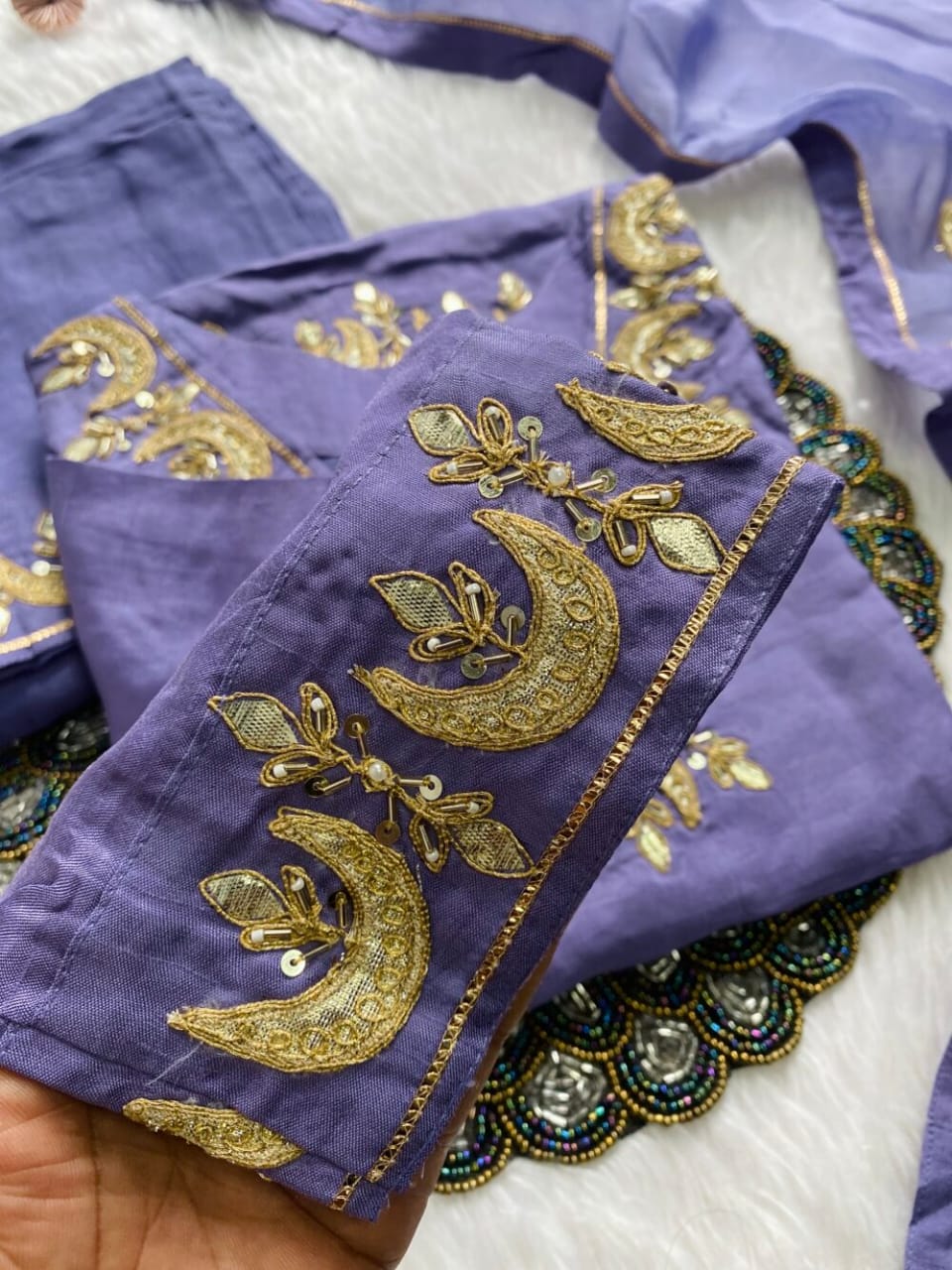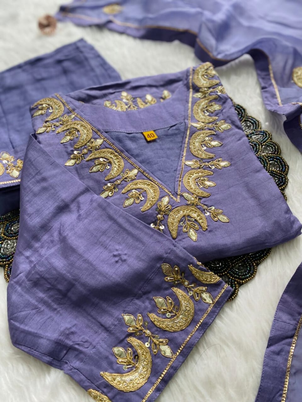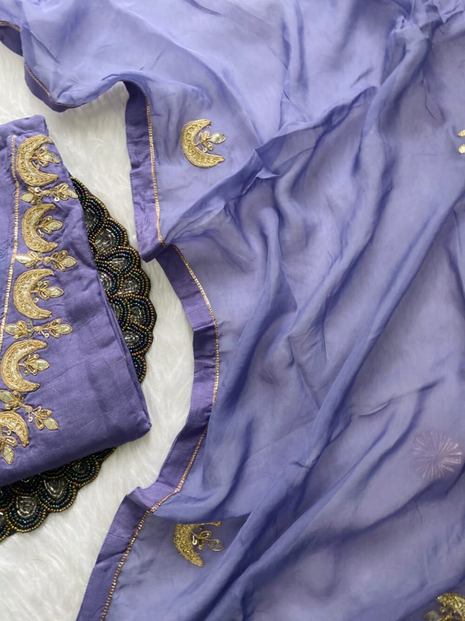 A very beautiful piece  handwork on the voke and sleeve of the kurta with a beautiful work organza dupatta and a silk bottom with work