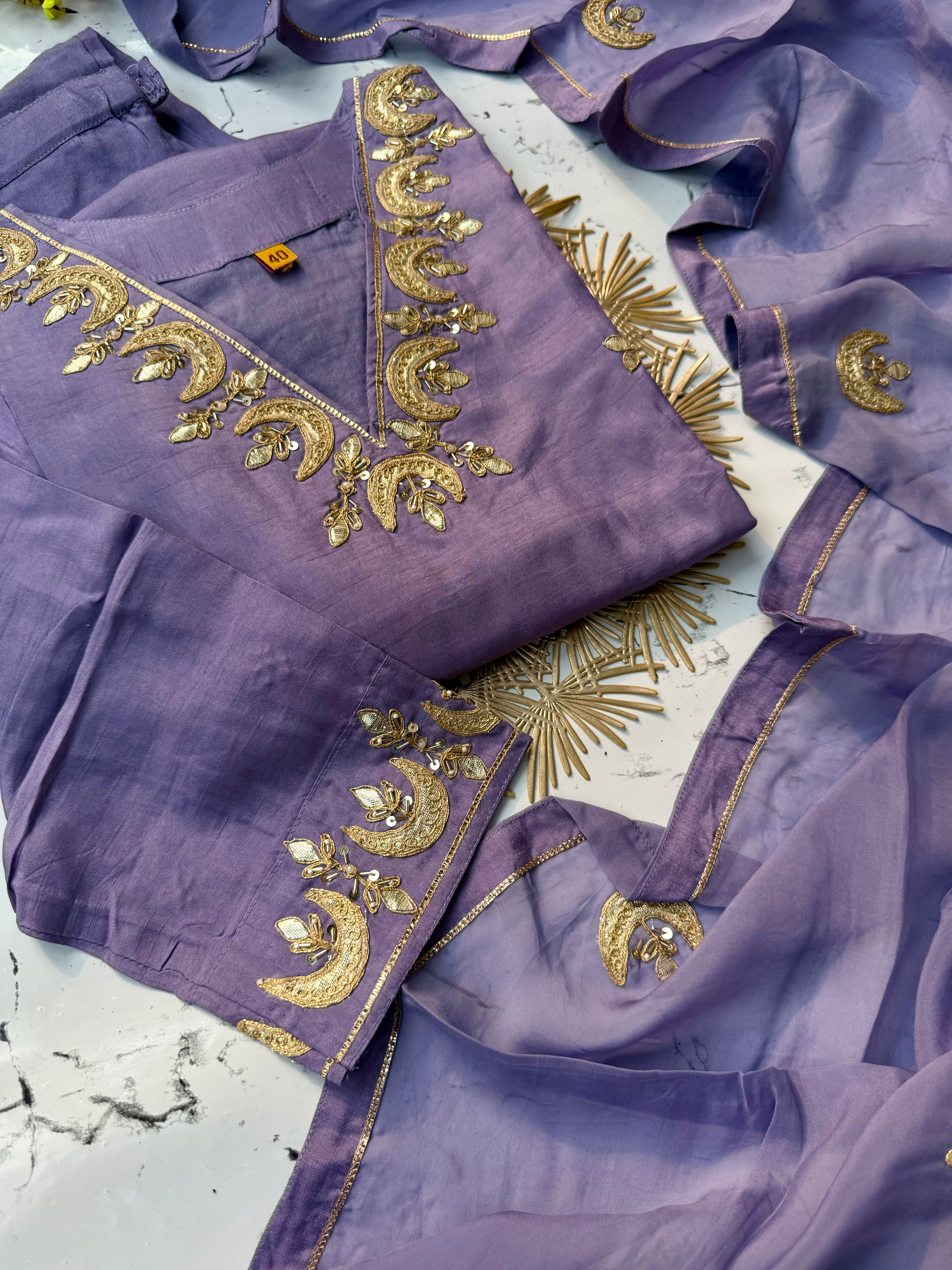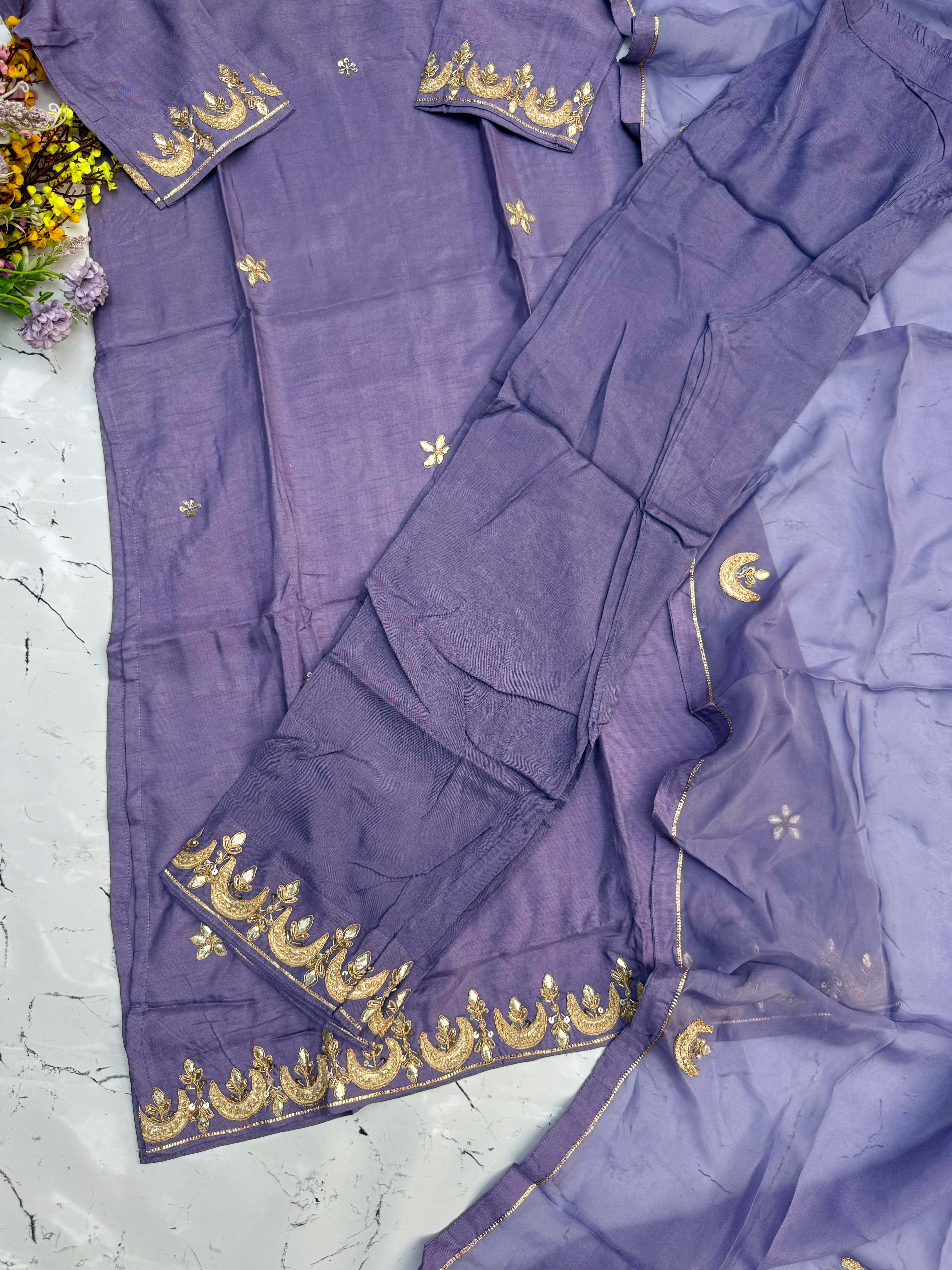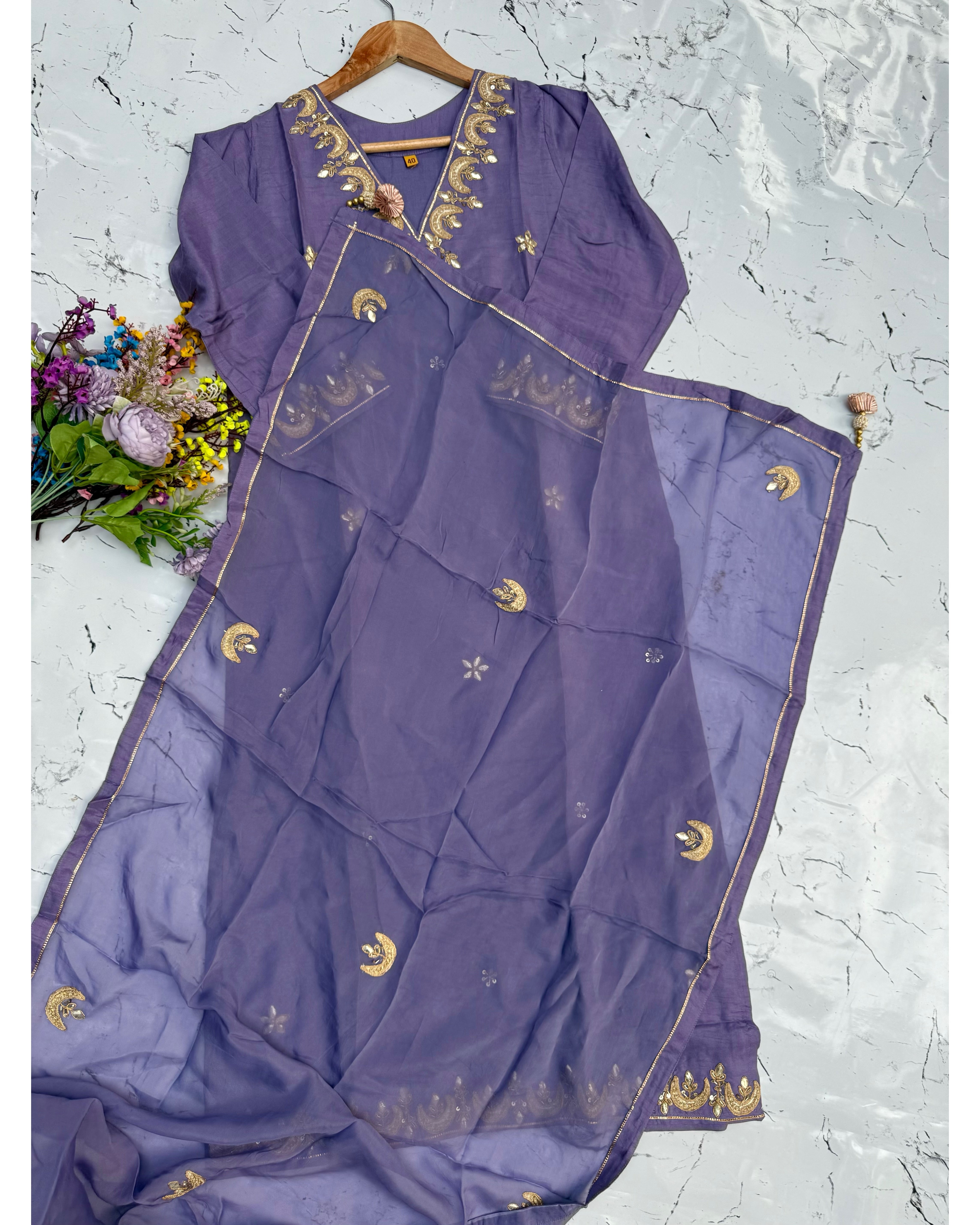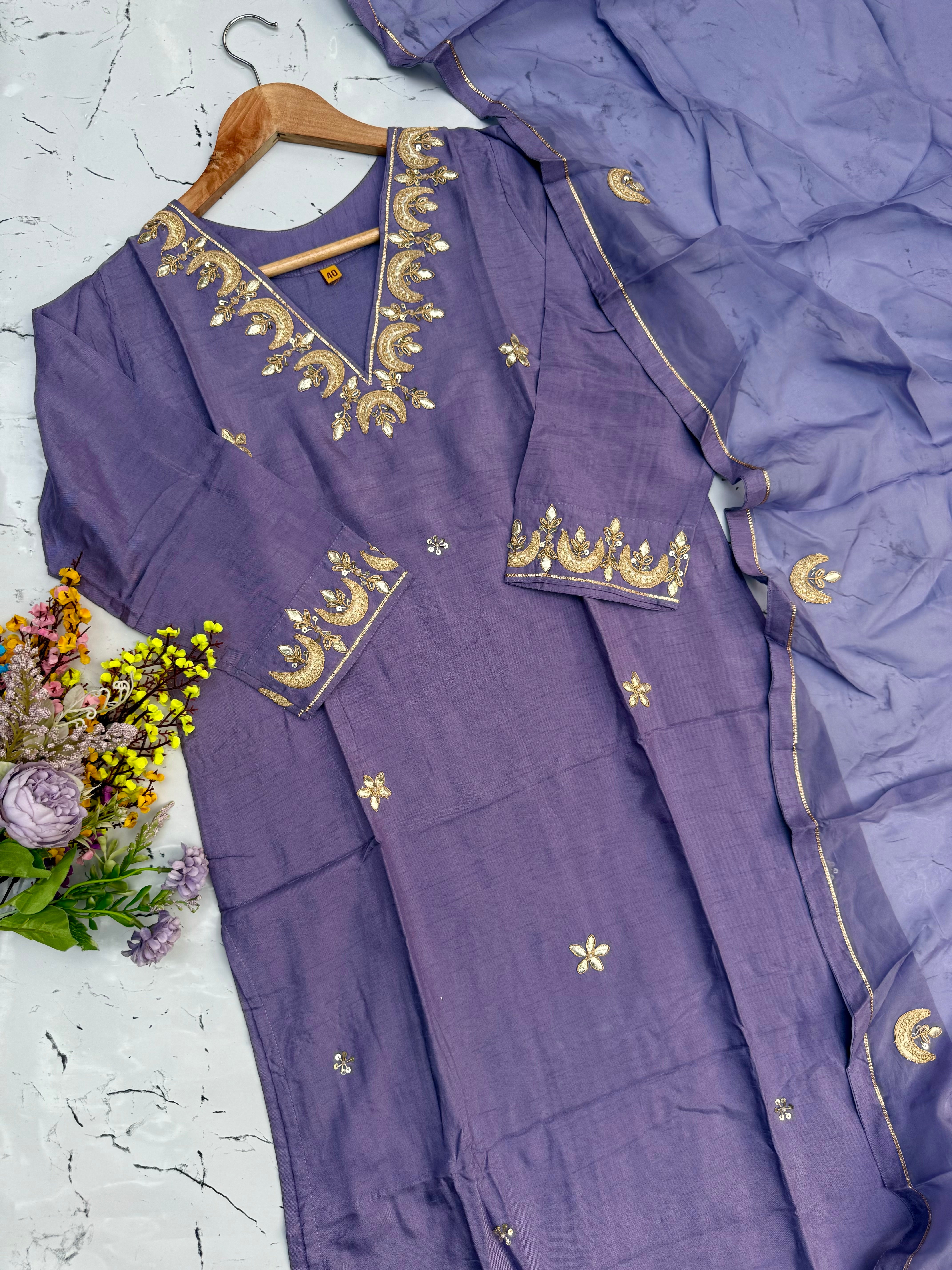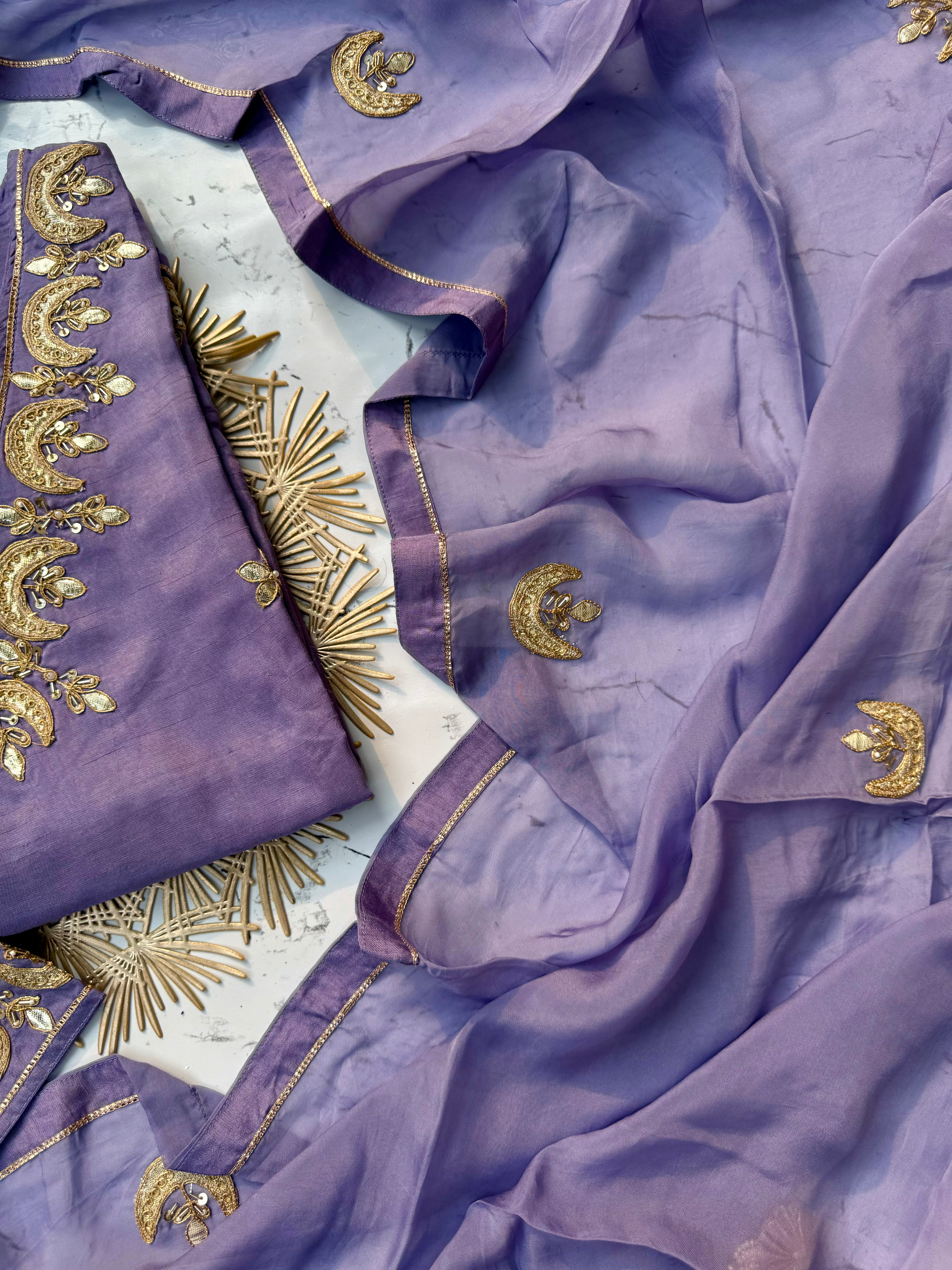 A very beautiful piece handwork on the voke and sleeve of the kurta with a beautiful work organza dupatta and a silk bottom with work