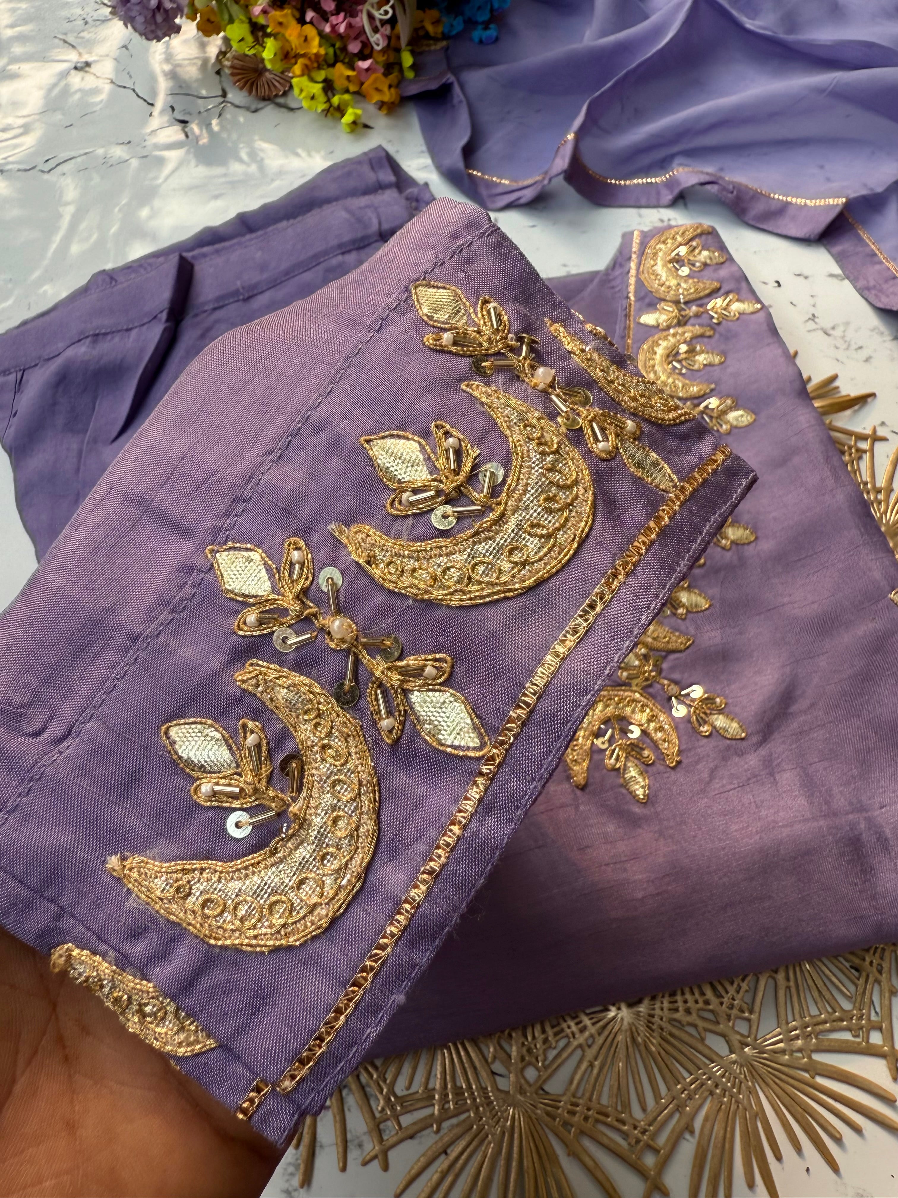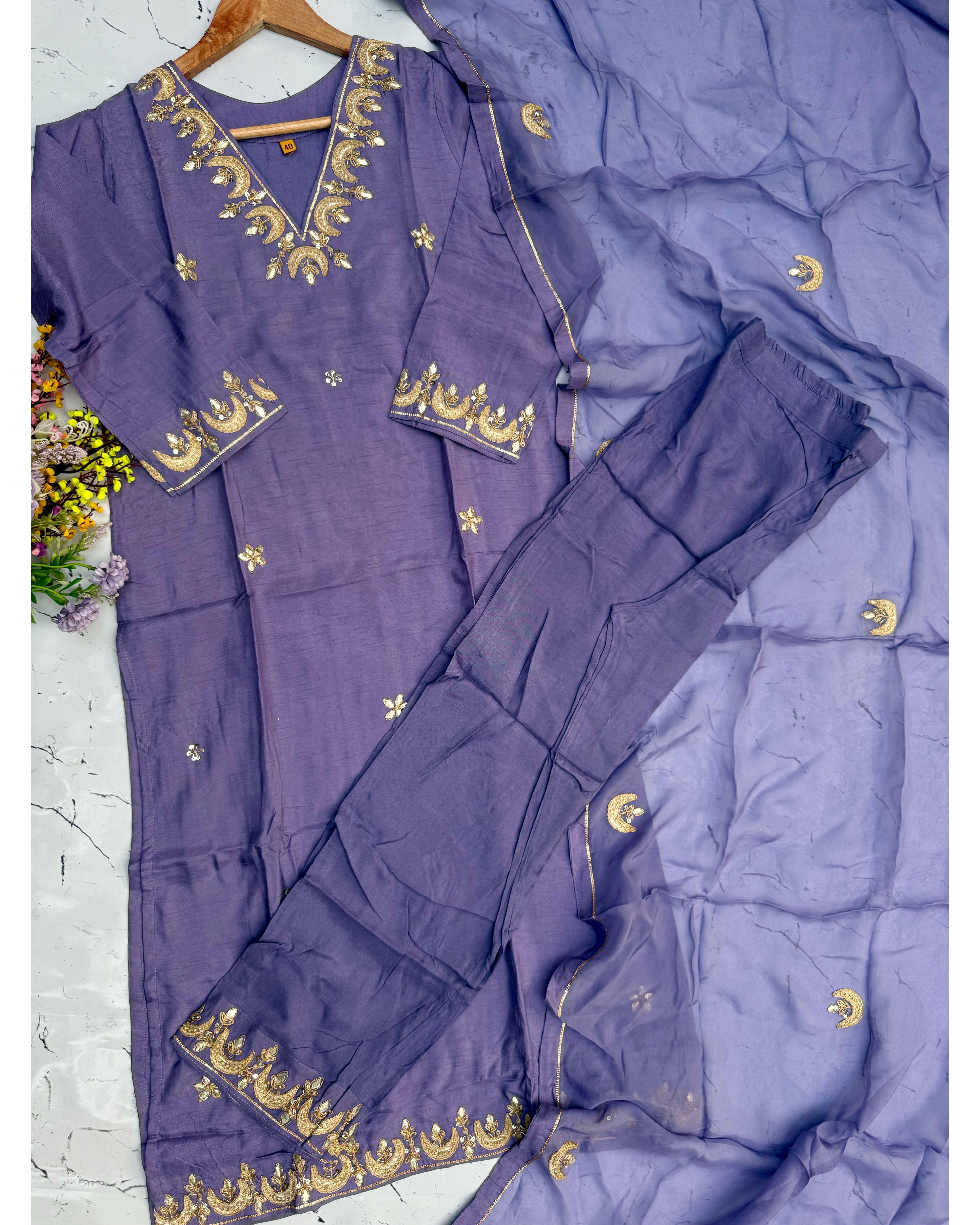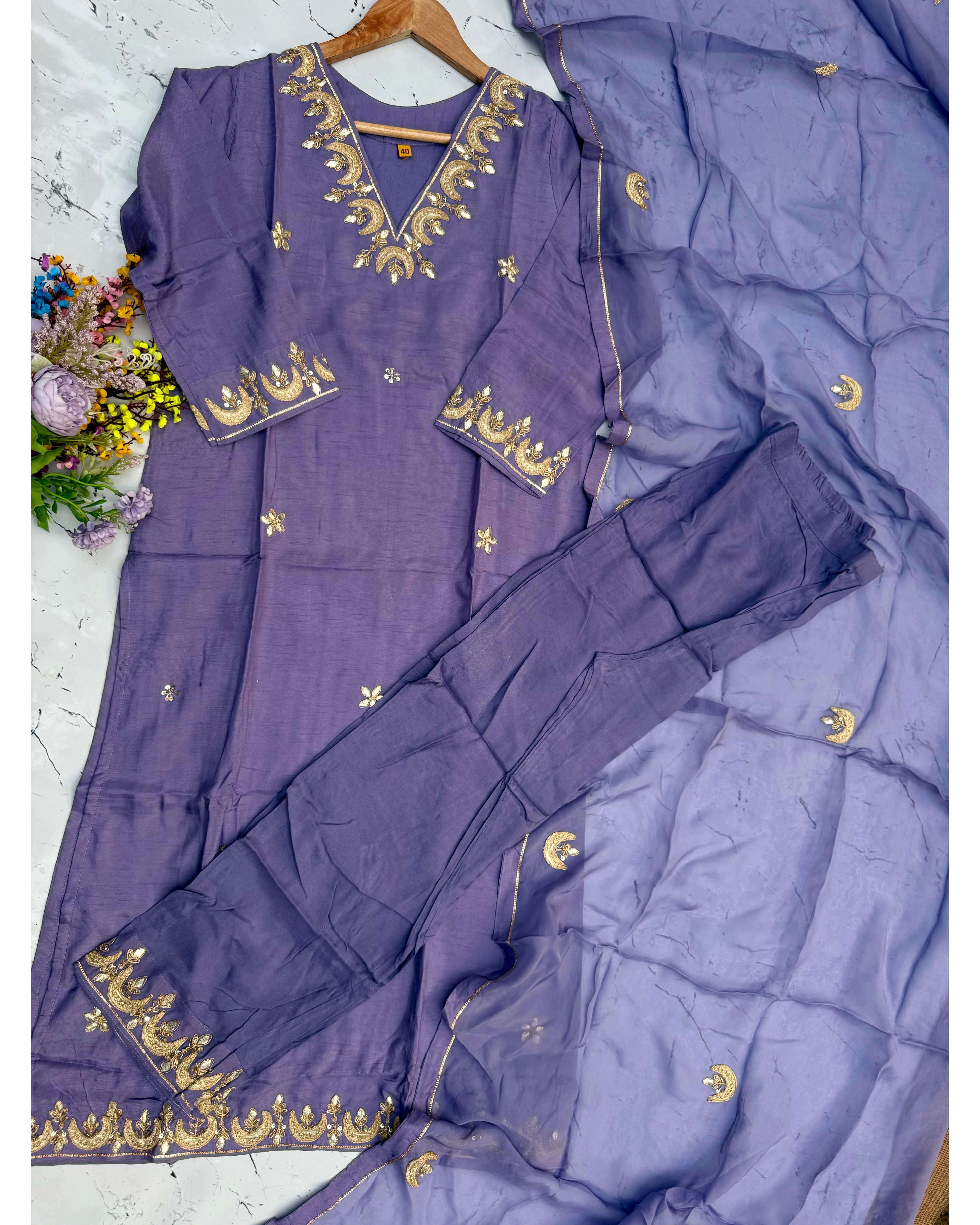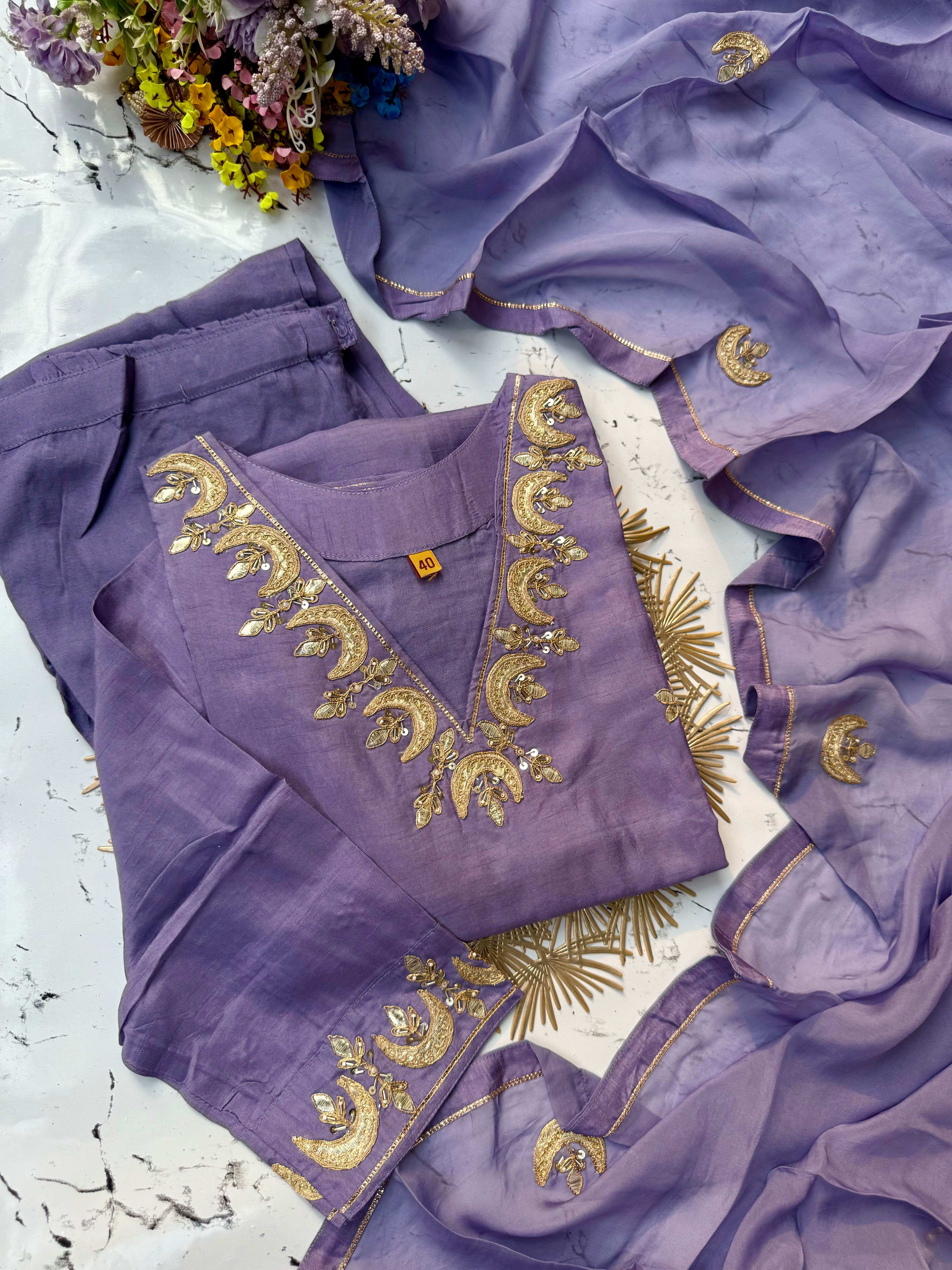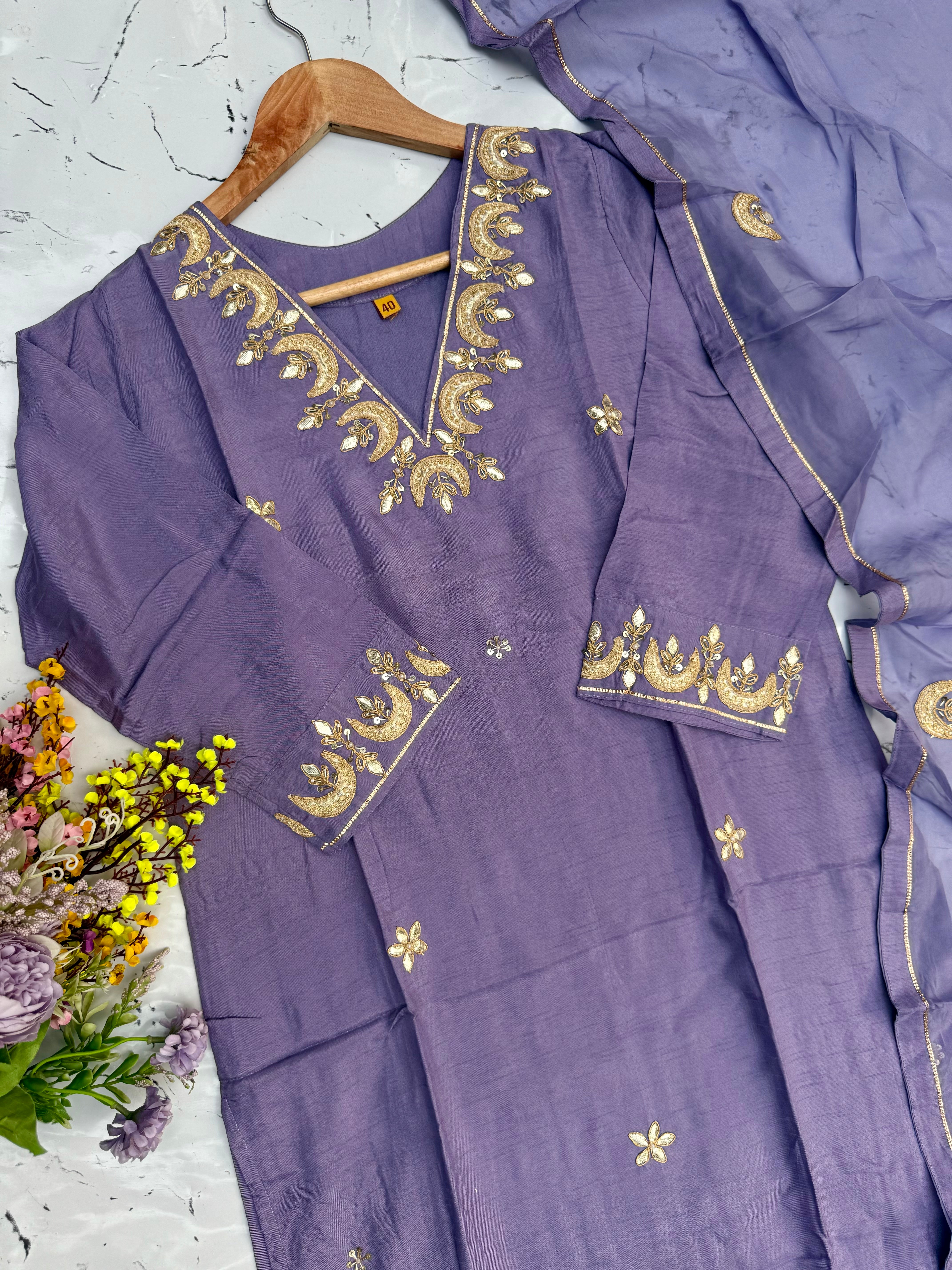 A very beautiful piece handwork on the voke and sleeve of the kurta with a beautiful work organza dupatta and a silk bottom with work