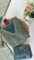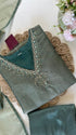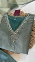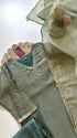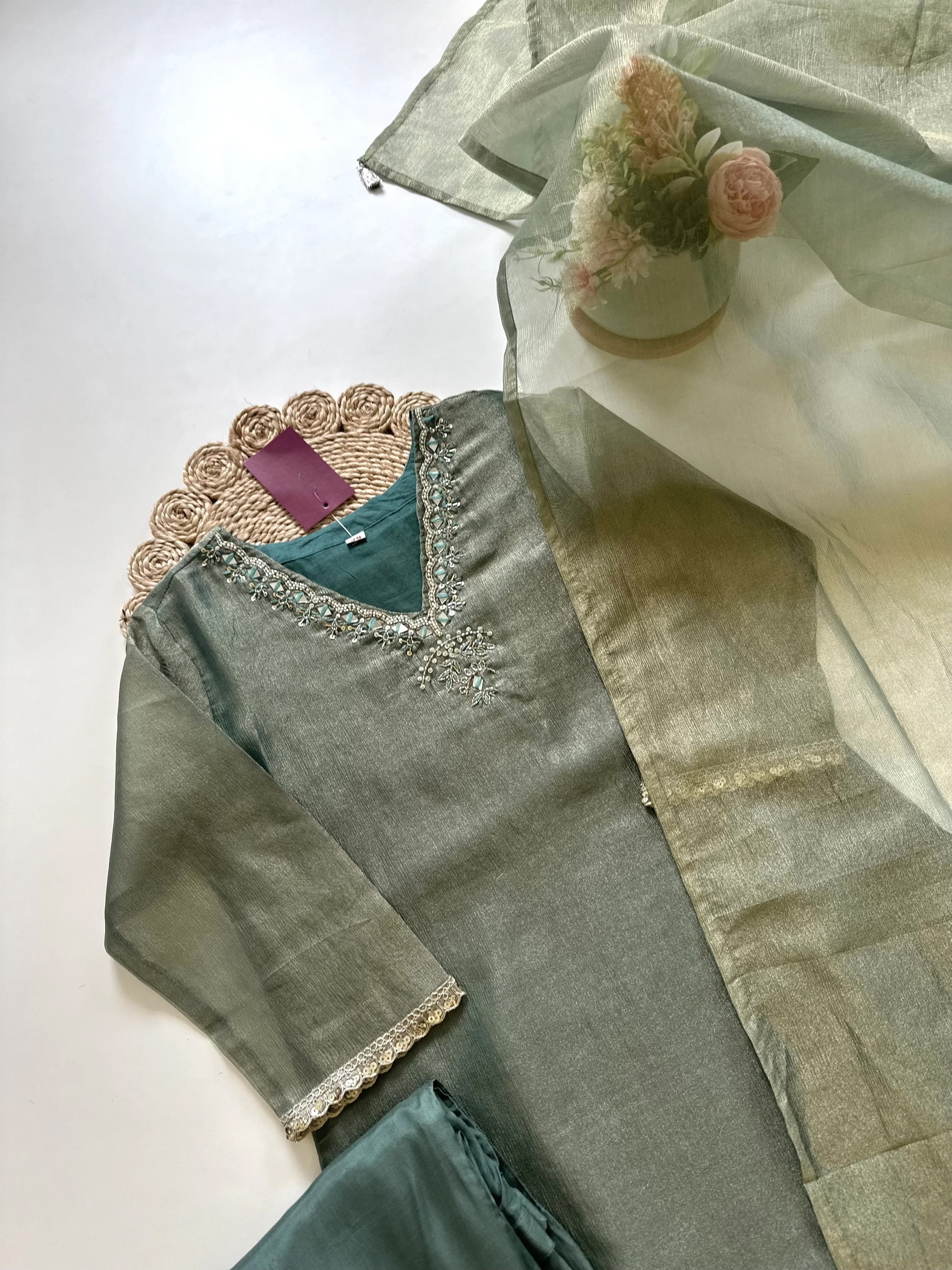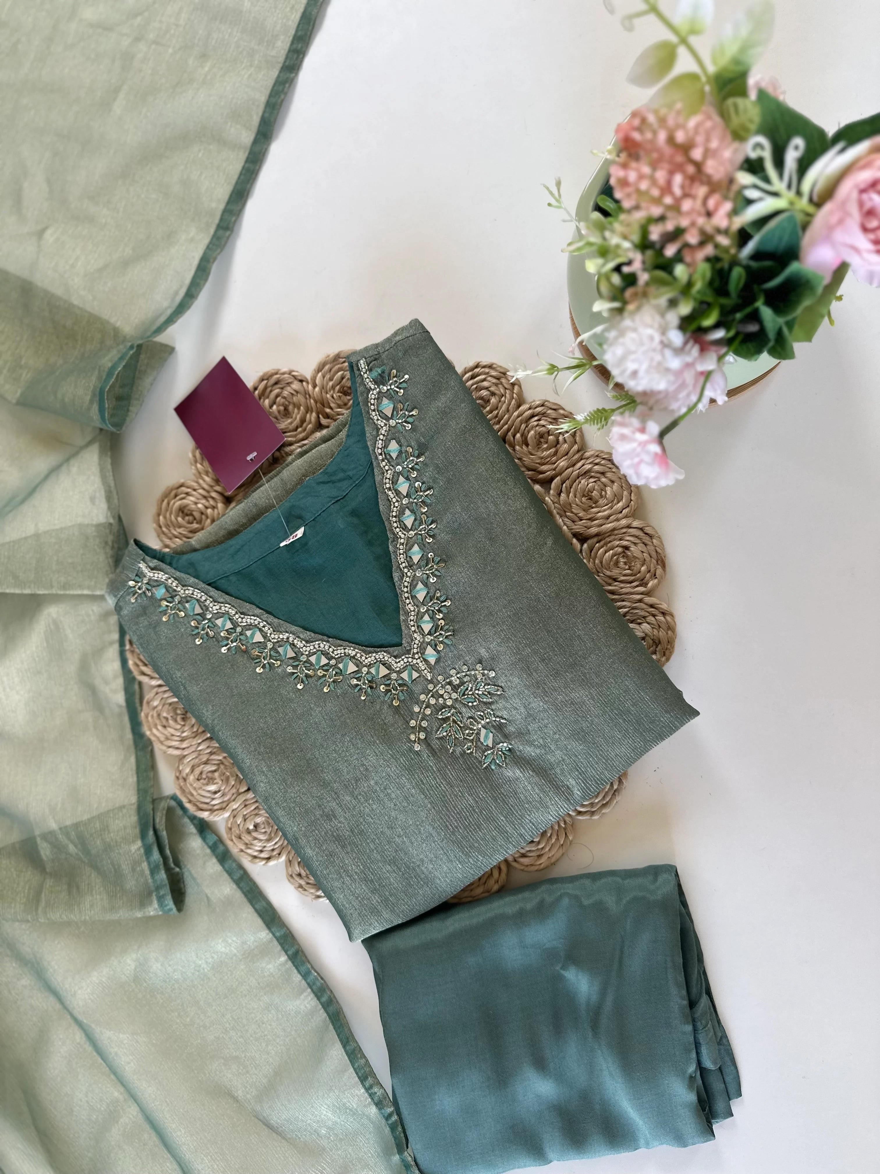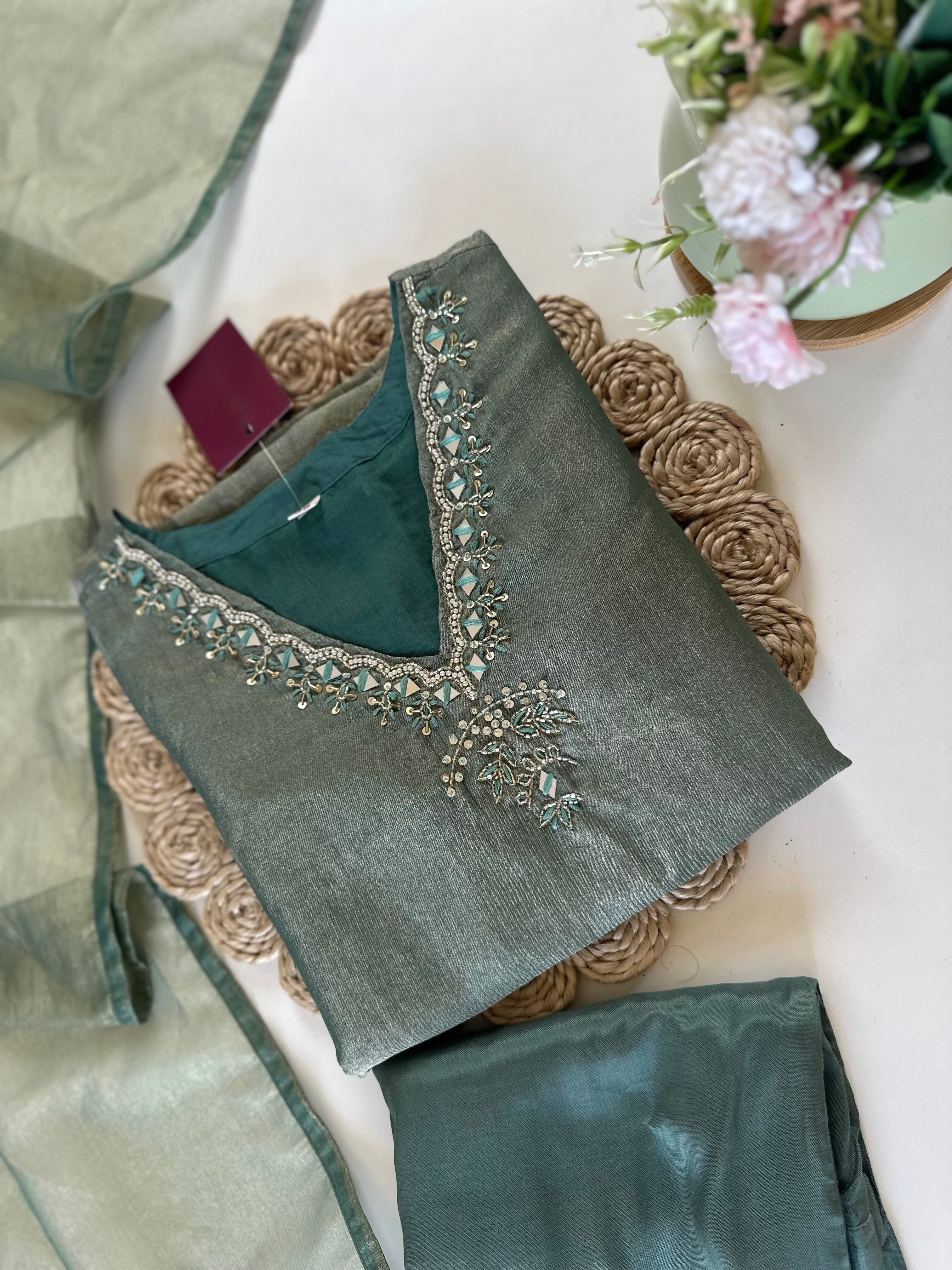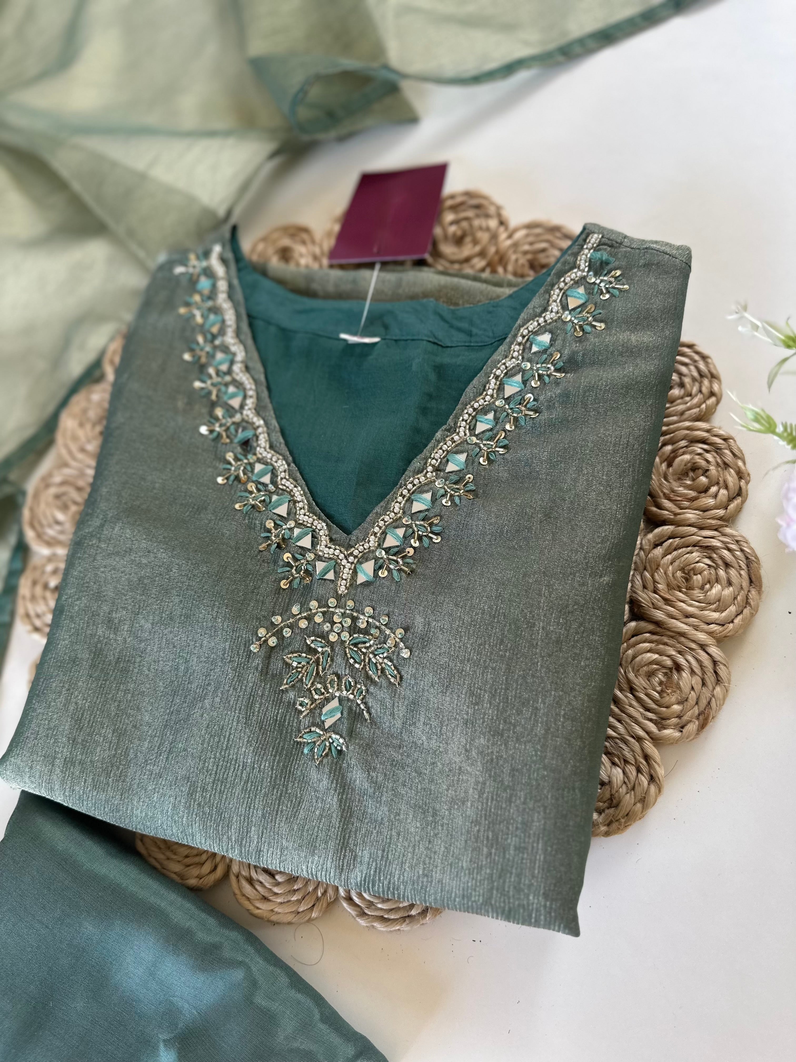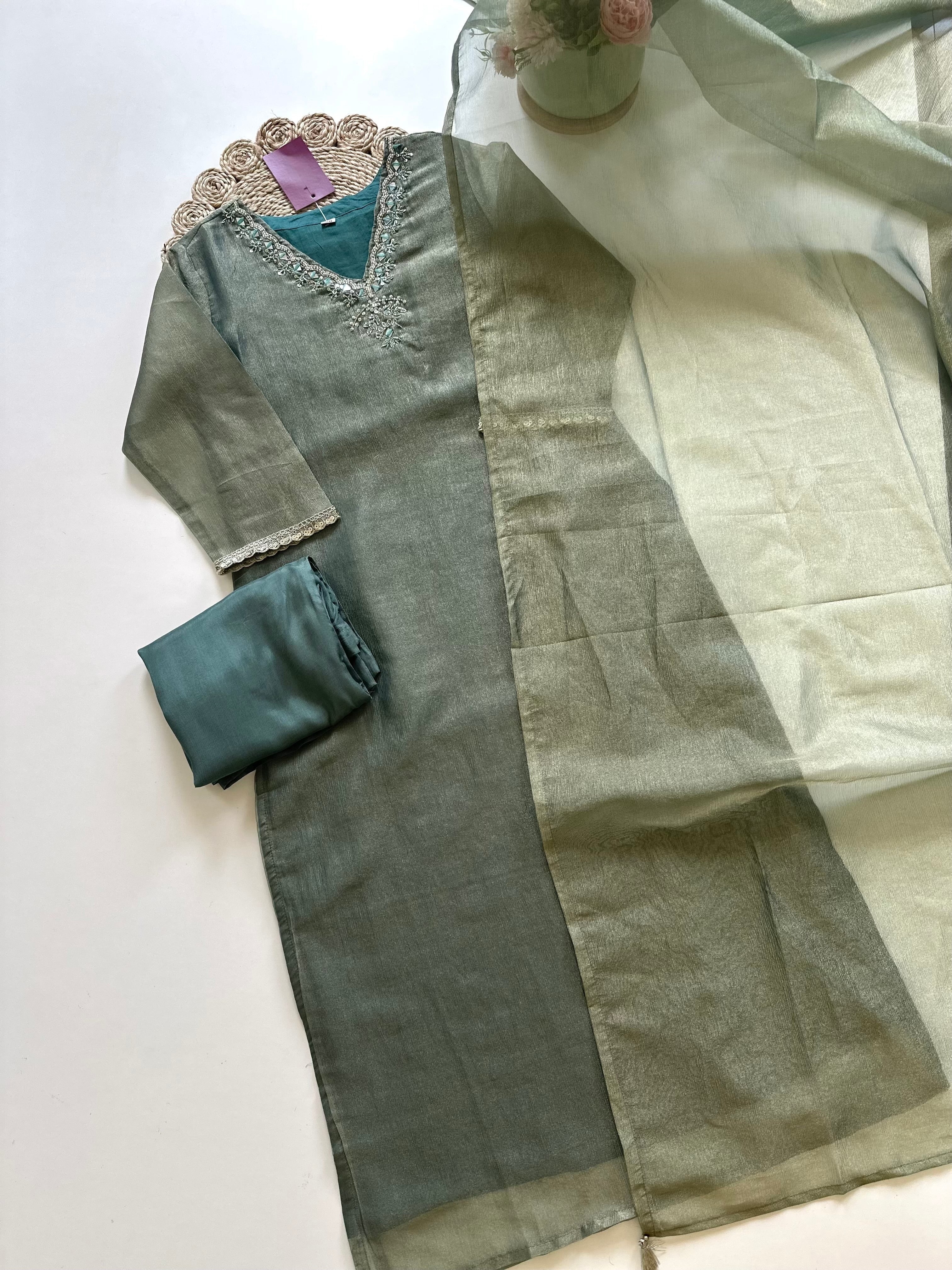 Crush tissue light weight kurta set with handwork on the neck line with long crush tissue dupatta paired with a plane silk bottom