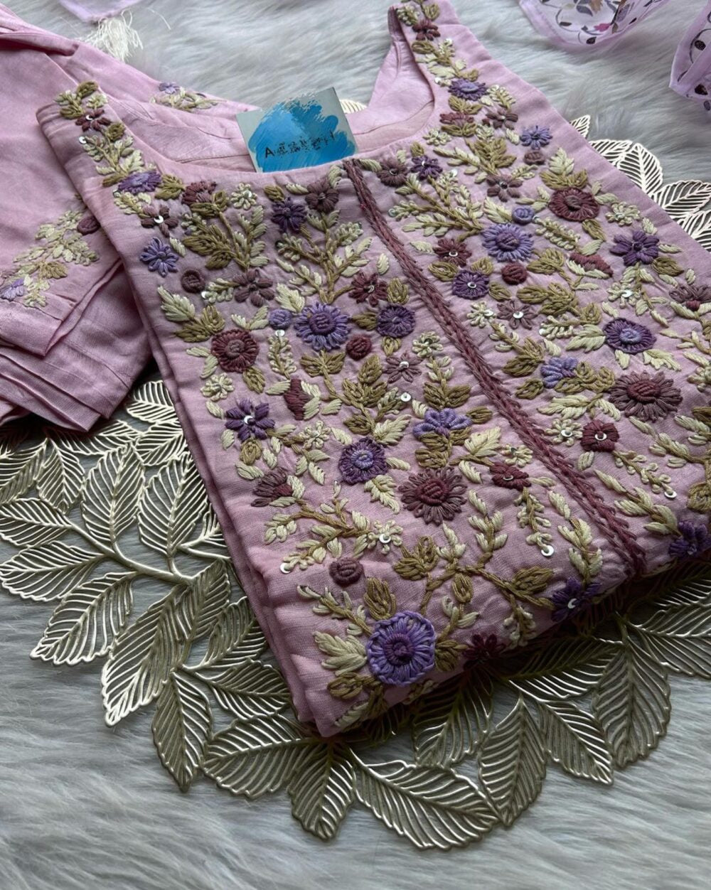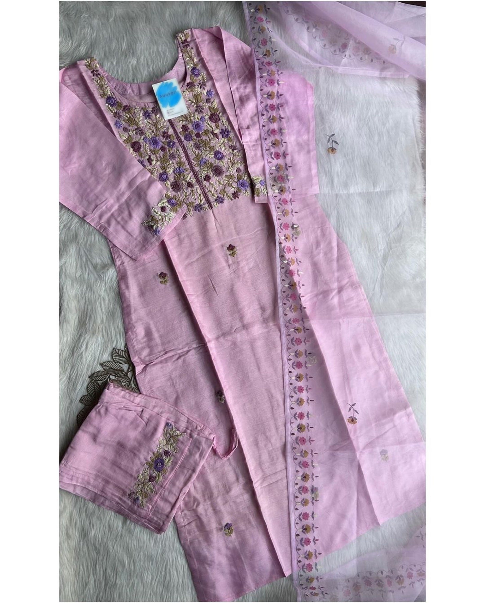 Simple & elegant handwork with floral printed organza dupatta, handwork on the yoke & sleeve of the kurta and a work bottom
