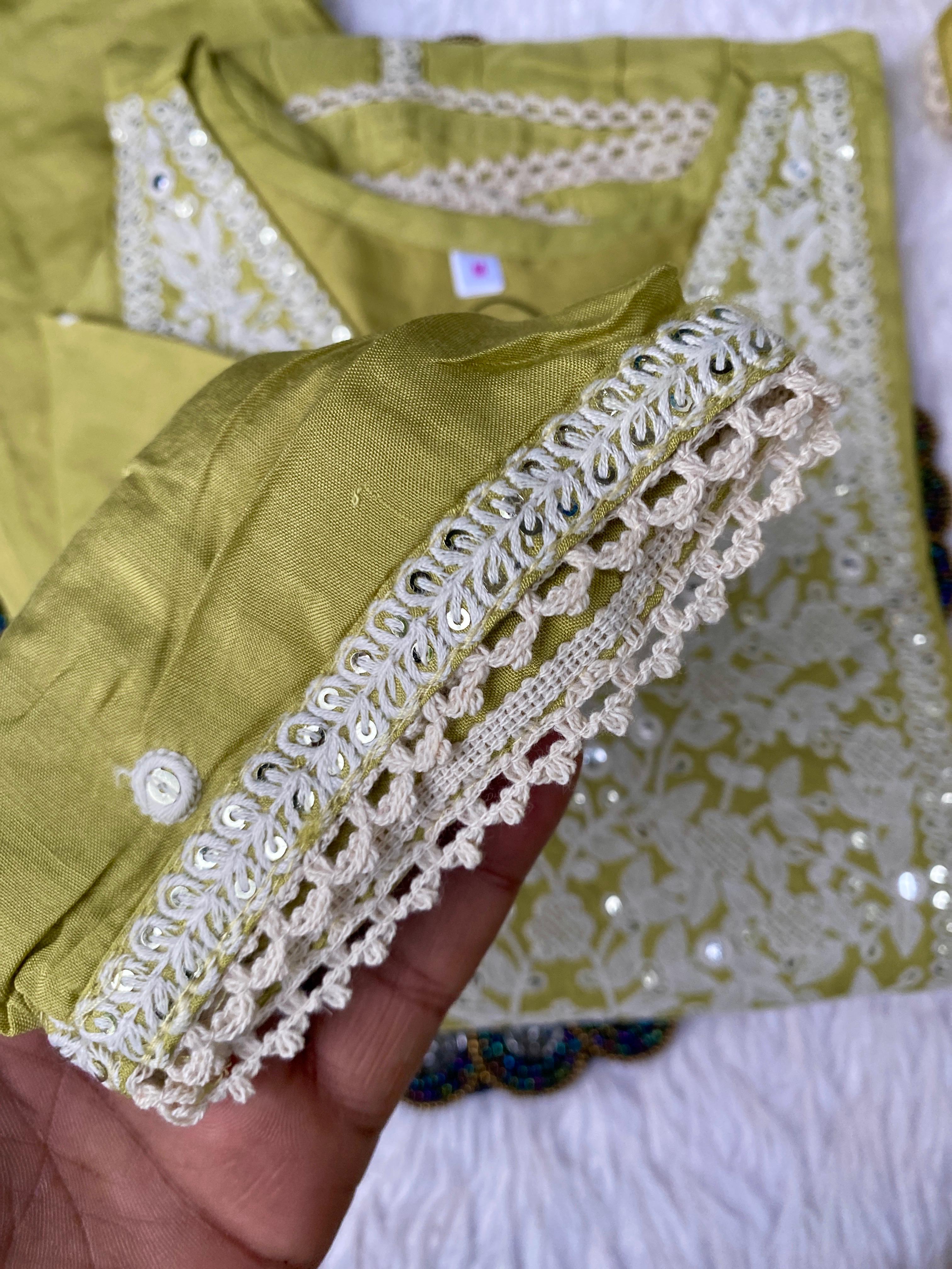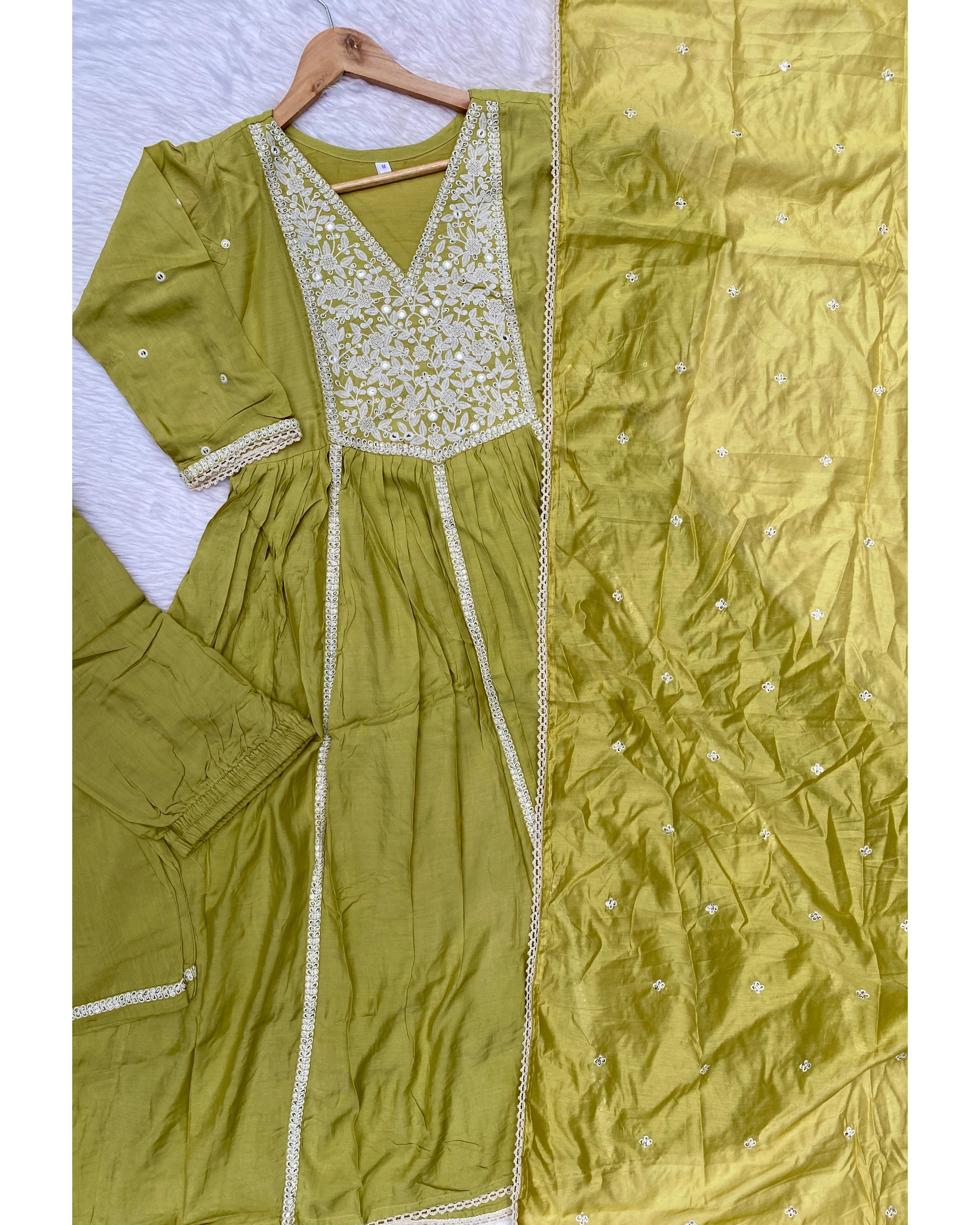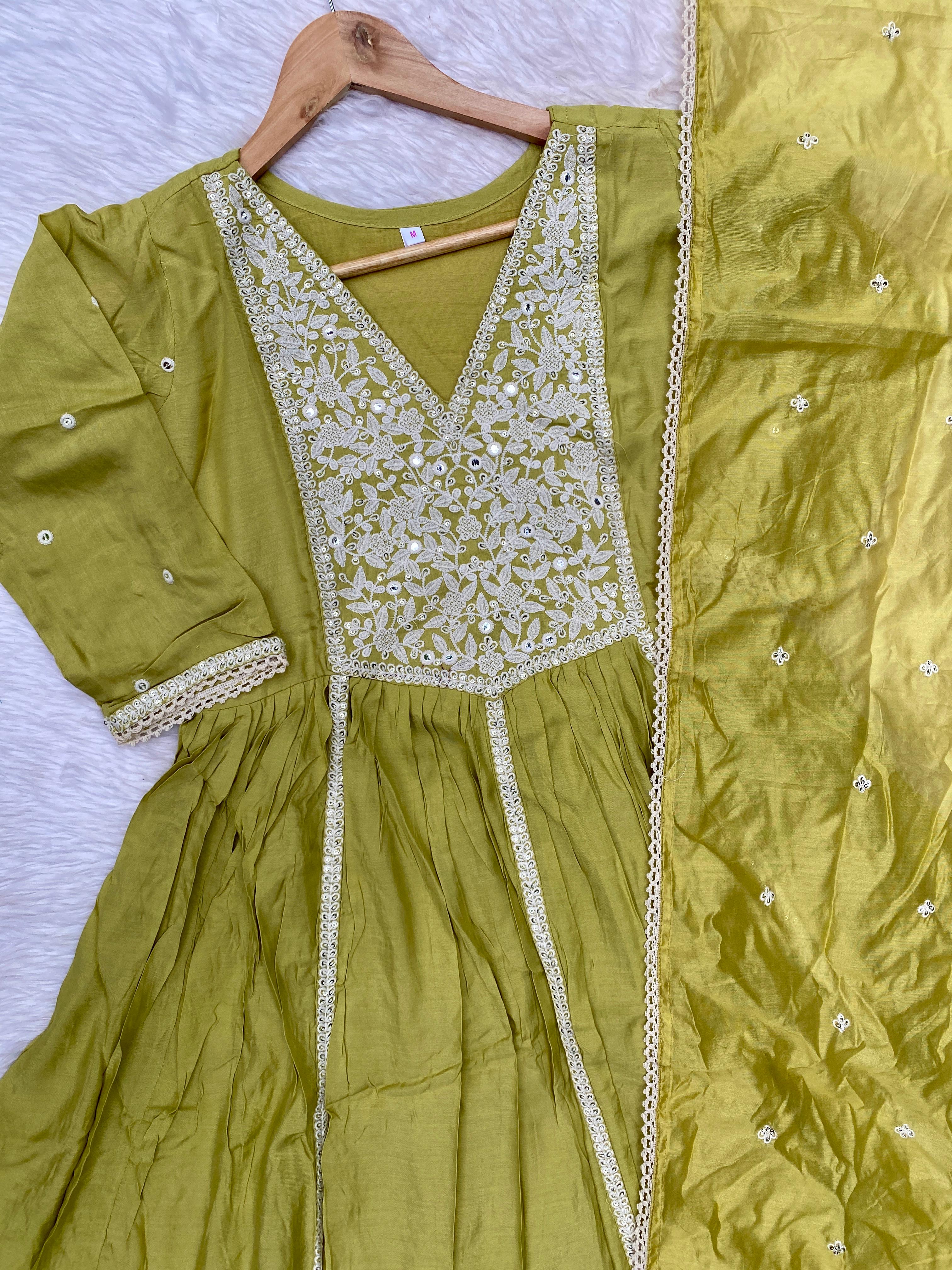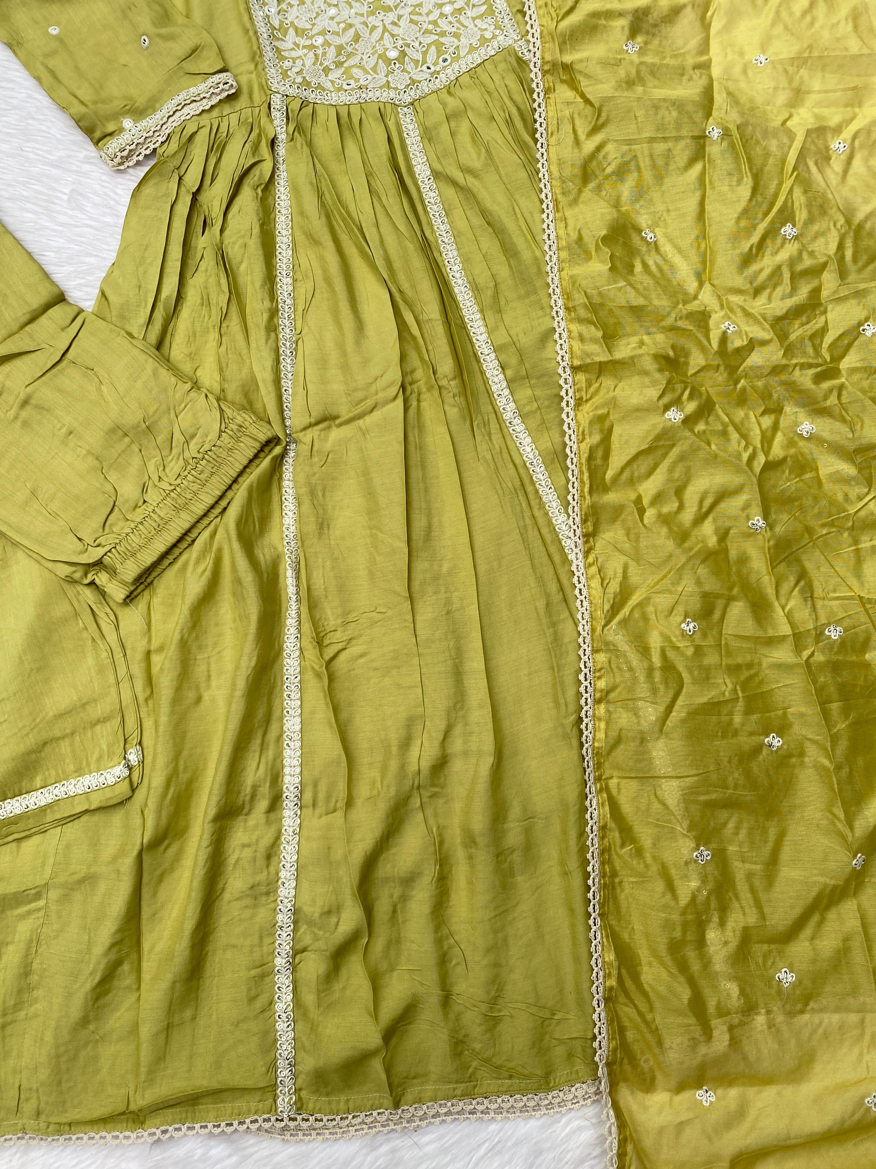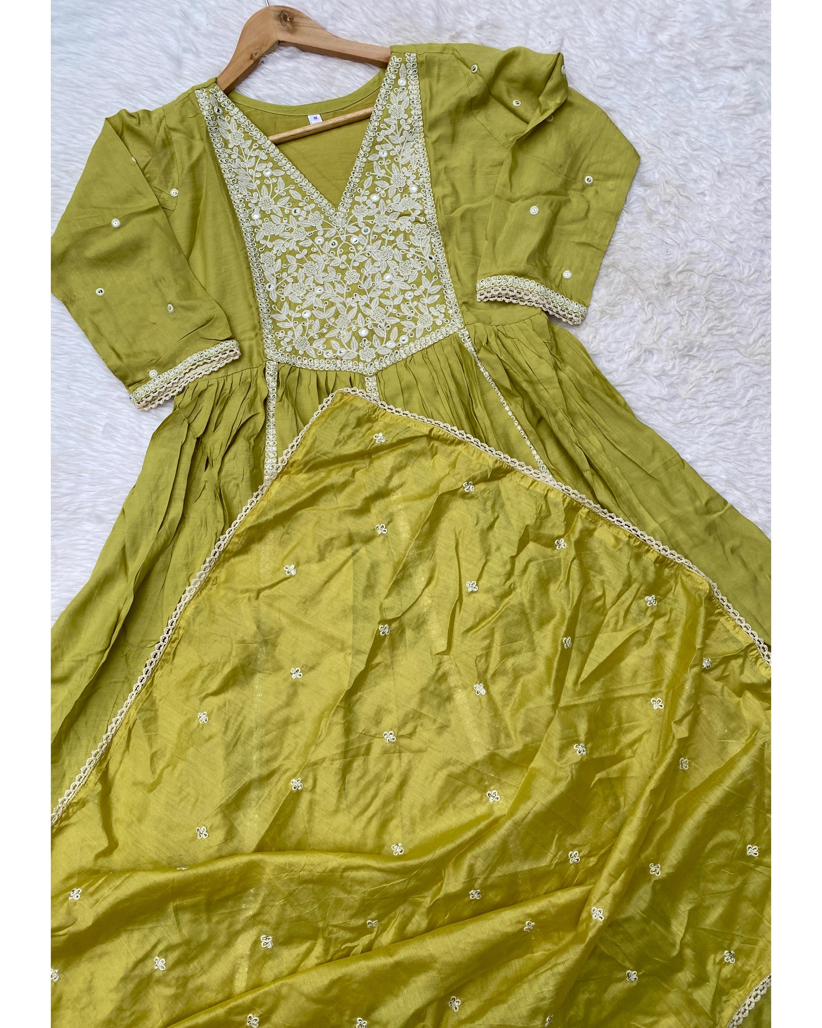 Muslin silk anarkali kurti with embroidery and lace work detailing on the neck line, sleevs and Daman with a lace & embroidery detailing shiffon dupatta with silk bottom