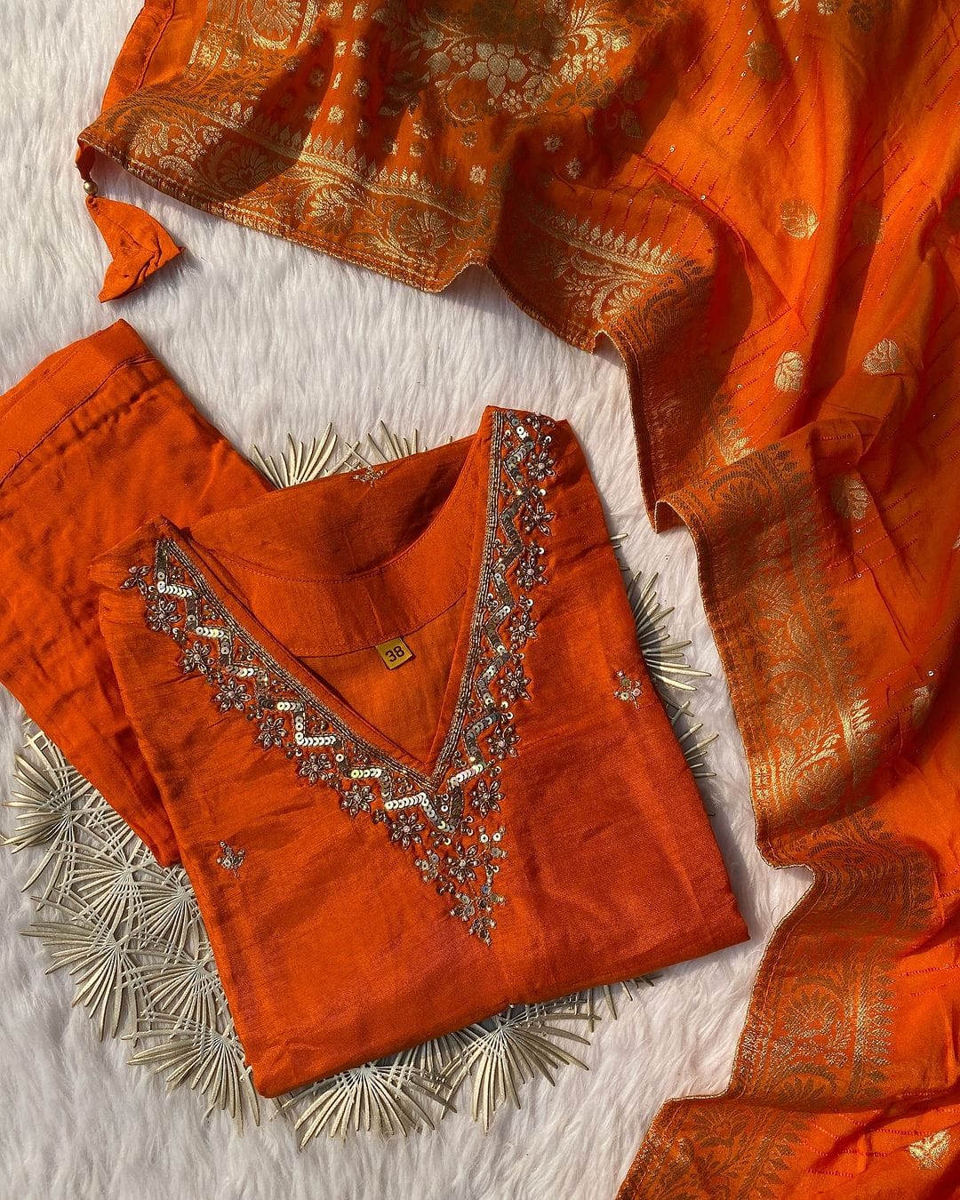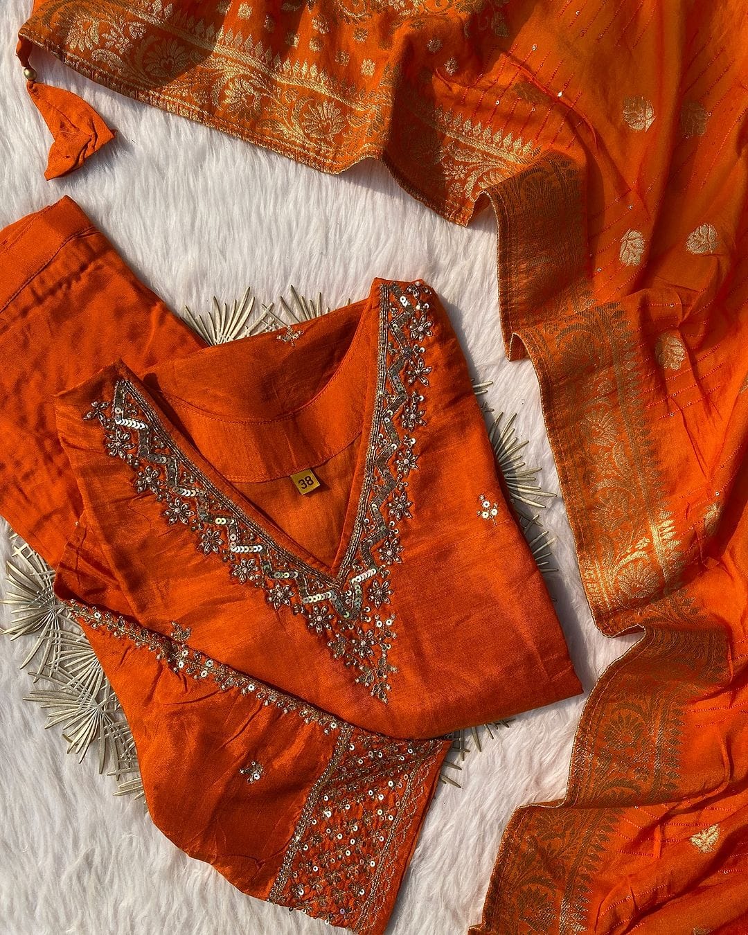 “Dilkash” A very beautiful orange v neck handwork set🛍️