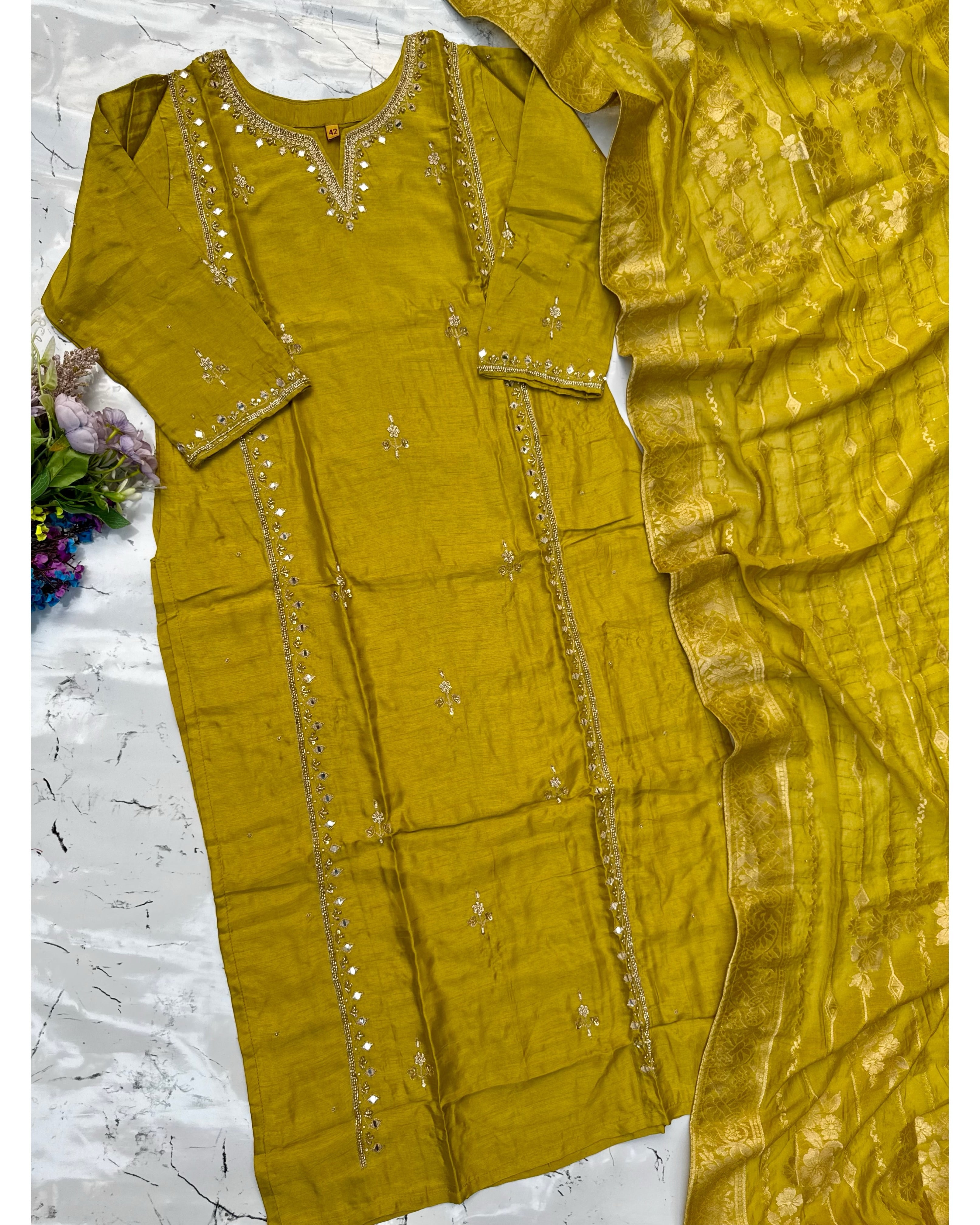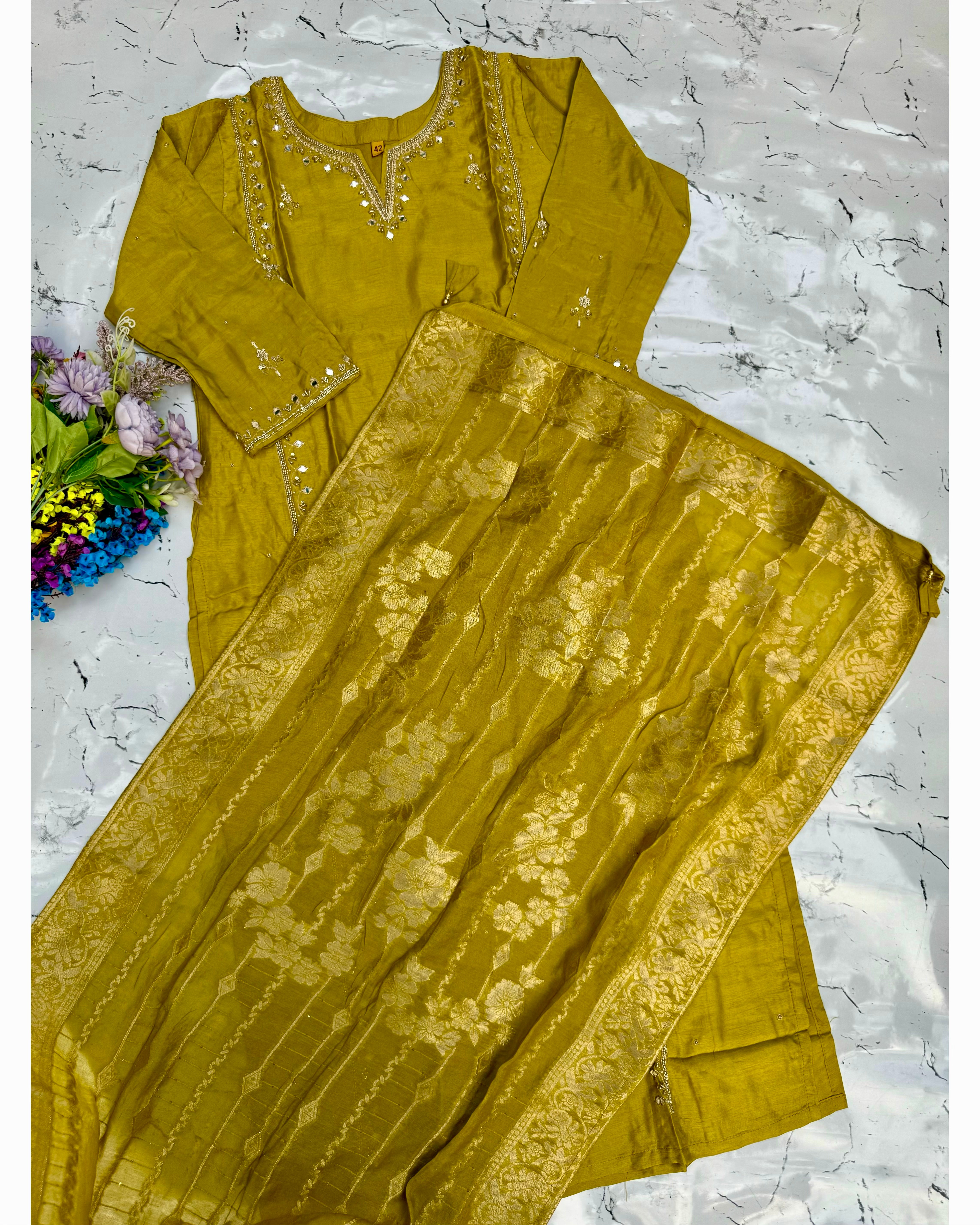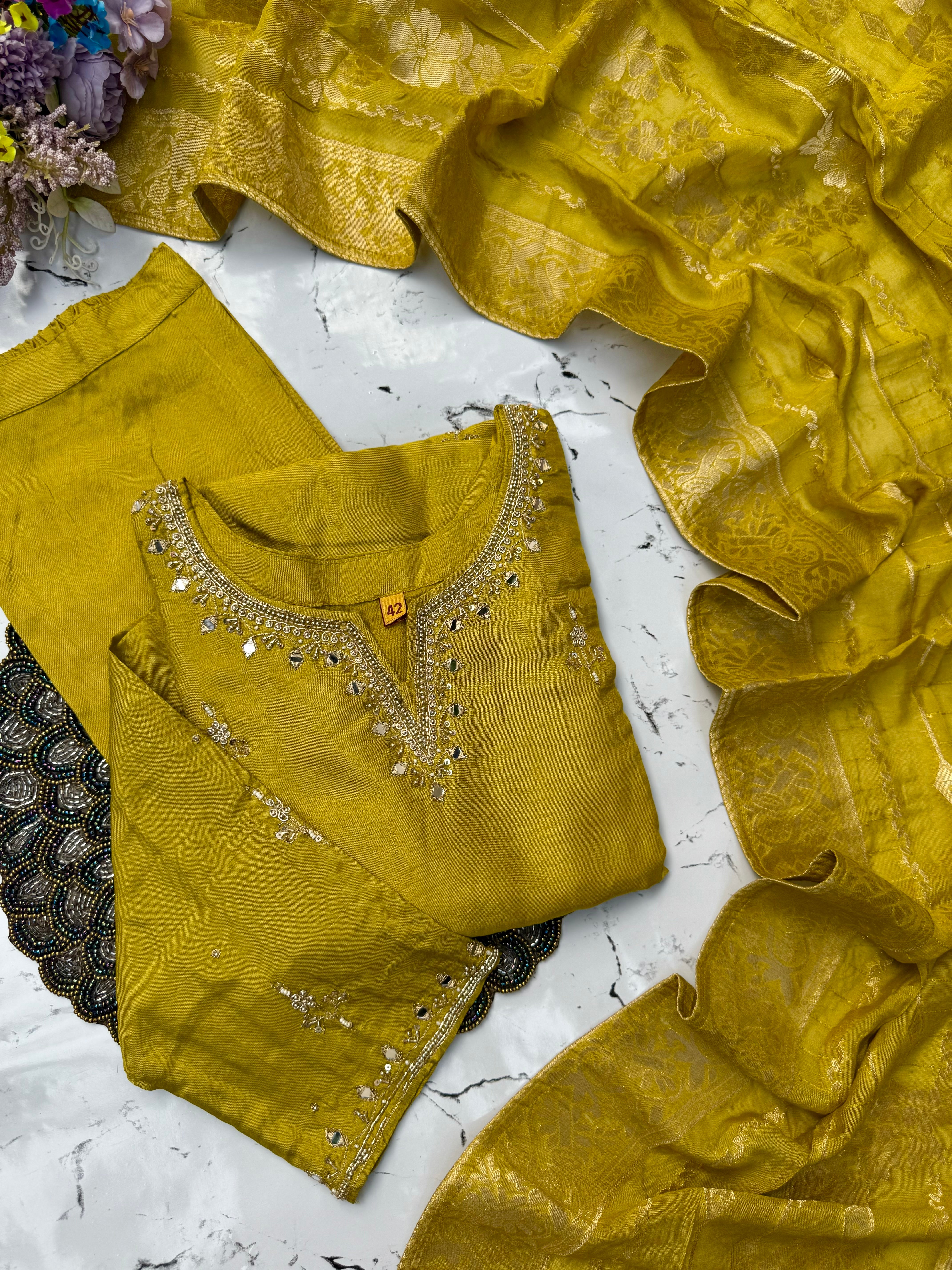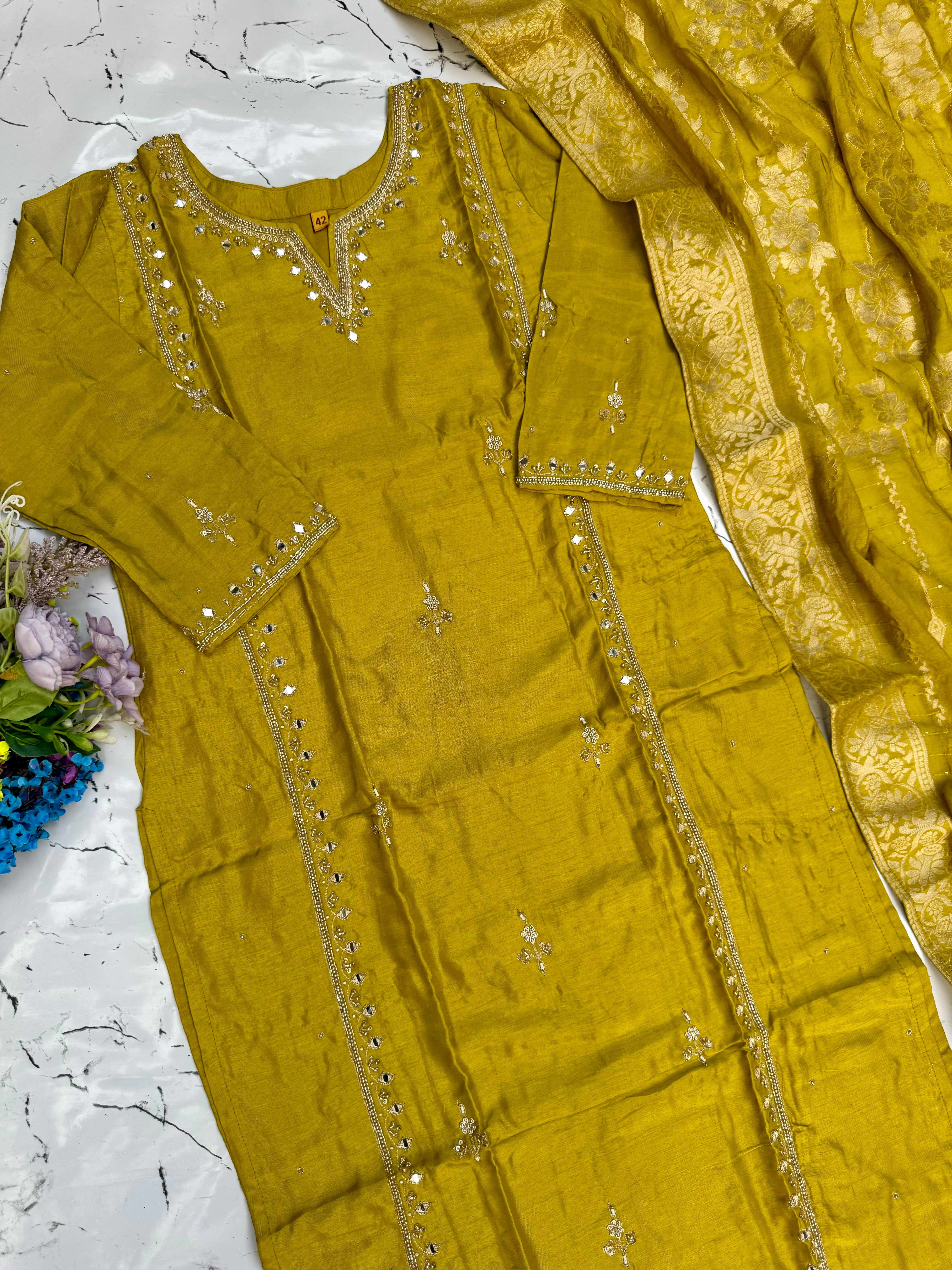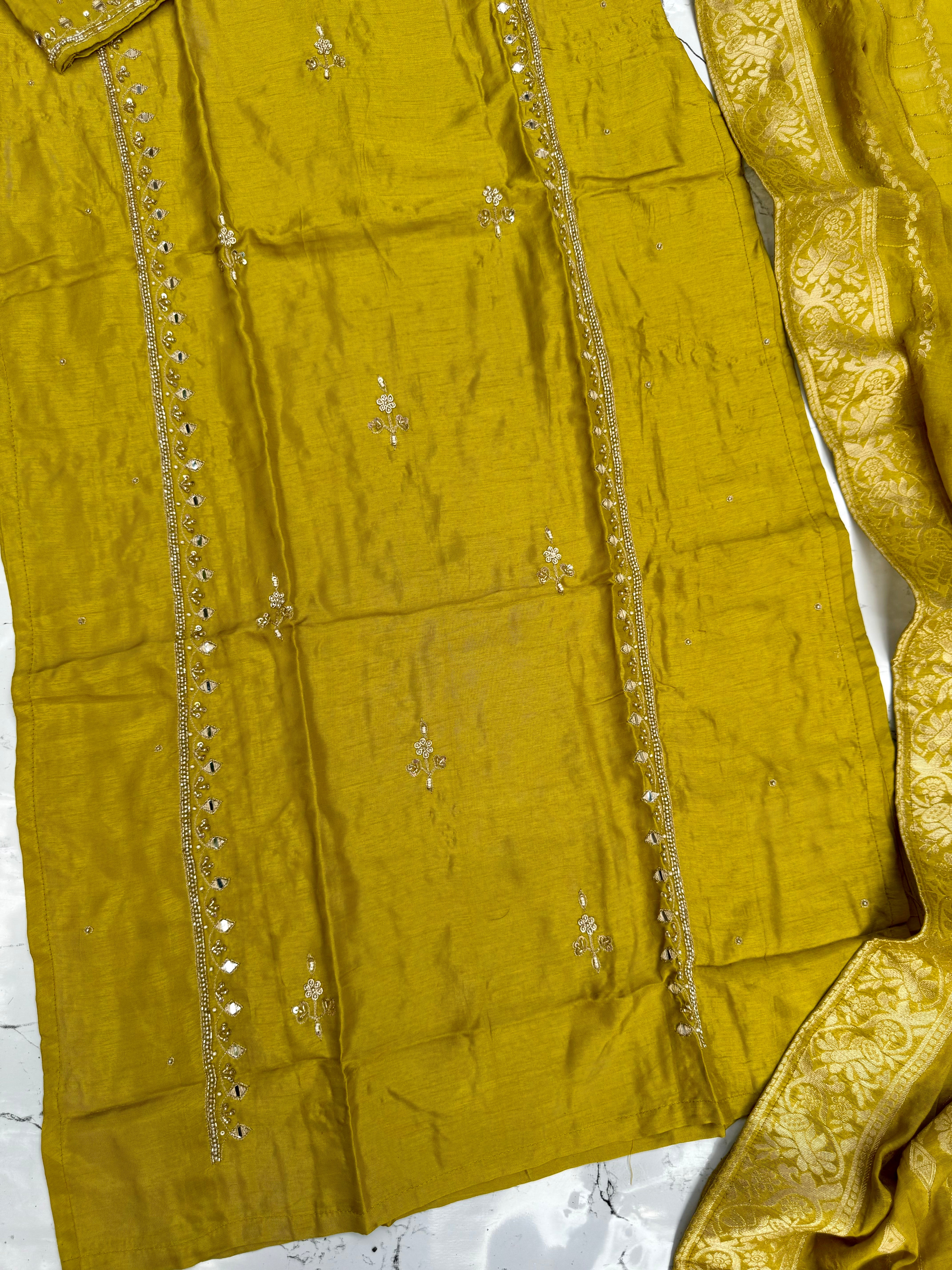 A very beautiful piece with handwork on all over the kurta and sleeve with a beautiful banarsi dupatta and a silk bottom with