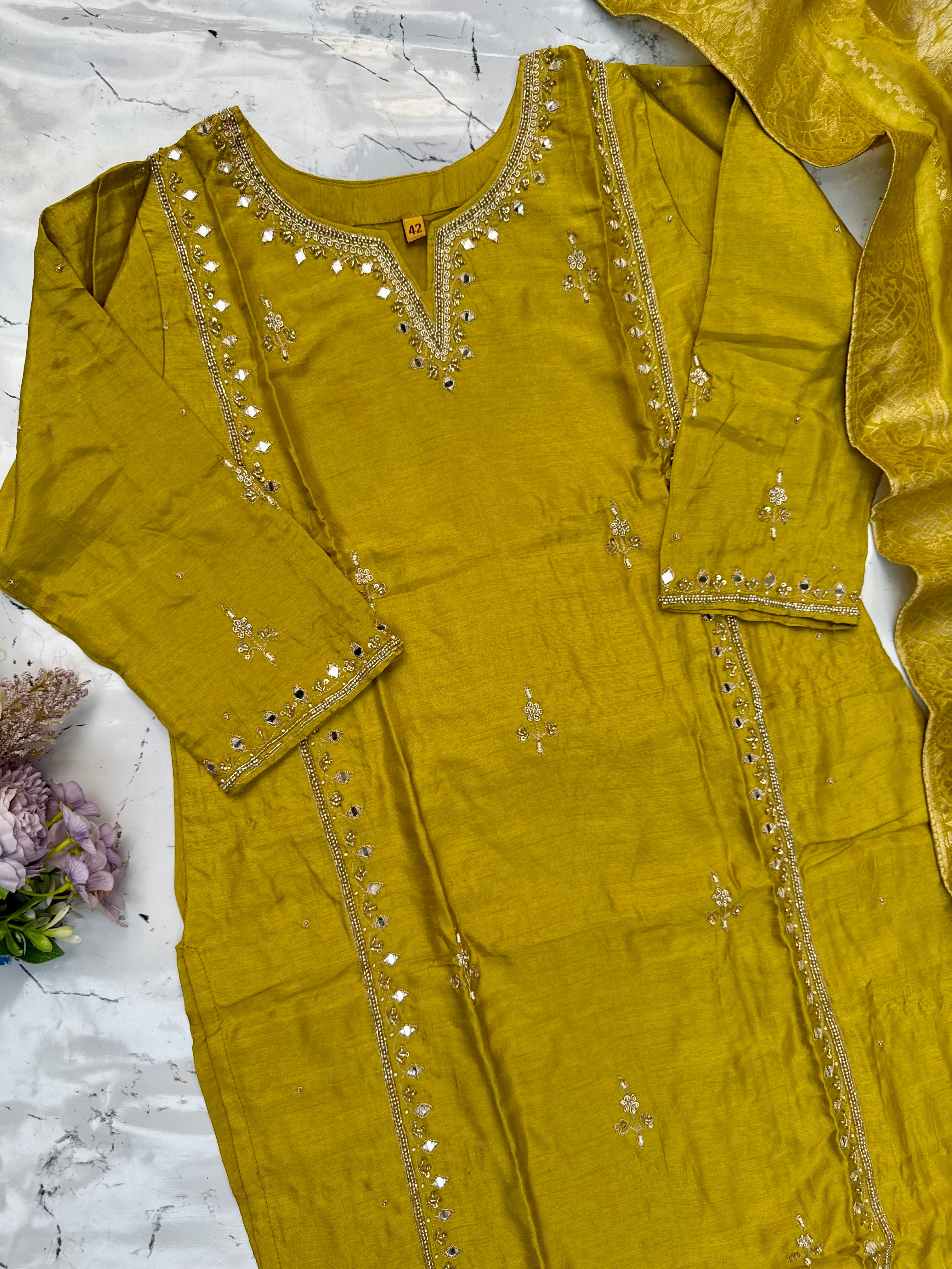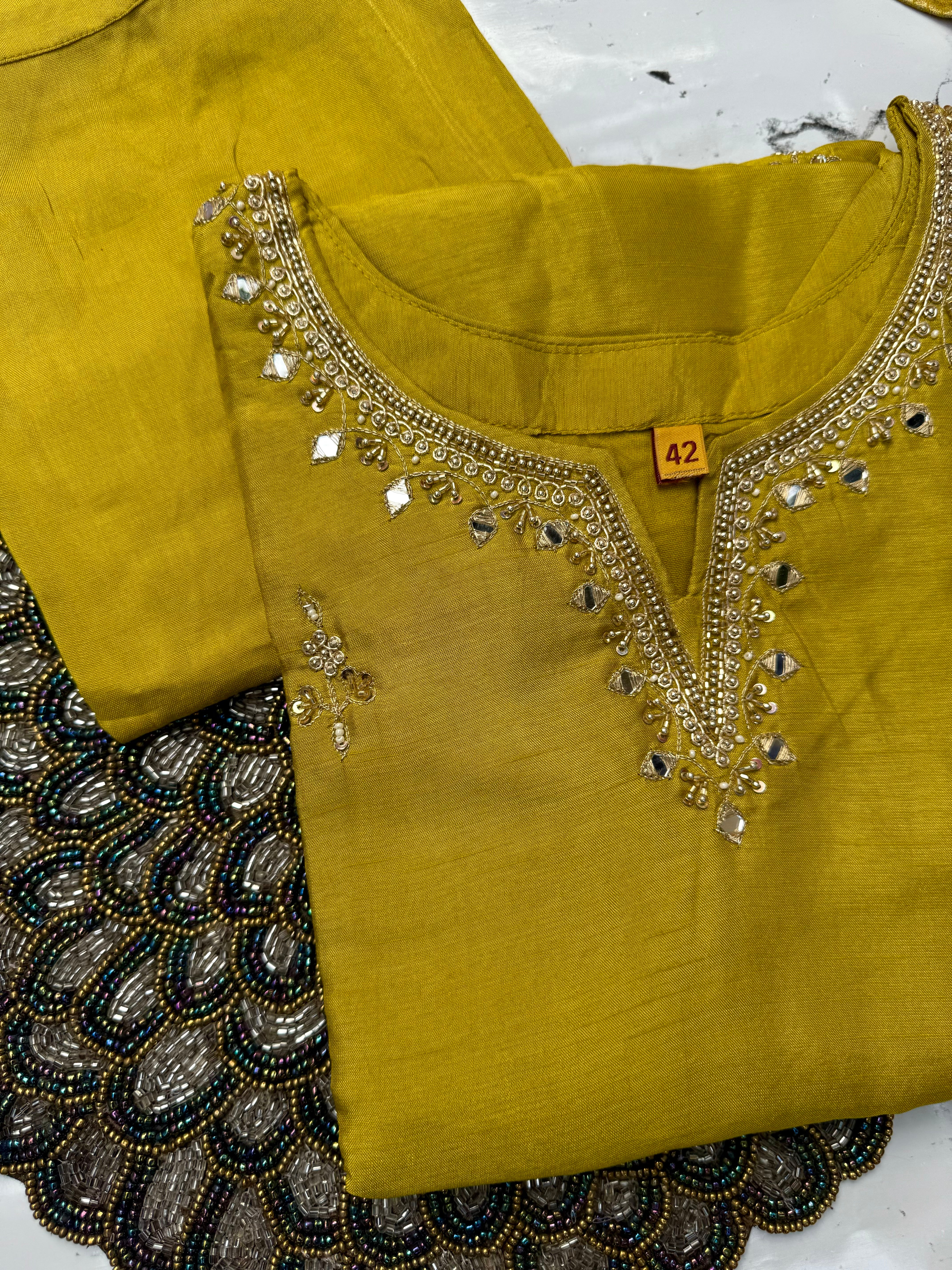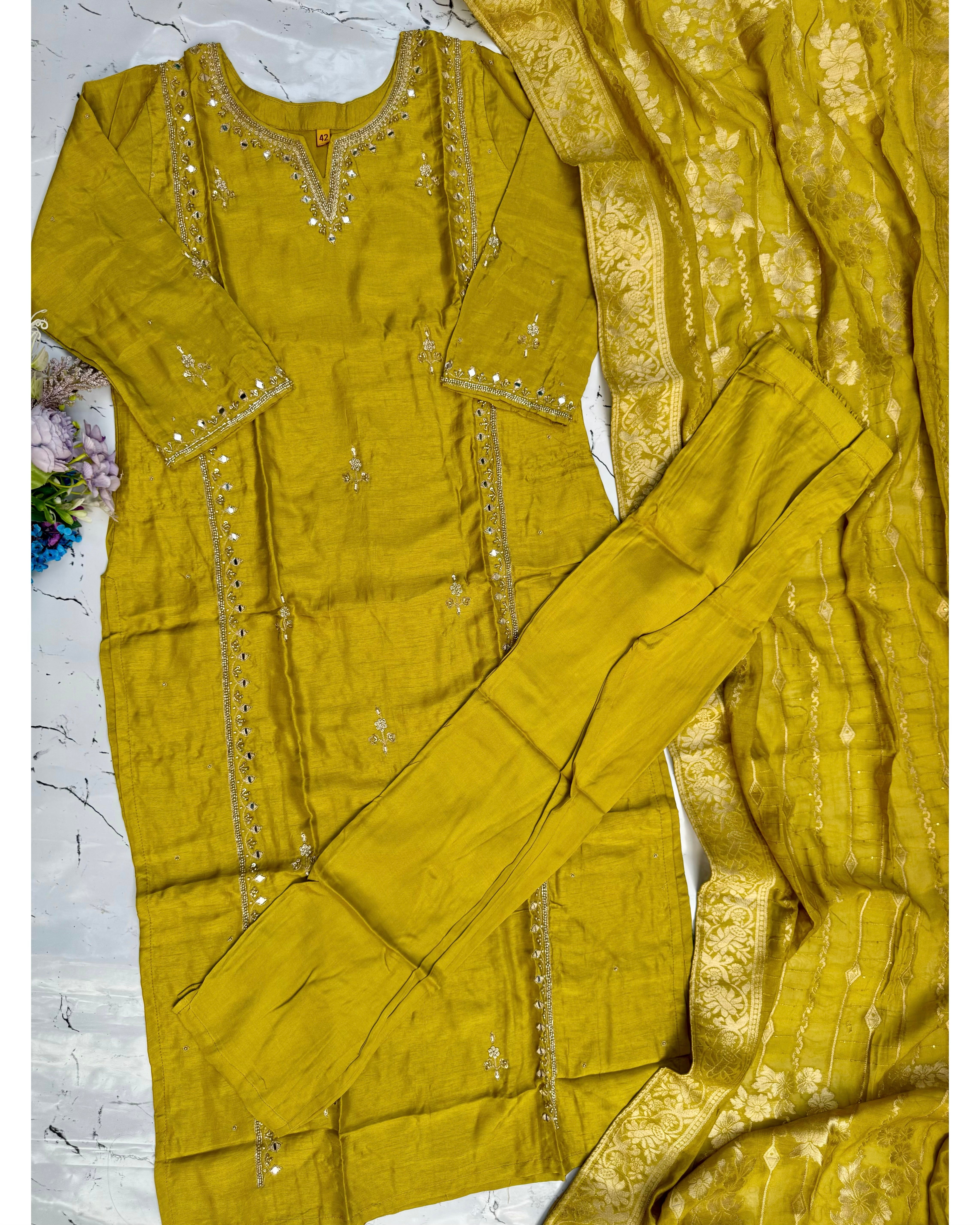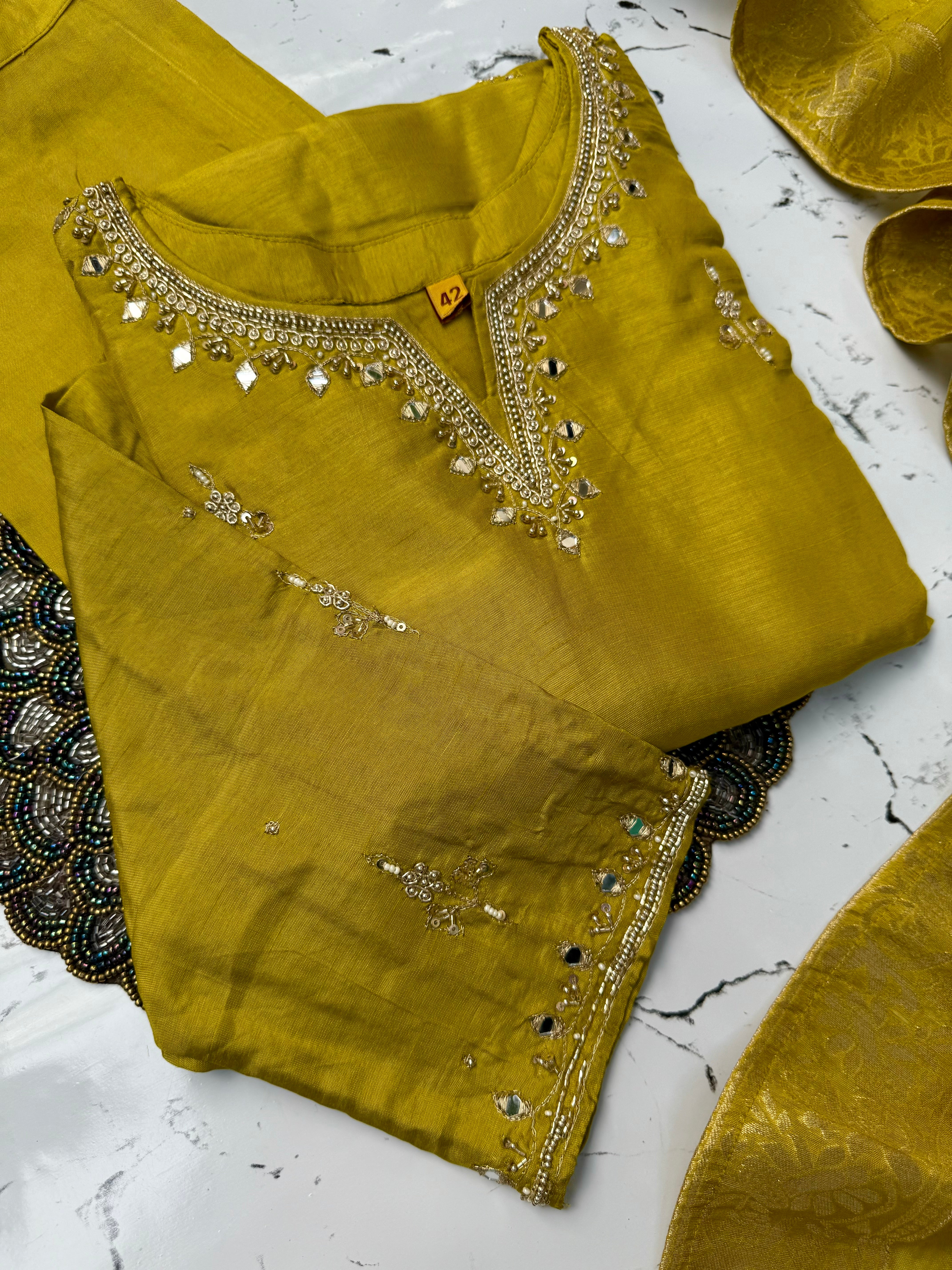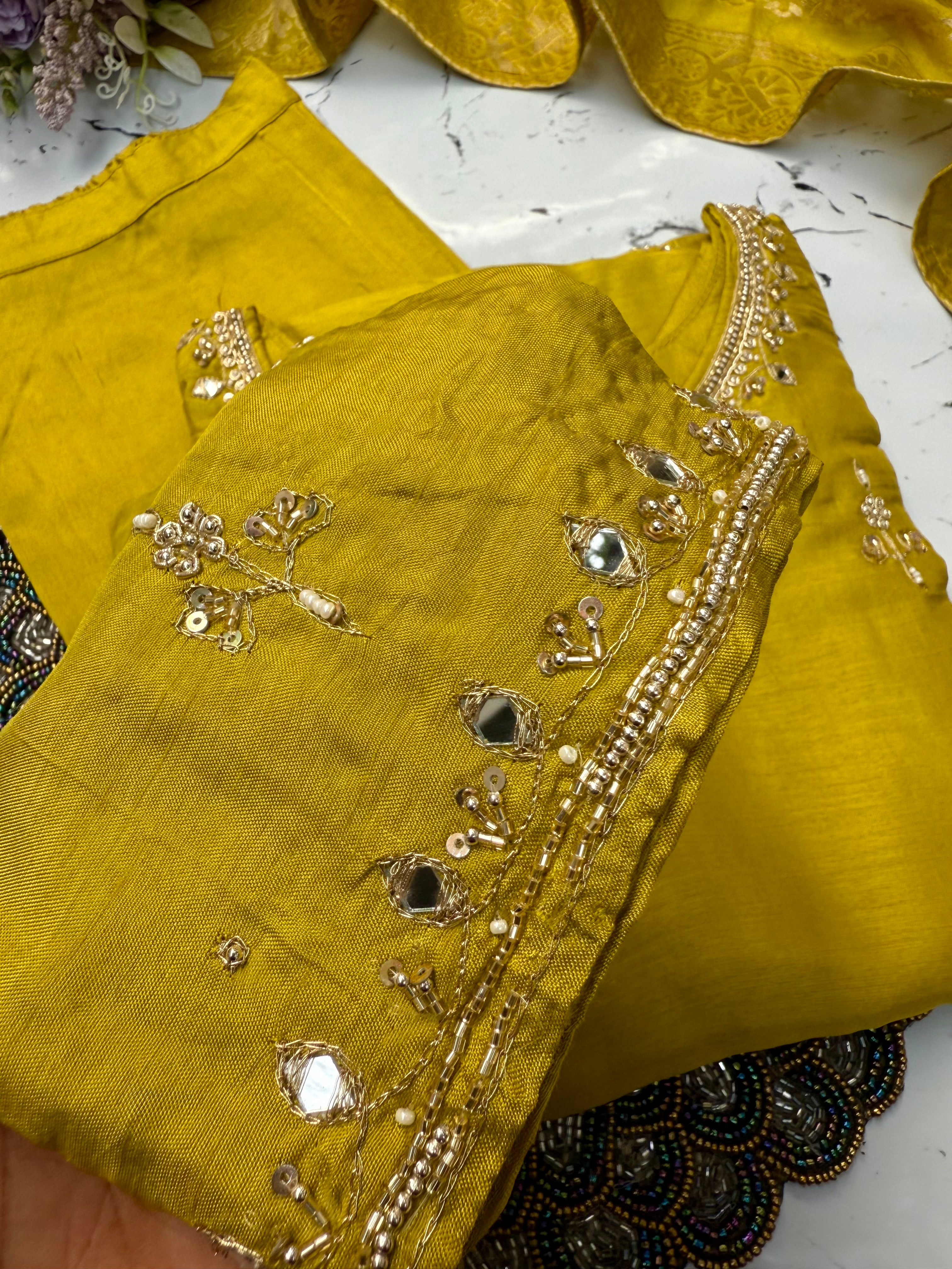 A very beautiful piece with handwork on all over the kurta and sleeve with a beautiful banarsi dupatta and a silk bottom with