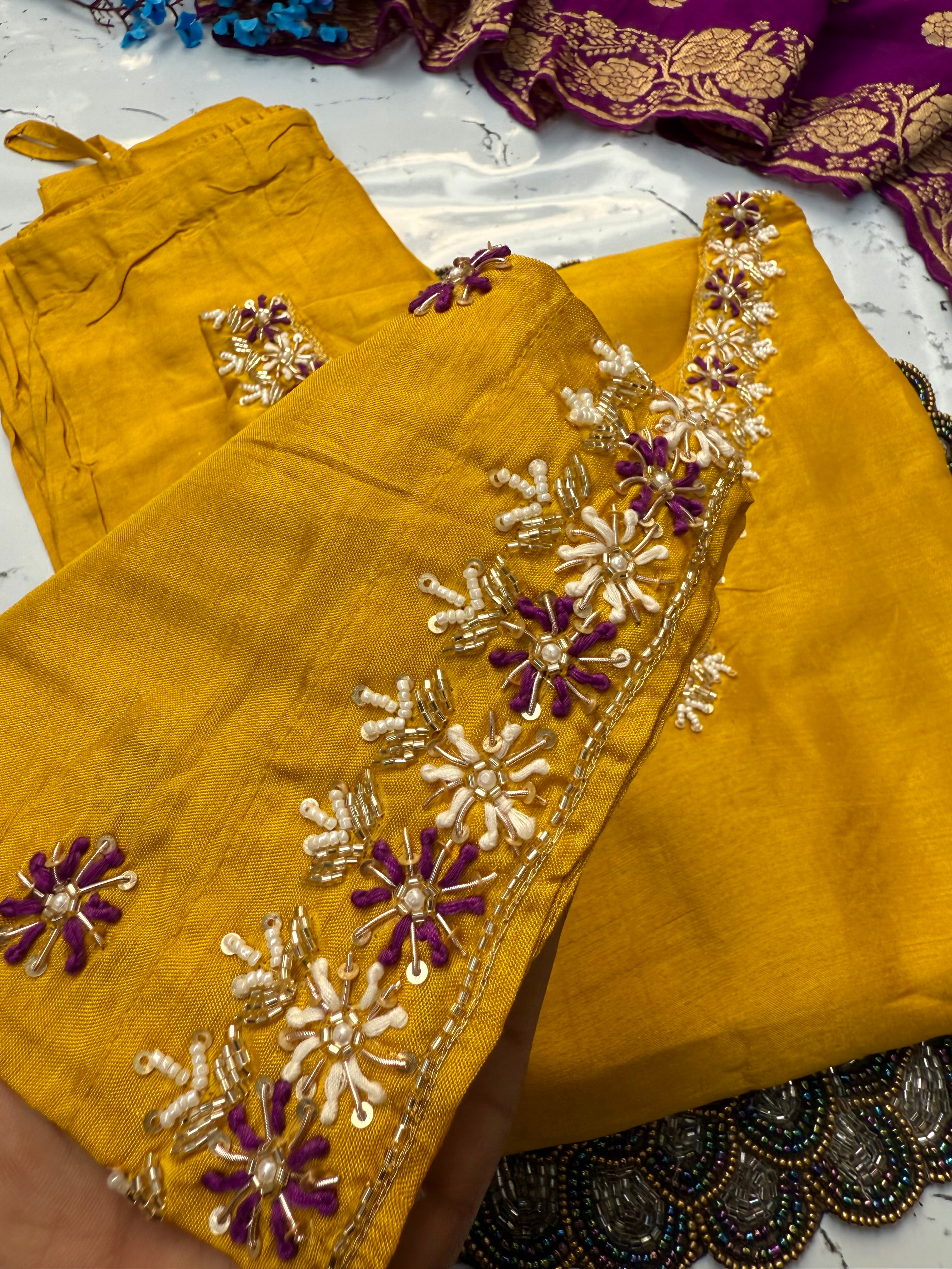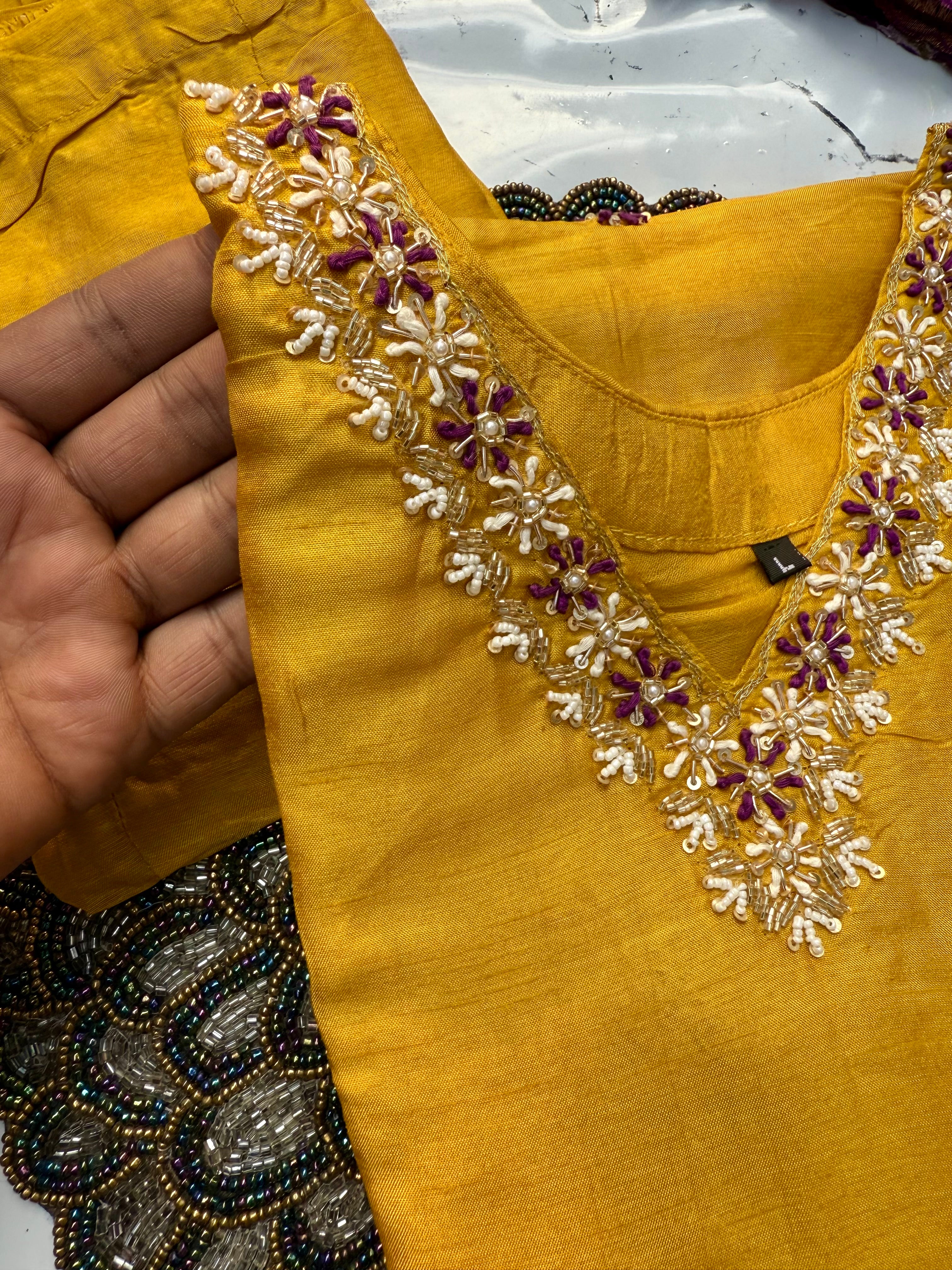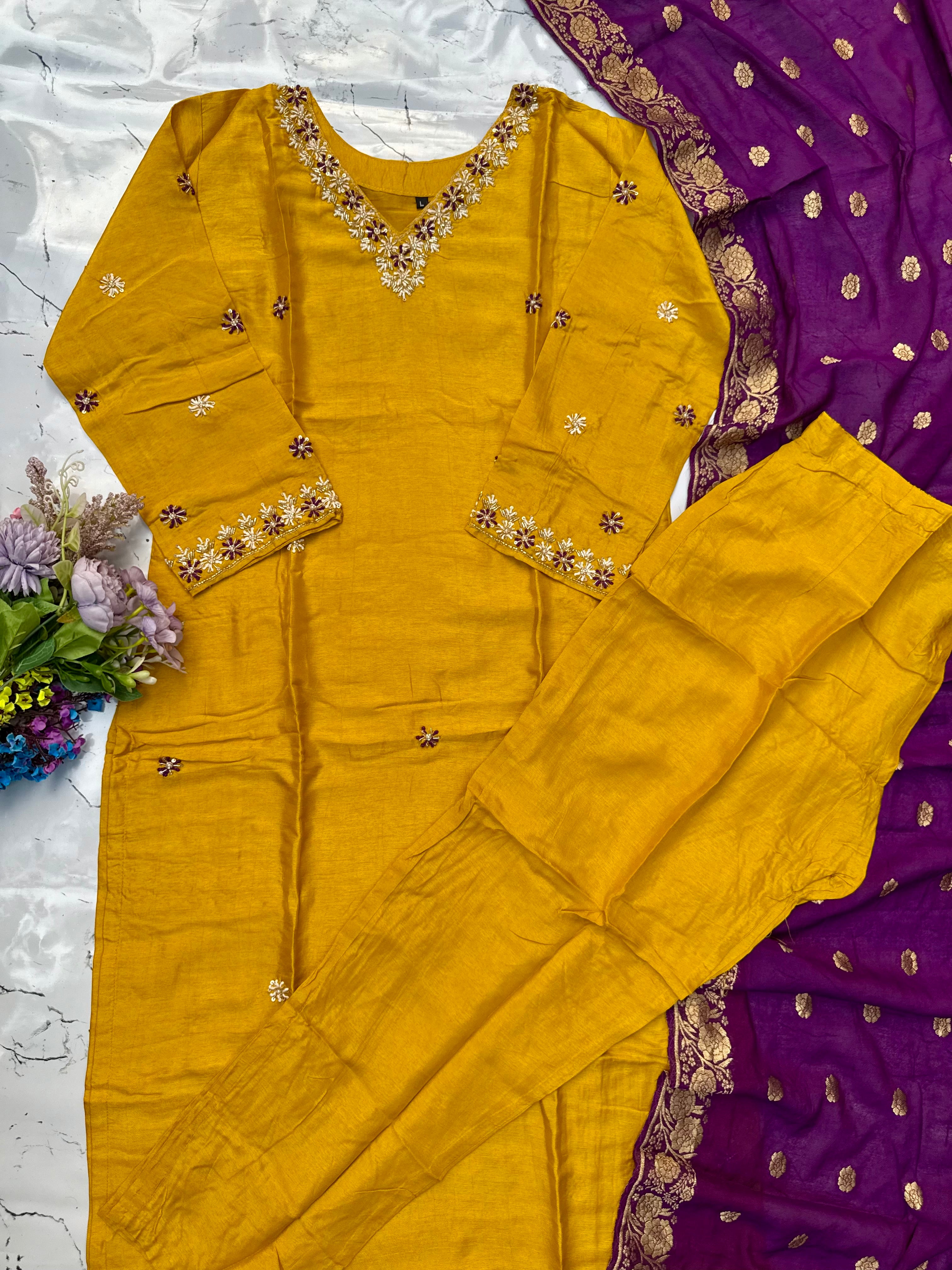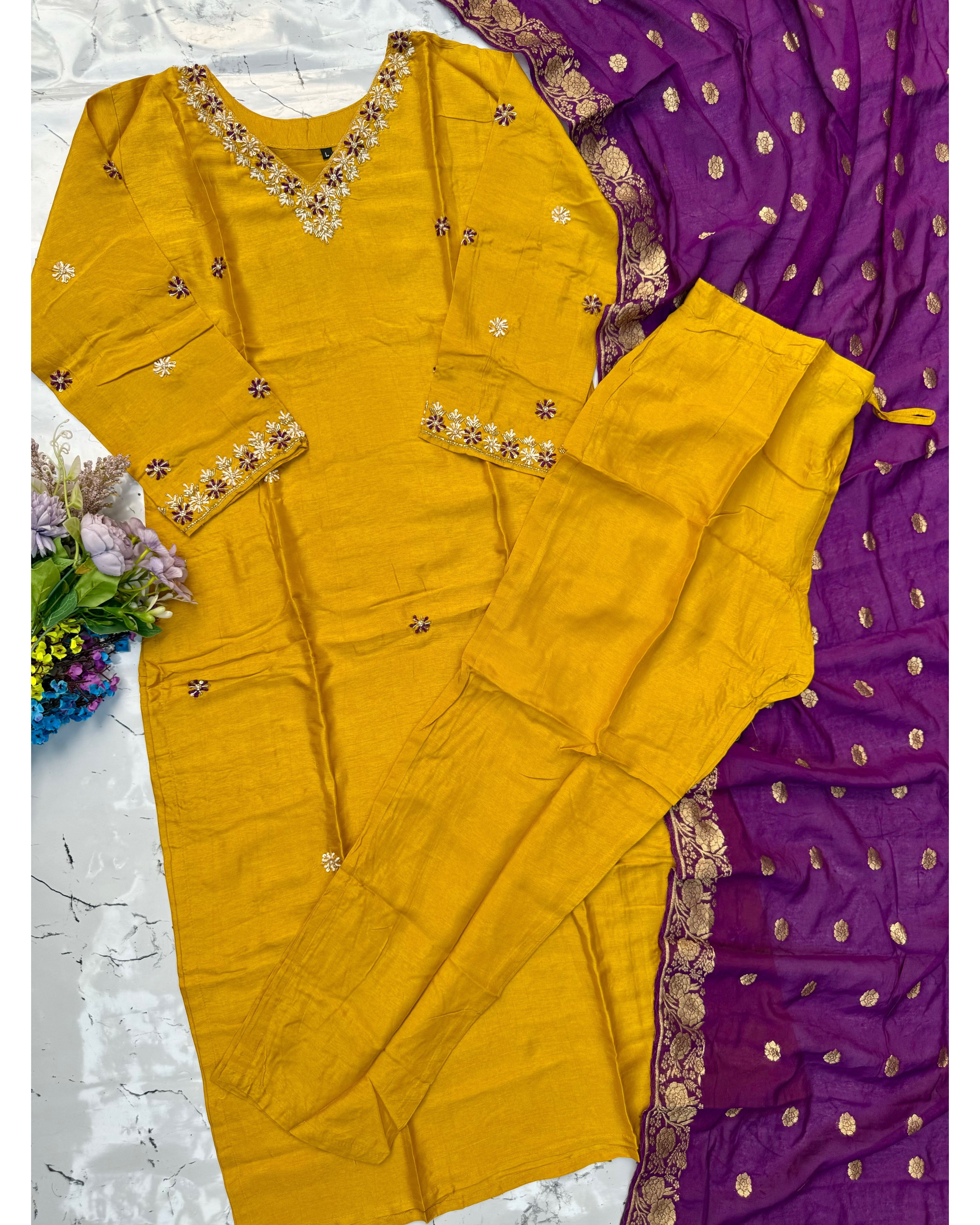 “Anannya” Beautiful Yellow V neck dola silk kurta set