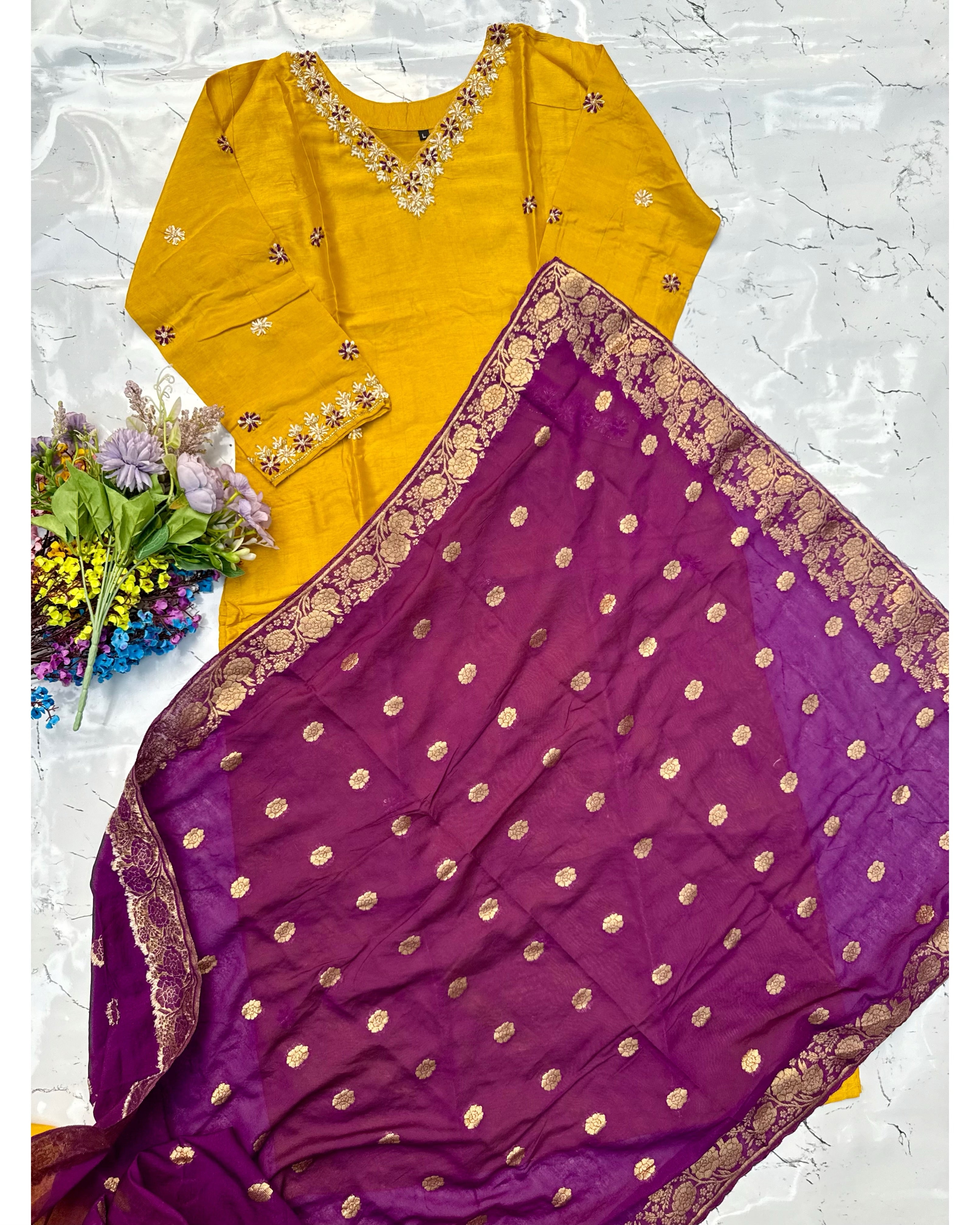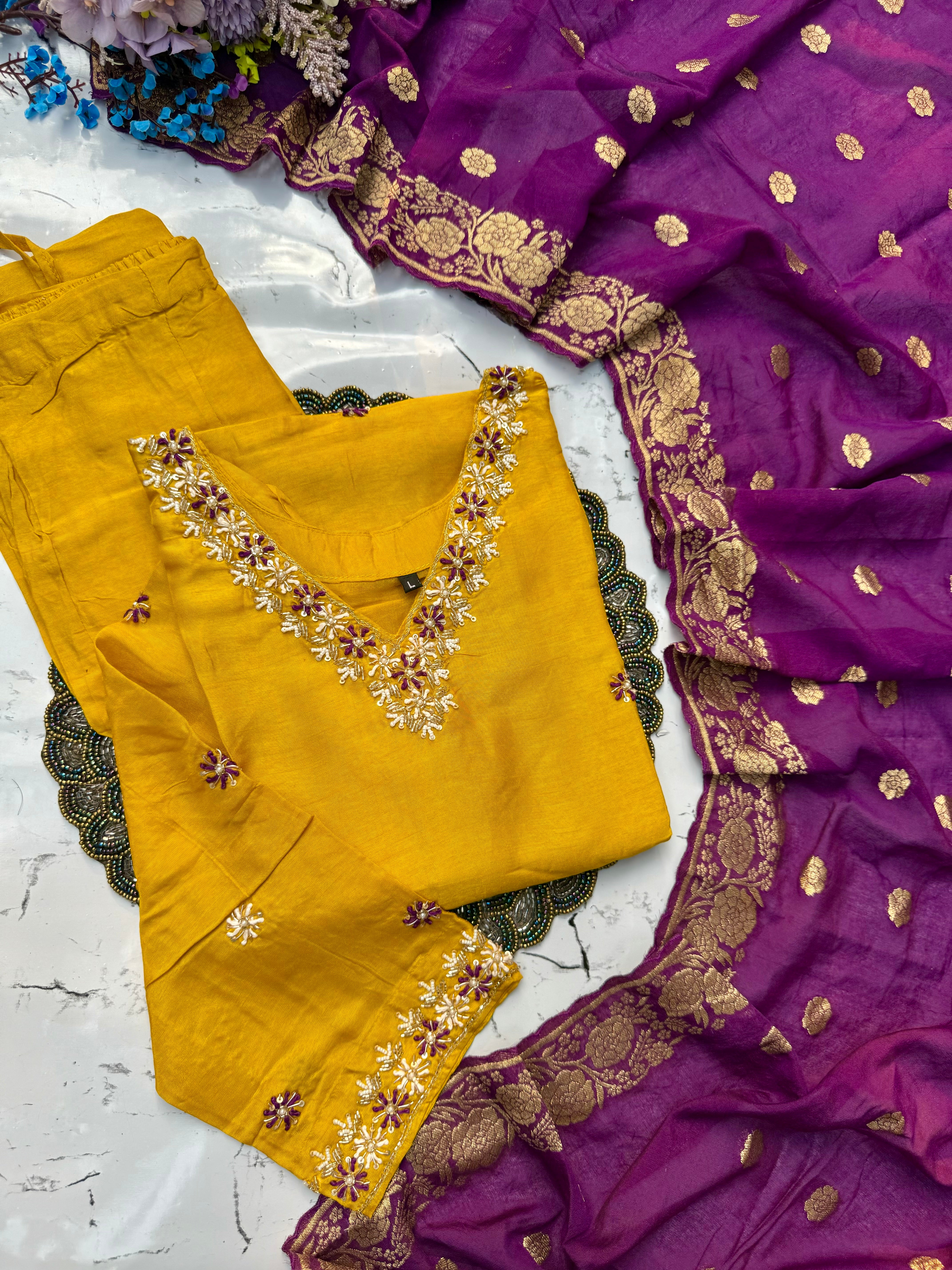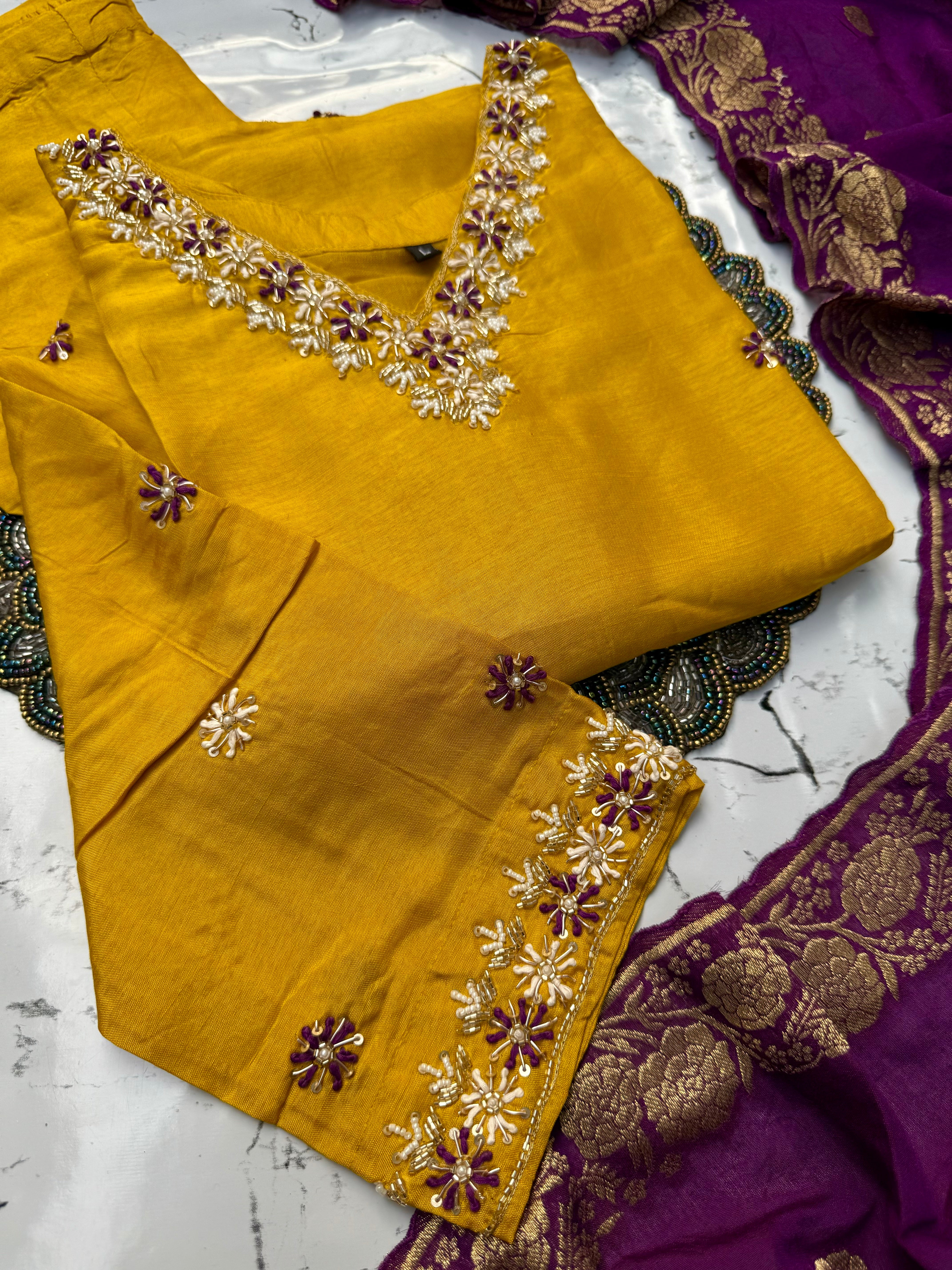 A very beautiful piece with heavy handwork on the yoke and sleeve of the kurta with a beautiful Banarsi dupatta and a dola silk bottom